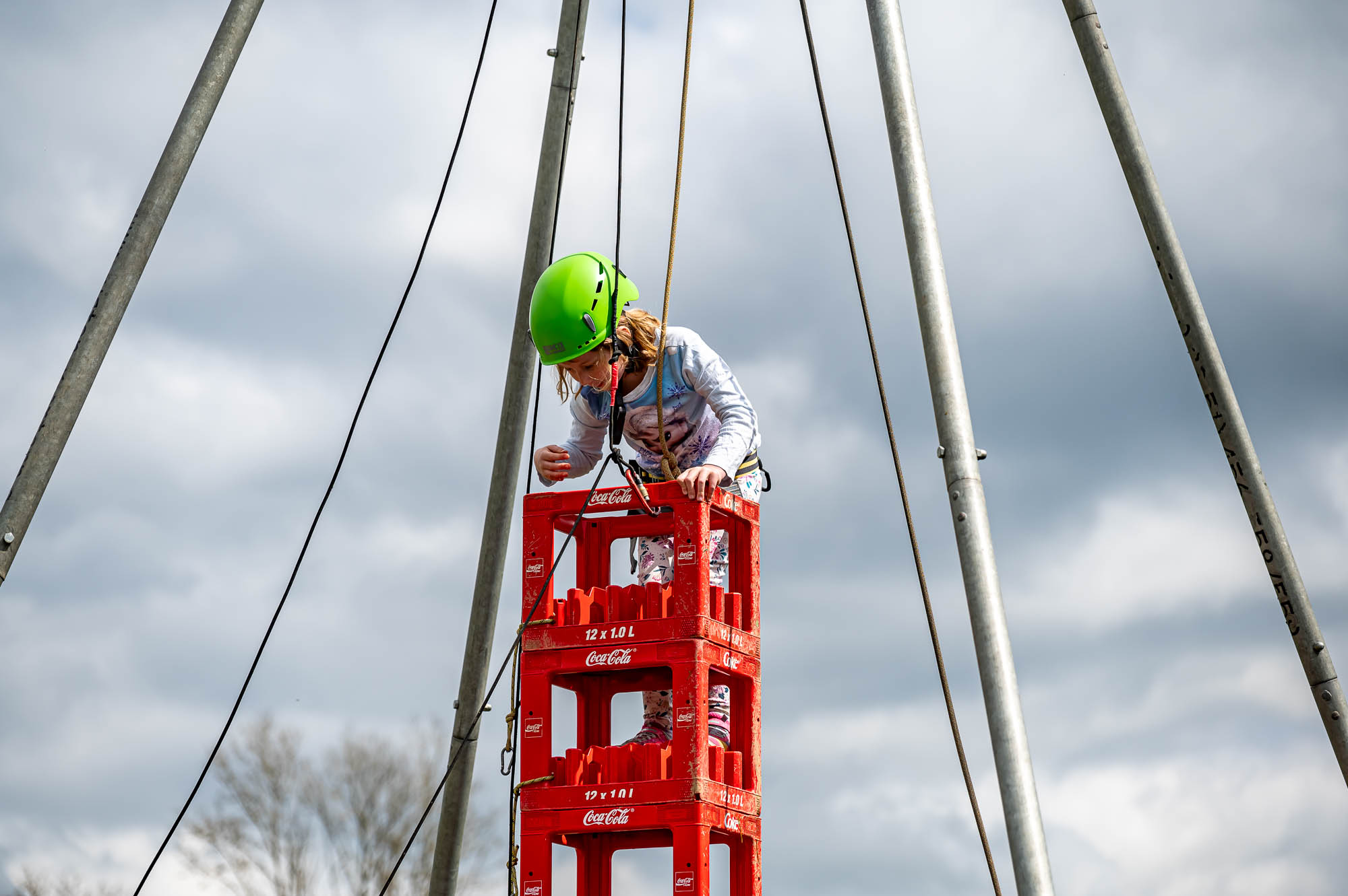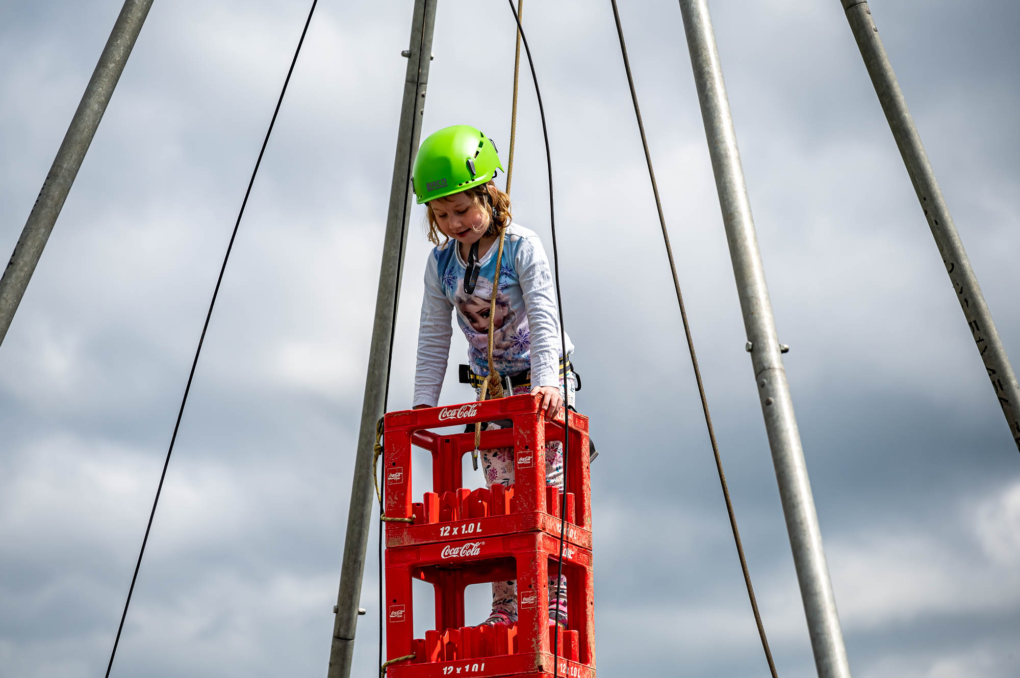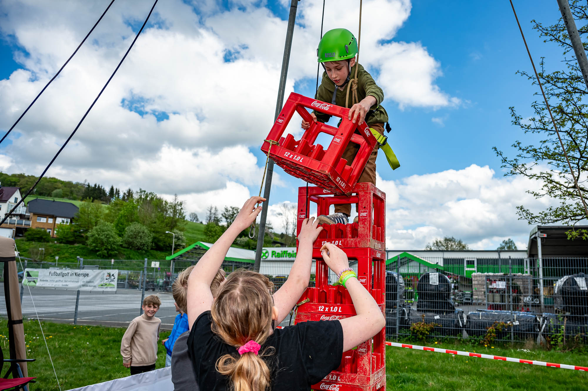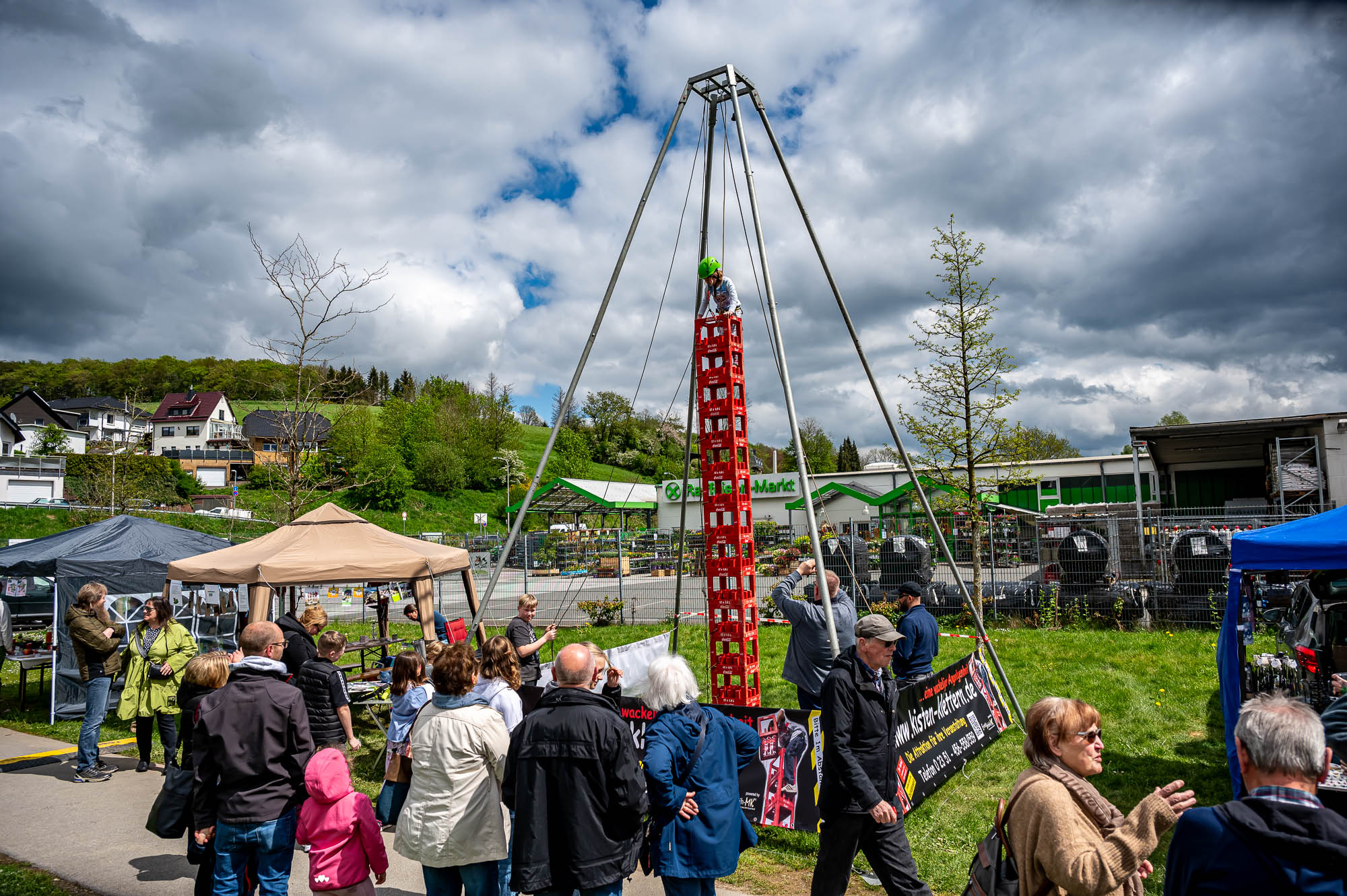 KIERSPE (mk) Es war ein Geschenk des Himmels. Das was von “oben” kam, vor allem aber das was ausblieb: Nämlich Regen! Auch wenn am vergangenen Sonntag immer wieder verdächtige Wolken über den Volmefreizeitpark zogen, ist es doch trocken, in weiten Teilen sogar sonnig gewesen. Für das Frühlingsfest war das ein großes Geschenk! Auch, dass es von den Menschen der Raukstadt angenommen wurde. Das gebotene, familientaugliche Programm war aber eine große Verlockung: Bootsfahrten im Sparkassen-Pool, ausgefallene Hüpfburgen und weitere Attraktionen beim Spielmobil der Stadt Kierspe und unzählige weitere Angebote richteten sich besonders an Kinder. Darunter auch das Getränkekistenstapeln bei der Lüdenscheider “Niederlassung” des Deutschen Alpen Vereins. Das, was sich nach “Maloche” im Getränkehandel anhört, war in Wirklichkeit ein anspruchsvolles Kletter-Abenteuer, bei dem es hoch hinaus ging.