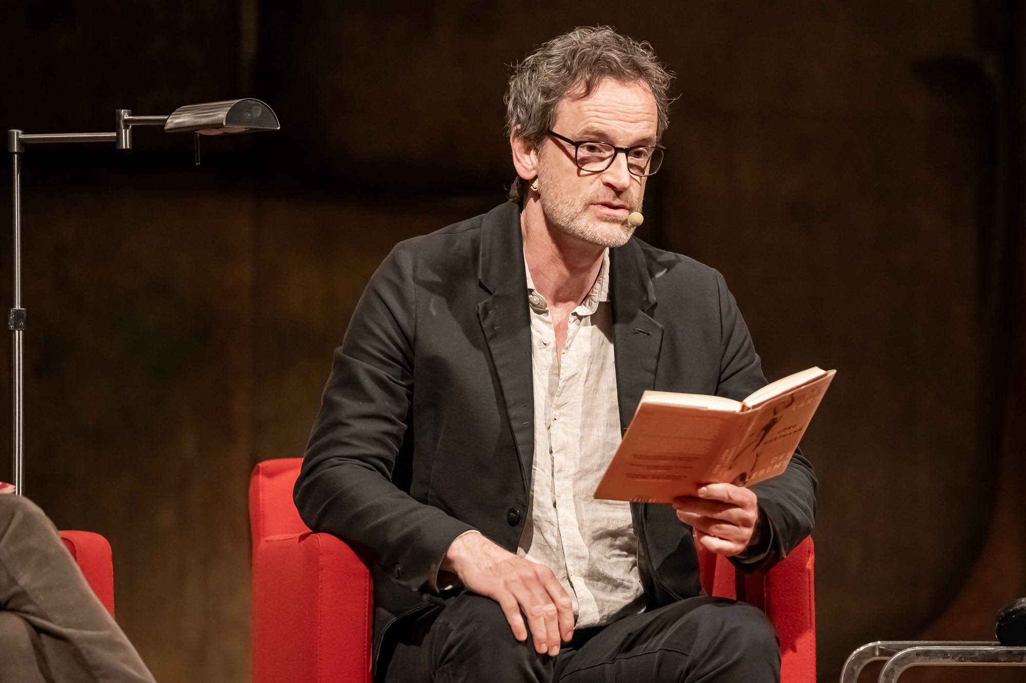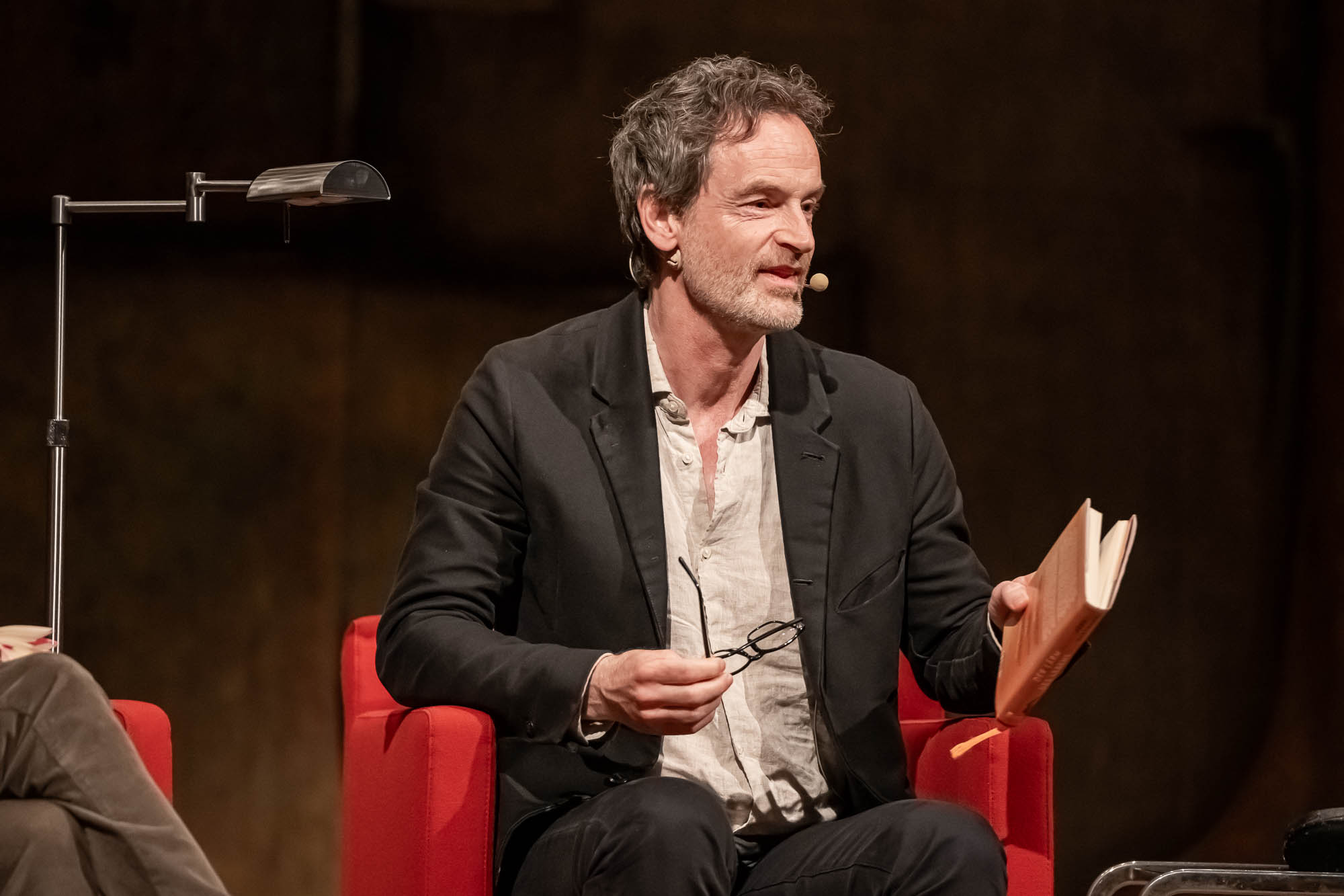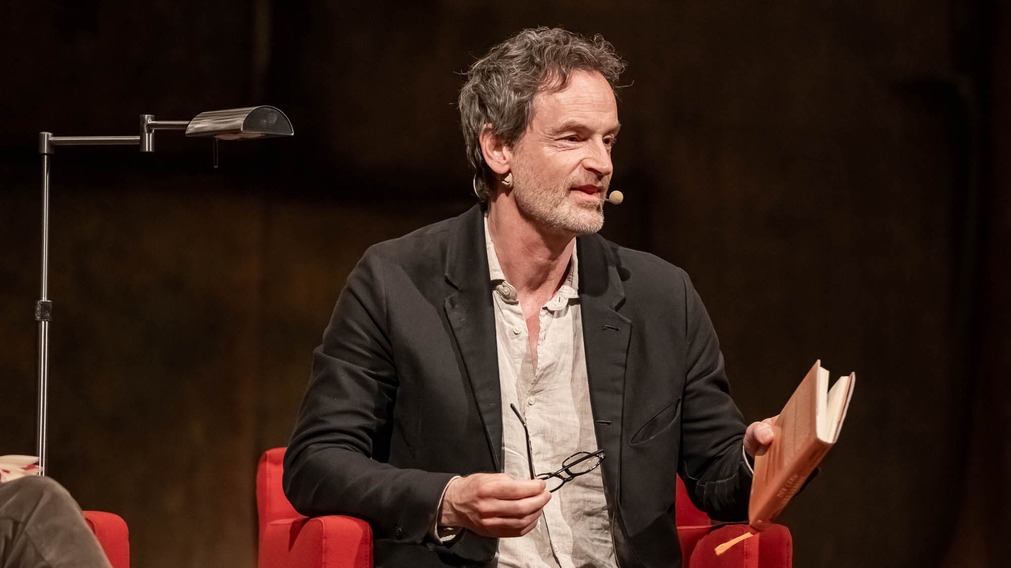 MEINERZHAGEN (mk) Ein hochkarätiger, allerdings für die Literaturtage ungewöhnlicher Künstler stand am vergangenen Sonntag, 15. April, auf der Bühne der Meinerzhagener Stadthalle: Der Schauspieler Jörg Hartmann. Den Namen braucht man vielen Menschen vermutlich nicht zu erklären, obwohl viele Darsteller oft nur mit ihren Hauptrollen identifiziert werden. Für diejenigen, die ihn nicht auf Anhieb einordnen können: Es handelt sich um den Mann, der im Dortmunder “Tatort” seit 2012 den Hauptkommissar Peter Faber spielt. Oder für seine Rolle als Stasi-Offizier Falk Kupfer in der Serie “Weissensee” einen der zahlreichen Grimme-Preise erhielt, die die TV-Produktion in verschiedenen Kategorien abräumte. Mit seiner schauspielerischen Karriere hat sein Auftritt in Meinerzhagen allerdings nicht so viel zu tun: Jörg Hartmann hat ein Buch geschrieben.