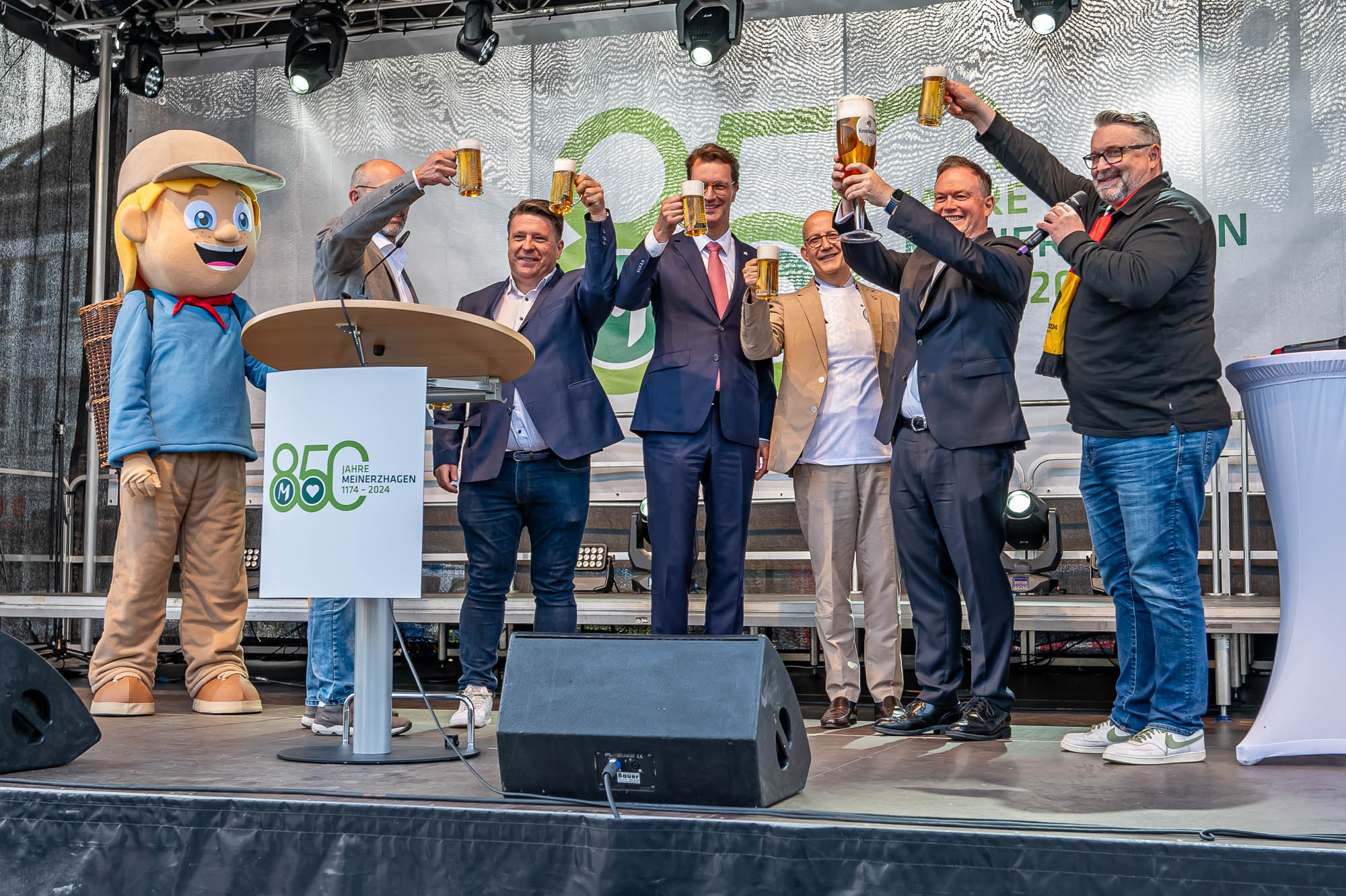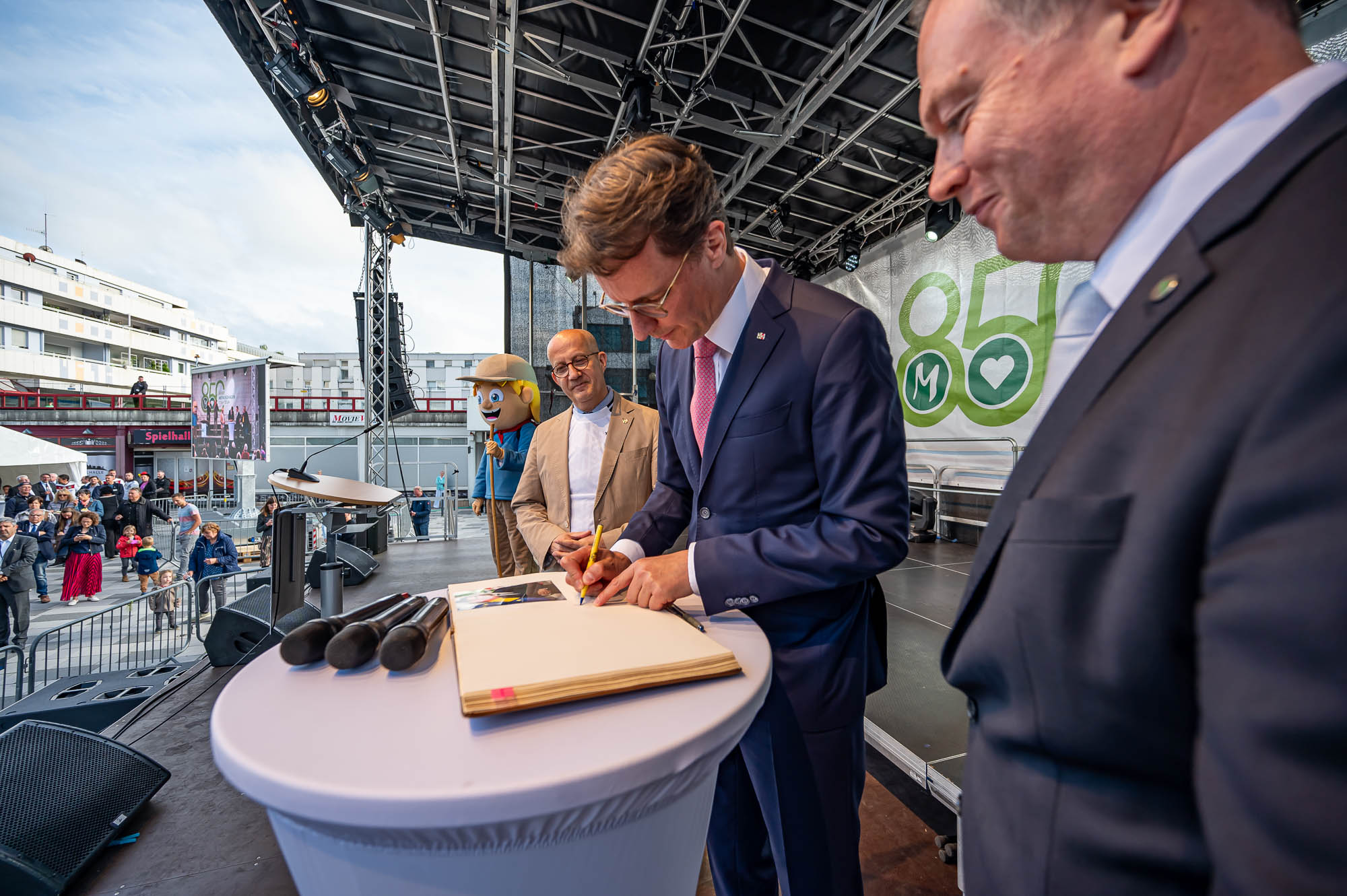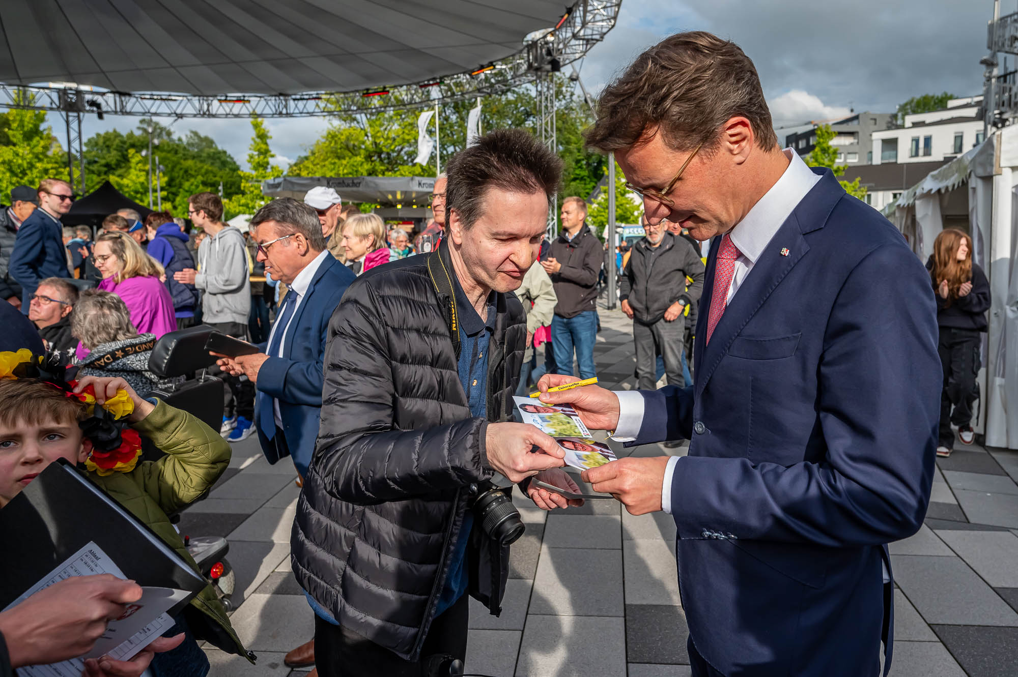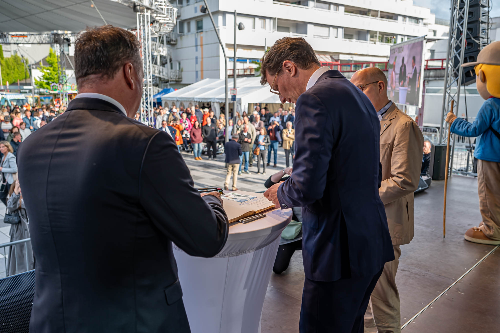 Zahlreiche Vertreter aus der Politik folgten der Einladung von Bürgermeister Jan Nesselrath zur 850-Jahr-Feier nach Meinerzhagen: Bürgermeisterinnen und Bürgermeister der umliegenden Kommunen und sogar aus Attendorn, die hiesigen Landtagsabgeordneten Gordon Dudas und Ralf Schwarzkopf, der auch als stellvertretender Landrat sprach und Marco Voge vertrat. Auch der Bundestagsabgeordnete Florian Müller überbrachte Glückwünsche. “Stargast” war allerdings NRW-Ministerpräsident Hendrik Wüst, der persönlich die Feierlichkeiten besuchte und sich nach seiner Ansprache gemeinsam mit Ralf Schwarzkopf ins Goldene Buch der Stadt eintrug. Bei den hunderten Besuchern, die sich bereits am späten Nachmittag vor der Stadthalle einfanden, kam Wüst offenbar gut an: Der gutgelaunte Politiker kam gerne zahlreichen Selfie-Wünschen nach und signierte Autogrammkarten.