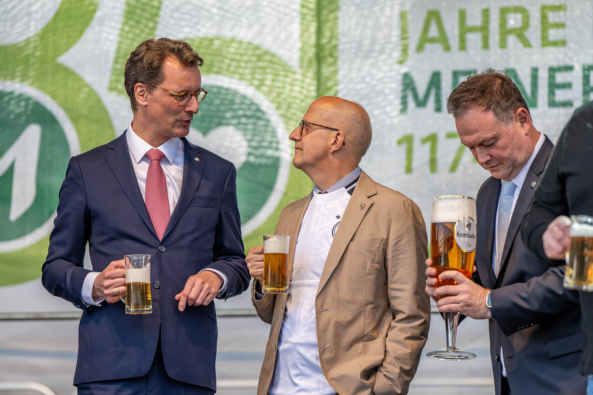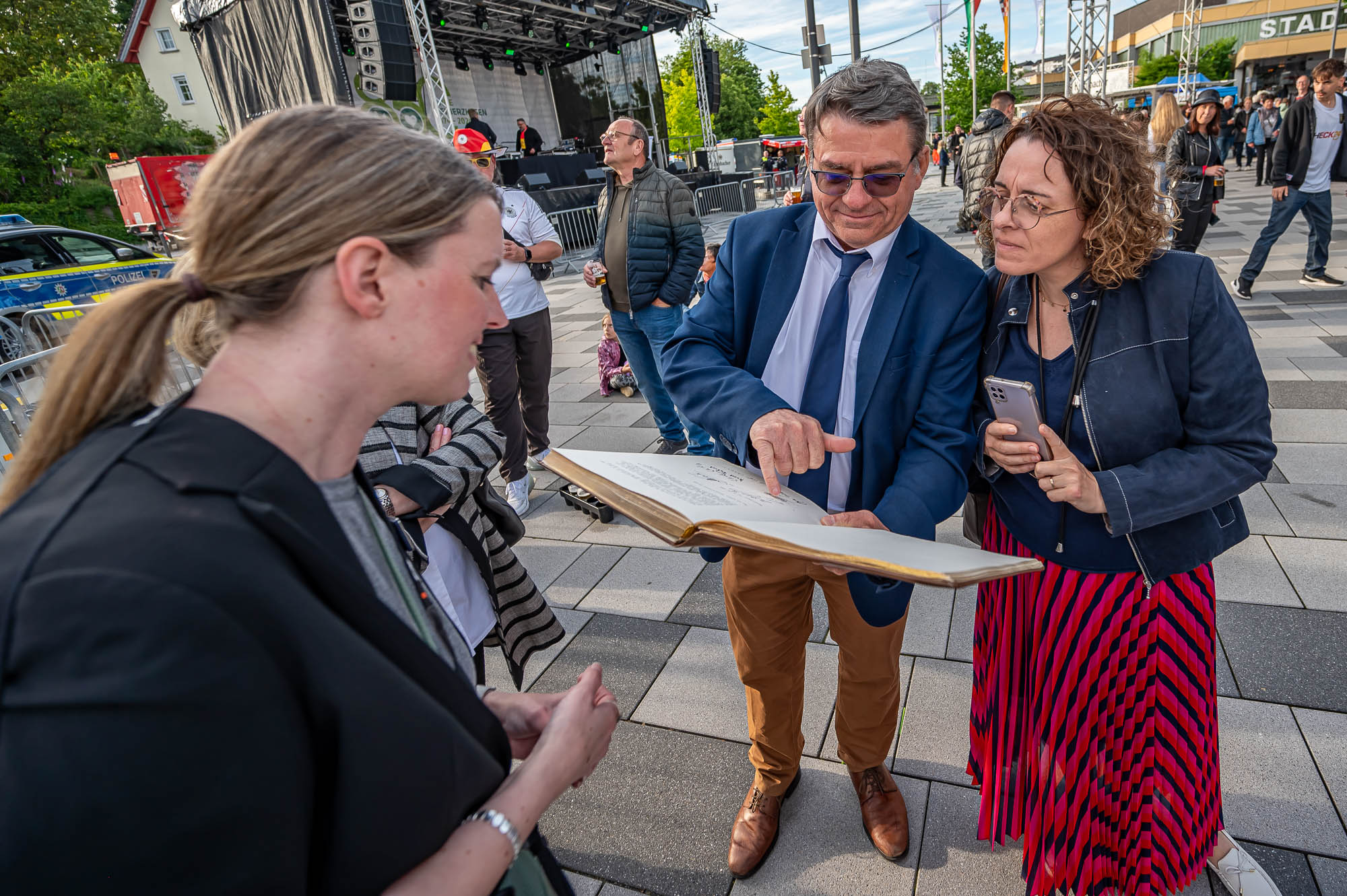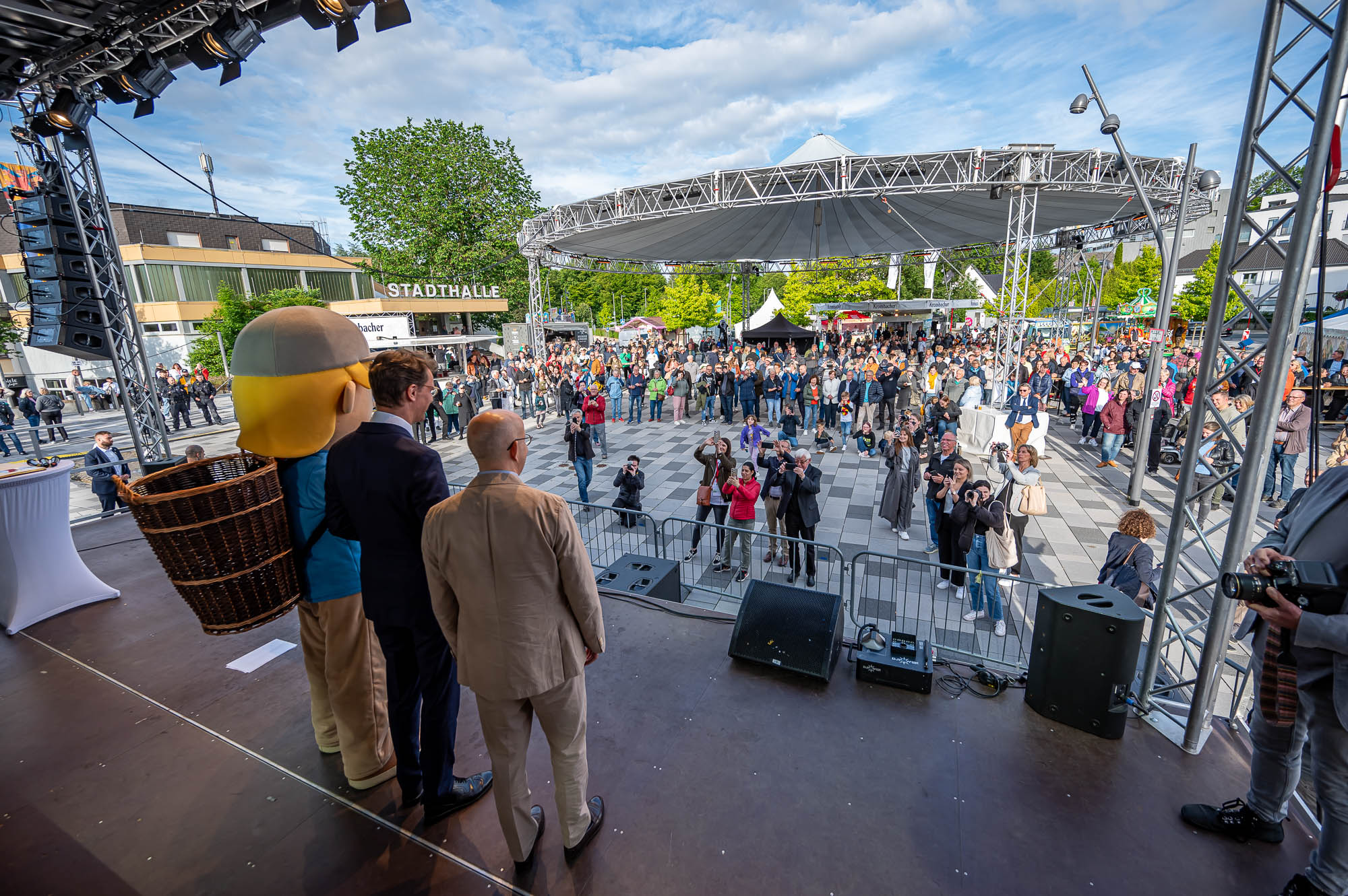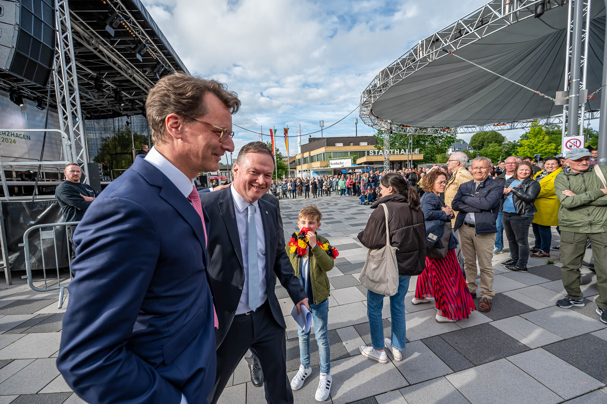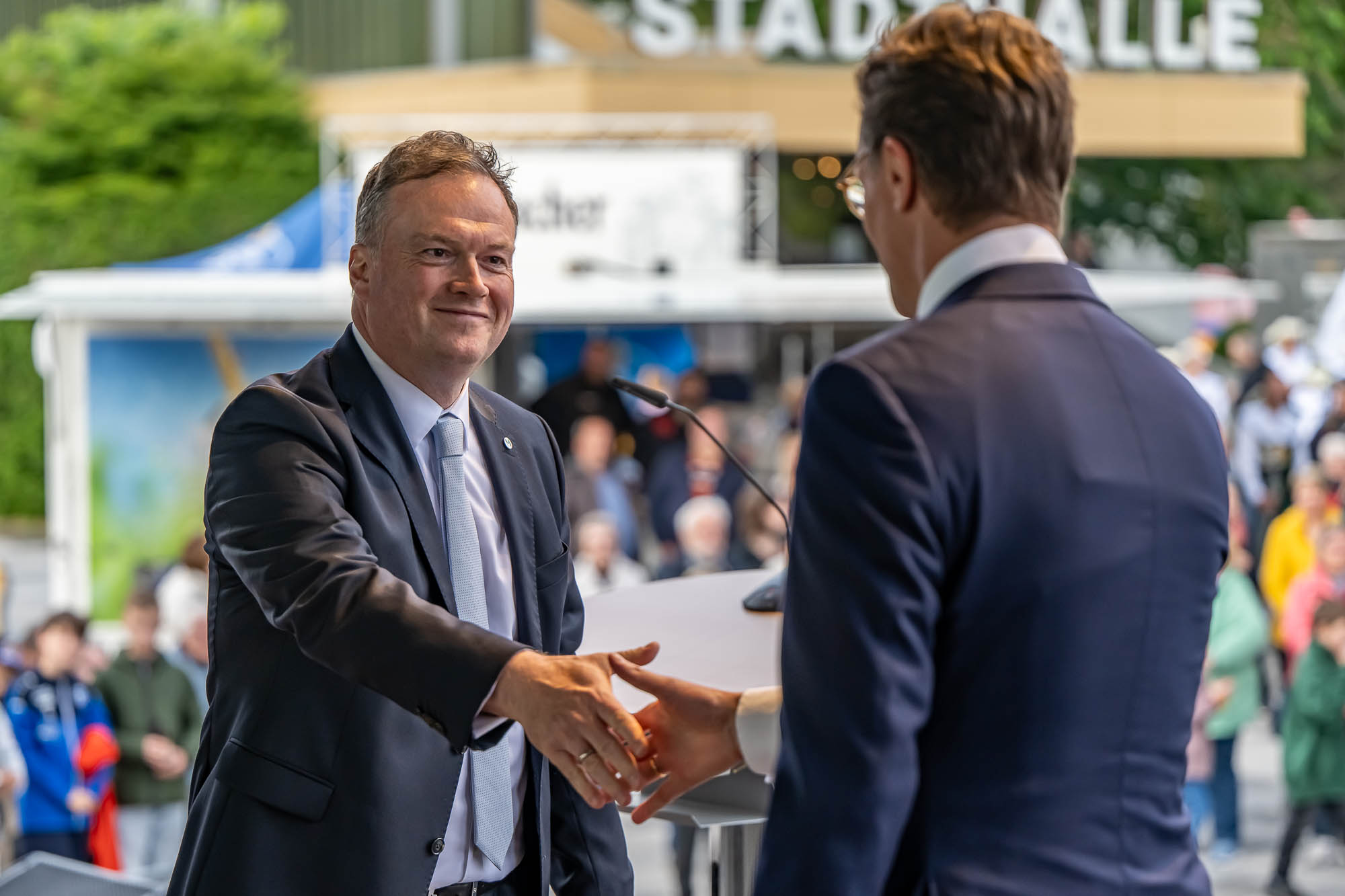 Zahlreiche Vertreter aus der Politik folgten der Einladung von Bürgermeister Jan Nesselrath zur 850-Jahr-Feier nach Meinerzhagen: Bürgermeisterinnen und Bürgermeister der umliegenden Kommunen und sogar aus Attendorn, die hiesigen Landtagsabgeordneten Gordon Dudas und Ralf Schwarzkopf, der auch als stellvertretender Landrat sprach und Marco Voge vertrat. Auch der Bundestagsabgeordnete Florian Müller überbrachte Glückwünsche. “Stargast” war allerdings NRW-Ministerpräsident Hendrik Wüst, der persönlich die Feierlichkeiten besuchte und sich nach seiner Ansprache gemeinsam mit Ralf Schwarzkopf ins Goldene Buch der Stadt eintrug. Bei den hunderten Besuchern, die sich bereits am späten Nachmittag vor der Stadthalle einfanden, kam Wüst offenbar gut an: Der gutgelaunte Politiker kam gerne zahlreichen Selfie-Wünschen nach und signierte Autogrammkarten.