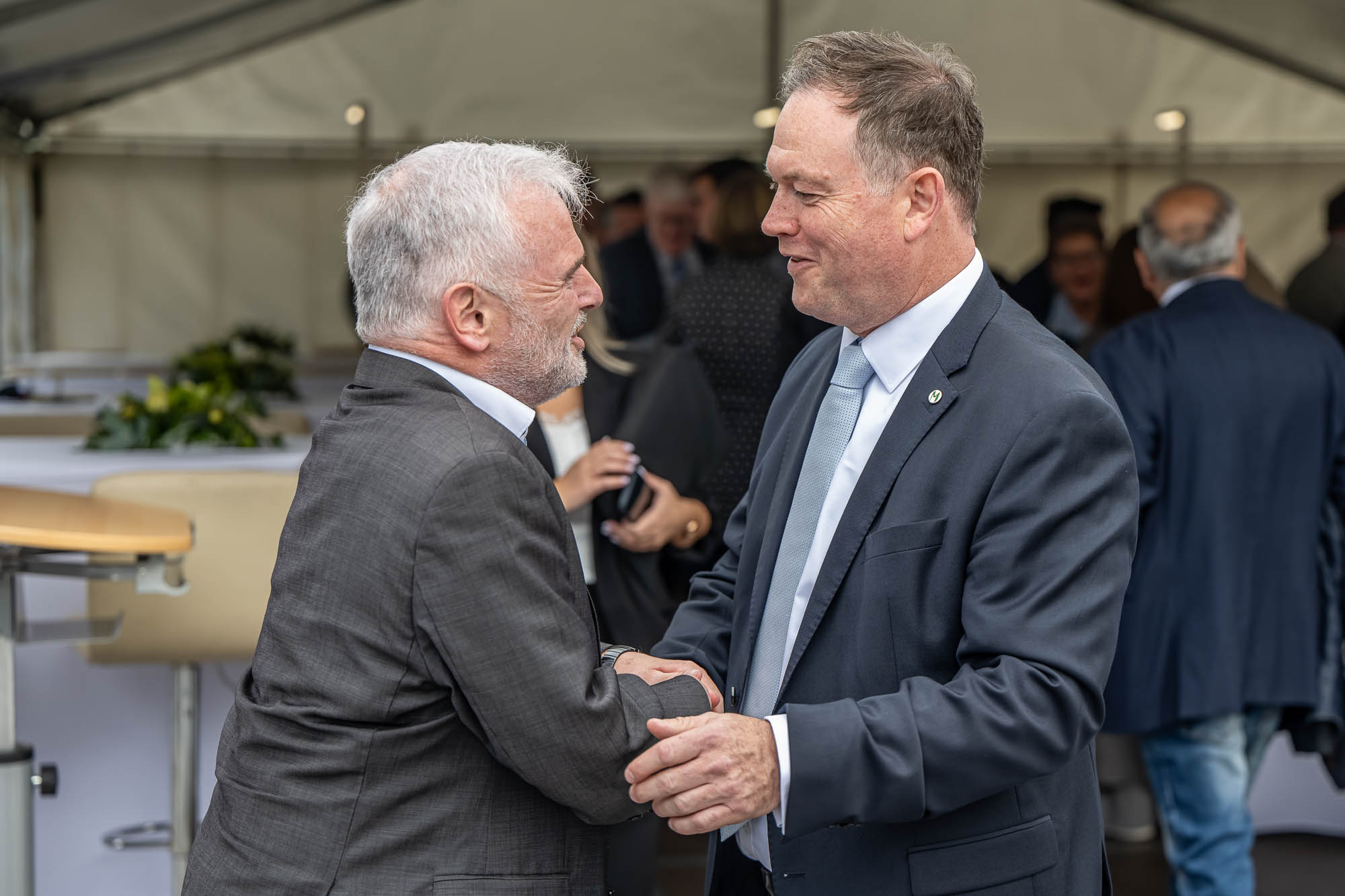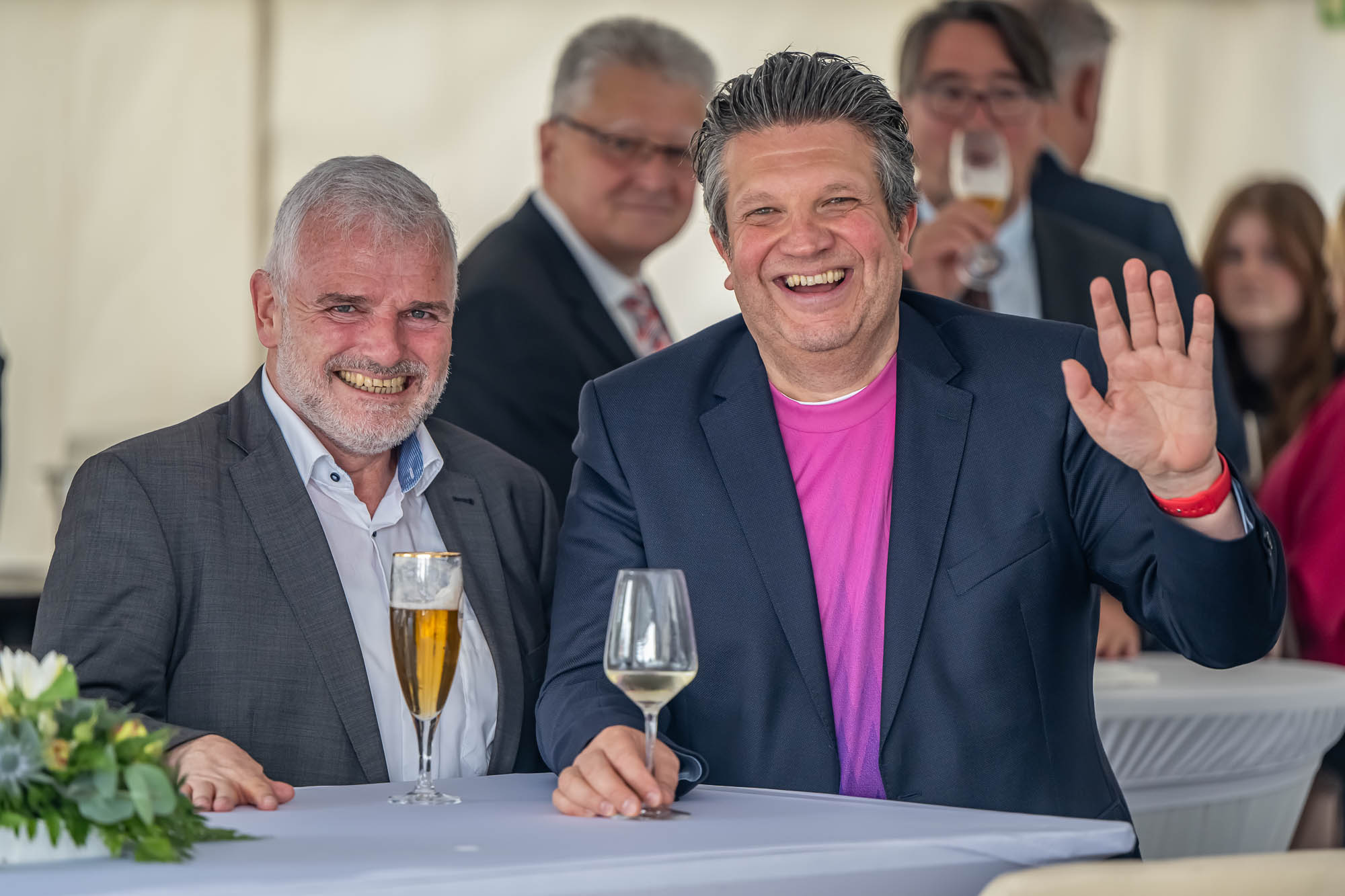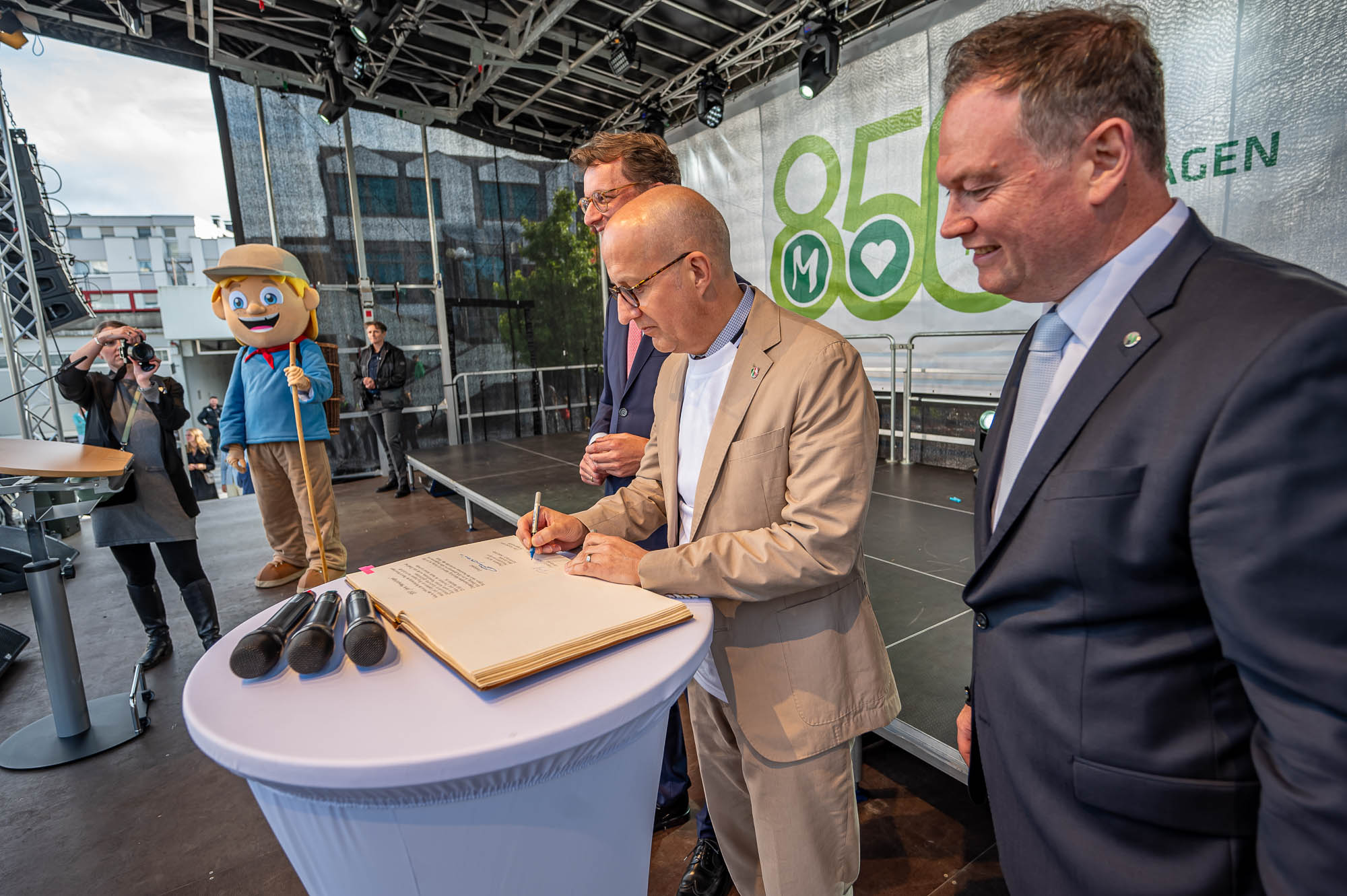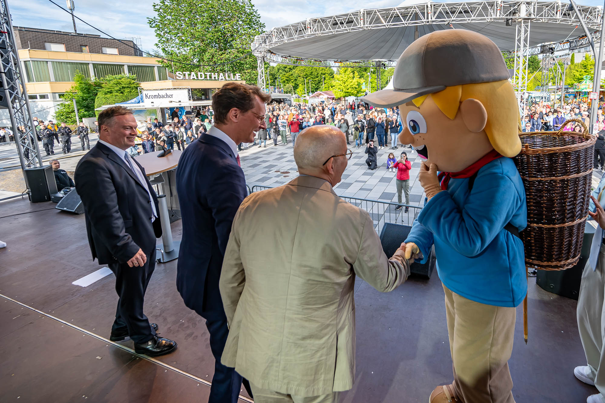 Zahlreiche Vertreter aus der Politik folgten der Einladung von Bürgermeister Jan Nesselrath zur 850-Jahr-Feier nach Meinerzhagen: Bürgermeisterinnen und Bürgermeister der umliegenden Kommunen und sogar aus Attendorn, die hiesigen Landtagsabgeordneten Gordon Dudas und Ralf Schwarzkopf, der auch als stellvertretender Landrat sprach und Marco Voge vertrat. Auch der Bundestagsabgeordnete Florian Müller überbrachte Glückwünsche. “Stargast” war allerdings NRW-Ministerpräsident Hendrik Wüst, der persönlich die Feierlichkeiten besuchte und sich nach seiner Ansprache gemeinsam mit Ralf Schwarzkopf ins Goldene Buch der Stadt eintrug. Bei den hunderten Besuchern, die sich bereits am späten Nachmittag vor der Stadthalle einfanden, kam Wüst offenbar gut an: Der gutgelaunte Politiker kam gerne zahlreichen Selfie-Wünschen nach und signierte Autogrammkarten.