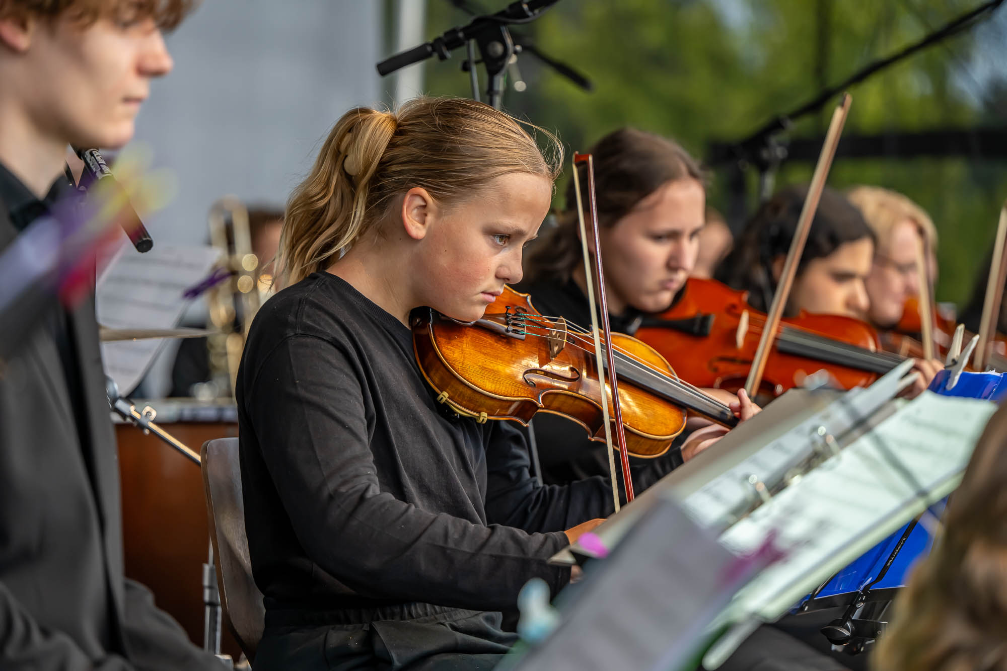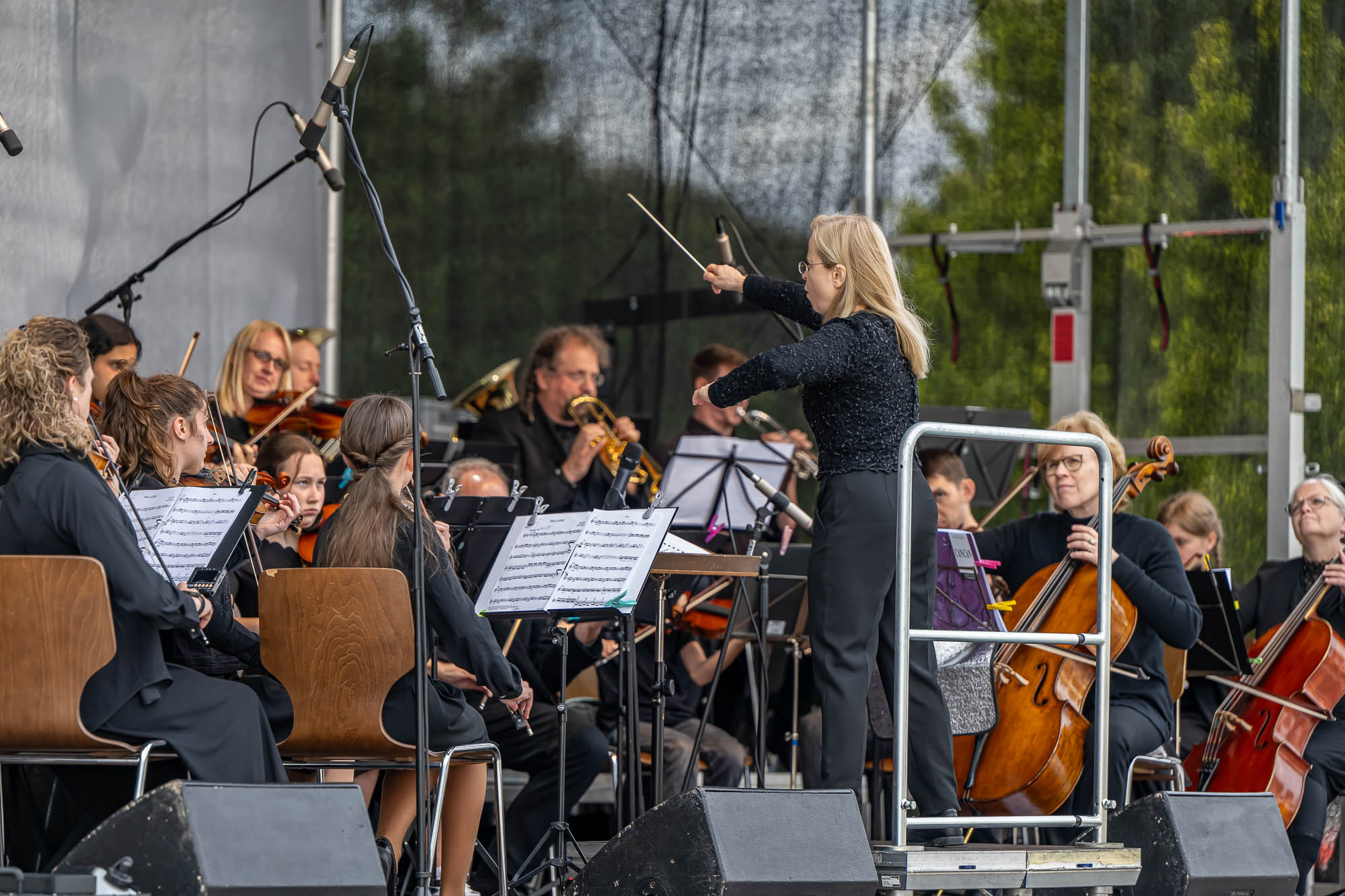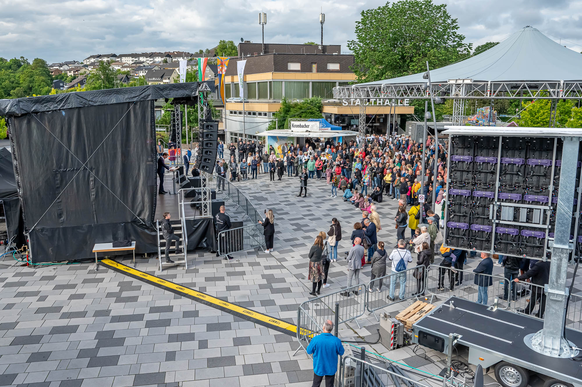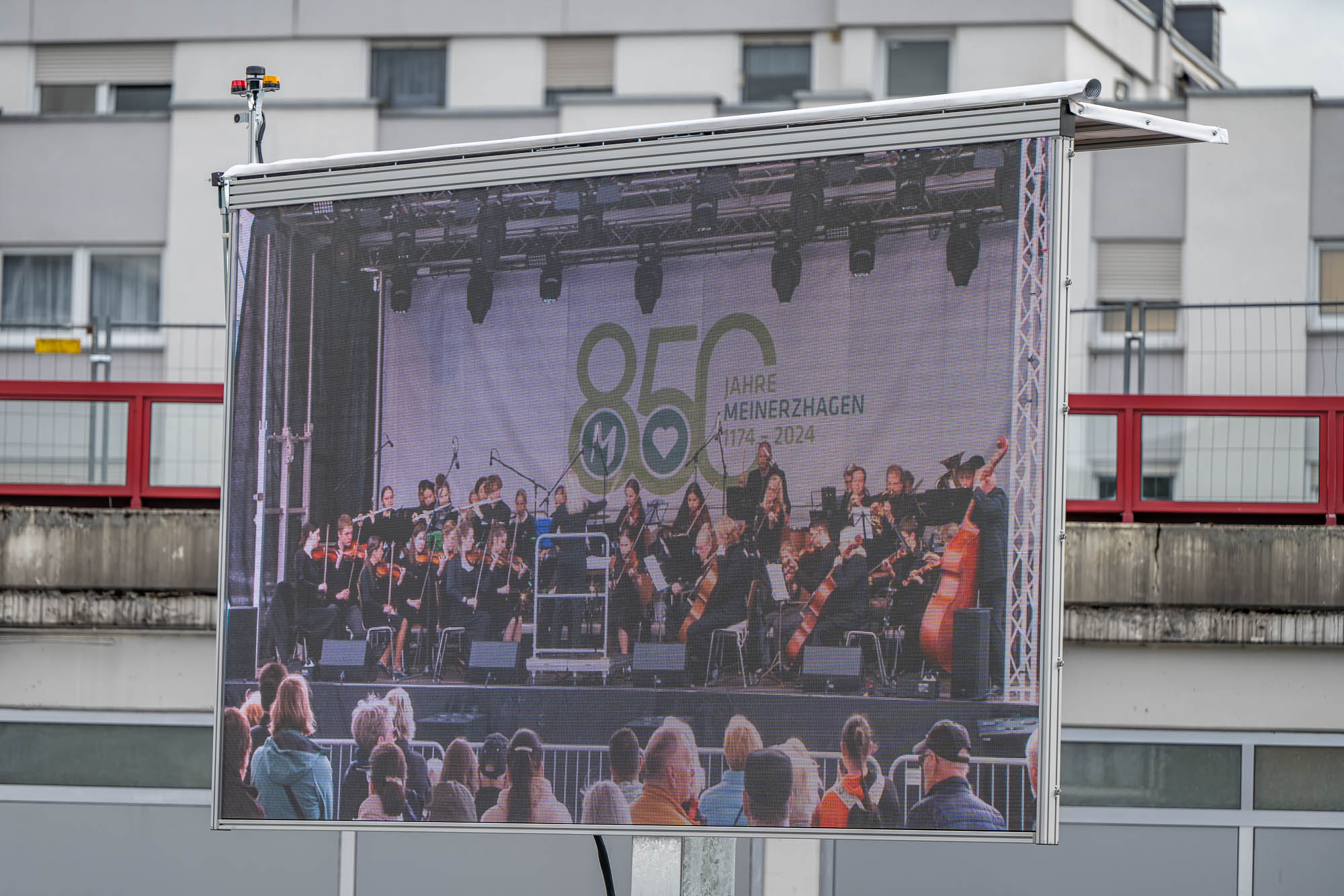 MEINERZHAGEN (mk) Eine urkundliche Erwähnung im Jahre 1174 führt zu einem umfangreichen Jubiläumsprogramm, in dem die Stadt Meinerzhagen nun ihren 850. Geburtstag feiert. Der Auftakt fällt auf den Beginn der Fussball-Europameisterschaft, daher wurde das Programm am Freitag, 14. Juni, quasi um das Eröffnungsspiel “drumherumgebaut”: Bereits gegen 17 Uhr nahm das Sinfonieorchester der Musikschule Meinerzhagen den Platz auf der Bühne ein — und die stand natürlich auf dem Otto-Fuchs-Platz. Gespielt wurden ausgesprochen dynamische Stücke der Klassik-Welt, wie beispielsweise Brahms Ungarische Tänze und andere bekannte Melodien. Dirk Weiland führte als Moderator und später als DJ durch das Programm.