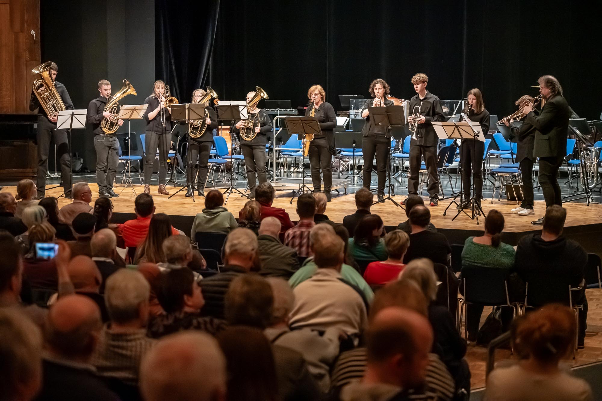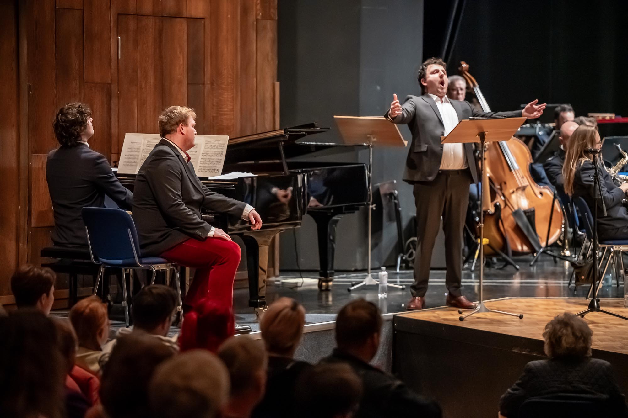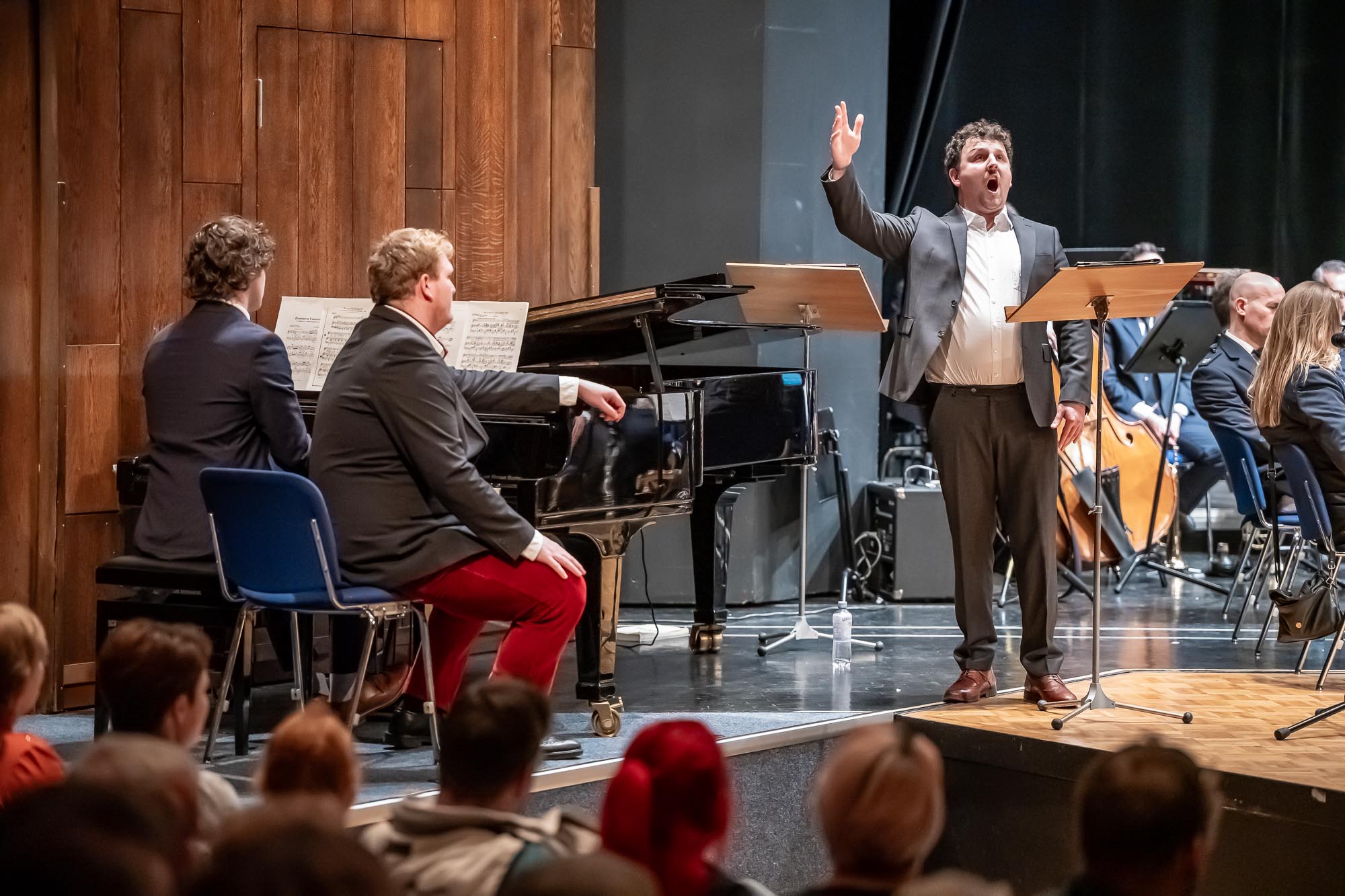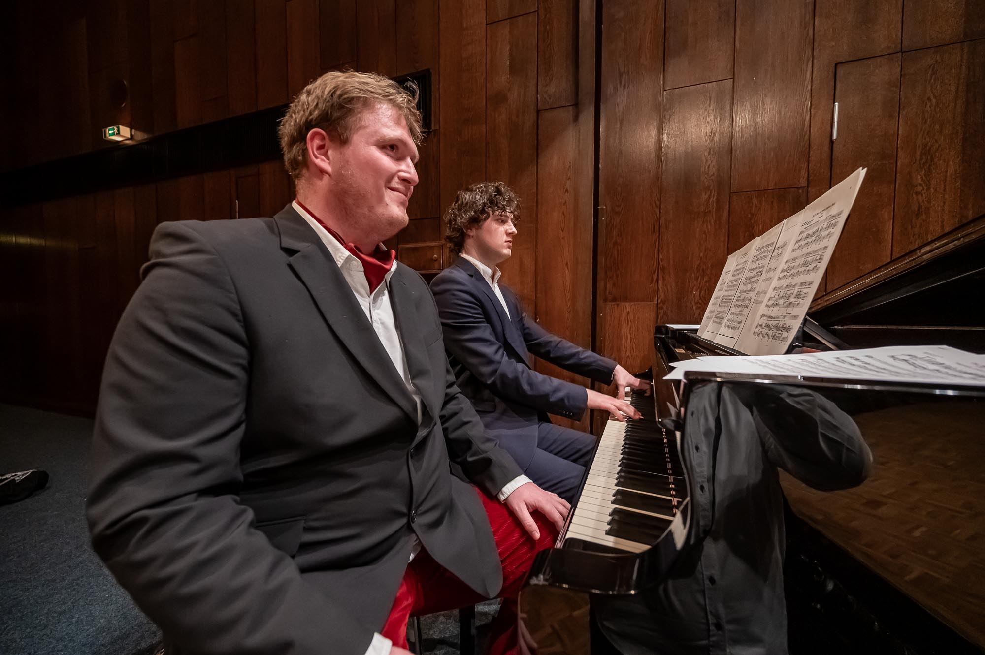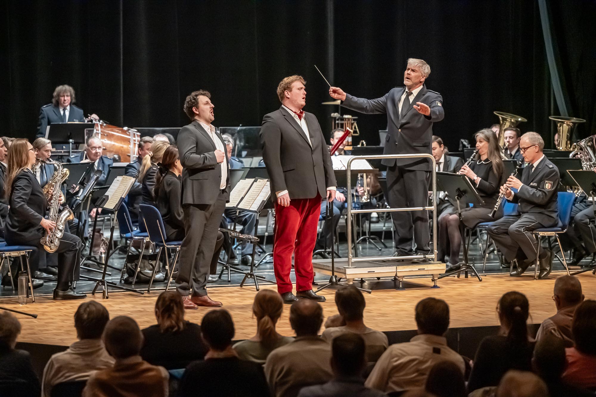 In die Stilrichtung Pop ging mit der Volme-Sound-Connection. Diese Blechbläser mitsamt Schlagzeuger gehören auch zur Musikschule Volmetal und spielten und der Leitung von André Becker ein Michael-Jackson-Medley, aber auch bekannte Hits wie “Big Spender”. Als anschließend kurzzeitig das Landespolizeiorchster erneut ins Programm einstieg, wurde es mit dem Komponisten Giuseppe Verdi italienisch: Die perfekte Überleitung zu den beiden Tenören Maximilian Daum und Jonas Wuermeling. Tobias Dietrich spielte dazu am Flügel. Das Repertoire: Mit Schuberts “Ave Maria” oder Wagners “Winterstürmes”, überwiegend klassisch ausgeprägt.