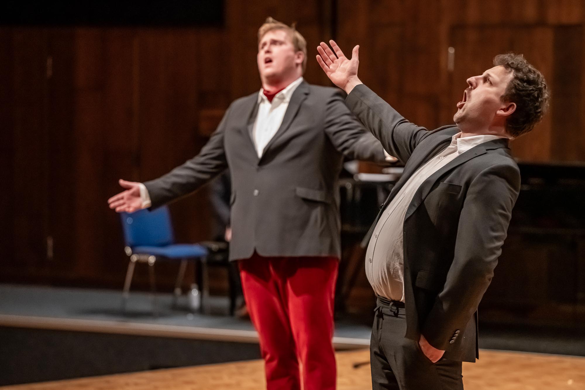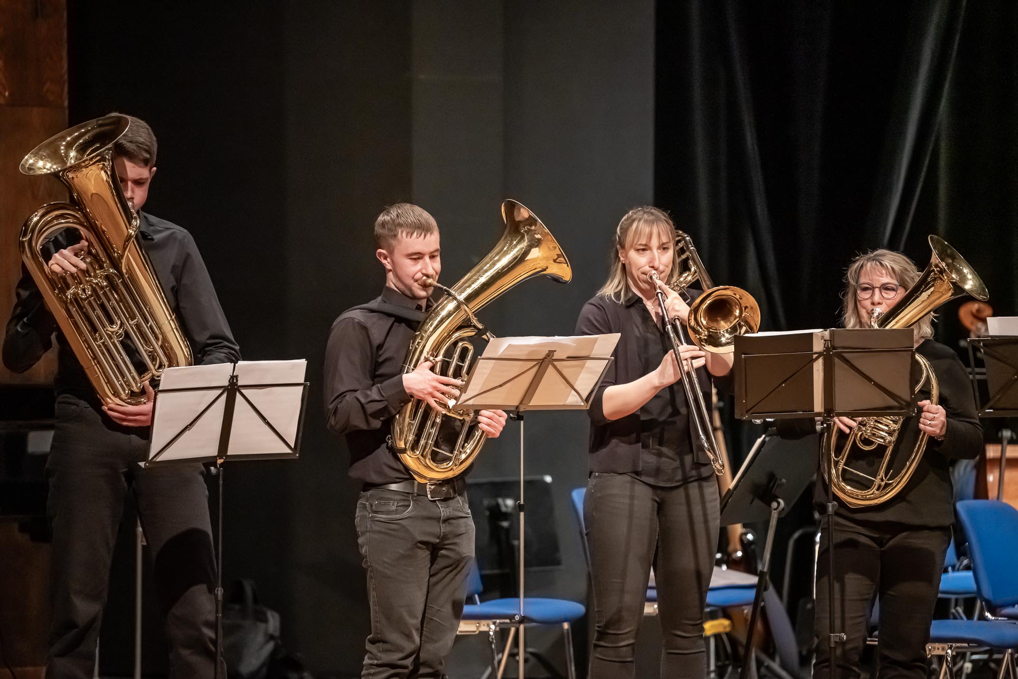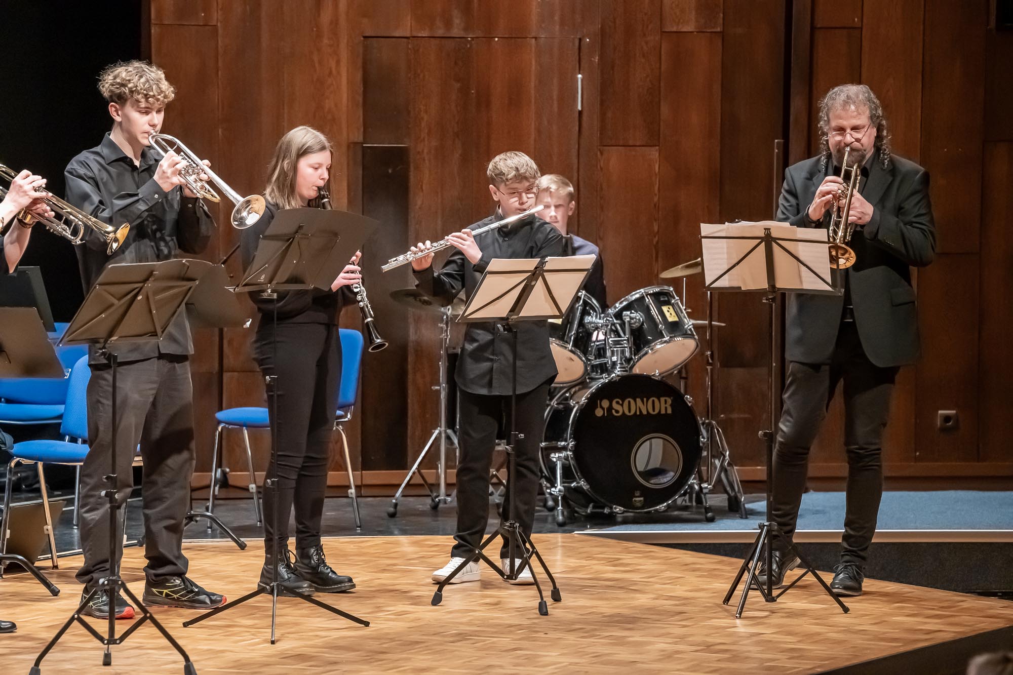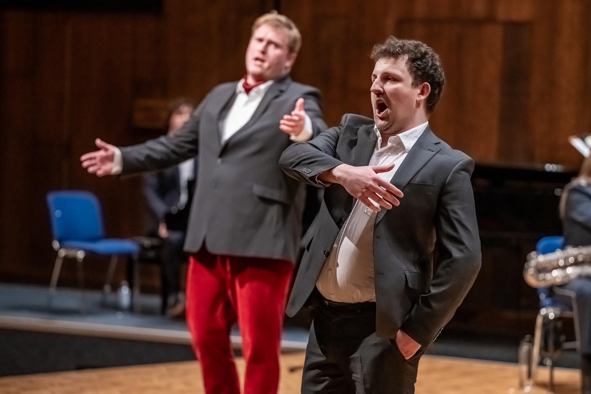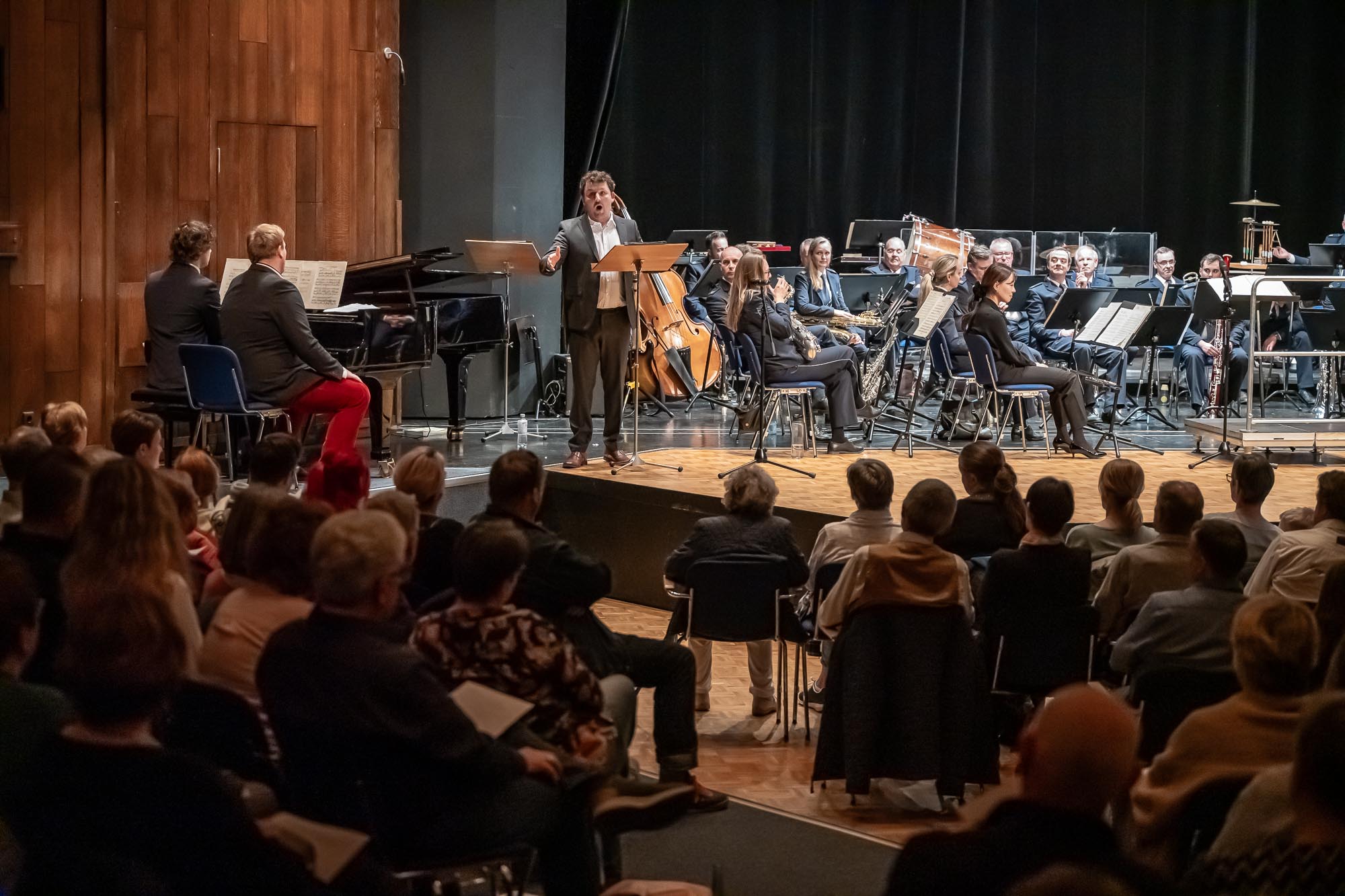 In die Stilrichtung Pop ging mit der Volme-Sound-Connection. Diese Blechbläser mitsamt Schlagzeuger gehören auch zur Musikschule Volmetal und spielten und der Leitung von André Becker ein Michael-Jackson-Medley, aber auch bekannte Hits wie “Big Spender”. Als anschließend kurzzeitig das Landespolizeiorchster erneut ins Programm einstieg, wurde es mit dem Komponisten Giuseppe Verdi italienisch: Die perfekte Überleitung zu den beiden Tenören Maximilian Daum und Jonas Wuermeling. Tobias Dietrich spielte dazu am Flügel. Das Repertoire: Mit Schuberts “Ave Maria” oder Wagners “Winterstürmes”, überwiegend klassisch ausgeprägt.