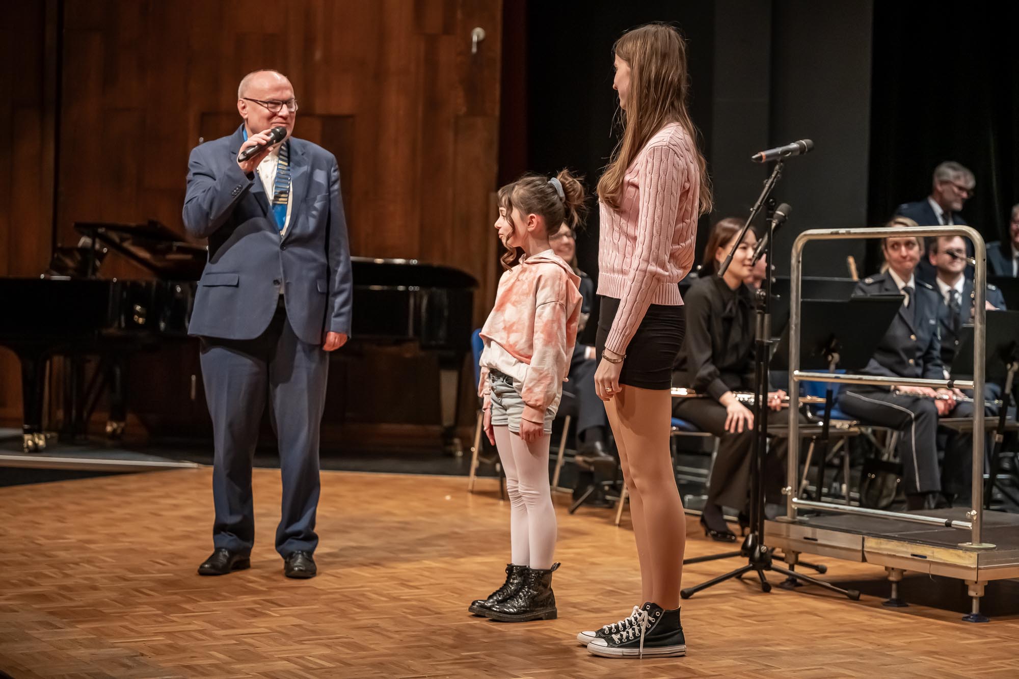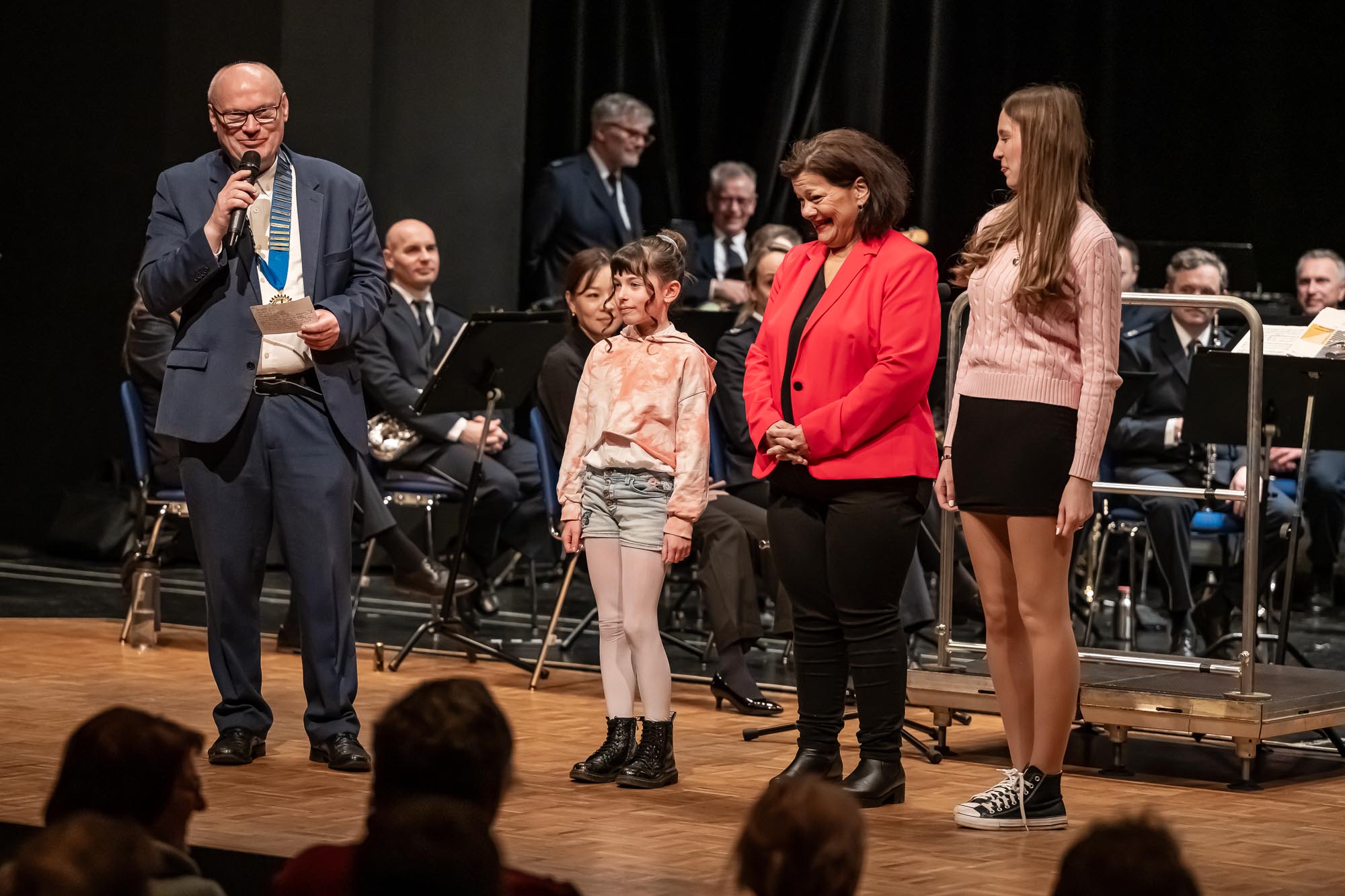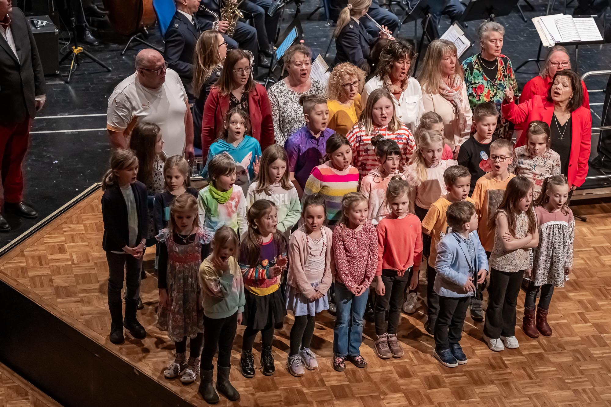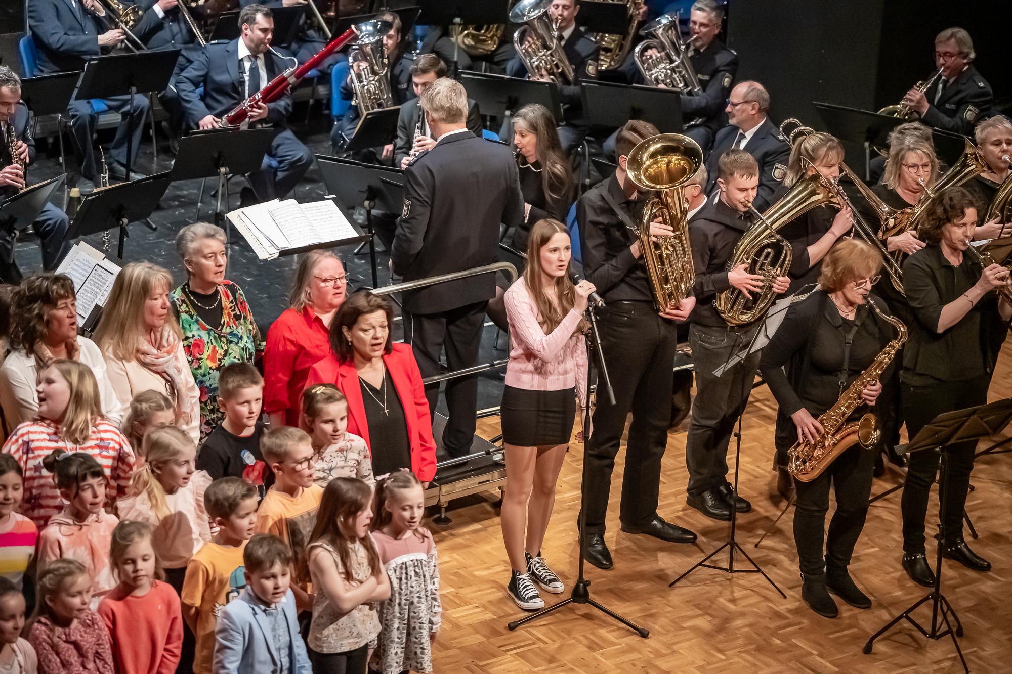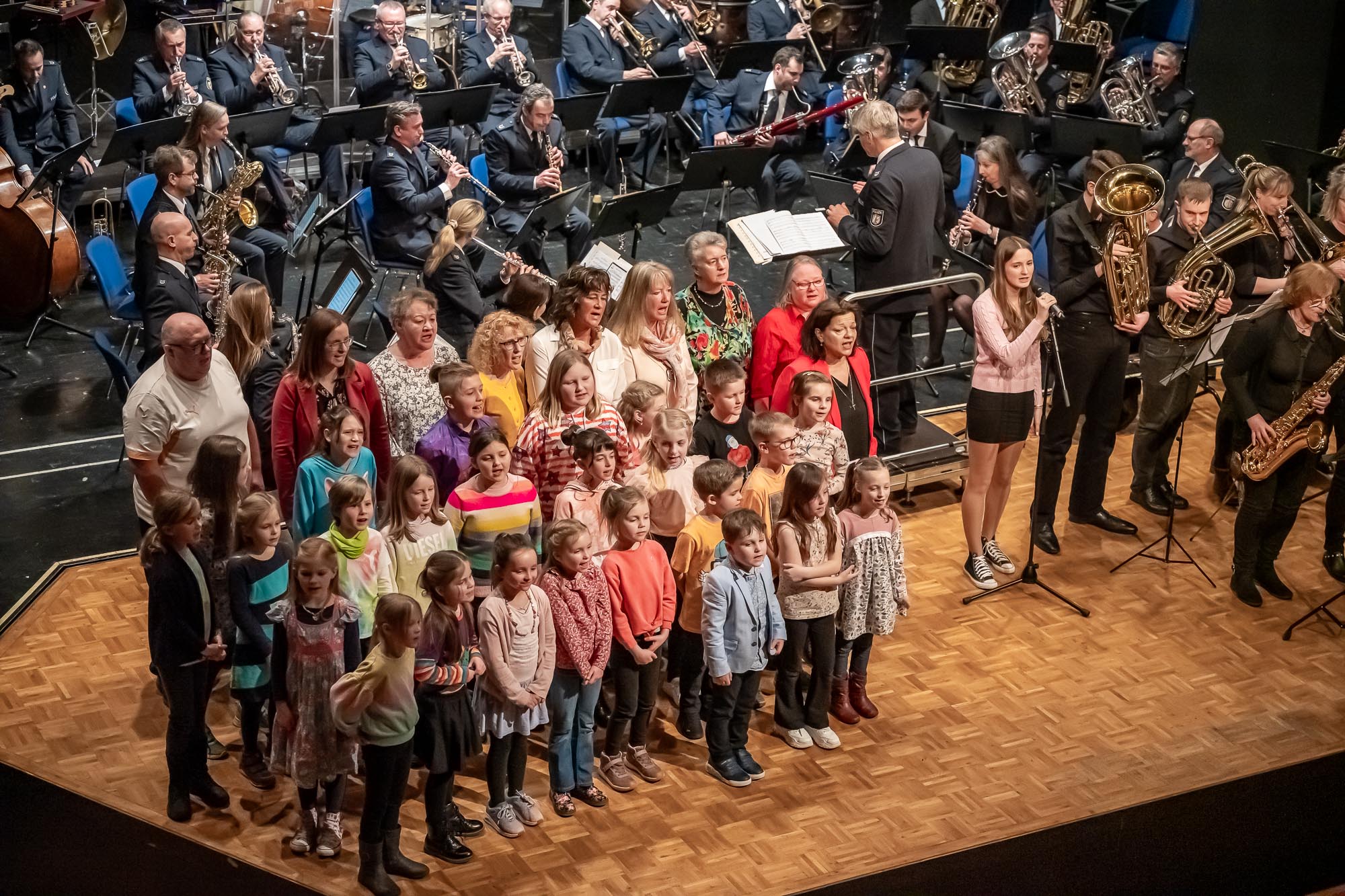 Dass die Tenöre und das Polizeiorchester musikalisch harmonierten, bewiesen sie mit “O Sole Mio” oder “Halleluja”, einem der bekanntesten Stücke von Leonard Cohen. Zu diesem Zeitpunkt neigte sich der Konzertnachmittag bereits dem Ende zu. Das wurde fulminant: Auf dem Programmblatt stand Michael Jacksons “Heel the world” als Solo-Gesang von Mia Schmermbeck. Was mit den Worten “Refrain: alle zusammen” eher beiläufig formuliert war, kündigte eine ergreifende Darbietung an, an der alle Musikerinnen und Musiker gemeinsam mitwirkten und die Gäste restlos begeisterte.