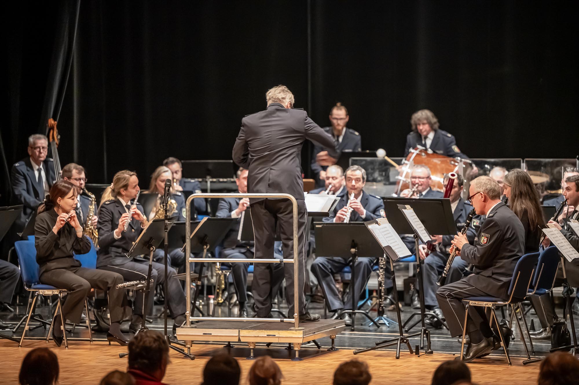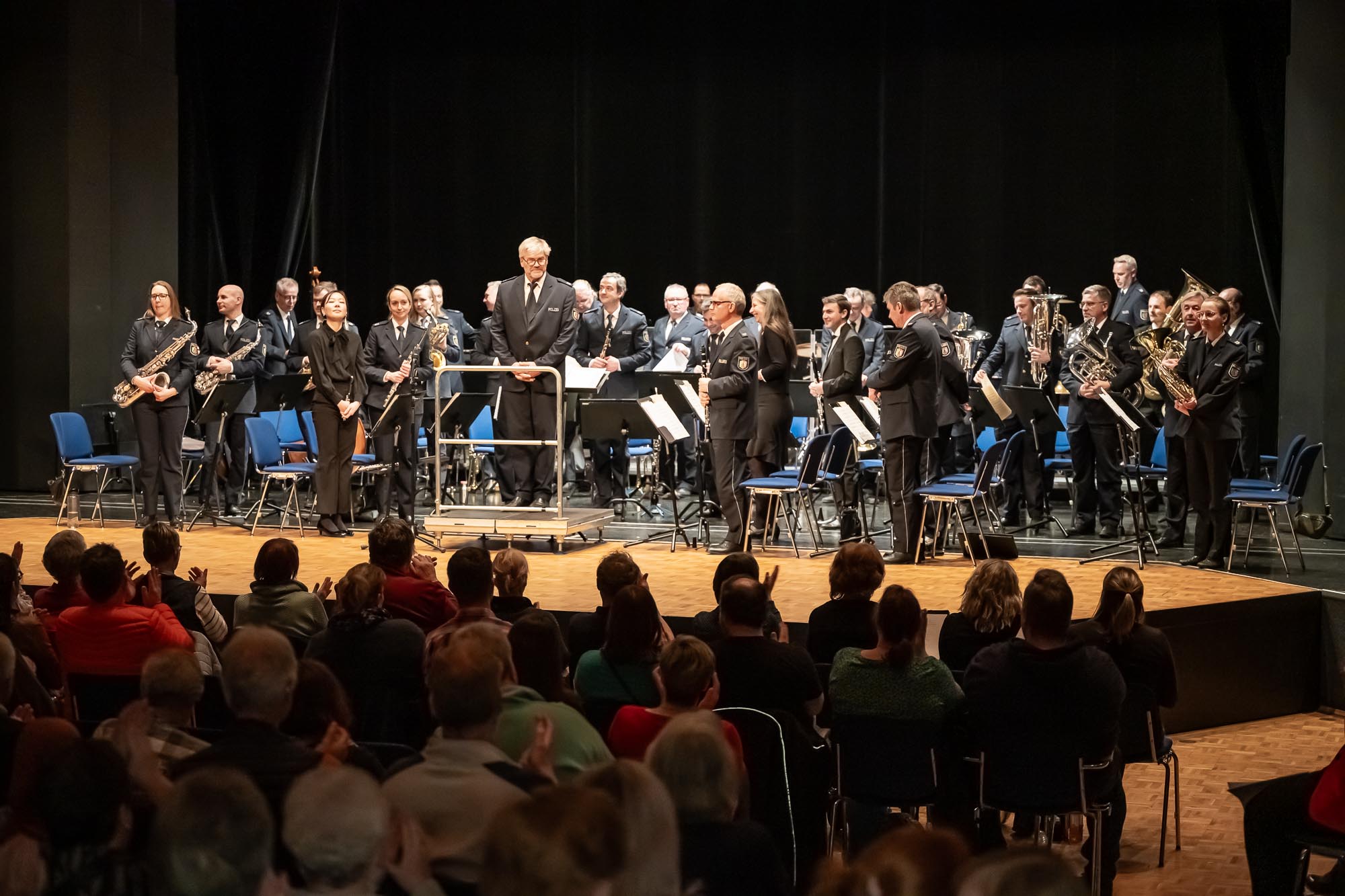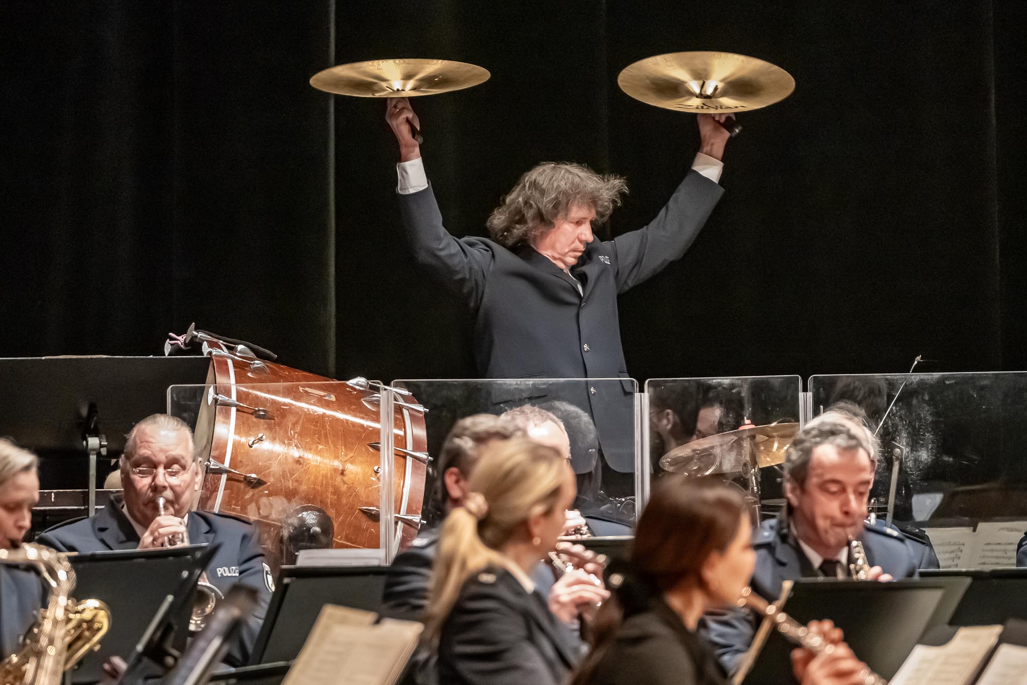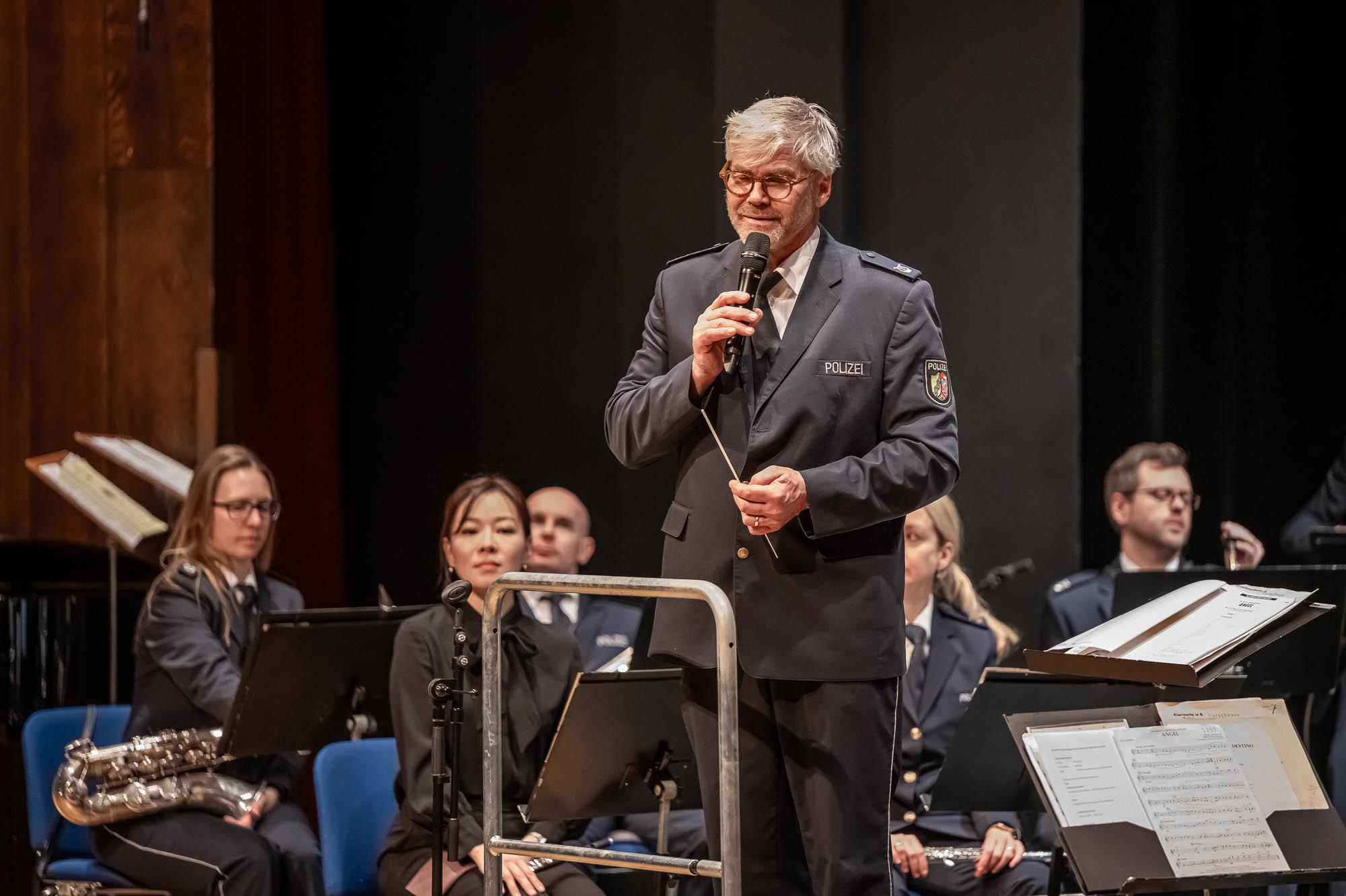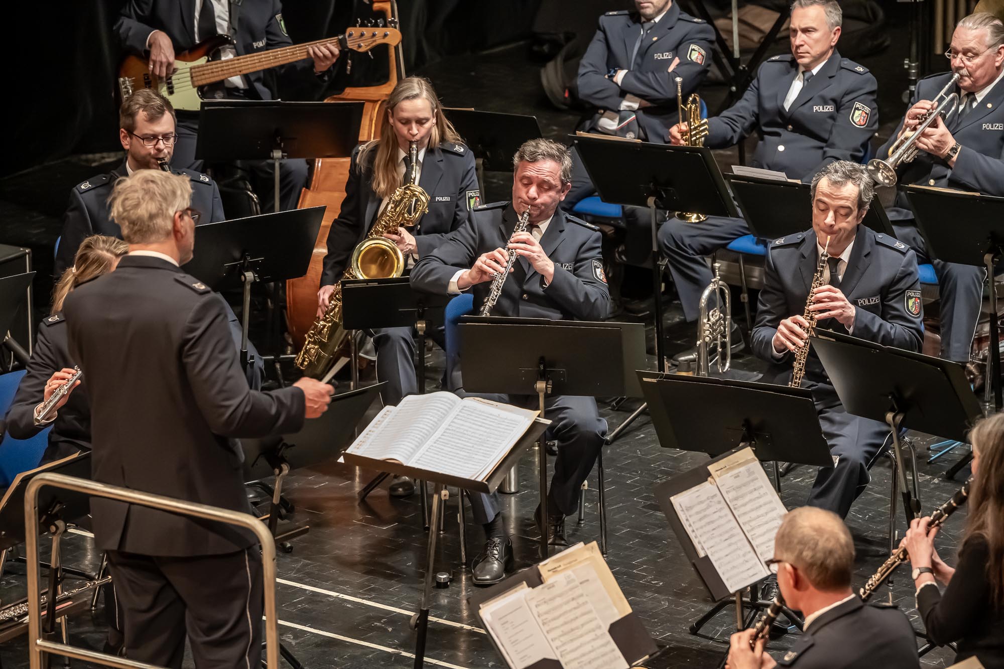 Das Publikum in der fast vollbesetzten Stadthalle widmete seine Aufmerksamkeit aber dem musikalischen Programm. Das von Burkhard Flüß maßgeblich organisierte Konzert weckte schon mit dem ersten Titel hohe Erwartungen: Mit “Te Deum”, umgangssprachlich als Eurovisions-Hymne bekannt, sorgte das Landespolizeiorchster NRW vom ersten Moment an für Gänsehaut. In dem vom US-Amerikaner Scott Lawton geführten Ensemble spielen derzeit bis zu 45 Musikerinnen und Musiker aus neun Nationen und quer durch verschiedene musikalische Genres.