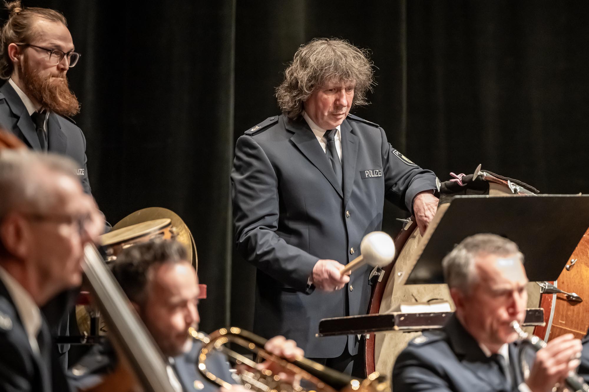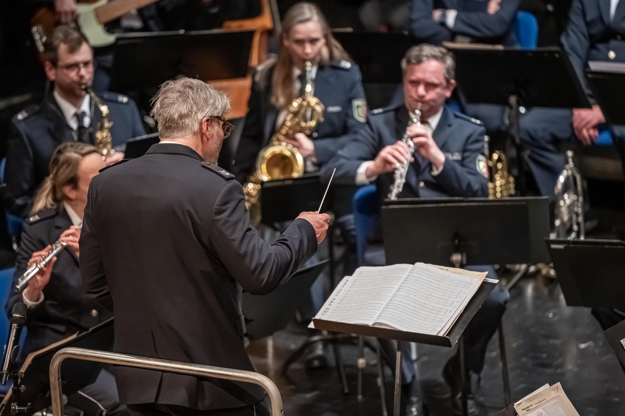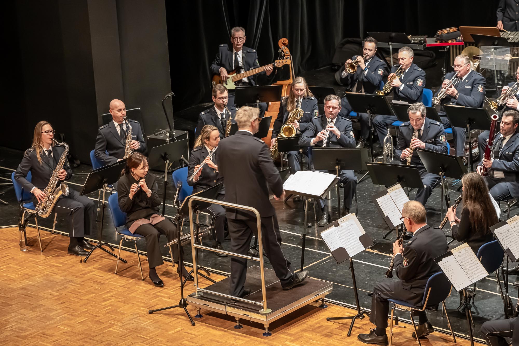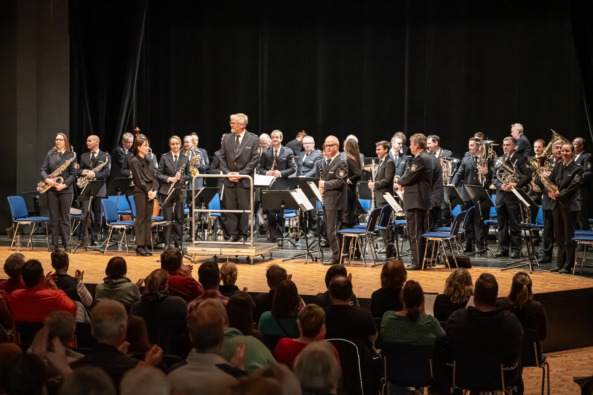 Das Publikum in der fast vollbesetzten Stadthalle widmete seine Aufmerksamkeit aber dem musikalischen Programm. Das von Burkhard Flüß maßgeblich organisierte Konzert weckte schon mit dem ersten Titel hohe Erwartungen: Mit “Te Deum”, umgangssprachlich als Eurovisions-Hymne bekannt, sorgte das Landespolizeiorchster NRW vom ersten Moment an für Gänsehaut. In dem vom US-Amerikaner Scott Lawton geführten Ensemble spielen derzeit bis zu 45 Musikerinnen und Musiker aus neun Nationen und quer durch verschiedene musikalische Genres.