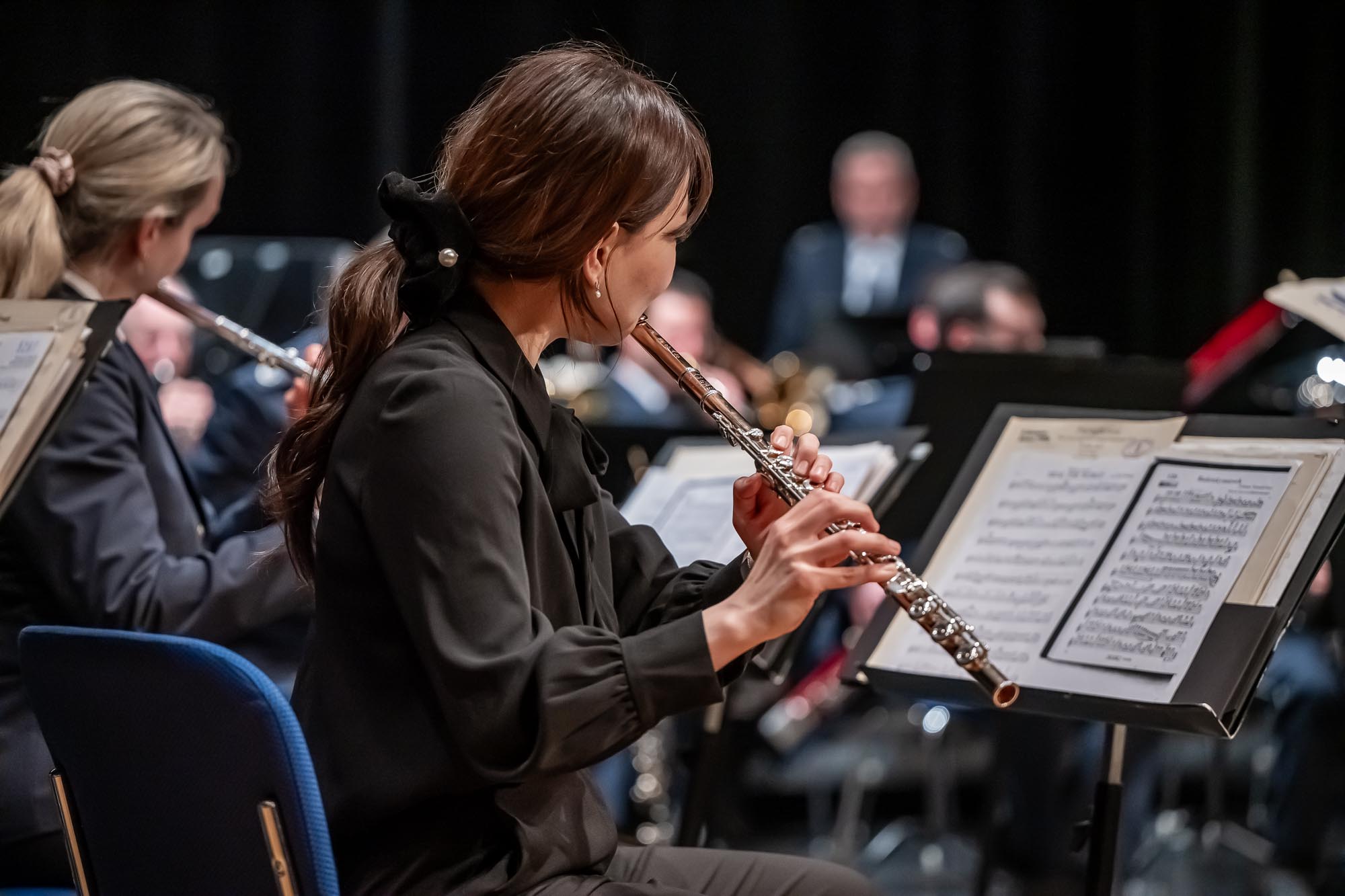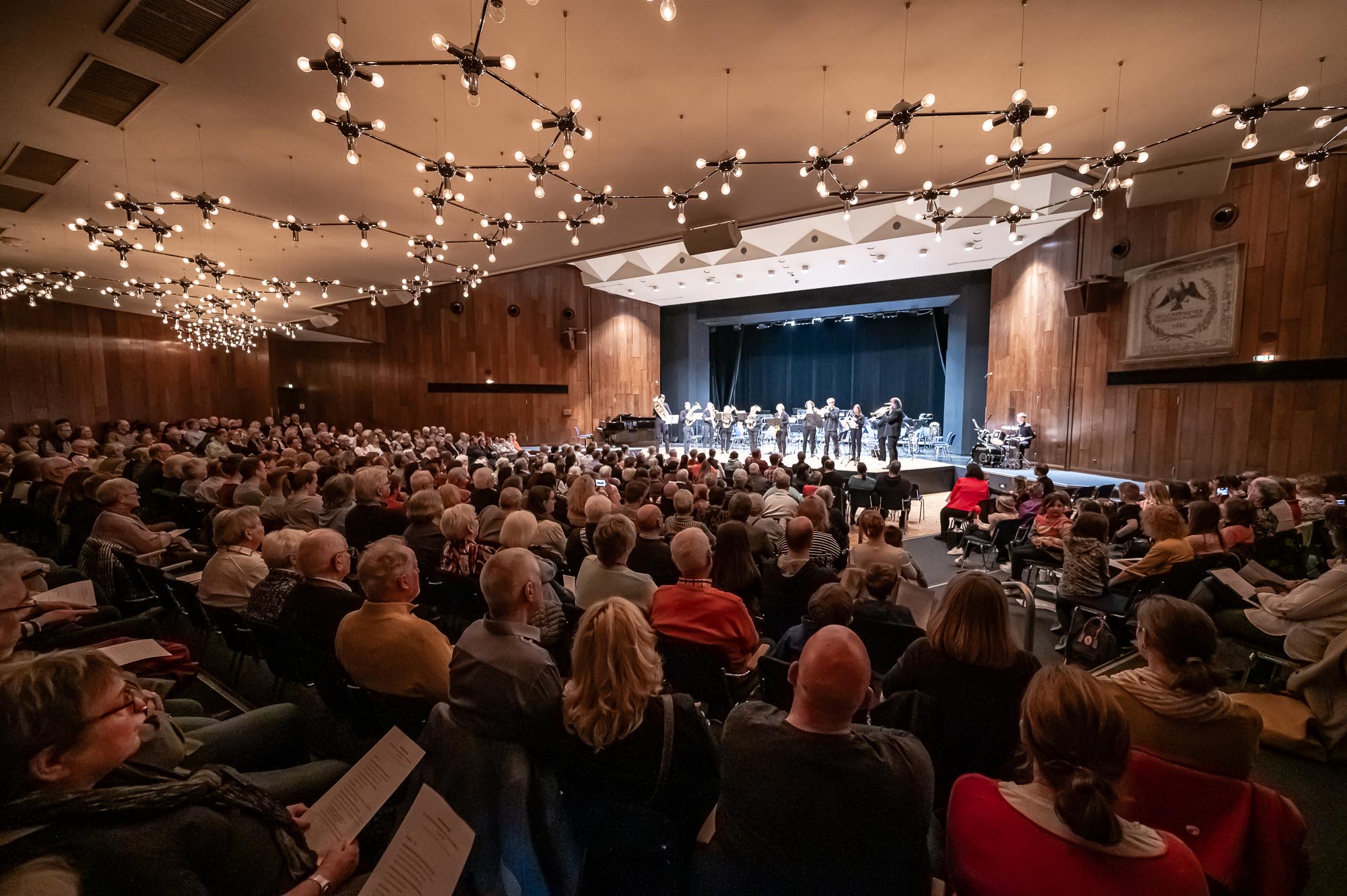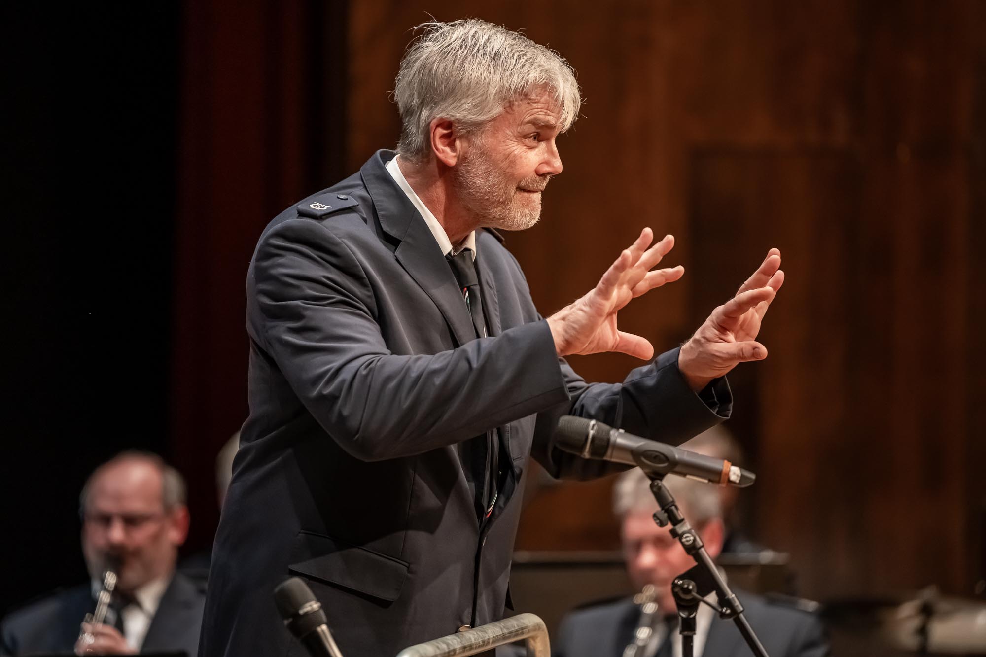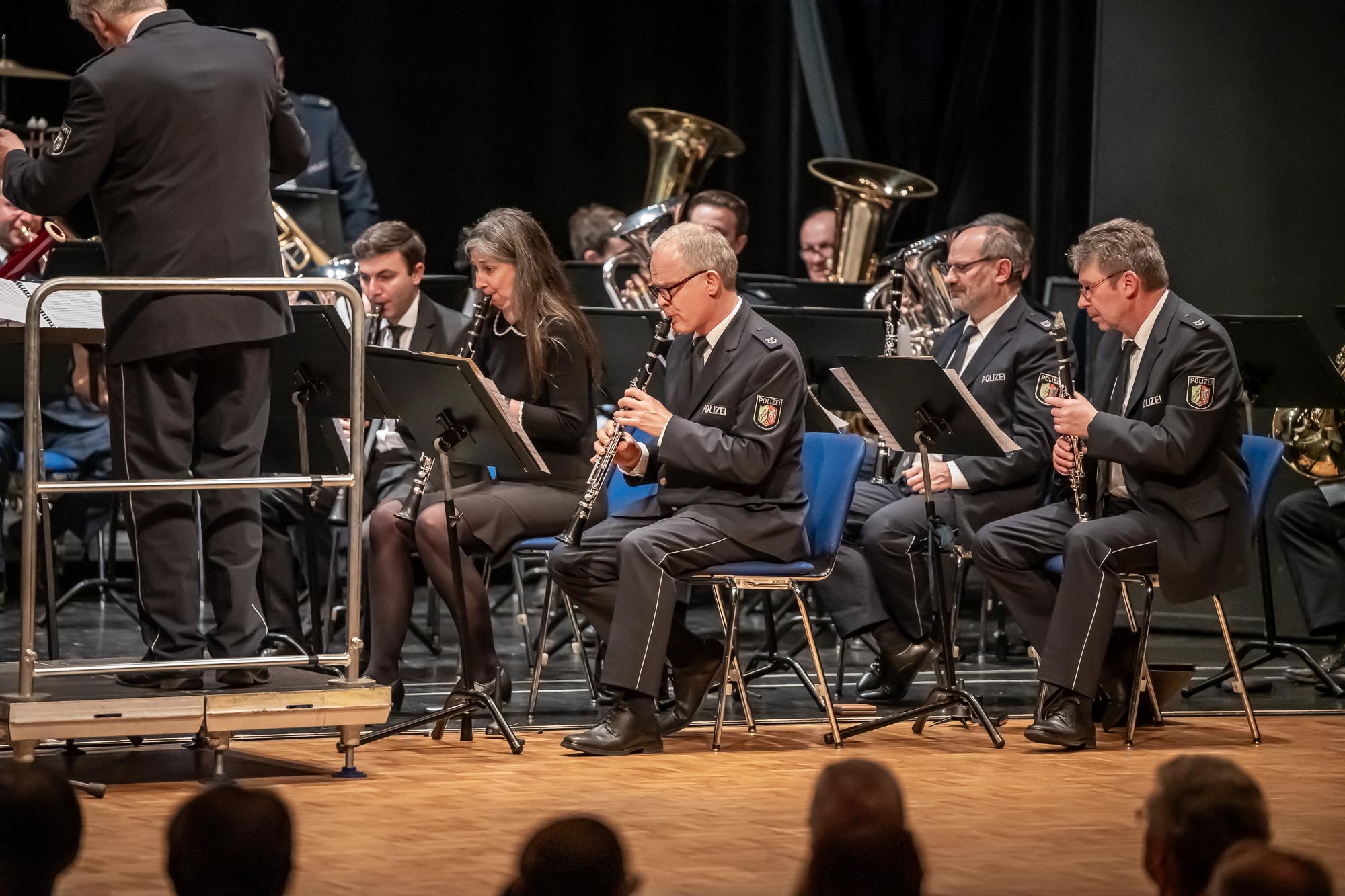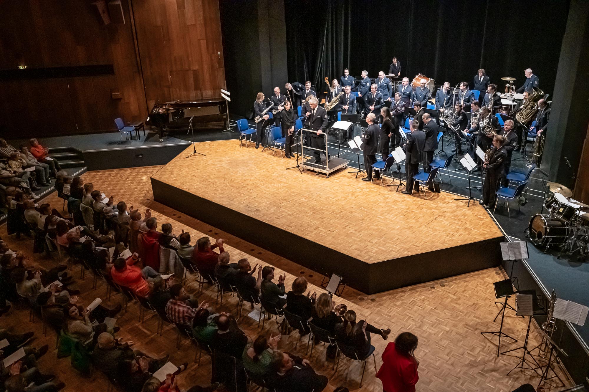 Das Publikum in der fast vollbesetzten Stadthalle widmete seine Aufmerksamkeit aber dem musikalischen Programm. Das von Burkhard Flüß maßgeblich organisierte Konzert weckte schon mit dem ersten Titel hohe Erwartungen: Mit “Te Deum”, umgangssprachlich als Eurovisions-Hymne bekannt, sorgte das Landespolizeiorchster NRW vom ersten Moment an für Gänsehaut. In dem vom US-Amerikaner Scott Lawton geführten Ensemble spielen derzeit bis zu 45 Musikerinnen und Musiker aus neun Nationen und quer durch verschiedene musikalische Genres.