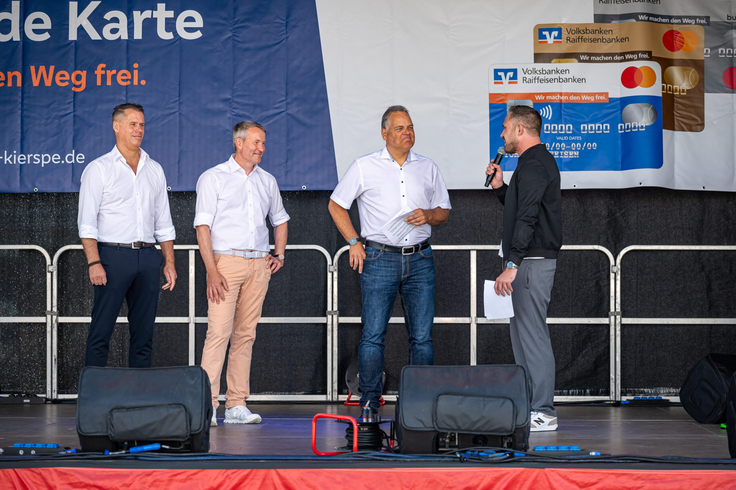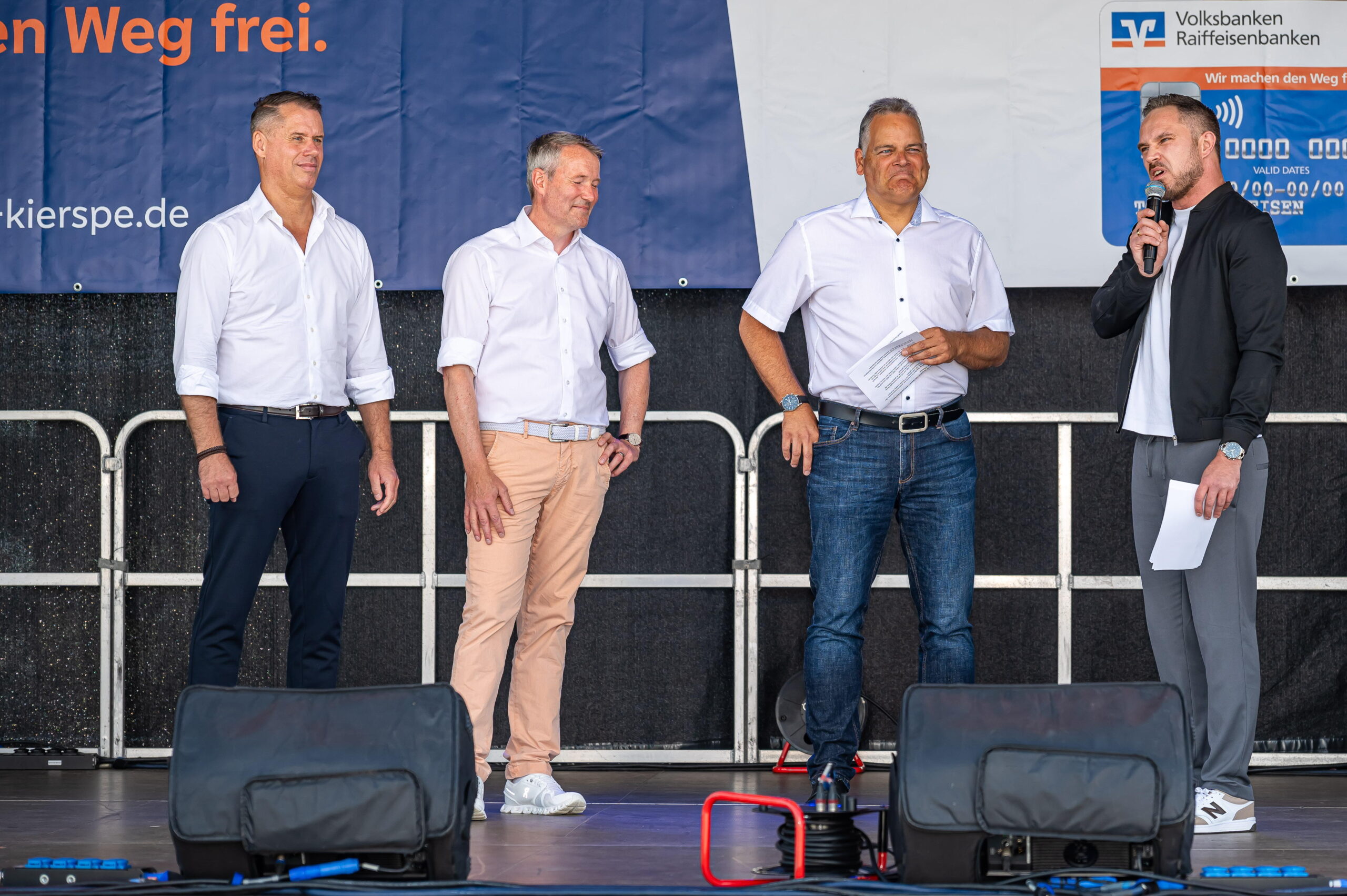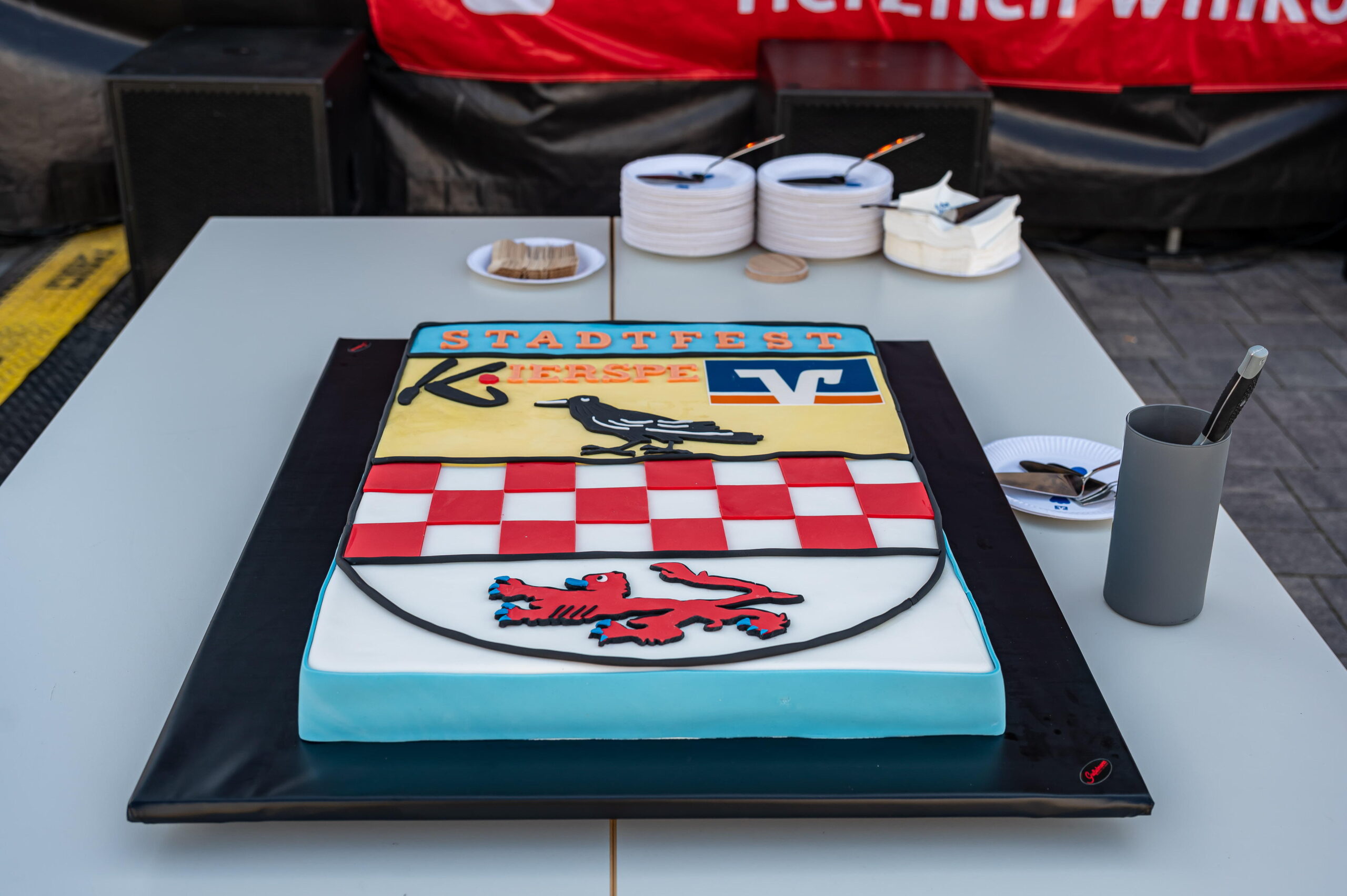 KIERSPE (mk) Sonnig-warm ist es, und so strömen viele Menschen zum Forum vor der Gesamtschule. Hier wurde am heutigen Samstag das Stadtfest eröffnet. Bürgermeister Olaf Stelse begrüßte die Gäste mit einer kurzen Ansprache, und wurde dabei, vor allem beim anschließenden Tortenanschnitt von den Volksbank-Vorständen Stephan Baldschun und Stephan Böhme tatkräftig unterstützt.