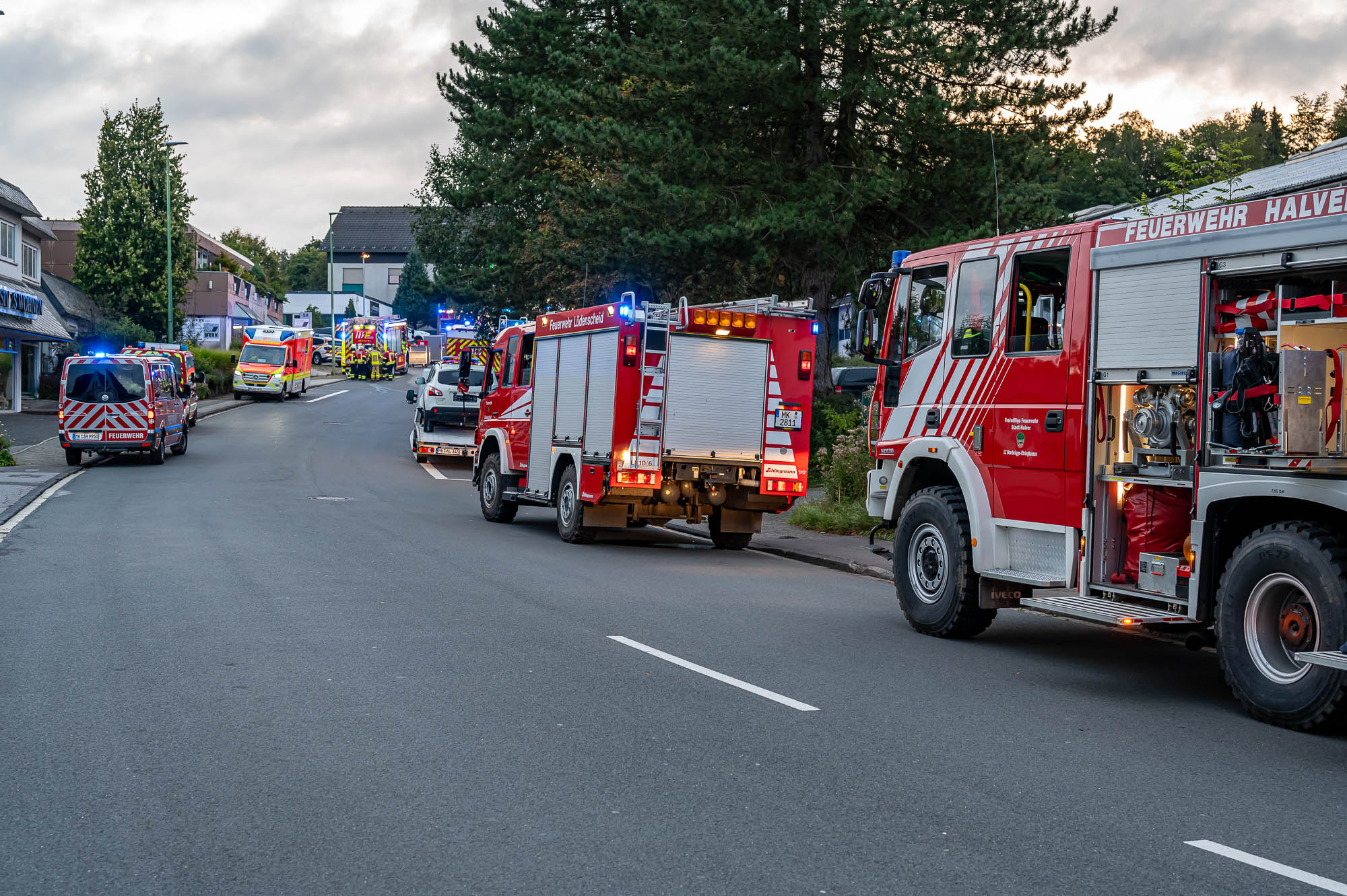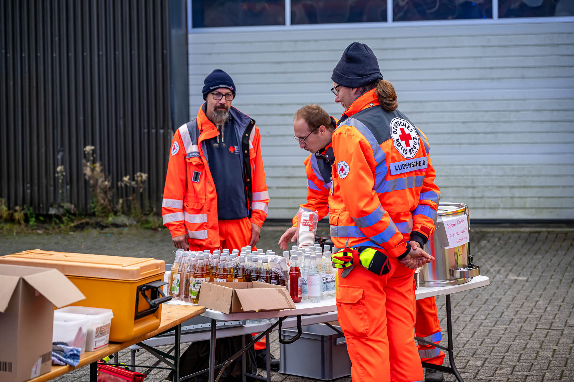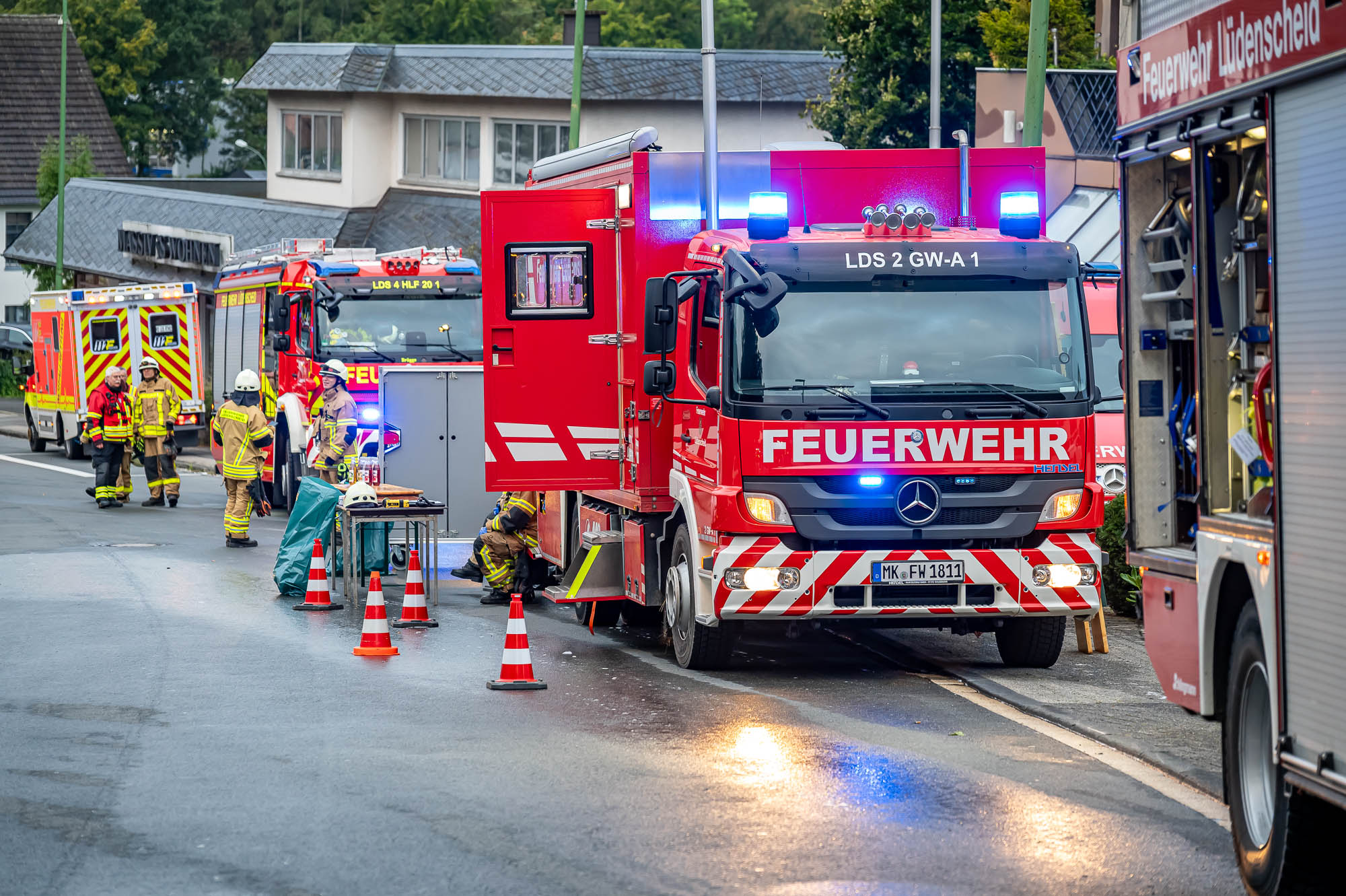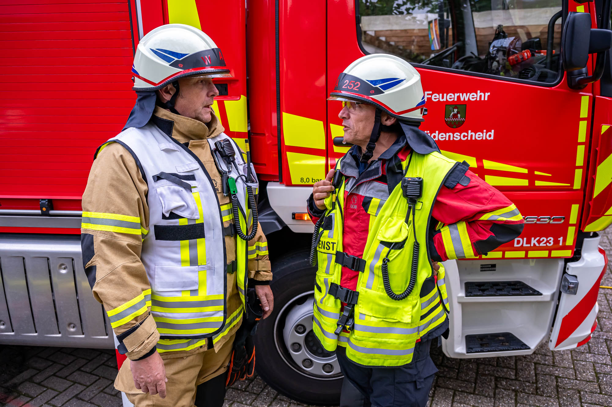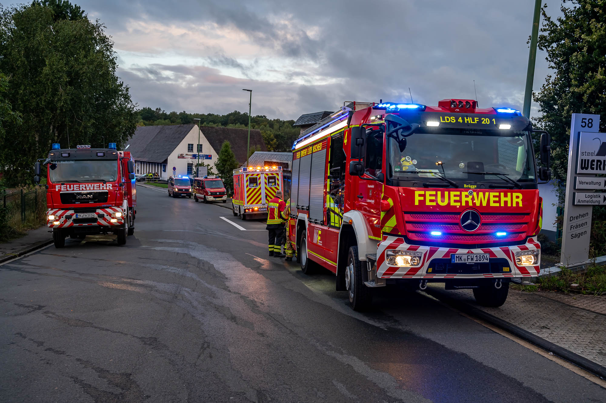 Für die Lüdenscheider Wehr war in der Nacht Stadtalarm ausgerufen worden. Aus dem gemeldeten “Brand am Gebäude” wurde schnell ein “Entwickelter Brand”, nach und nach wurden immer mehr Kräfte nachalarmiert. Die Löschzüge Brügge und Brüninghausen sorgten für den Grundschutz. Zunächst sollten sich die dortigen Kameraden in ihren Gerätehäusern bereithalten, später besetzten sie die Hauptamtliche Wache am Dukatenweg. Direkt an die Einsatzstelle alarmiert wurden allerdings Wehrleute aus Halver, die mit ihrem Teleskopmast die vorhandene Drehleiter gut ergänzten. Um die Versorgung der vielen Einsatzkräfte kümmerten sich Ehrenamtliche vom Deutschen Roten Kreuz.