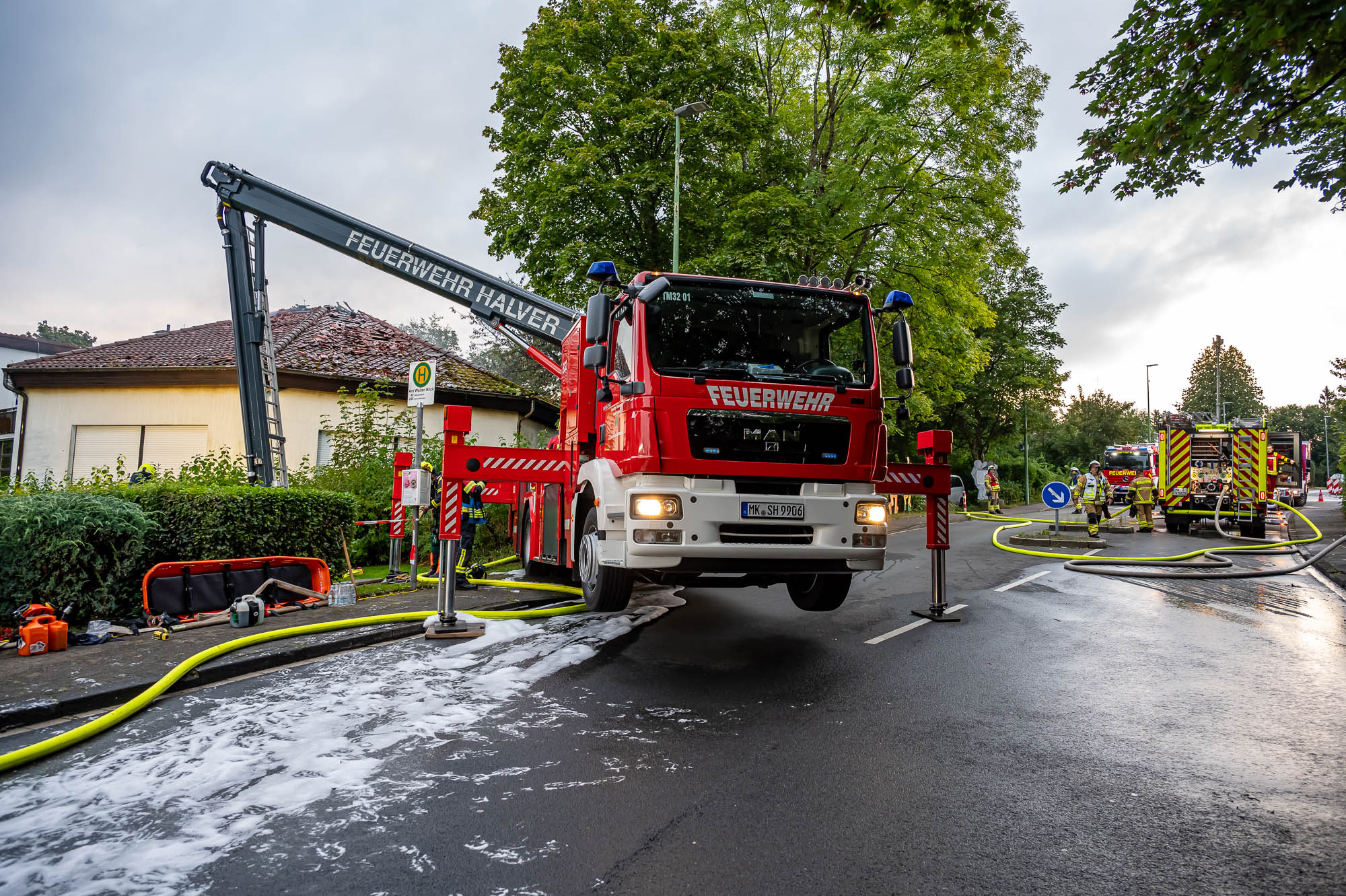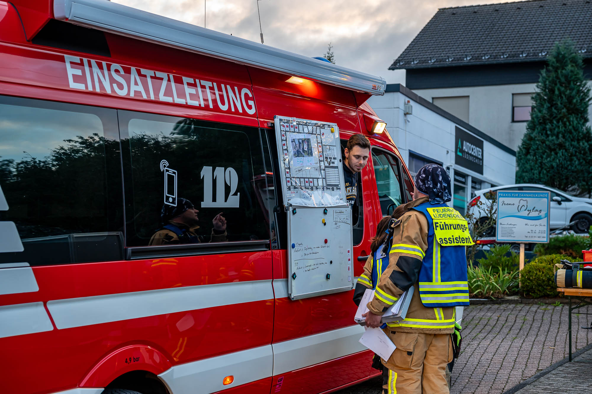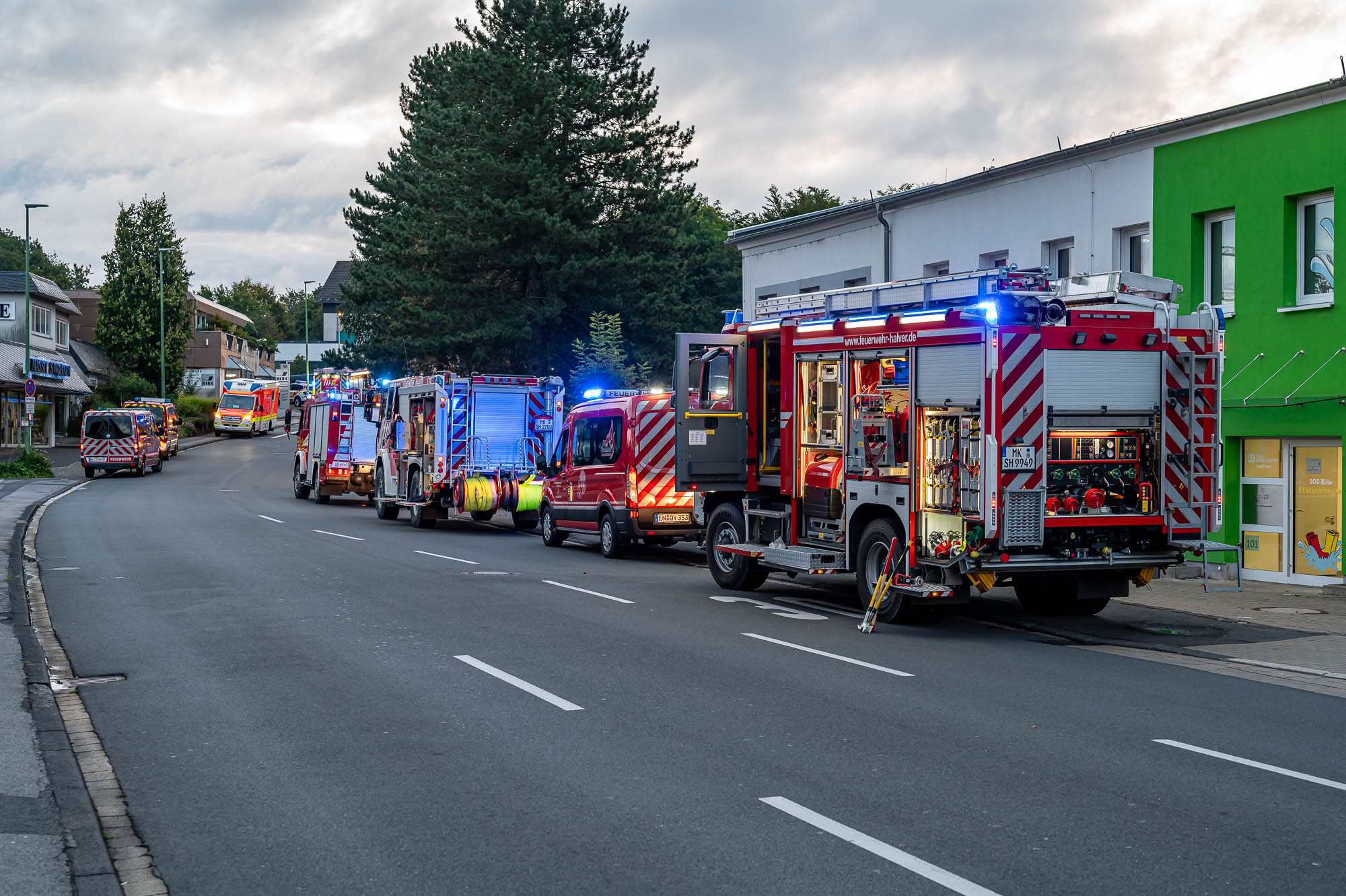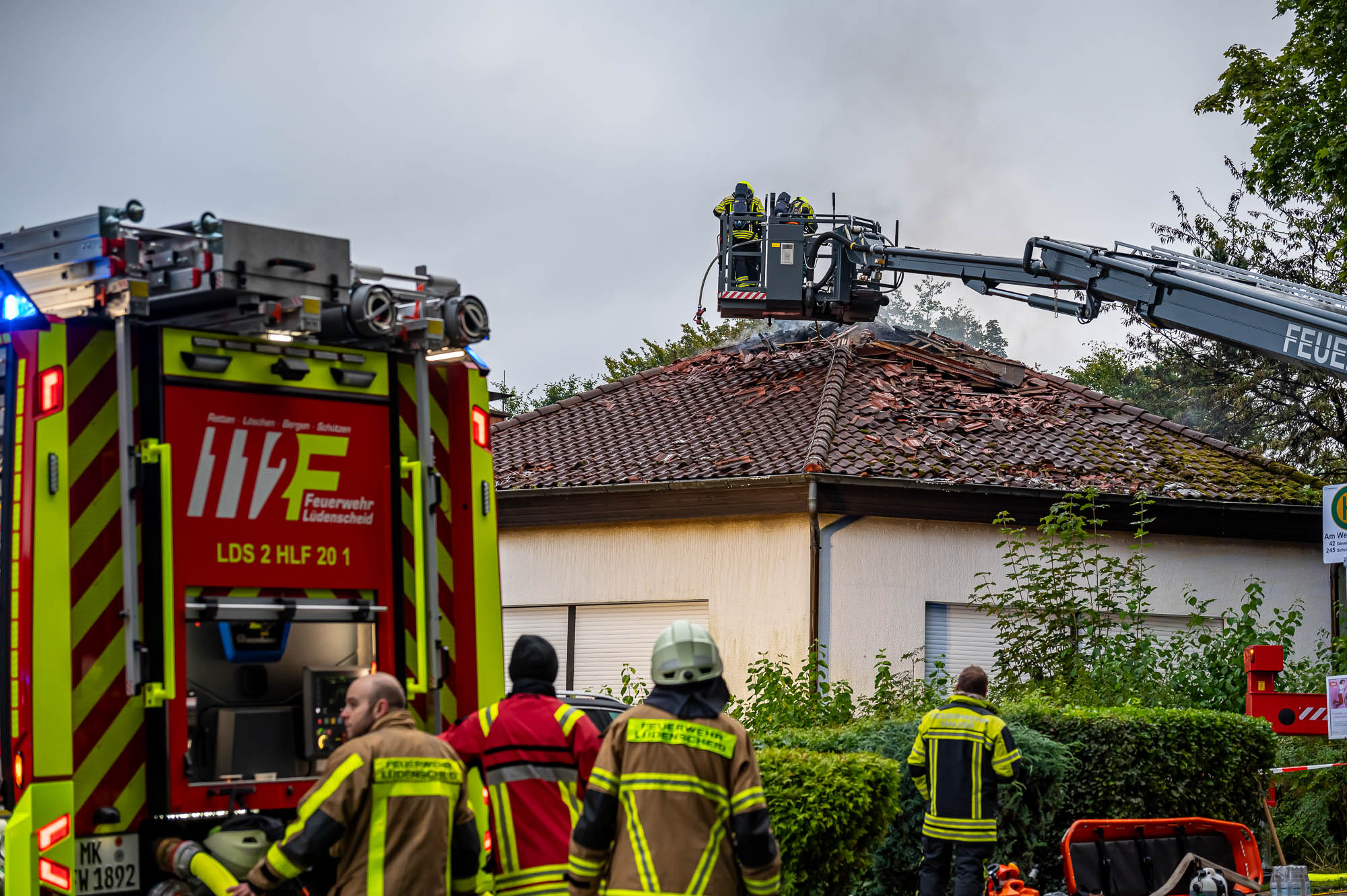 Für die Lüdenscheider Wehr war in der Nacht Stadtalarm ausgerufen worden. Aus dem gemeldeten “Brand am Gebäude” wurde schnell ein “Entwickelter Brand”, nach und nach wurden immer mehr Kräfte nachalarmiert. Die Löschzüge Brügge und Brüninghausen sorgten für den Grundschutz. Zunächst sollten sich die dortigen Kameraden in ihren Gerätehäusern bereithalten, später besetzten sie die Hauptamtliche Wache am Dukatenweg. Direkt an die Einsatzstelle alarmiert wurden allerdings Wehrleute aus Halver, die mit ihrem Teleskopmast die vorhandene Drehleiter gut ergänzten. Um die Versorgung der vielen Einsatzkräfte kümmerten sich Ehrenamtliche vom Deutschen Roten Kreuz.