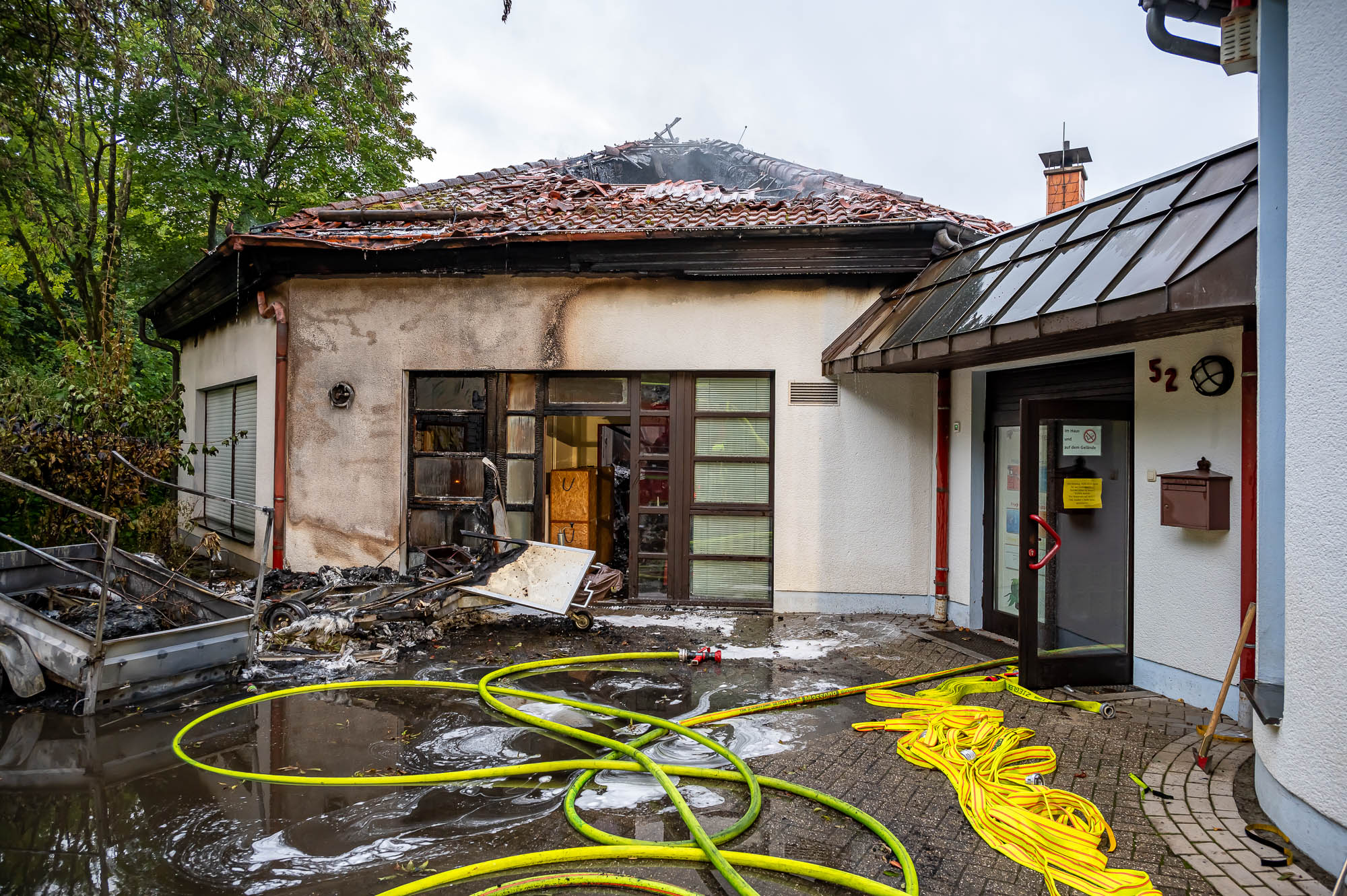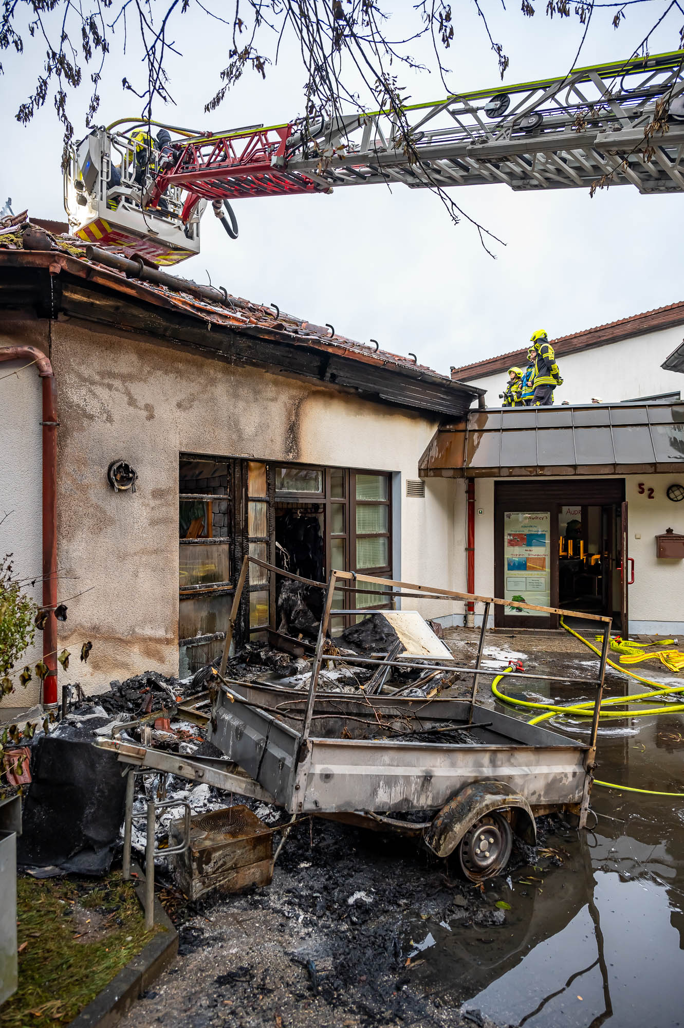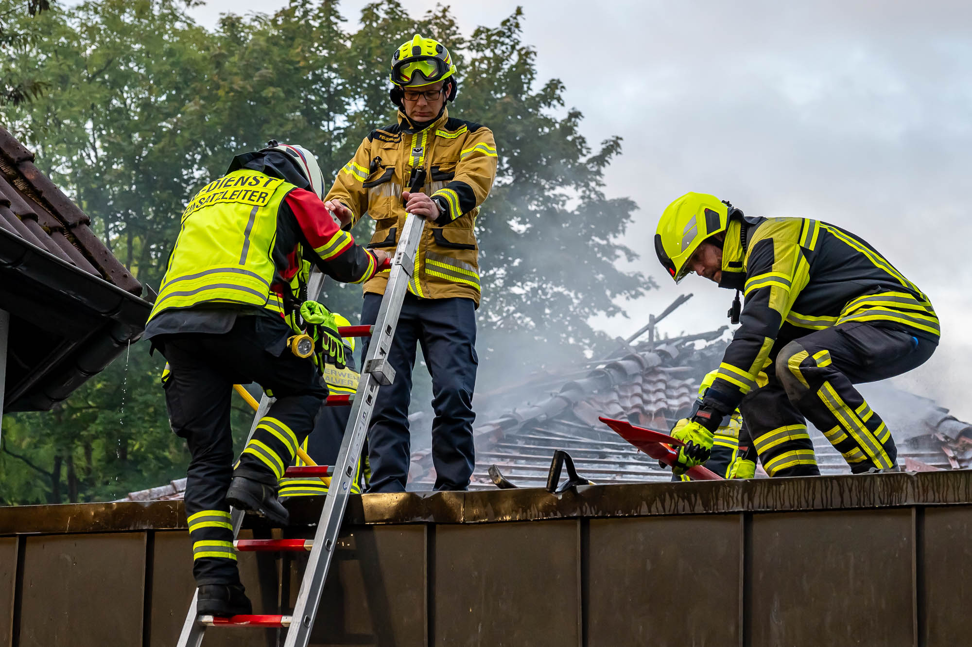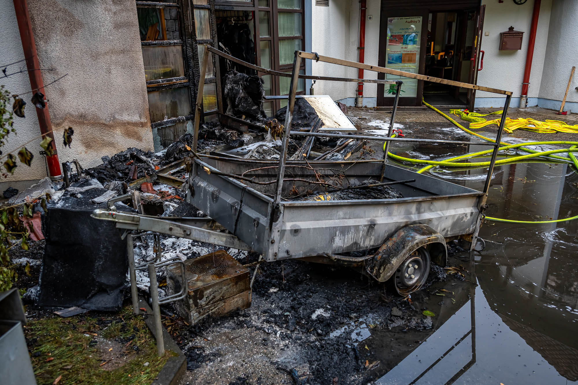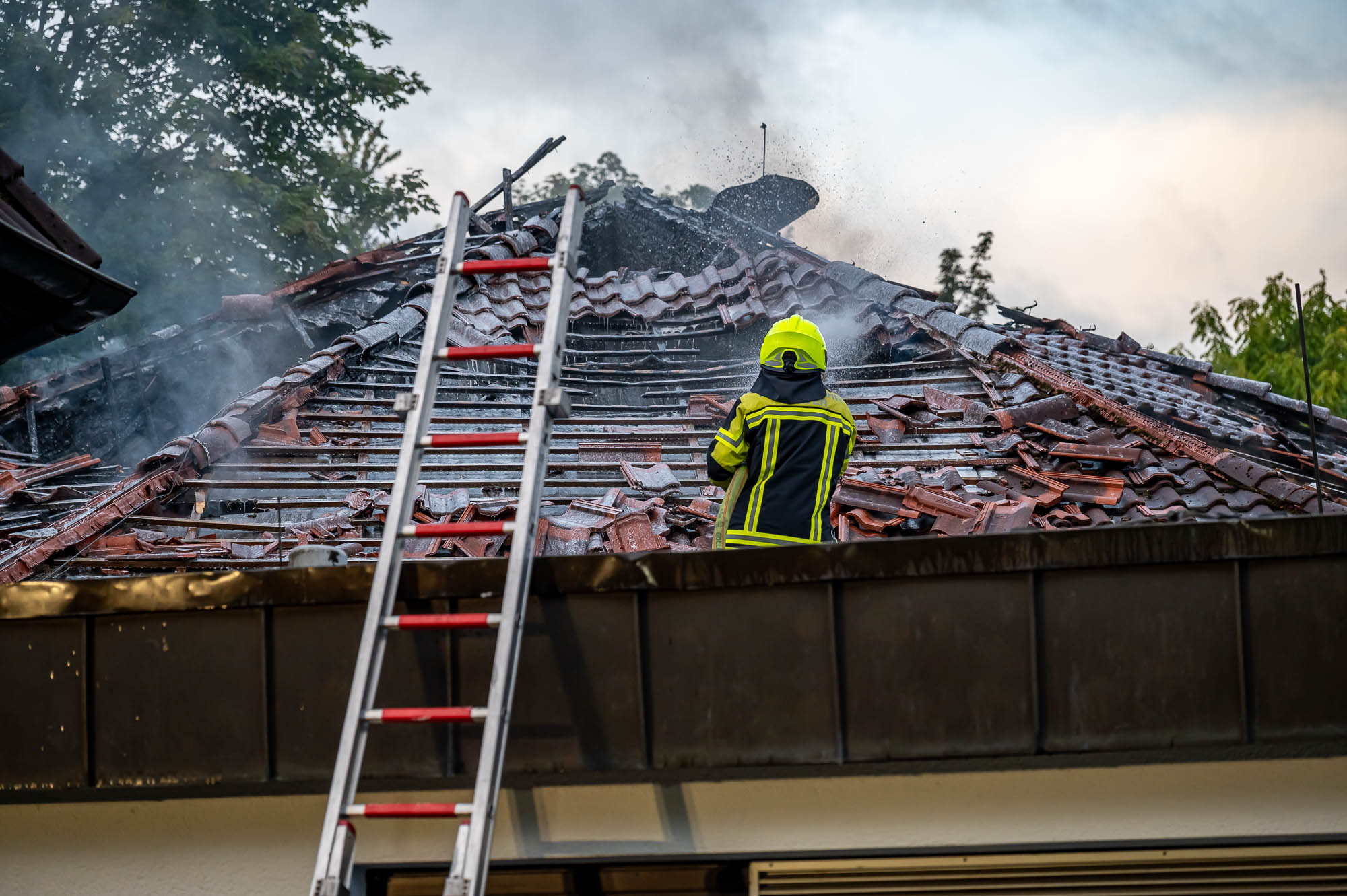 Die beiden Anhänger waren vor dem Eingangsbereich des Anwesens, nahe am Gebäude abgestellt. Als wäre es nicht schon schlimm genug, dass mitten in der Nacht plötzlich Anhänger in Flammen aufgehen, kam es noch heftiger: “Die Flammen sind in den Dachstuhl übergeschlagen”, so der leitende Feuerwehrmann. Dort trafen sie auf eine verhängnisvolle Dachkonstruktion mit Bitumen und OSB-Platten. Dies erschwerte den insgesamt 78 Feuerwehrleuten die Löscharbeiten immens. Immerhin konnte der übrige Teil des Gebäudekomplexes gut geschützt werden: “Wir konnten im Innenangriff eine Riegelstellung aufbauen, so dass das Brandgeschehen im Wesentlichen auf den Bereich beschränkt blieb, in dem die Offene Ganztagsschule untergebracht ist”, so Wojciechowski. Unter schwerem Atemschutz konnten Feuerwehrleute mit Wassersaugern überschüssiges Löschwasser aus dem Gebäude pumpen, so dass nicht mehr Schaden entstand, als unvermeidbar war. Im Laufe der Löscharbeiten sind Teile der Unterkonstruktion des brennenden Daches eingestürzt, aber das wäre wohl eh nicht mehr zu retten gewesen. Der Aufbau des Daches erschwerte die Löscharbeiten allerdings massiv.