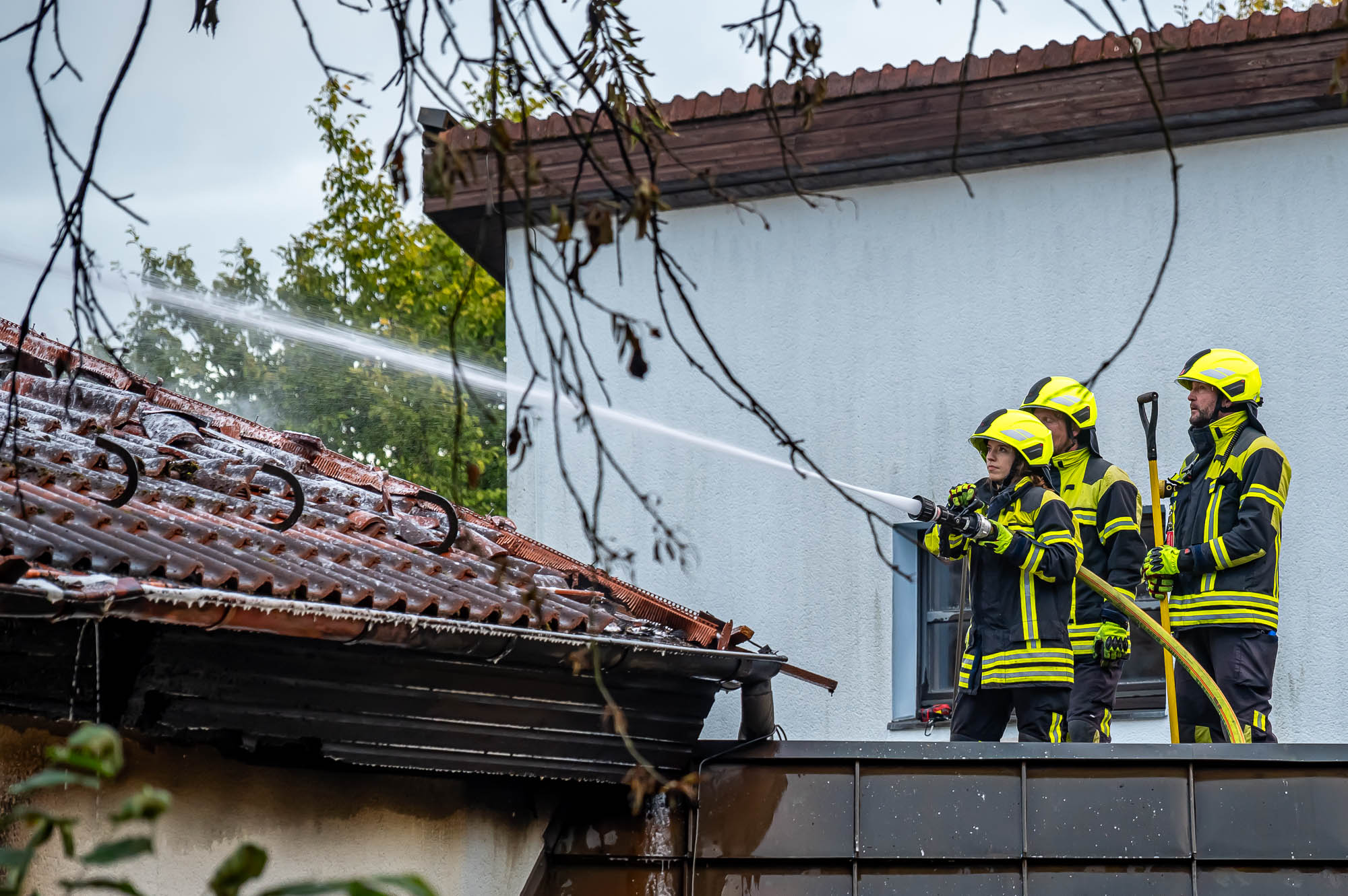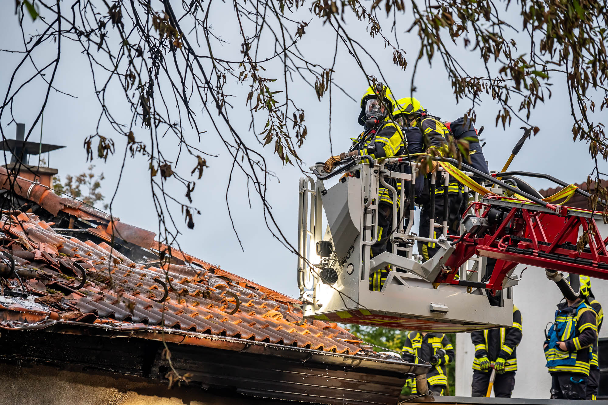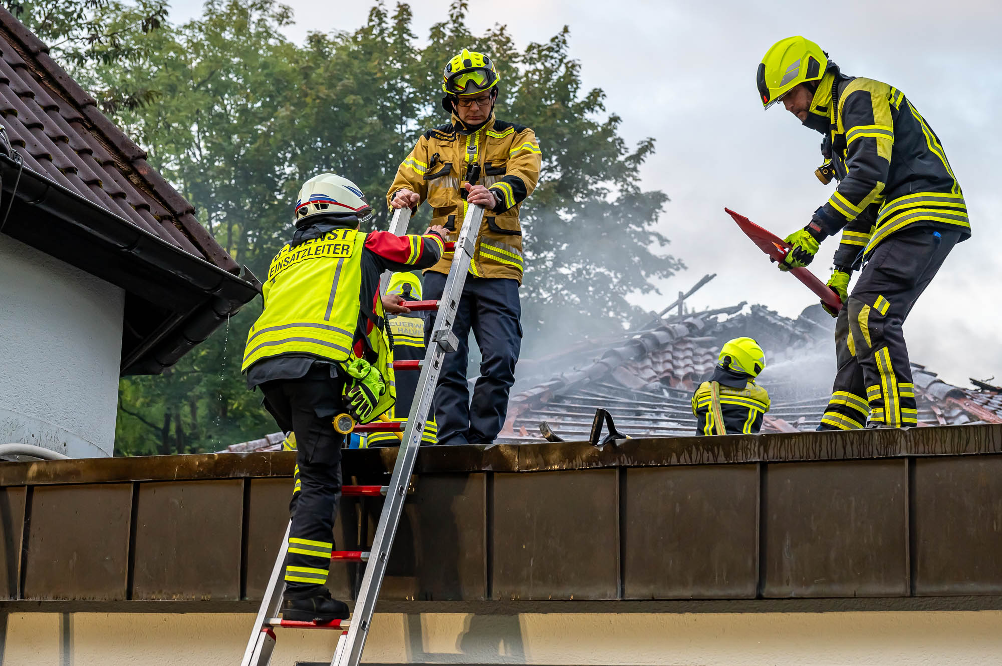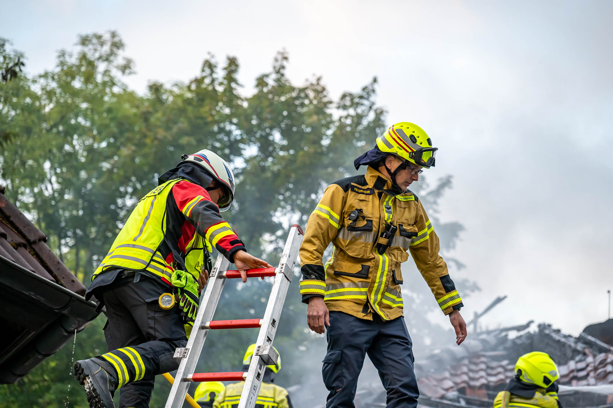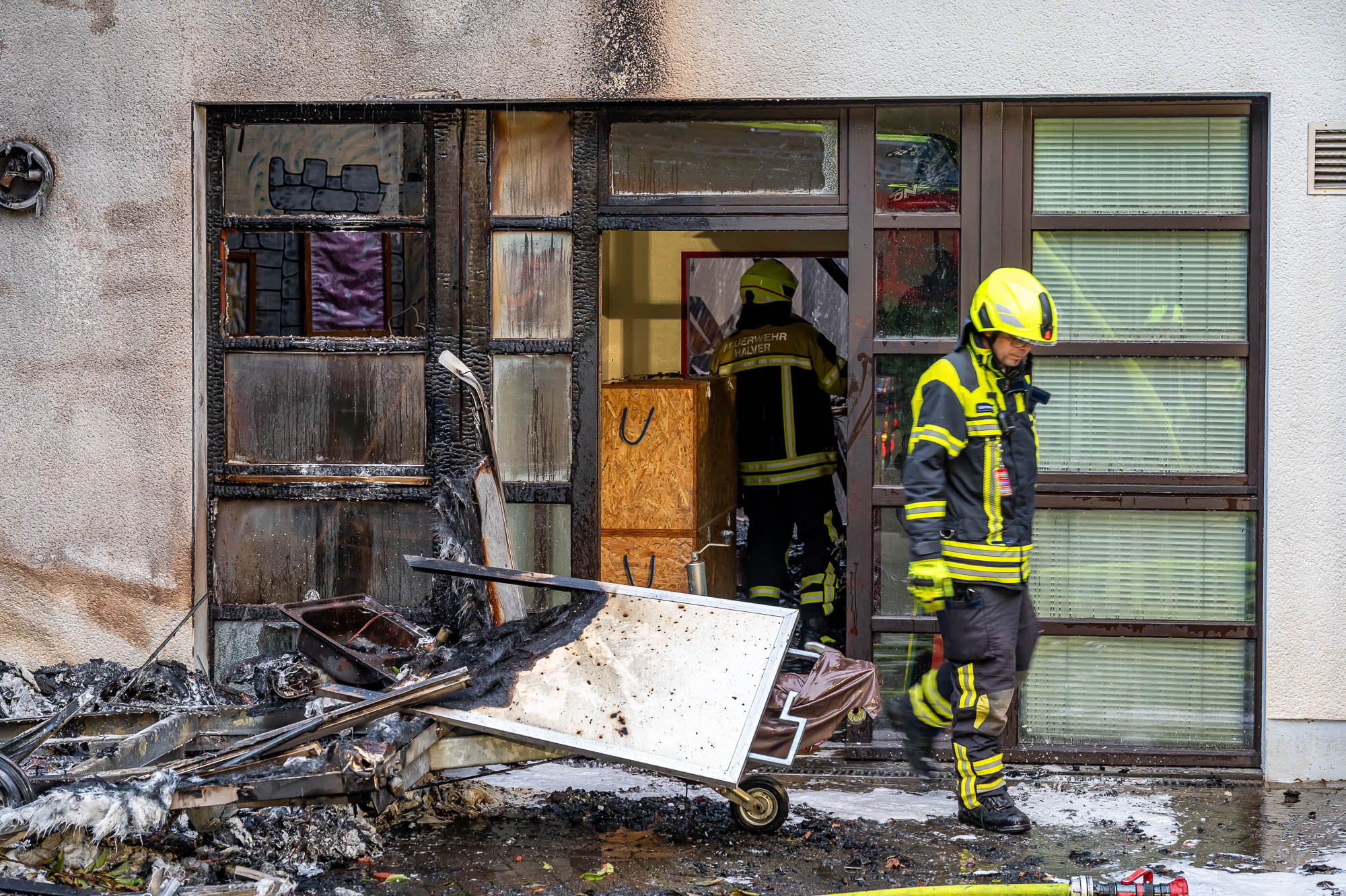 Die beiden Anhänger waren vor dem Eingangsbereich des Anwesens, nahe am Gebäude abgestellt. Als wäre es nicht schon schlimm genug, dass mitten in der Nacht plötzlich Anhänger in Flammen aufgehen, kam es noch heftiger: “Die Flammen sind in den Dachstuhl übergeschlagen”, so der leitende Feuerwehrmann. Dort trafen sie auf eine verhängnisvolle Dachkonstruktion mit Bitumen und OSB-Platten. Dies erschwerte den insgesamt 78 Feuerwehrleuten die Löscharbeiten immens. Immerhin konnte der übrige Teil des Gebäudekomplexes gut geschützt werden: “Wir konnten im Innenangriff eine Riegelstellung aufbauen, so dass das Brandgeschehen im Wesentlichen auf den Bereich beschränkt blieb, in dem die Offene Ganztagsschule untergebracht ist”, so Wojciechowski. Unter schwerem Atemschutz konnten Feuerwehrleute mit Wassersaugern überschüssiges Löschwasser aus dem Gebäude pumpen, so dass nicht mehr Schaden entstand, als unvermeidbar war. Im Laufe der Löscharbeiten sind Teile der Unterkonstruktion des brennenden Daches eingestürzt, aber das wäre wohl eh nicht mehr zu retten gewesen. Der Aufbau des Daches erschwerte die Löscharbeiten allerdings massiv.