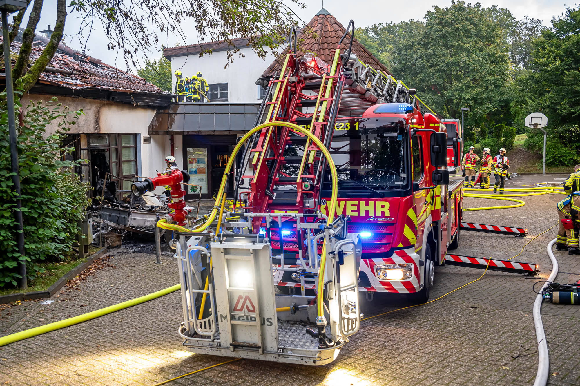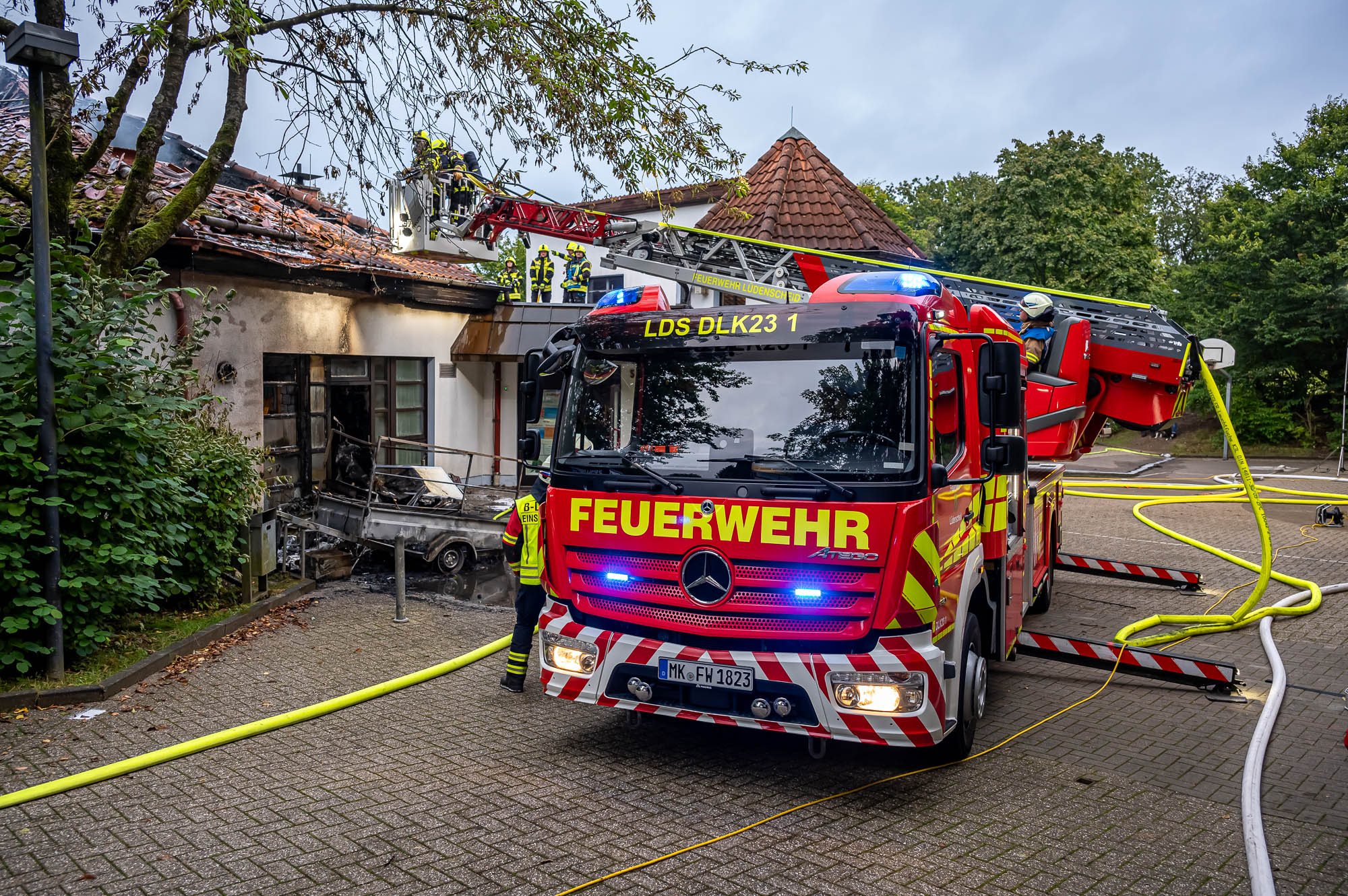 LÜDENSCHEID (mk) Noch bis in den späten Donnerstagvormittag, 12. September, wird ein Großaufgebot der Lüdenscheider Feuerwehr mit Unterstützung von Halveraner Kameraden mit Nachlöscharbeiten in der Straße “Im Olpendahl” beschäftigt sein. Hier ist gegen 1.15 Uhr in der Nacht ein Feuer ausgebrochen — in der CVJM-Freizeitstätte “Audrey´s”: “Als wir hier eintrafen, standen zwei Anhänger im Vollbrand”, beschreibt Michael Wojciechowski (“C‑Dienst” der Lüdenscheider Feuerwehr), die Situation, die die ersten Kräfte der Hauptamtlichen Wache vorfanden.