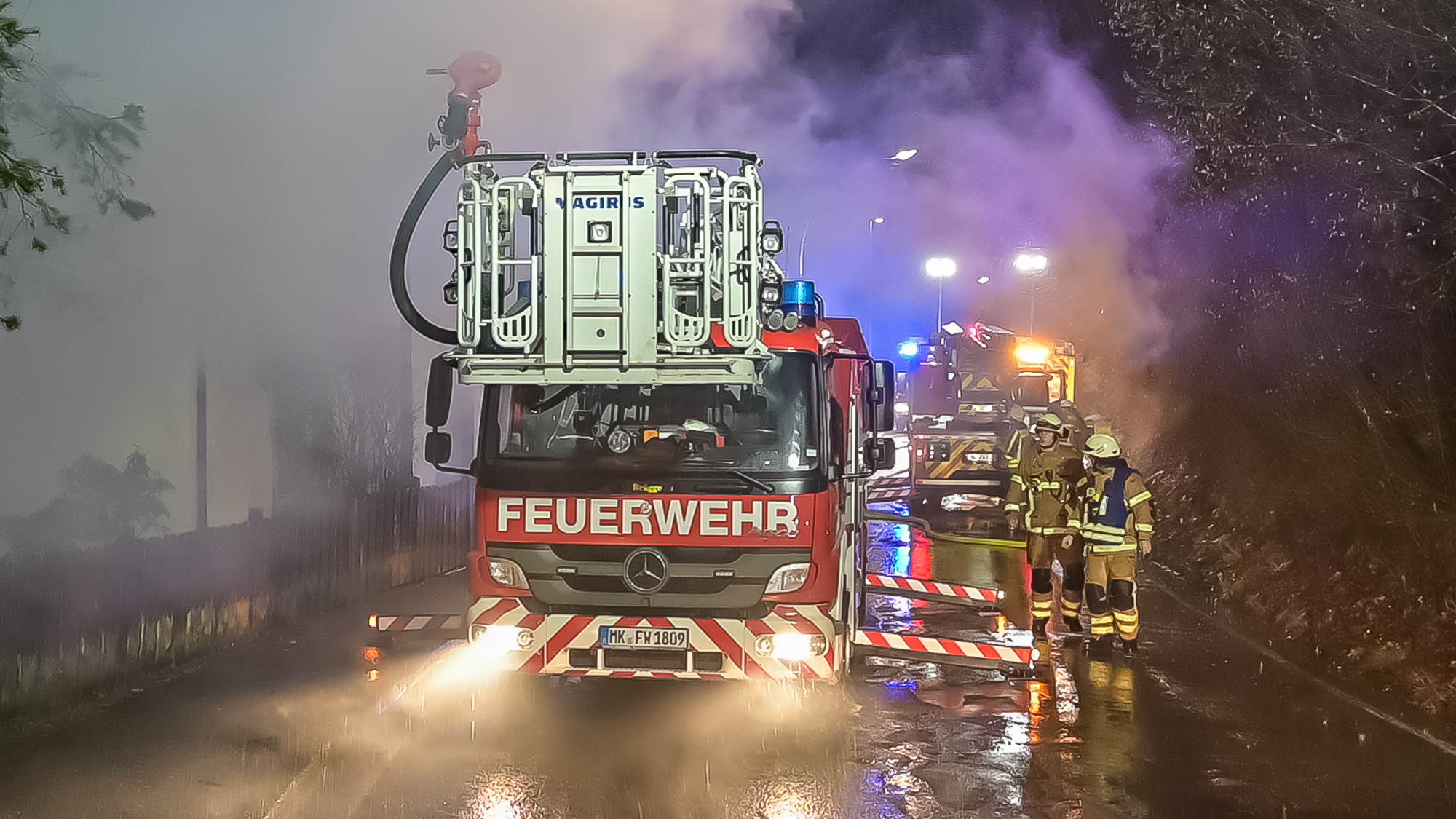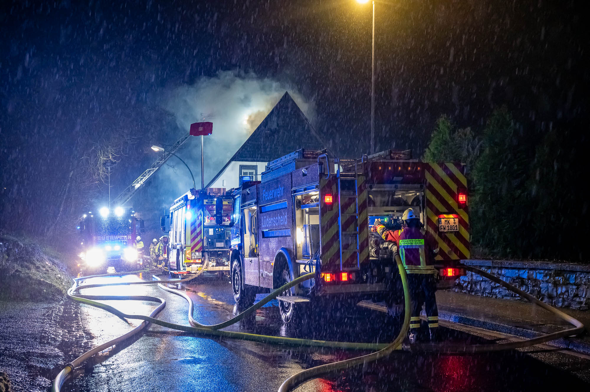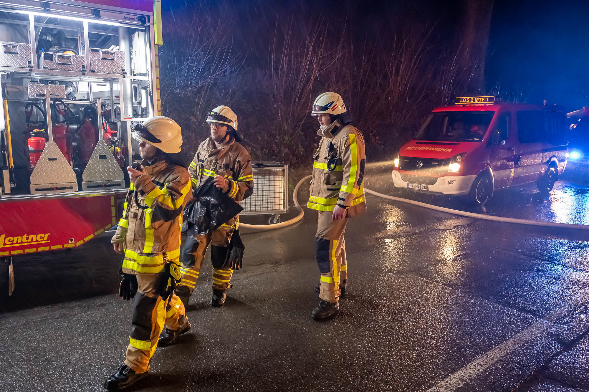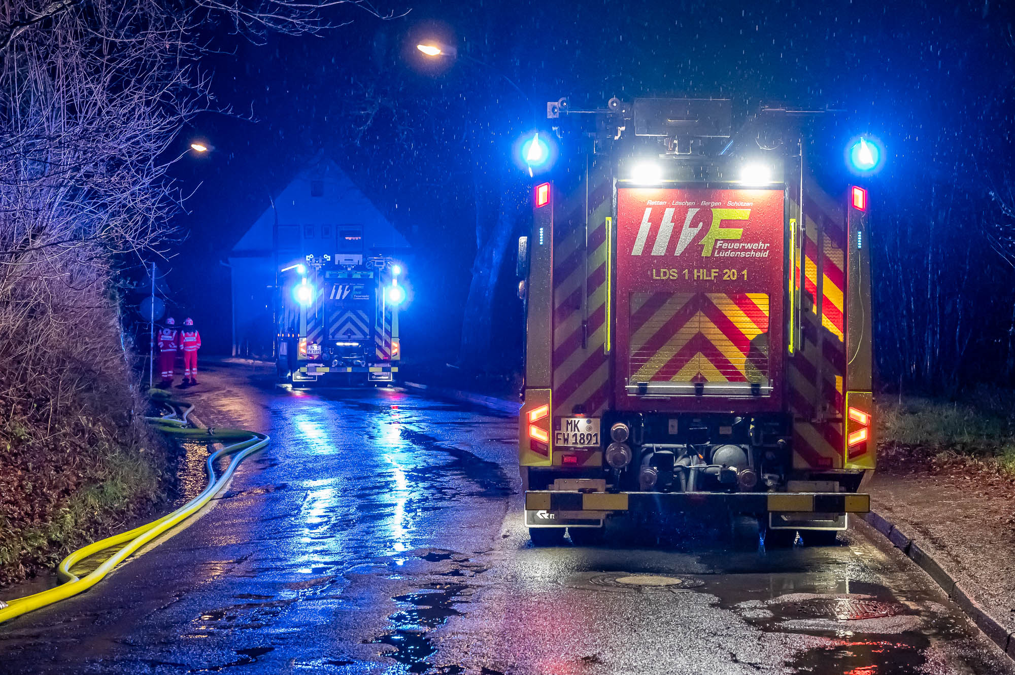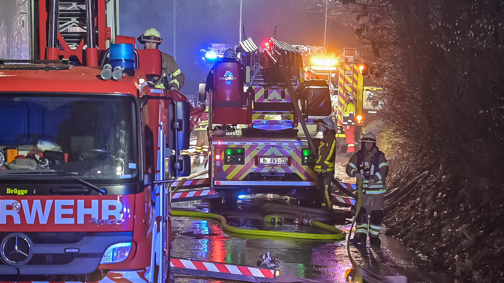 Anfangs seien sogar noch Innenangriffe möglich gewesen, erklärt Einsatzleiter Tim Hens, der insgesamt 80 Feuerwehrmänner- und Frauen durch den Einsatz leitet. Dieser wird sich voraussichtlich noch bis etwa zum Mittag hinziehen, und die wichtige Verbindungsstraße in Brüninghausen bleibt bis dahin voll gesperrt. Um den Grundschutz in Lüdenscheid kümmert sich währenddessen die Freiwillige Feuerwehr Altena, die mit mehreren Einsatzkräften und Fahrzeugen die Feuer- und Rettungswache am Dukatenweg besetzt. Für die Lüdenscheider Wehr wurde Stadtalarm ausgerufen.