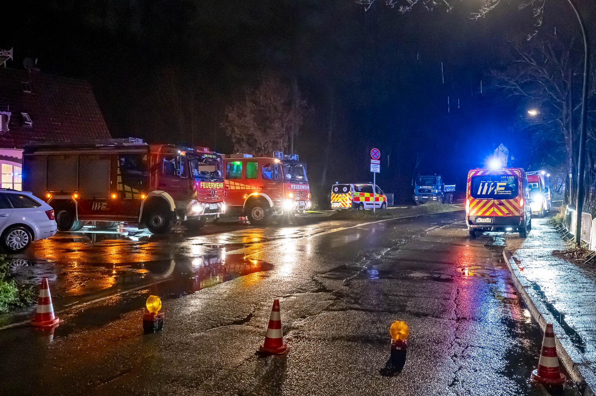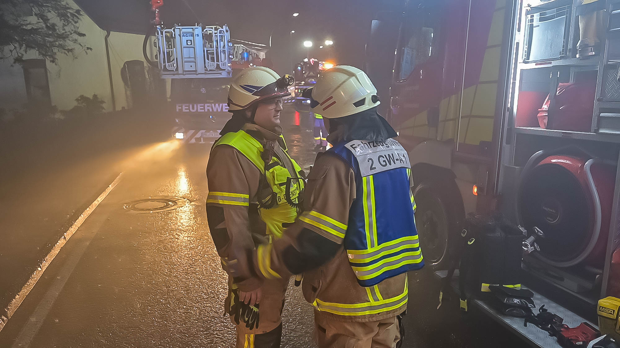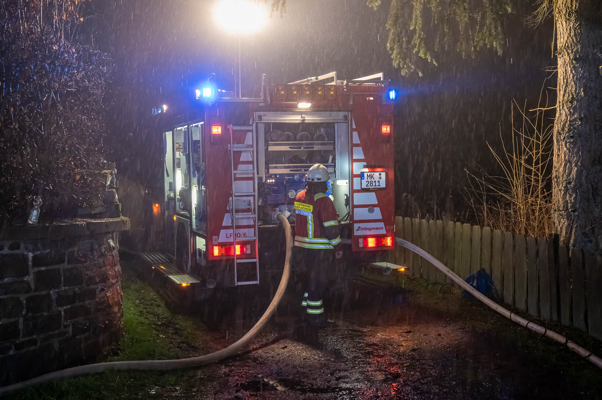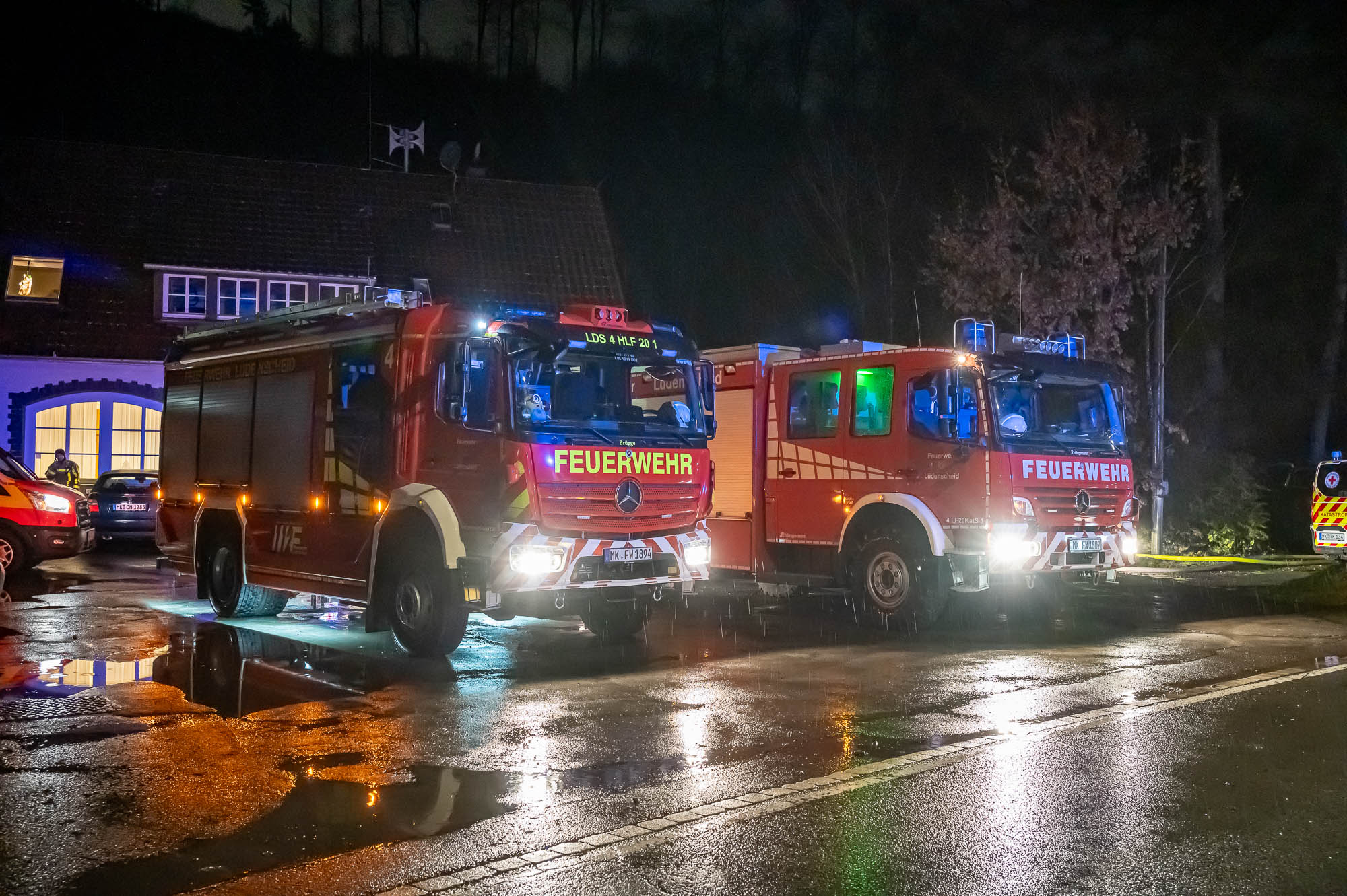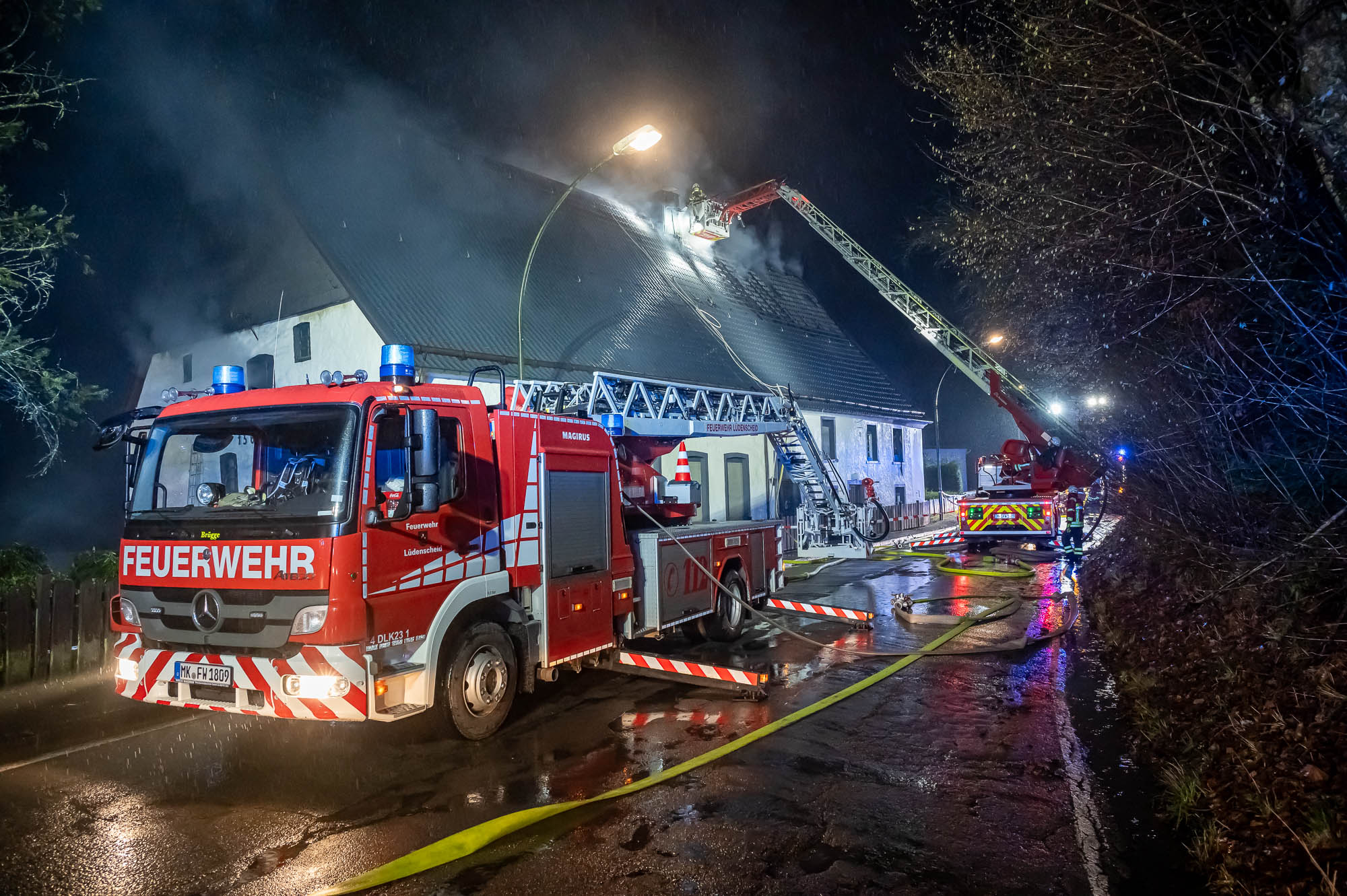Anfangs seien sogar noch Innenangriffe möglich gewesen, erklärt Einsatzleiter Tim Hens, der insgesamt 80 Feuerwehrmänner- und Frauen durch den Einsatz leitet. Dieser wird sich voraussichtlich noch bis etwa zum Mittag hinziehen, und die wichtige Verbindungsstraße in Brüninghausen bleibt bis dahin voll gesperrt. Um den Grundschutz in Lüdenscheid kümmert sich währenddessen die Freiwillige Feuerwehr Altena, die mit mehreren Einsatzkräften und Fahrzeugen die Feuer- und Rettungswache am Dukatenweg besetzt. Für die Lüdenscheider Wehr wurde Stadtalarm ausgerufen.