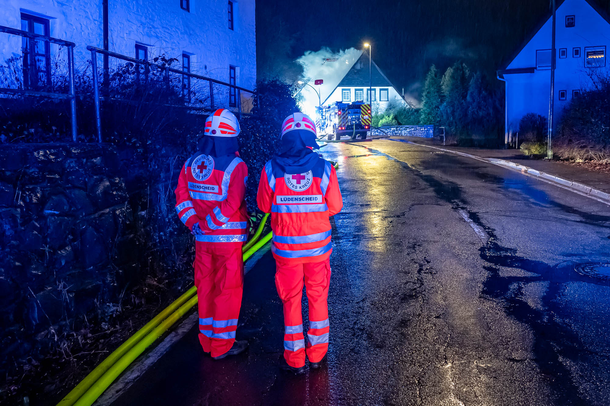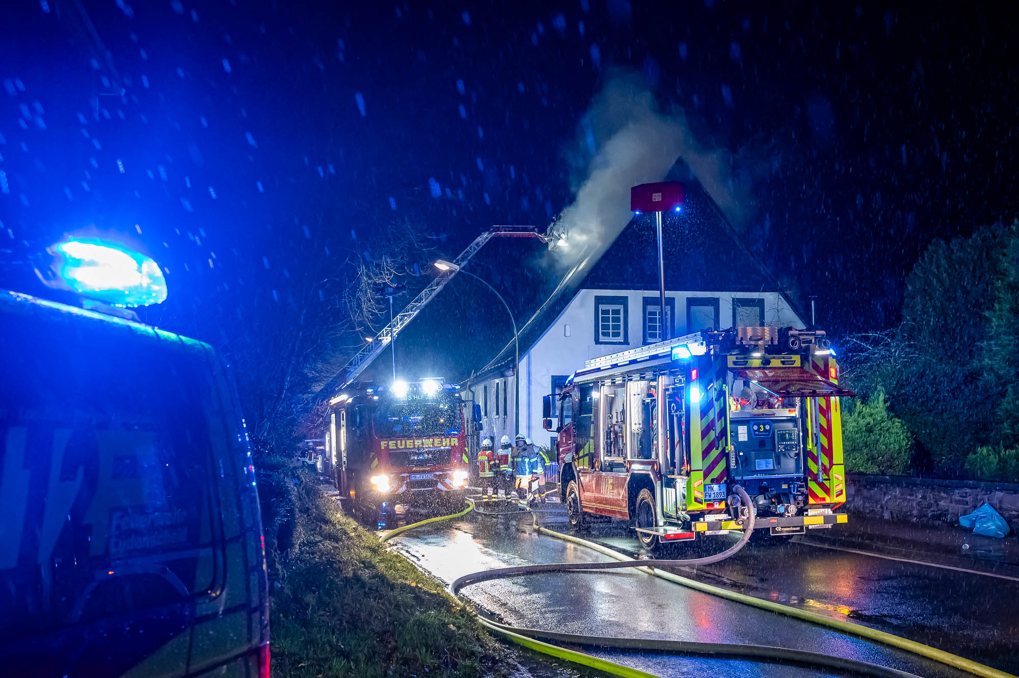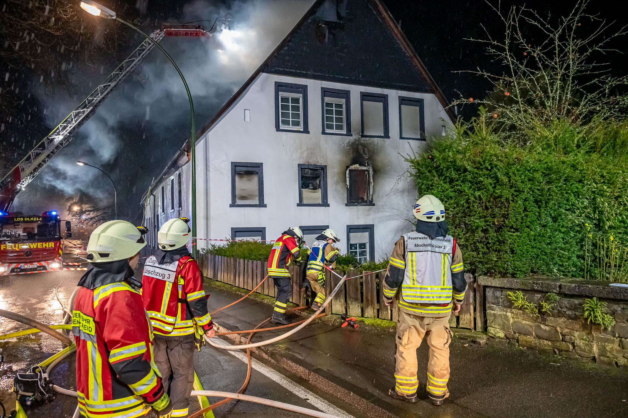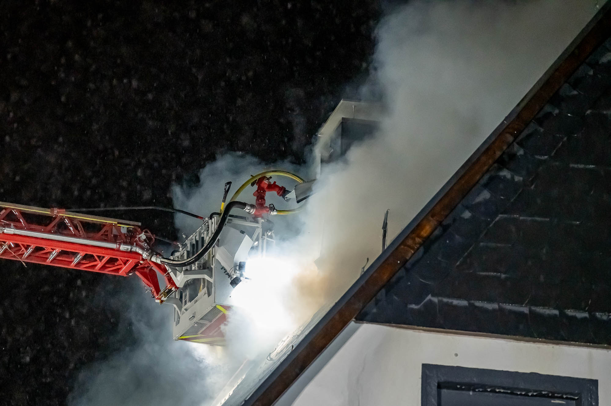 “Wir haben jetzt das Feuer in Gewalt”, vermeldet Hens gegen 7.00 Uhr. Das alte Bauernhaus gilt mittlerweile als einsturzgefährdend, alle Bewohner verlieren kurz vor Weihnachten ihr Heim. Ausgebrochen war der Brand nach ersten Erkenntnissen im ersten Obergeschoss, und breitete sich vor allem in Richtung des Dachbodens aus. Zerborstene Fenster zeugen von der Gewalt der Flammen. Auch Stunden nach dem Ausbruch lodert das Feuer in den Zimmern immer noch auch. Problematisch ist für die Feuerwehr, die zwei Drehleitern in Stellung gebracht hat, das Dach. Das ist mit Blech verkleidet: Die Feuerwehrleute müssen die Dachhaut regelrecht aufschneiden, um an die Brandnester zu kommen. Dichter Qualm dringt aus jeder Ritze, die Einsatzstelle ist von ungewöhnlich starken Rauchschwaden umgeben, viele Einsatzkräfte, die nicht ohnehin unter schwerem Atemschutz arbeiten, tragen FFP‑2 Masken.