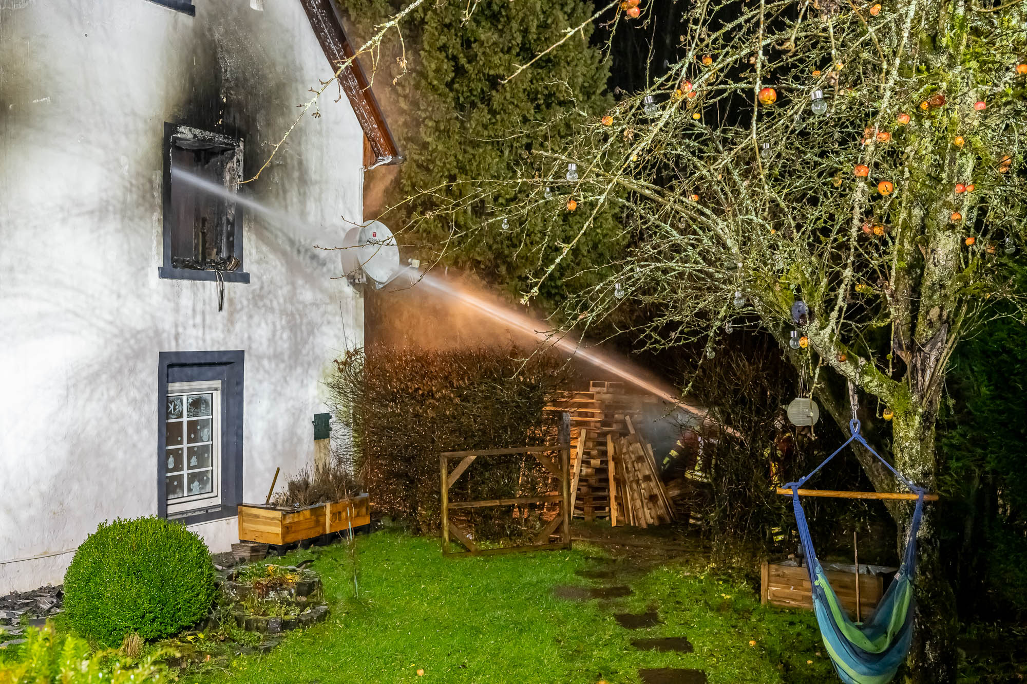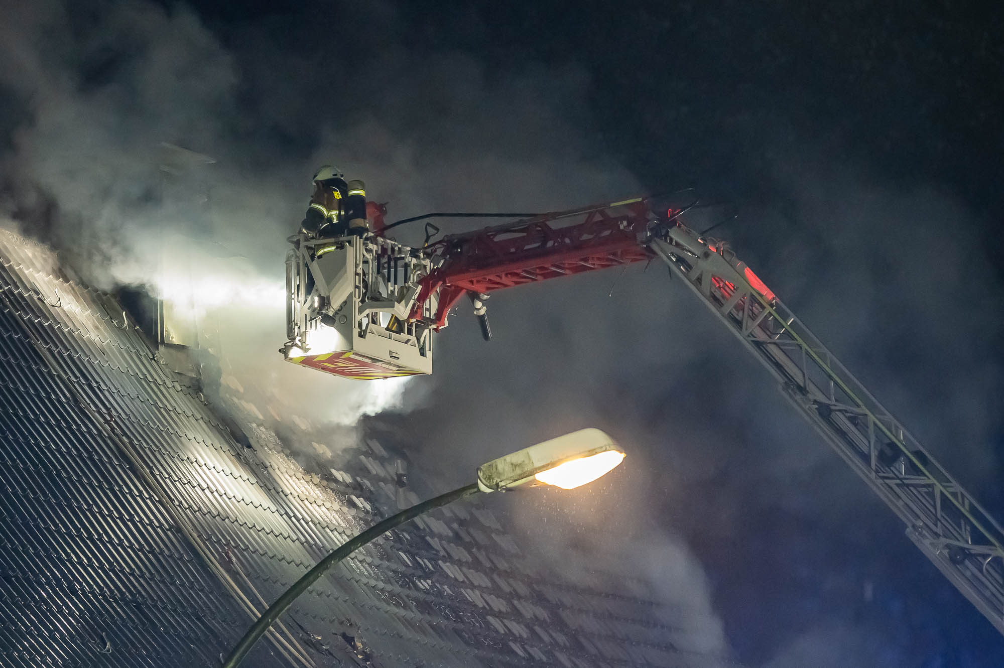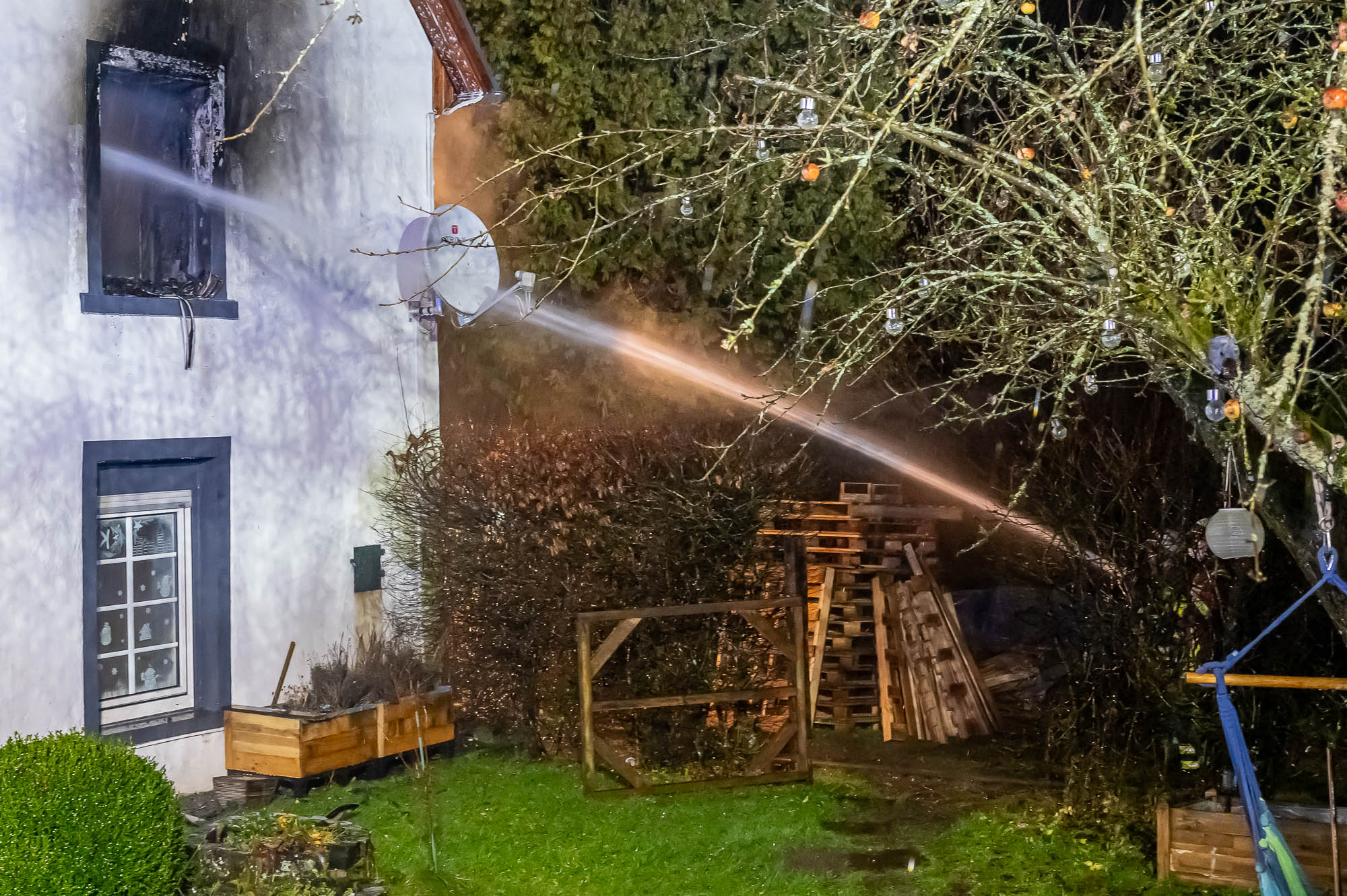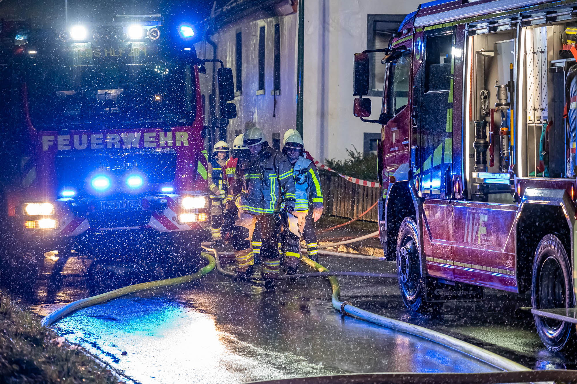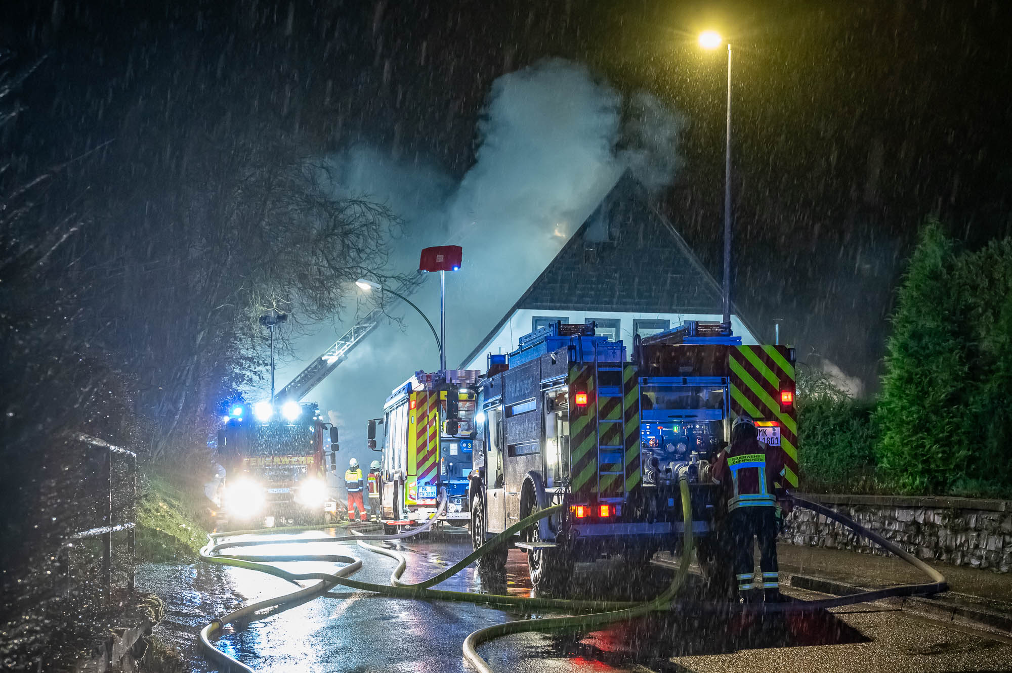 “Wir haben jetzt das Feuer in Gewalt”, vermeldet Hens gegen 7.00 Uhr. Das alte Bauernhaus gilt mittlerweile als einsturzgefährdend, alle Bewohner verlieren kurz vor Weihnachten ihr Heim. Ausgebrochen war der Brand nach ersten Erkenntnissen im ersten Obergeschoss, und breitete sich vor allem in Richtung des Dachbodens aus. Zerborstene Fenster zeugen von der Gewalt der Flammen. Auch Stunden nach dem Ausbruch lodert das Feuer in den Zimmern immer noch auch. Problematisch ist für die Feuerwehr, die zwei Drehleitern in Stellung gebracht hat, das Dach. Das ist mit Blech verkleidet: Die Feuerwehrleute müssen die Dachhaut regelrecht aufschneiden, um an die Brandnester zu kommen. Dichter Qualm dringt aus jeder Ritze, die Einsatzstelle ist von ungewöhnlich starken Rauchschwaden umgeben, viele Einsatzkräfte, die nicht ohnehin unter schwerem Atemschutz arbeiten, tragen FFP‑2 Masken.