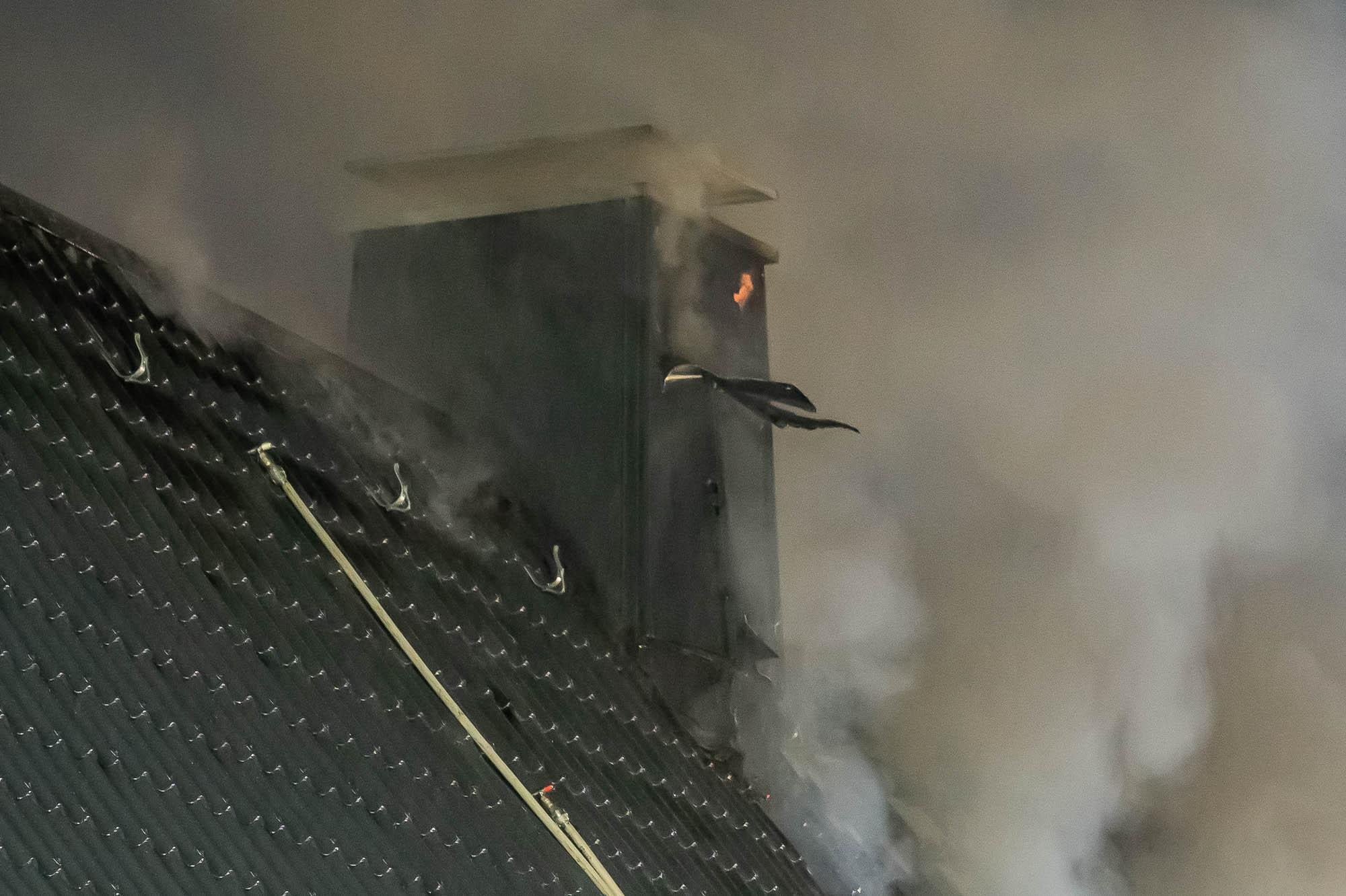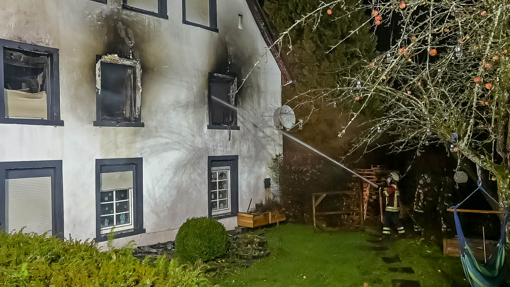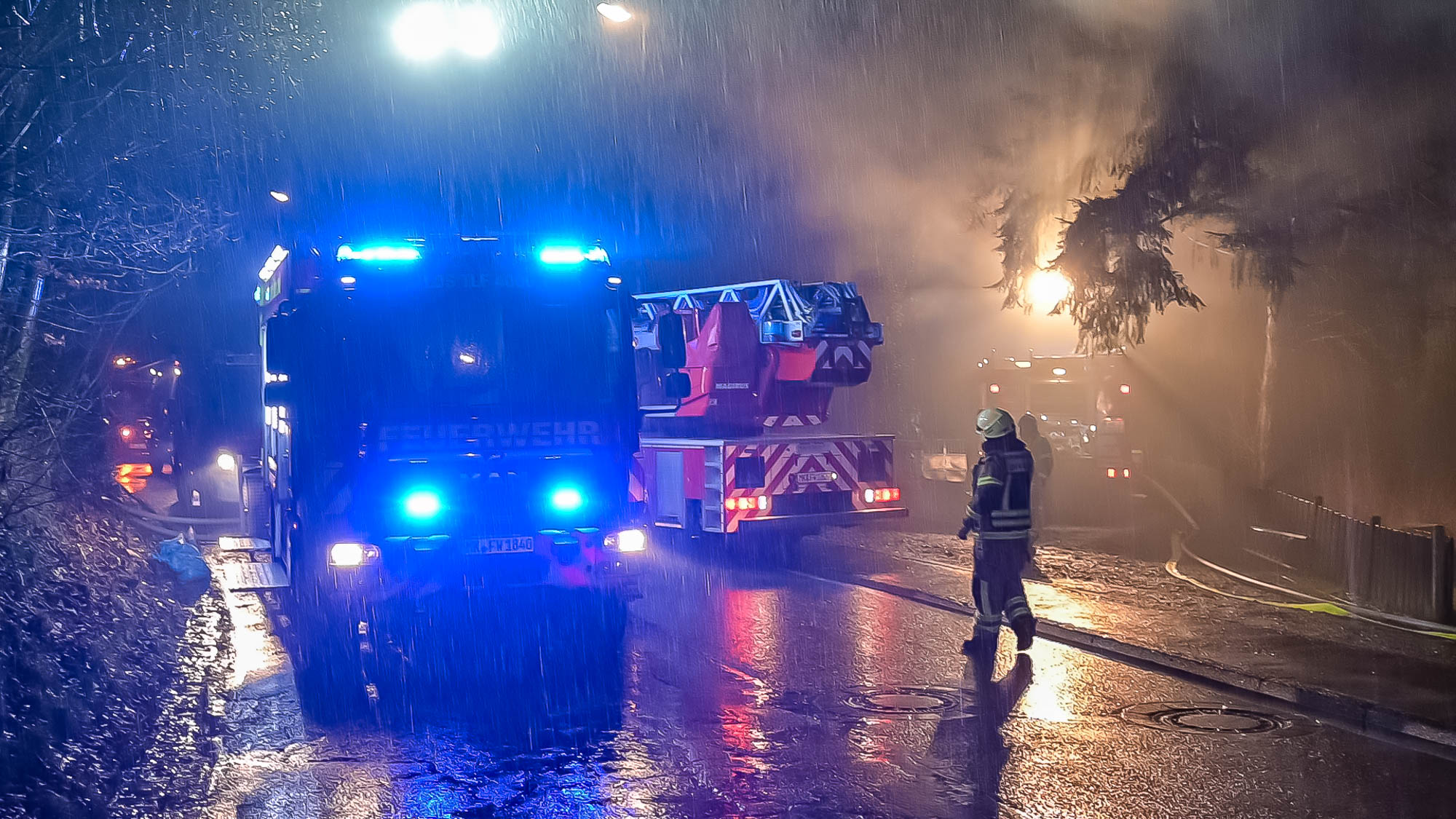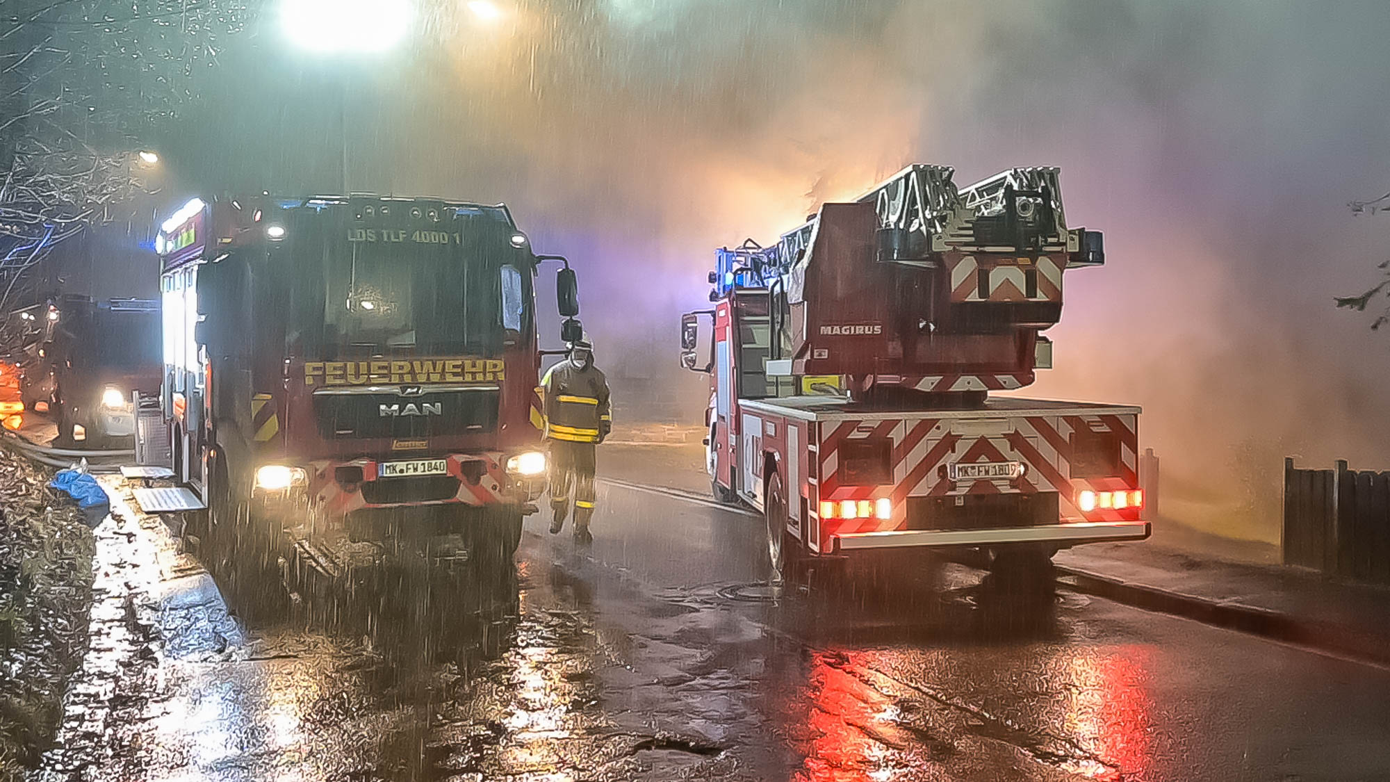 “Wir haben jetzt das Feuer in Gewalt”, vermeldet Hens gegen 7.00 Uhr. Das alte Bauernhaus gilt mittlerweile als einsturzgefährdend, alle Bewohner verlieren kurz vor Weihnachten ihr Heim. Ausgebrochen war der Brand nach ersten Erkenntnissen im ersten Obergeschoss, und breitete sich vor allem in Richtung des Dachbodens aus. Zerborstene Fenster zeugen von der Gewalt der Flammen. Auch Stunden nach dem Ausbruch lodert das Feuer in den Zimmern immer noch auch. Problematisch ist für die Feuerwehr, die zwei Drehleitern in Stellung gebracht hat, das Dach. Das ist mit Blech verkleidet: Die Feuerwehrleute müssen die Dachhaut regelrecht aufschneiden, um an die Brandnester zu kommen. Dichter Qualm dringt aus jeder Ritze, die Einsatzstelle ist von ungewöhnlich starken Rauchschwaden umgeben, viele Einsatzkräfte, die nicht ohnehin unter schwerem Atemschutz arbeiten, tragen FFP‑2 Masken.