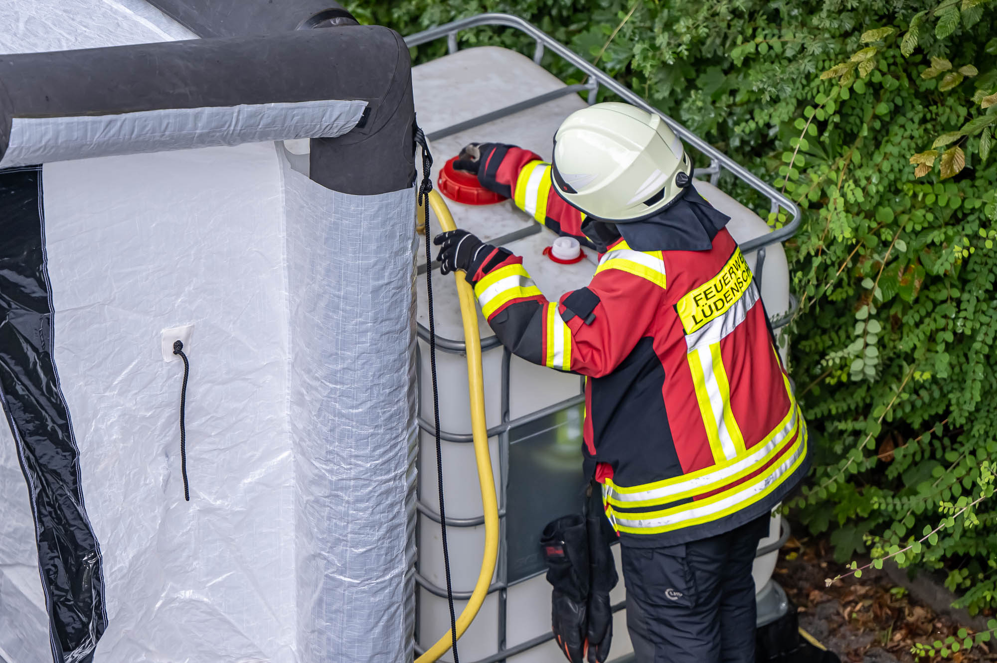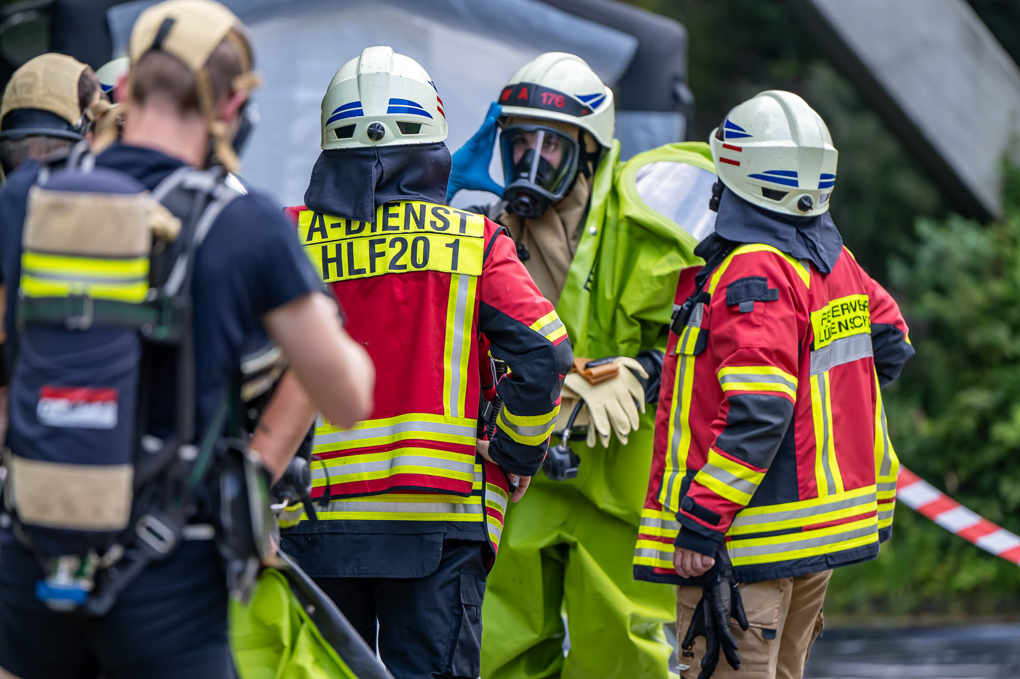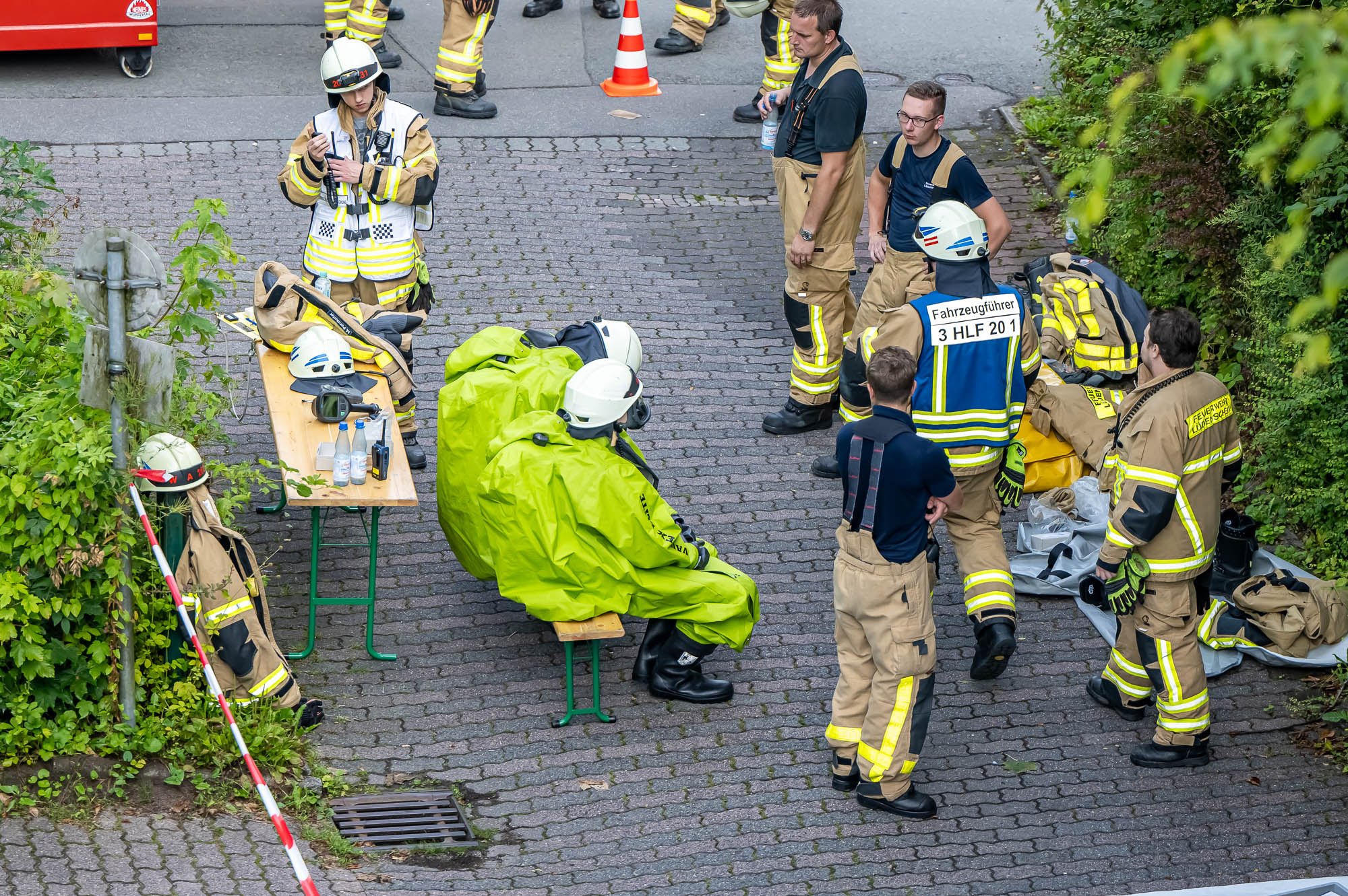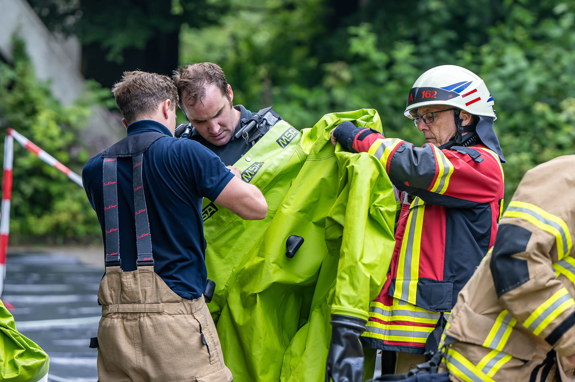 LÜDENSCHEID (mk) Ob Badegäste am Nattenberg am Sonntag, 21. Juli, noch ins kühle Nass steigen können, ist fraglich. Hier läuft seit dem frühen Morgen ein umfangreicher Feuerwehreinsatz: Der untere Parkplatz an der Talstraße ist voll mit Feuerwehrfahrzeugen, unterhalb der Fußgängerbrücke ist eine Dekontaminierungsstation aufgebaut. Der Auslöser für den ABC-Einsatz ist allerdings eine Lage, die immer mal wieder ein Freitzeitbädern eintritt: Es war kurz nach 7 Uhr der Austritt von Chlorgas festgestellt waren. Alarmiert worden war die Feuerwehr bereits gegen 6.30 Uhr von der Brandmeldeanlage. Das Gas, welches für die Wasserreinigung benötigt wird, war in den Technikräumen im Keller des Gebäudekomplexes nachgewiesen worden.