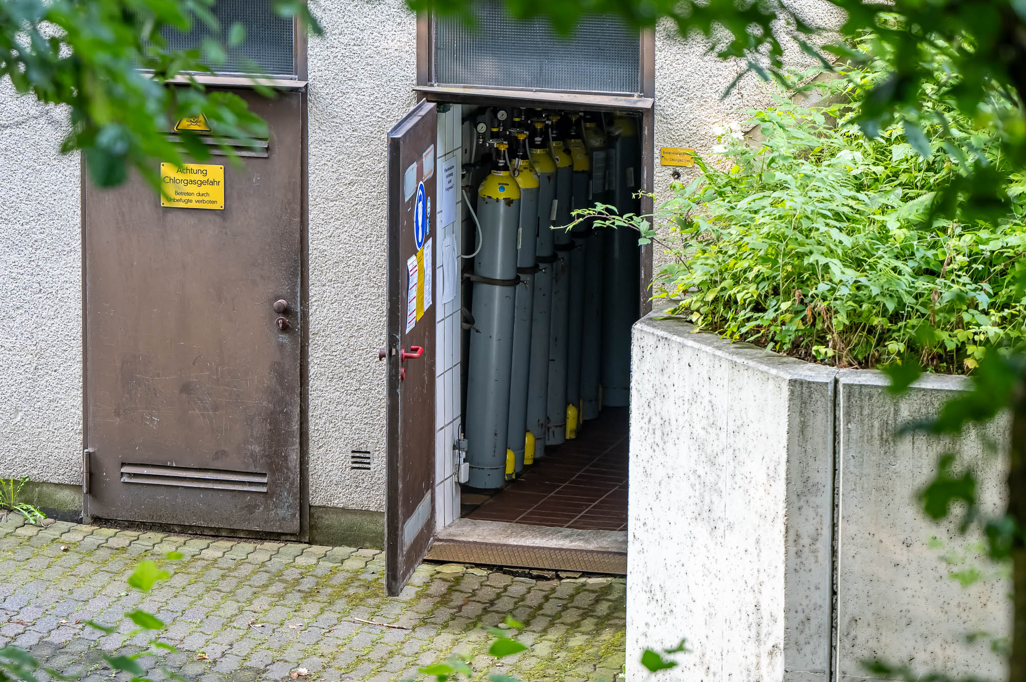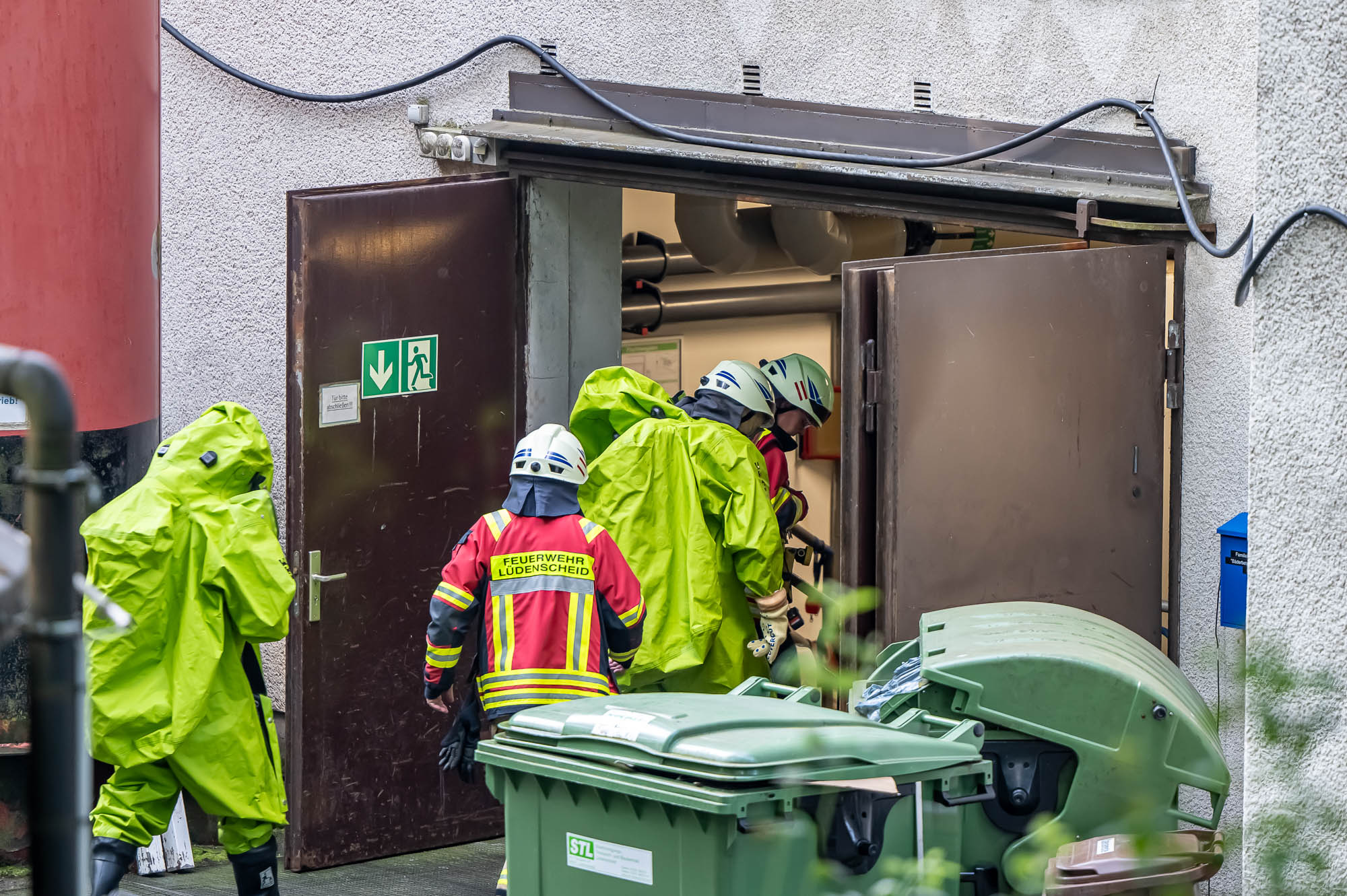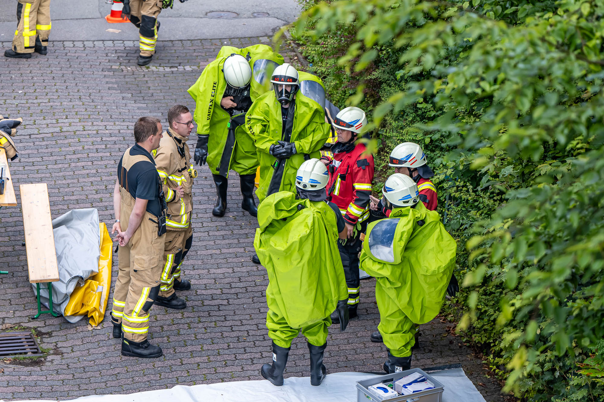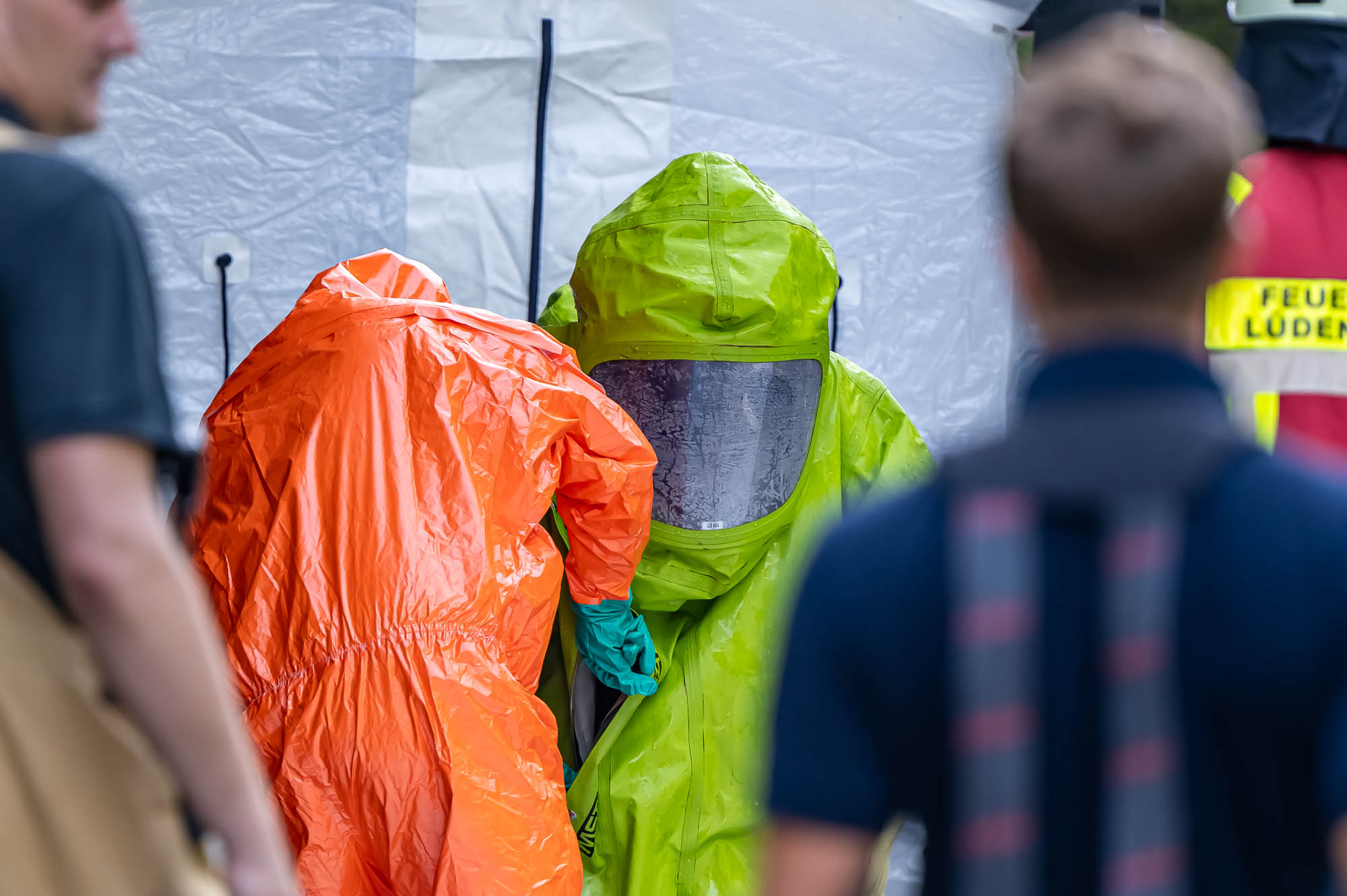 LÜDENSCHEID (mk) Ob Badegäste am Nattenberg am Sonntag, 21. Juli, noch ins kühle Nass steigen können, ist fraglich. Hier läuft seit dem frühen Morgen ein umfangreicher Feuerwehreinsatz: Der untere Parkplatz an der Talstraße ist voll mit Feuerwehrfahrzeugen, unterhalb der Fußgängerbrücke ist eine Dekontaminierungsstation aufgebaut. Der Auslöser für den ABC-Einsatz ist allerdings eine Lage, die immer mal wieder ein Freitzeitbädern eintritt: Es war kurz nach 7 Uhr der Austritt von Chlorgas festgestellt waren. Alarmiert worden war die Feuerwehr bereits gegen 6.30 Uhr von der Brandmeldeanlage. Das Gas, welches für die Wasserreinigung benötigt wird, war in den Technikräumen im Keller des Gebäudekomplexes nachgewiesen worden.