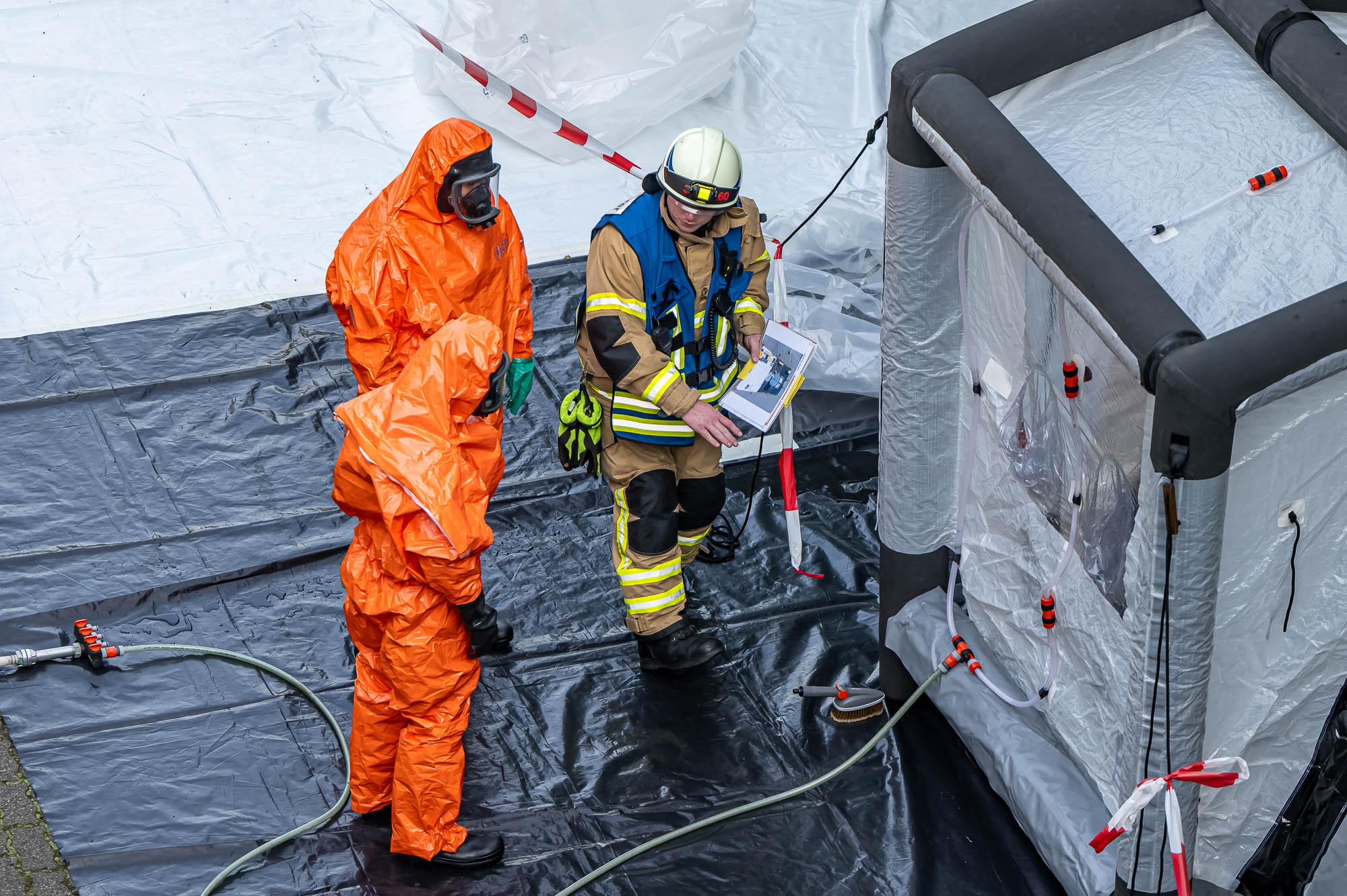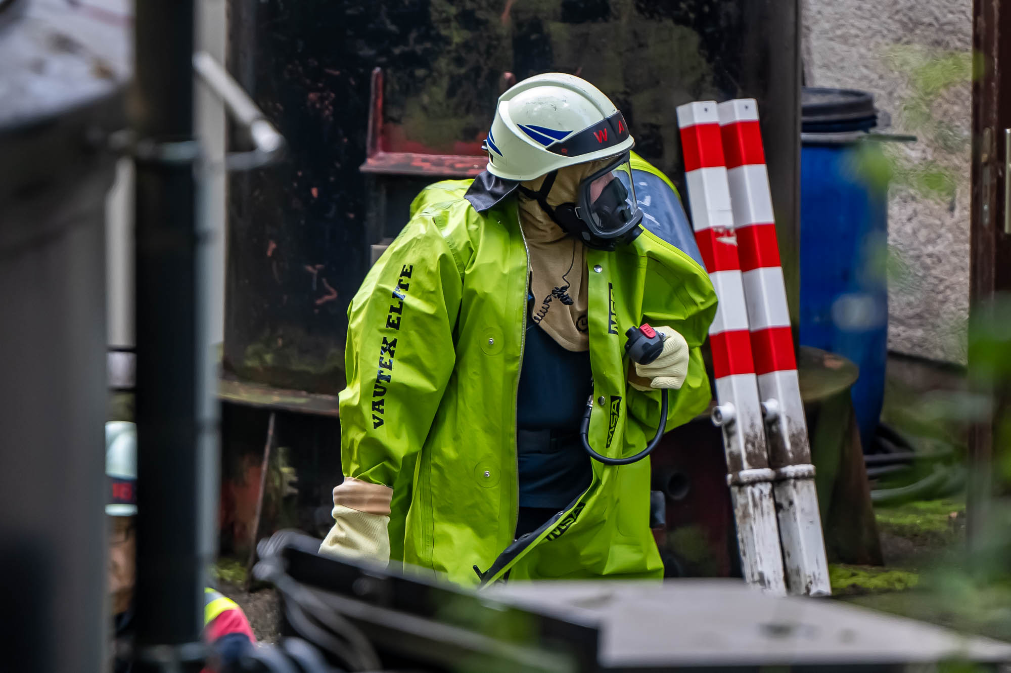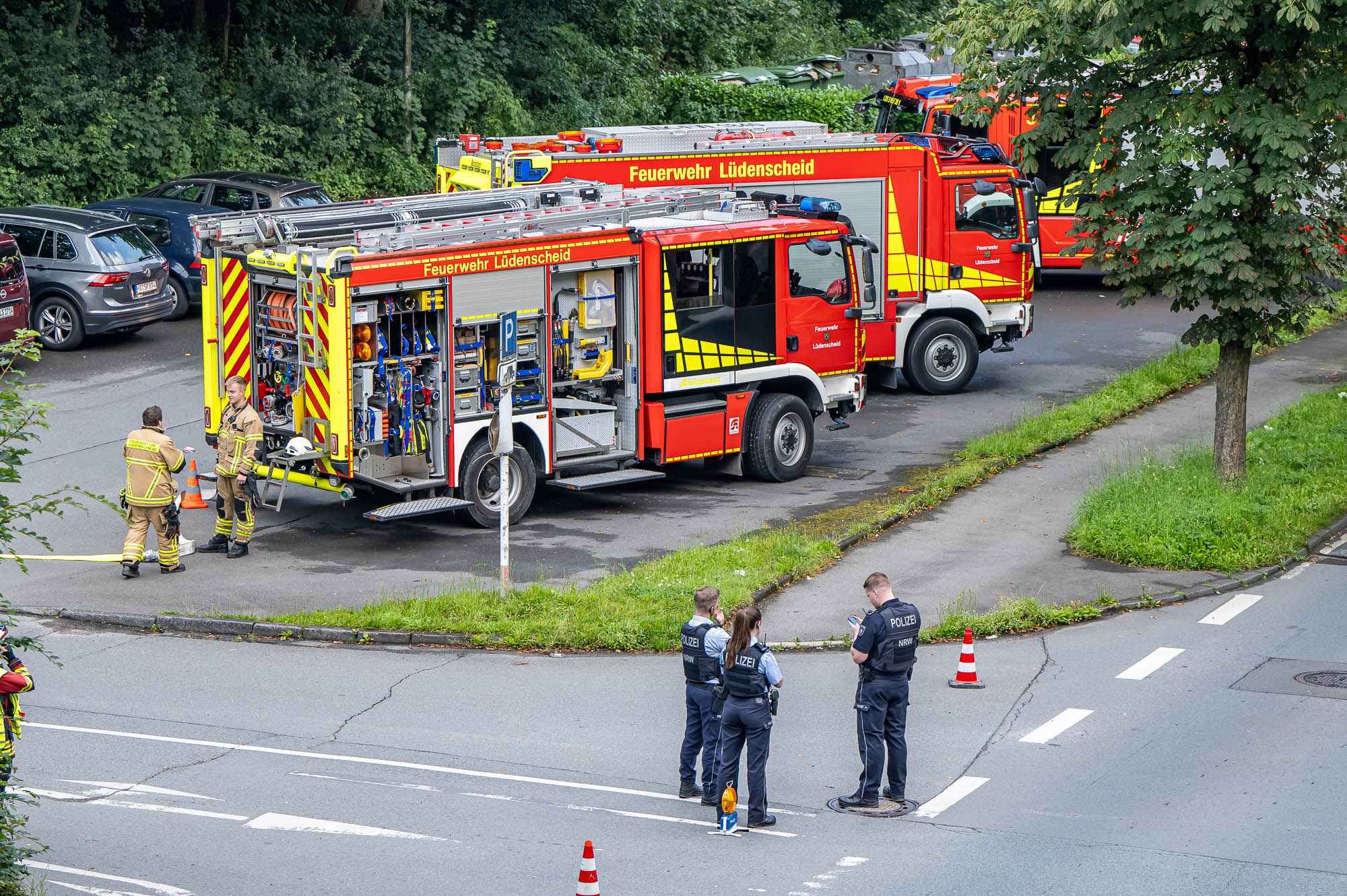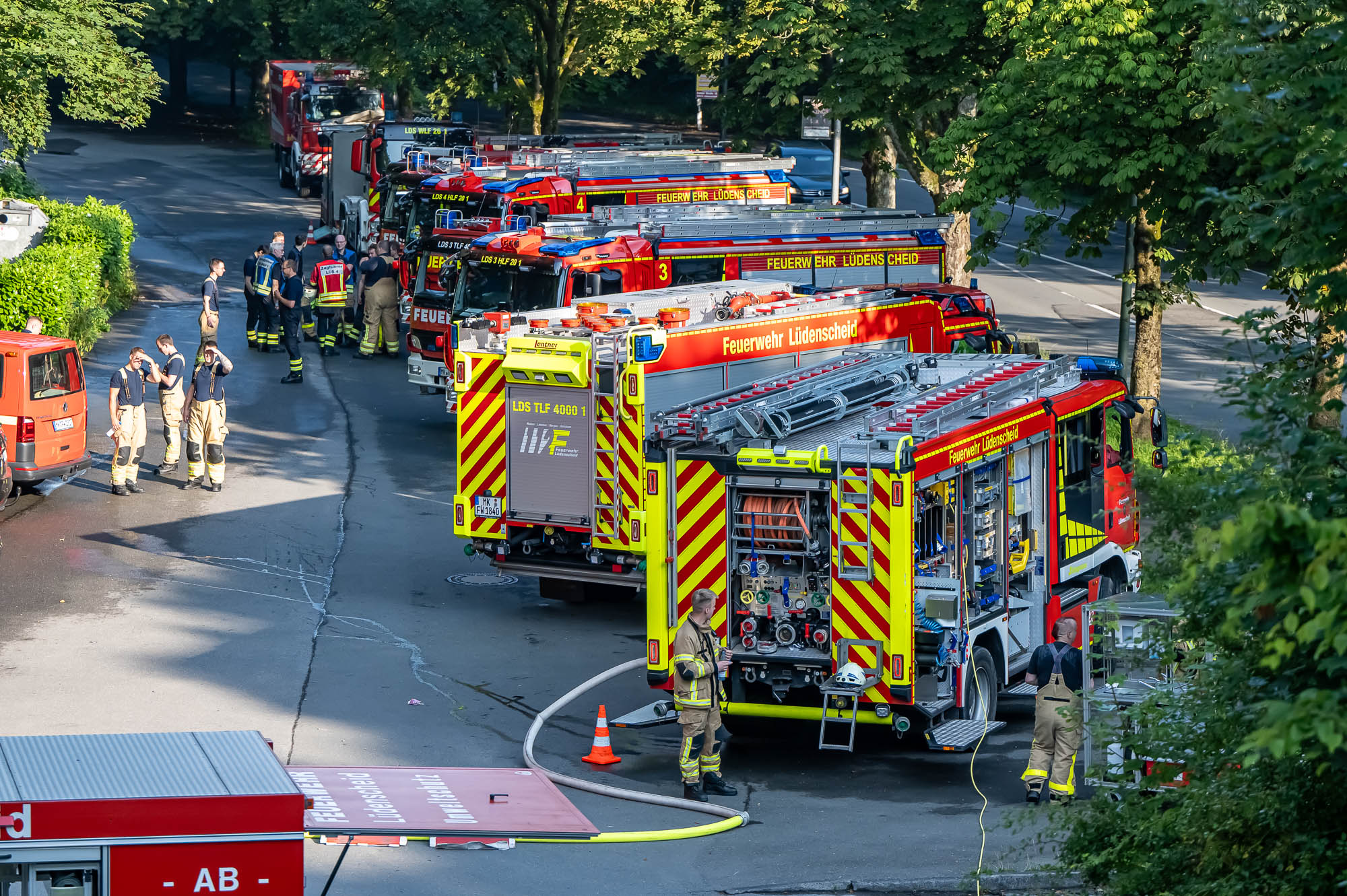 LÜDENSCHEID (mk) Ob Badegäste am Nattenberg am Sonntag, 21. Juli, noch ins kühle Nass steigen können, ist fraglich. Hier läuft seit dem frühen Morgen ein umfangreicher Feuerwehreinsatz: Der untere Parkplatz an der Talstraße ist voll mit Feuerwehrfahrzeugen, unterhalb der Fußgängerbrücke ist eine Dekontaminierungsstation aufgebaut. Der Auslöser für den ABC-Einsatz ist allerdings eine Lage, die immer mal wieder ein Freitzeitbädern eintritt: Es war kurz nach 7 Uhr der Austritt von Chlorgas festgestellt waren. Alarmiert worden war die Feuerwehr bereits gegen 6.30 Uhr von der Brandmeldeanlage. Das Gas, welches für die Wasserreinigung benötigt wird, war in den Technikräumen im Keller des Gebäudekomplexes nachgewiesen worden.