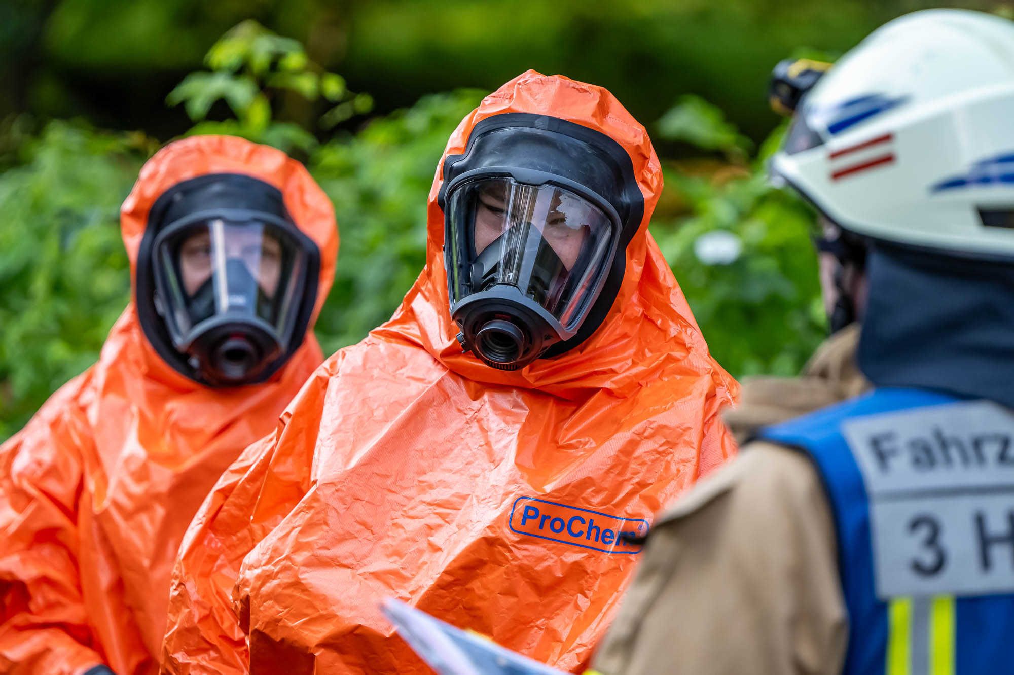 Frühe Badegäste ließen sich vom umfangreichen Feuerwehreinsatz nicht beeindrucken. Dabei waren Lüdenscheider Einheiten mit insgesamt rund 80 Kräften am Nattenberg, auch der martialische Anblick der Feuerwehrleute im Vollschutzanzug, der zum Betreten der betroffenen Räume nötig ist, wirkte offenbar nicht abschreckend genug. Sogar Autofahrer wollten an den Polizeibeamten vorbei die Absperrung passieren. Vorbeigelassen wurden sie natürlich nicht. Zwischenzeitlich erkundeten die gut geschützten Wehrleute die Lage, um die Ursache für den unkontrollierten Gasaustritt zu finden, und idealerweise auch zu beheben.