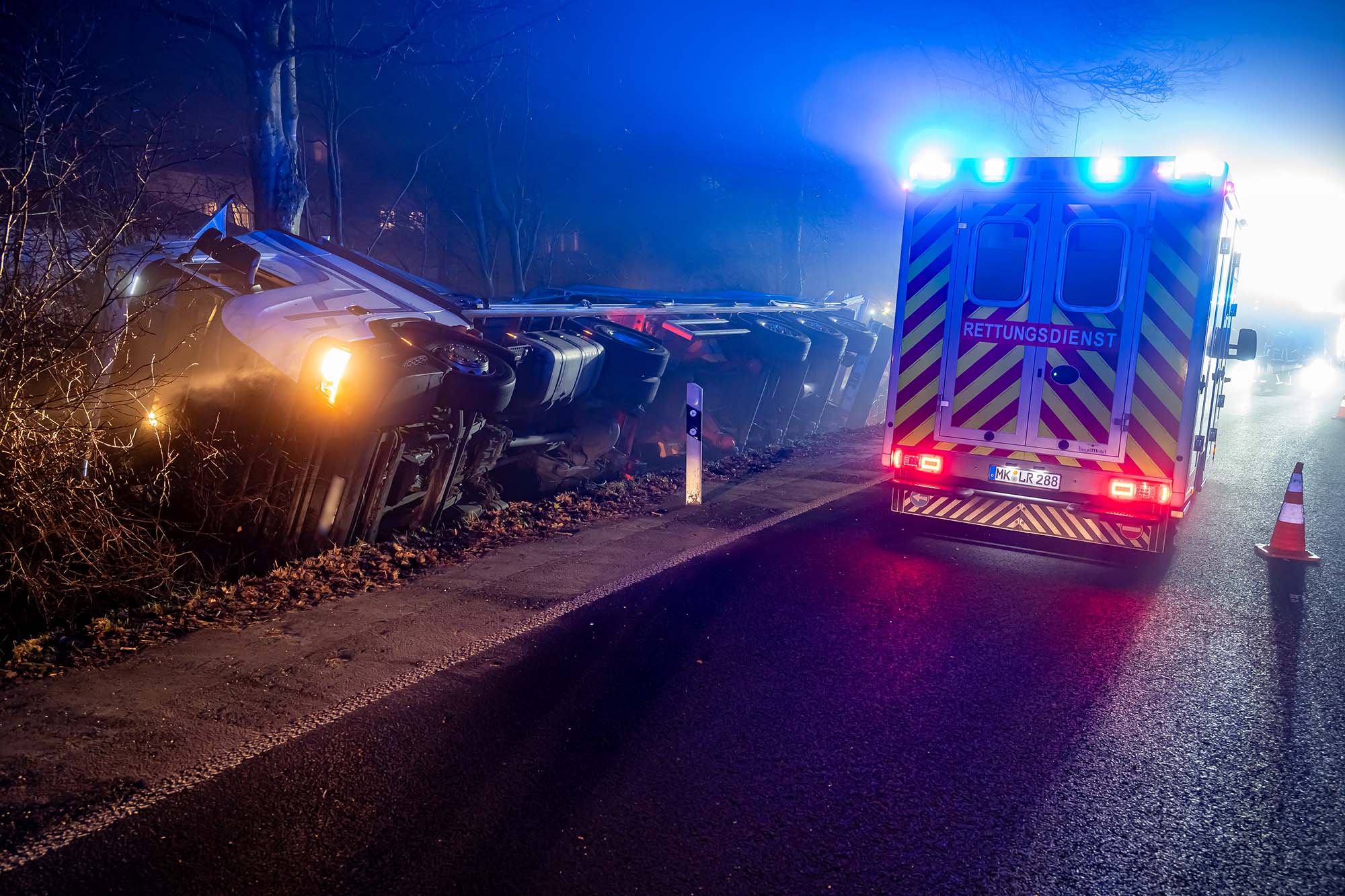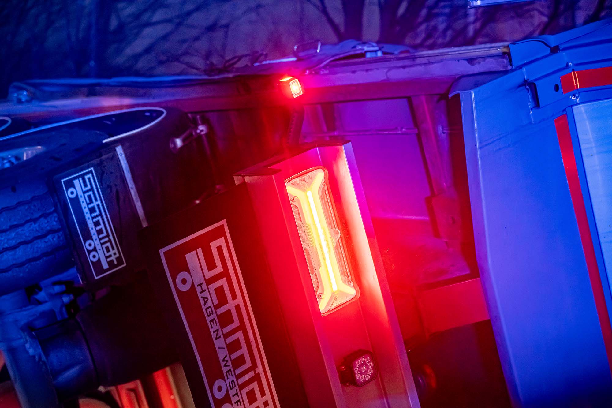 Update 9:15 Uhr: Polizei und Feuerwehr haben inzwischen die Unfallstelle verlassen. Ein Abschleppunternehmen ist benachrichtigen worden, doch wann es mit der Bergung losgeht, ist noch nicht sicher. Für die Polizei ist die auch nicht zwingend ein Einsatz: “Wenn nur eine einspurige Sperrung nötig ist, macht dass das Bergungsunternehmen normalerweise in Eigenregie”, erklärt Polizeisprecher Lorenz Schlotmann den üblichen Ablauf. Erst bei einer längerfristigen oder kompletten Sperrung wäre die Polizei wieder beteiligt. Erkenntnisse über die Unfallursache liegen auch noch nicht vor. Aber der Zustand der Reifen des Aufliegers dürften nach Einschätzung der Beamten vor Ort keinen Einfluss gehabt haben: “Gegen den Fahrer wurde ein Verwarngeld verhängt”, so der Polizeisprecher. Das würde völlig anders aussehen, wenn der technische Zustand des Fahrzeugs eine Rolle gespielt hätte.