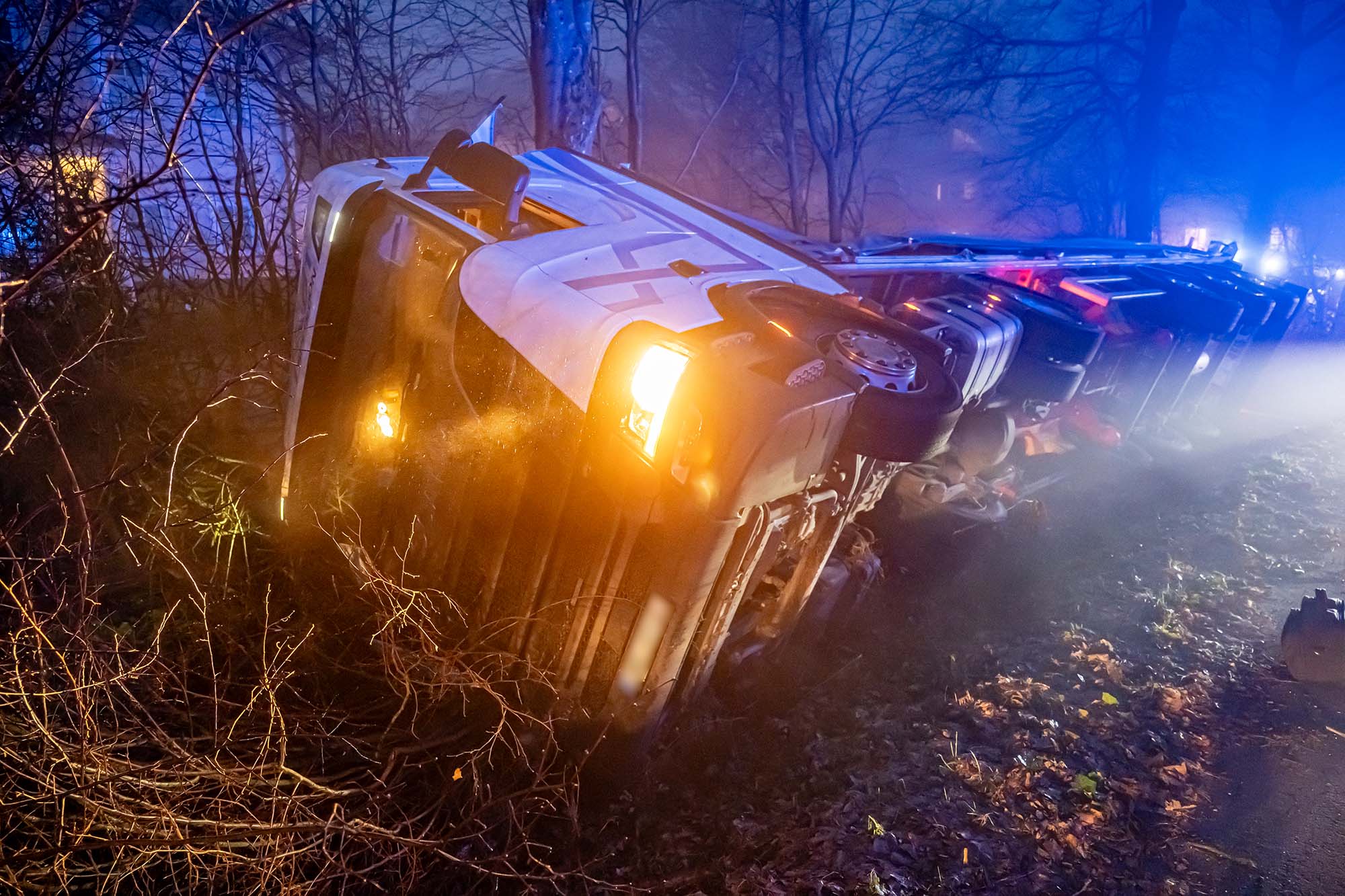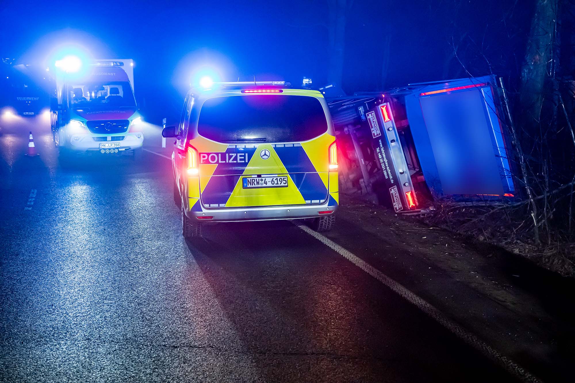 Update 18:15 Uhr: Der LKW ist mittlerweile geborgen worden. Entgegen üblicher Vorgehensweisen ist das offenbar ohne Straßensperrungen gelungen, zumindest ist der Polizei keine entsprechende Maßnahme bekannt. Somit sind keinerlei Verkehrsprobleme durch diesen Unfall mehr zu erwarten.