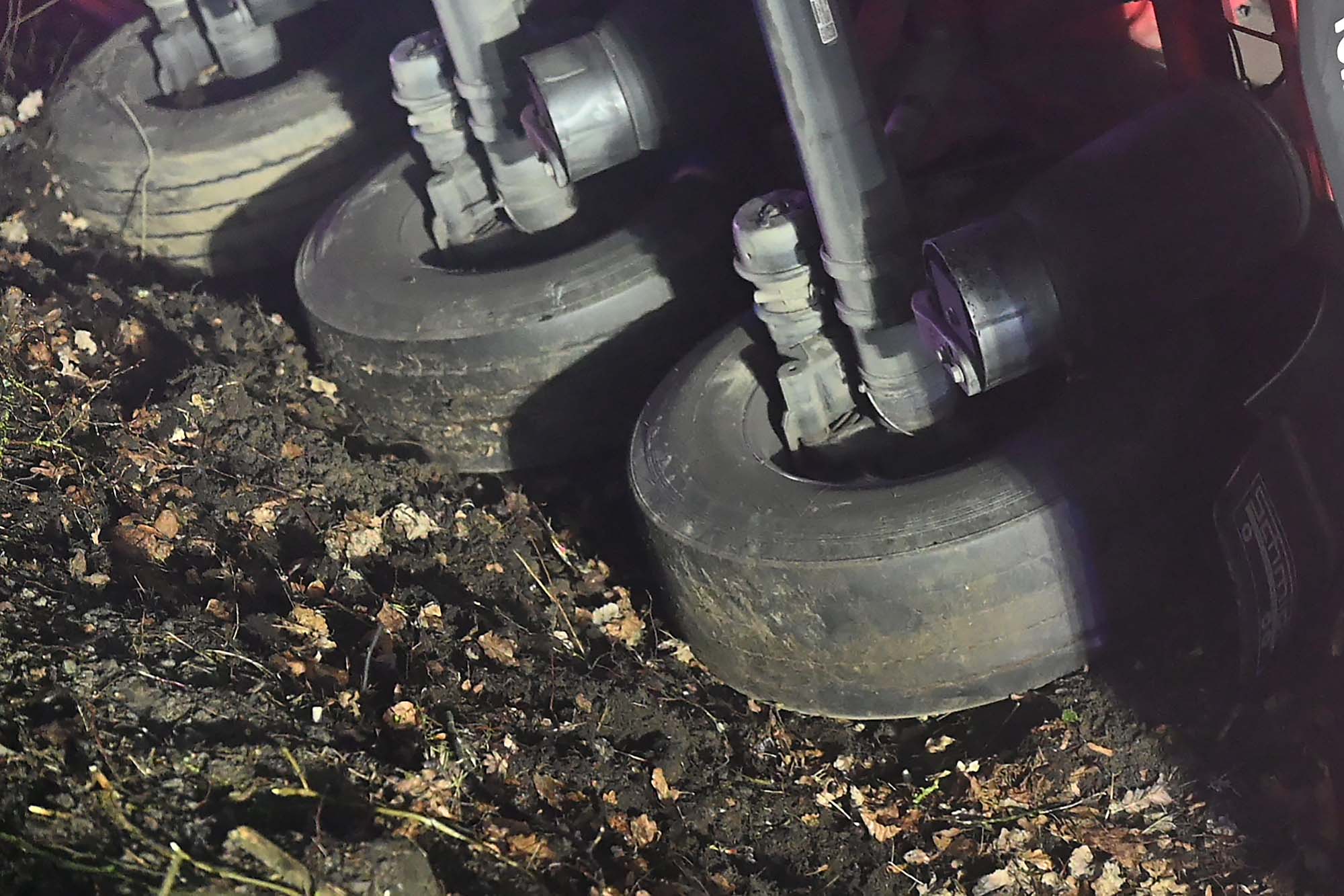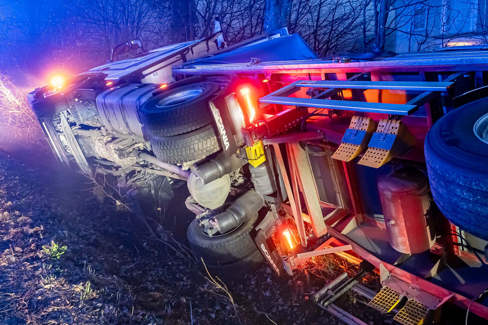 Der Sachschaden dürfte aber enorm sein: Der komplette Sattelzug liegt in einer Kurve direkt vor dem Gelände eines Baumaschinenverleihs der Länge nach in der Böschung. Wieviel dabei am LKW kaputtgegangen ist, kann derzeit noch nicht abgeschätzt werden. Das gilt auch für den angerichteten Flurschaden. Sicher ist bislang: “Ein Begrenzungspfahl wurde umgefahren”, erklärte die Polizei. Die brauchte die besonders am Montagmorgen vielbefahrene Bundesstraße nicht zu sperren, weshalb sich die Auswirkungen auf den Berufsverkehr in Grenzen halten.