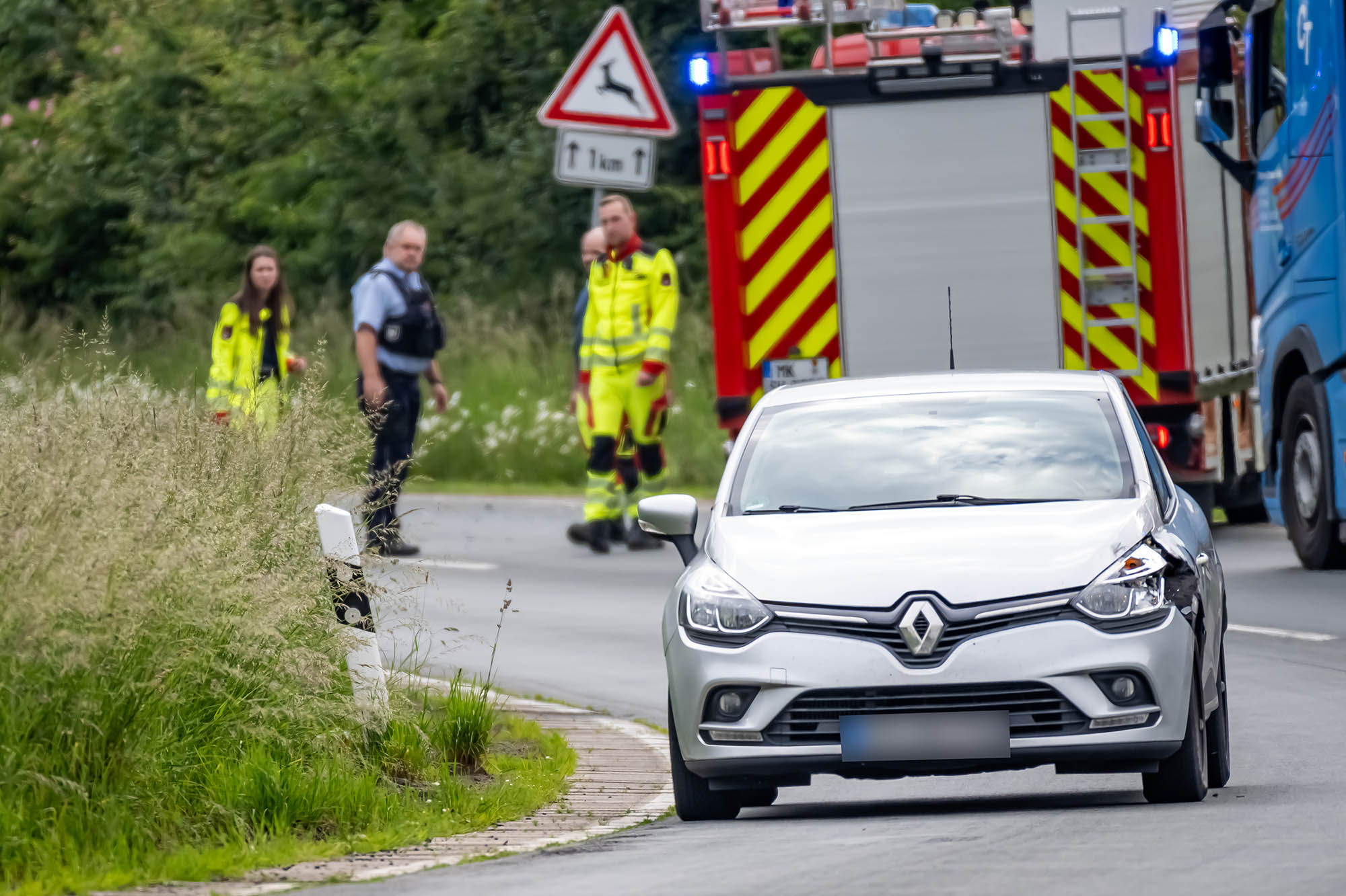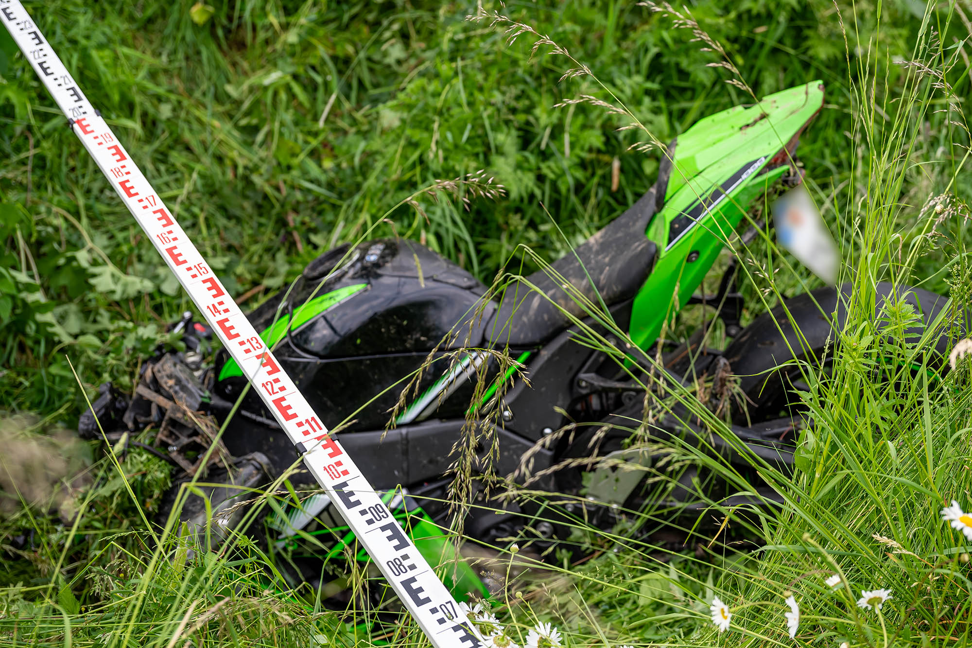 Update 21.55 Uhr: Der Unfall hat sich gegen 17.40 Uhr zwischen den Ortsteilen Bergfeld und Anschlag ereignet. Beteiligt waren eine eine 25 Jahre alte Autofahrerin, sowie der 59-jährige Biker. Beide stammen aus Halver. Zum Unfallhergang kann die Polizei bislang sagen, dass der Motorradfahrer mit dem linken Arm die Fahrerseite des Kleinwagens touchierte, und anschließend die Kontrolle über seine Kawasaki verlor. Er schleuderte mitsamt des Motorrades über die Straße in den Graben, bis zu einem Überweg. Die 1000-Kubik-Maschine bohrte sich regelrecht in den Graben und wurde völlig zerstört. Auch der PKW wurde erheblich beschädigt und war nicht mehr fahrbereit. Dessen Fahrerin stand unter Schock, musste aber nicht ins Krankenhaus. Der Motorradfahrer wurde vom Lünener ADAC-Hubschrauber “Christoph 8” in eine Unfallklinik geflogen. Das VU-Team sicherte bis in den Abend hinein Spuren, um den Unfallhergang zu rekonstruieren. Im Einsatz war auch die Halveraner Feuerwehr, die zeitweise die Unfallstelle absicherte.