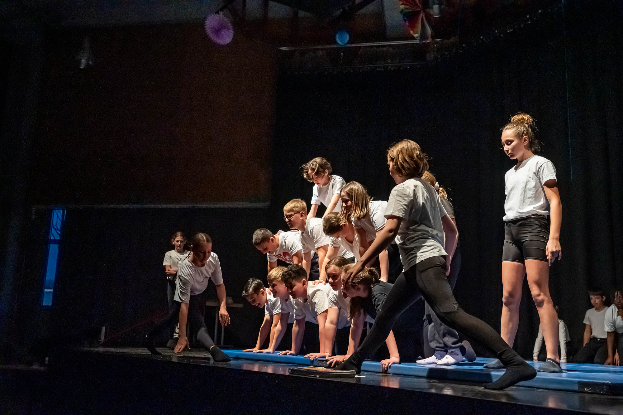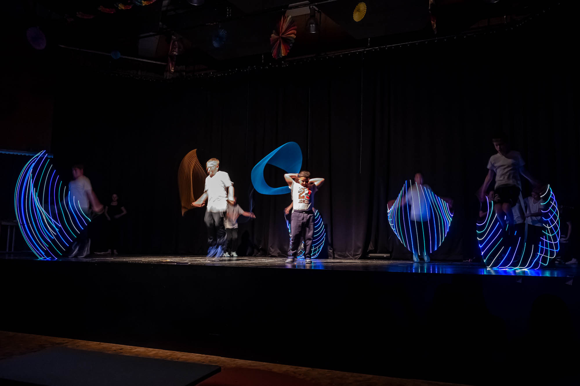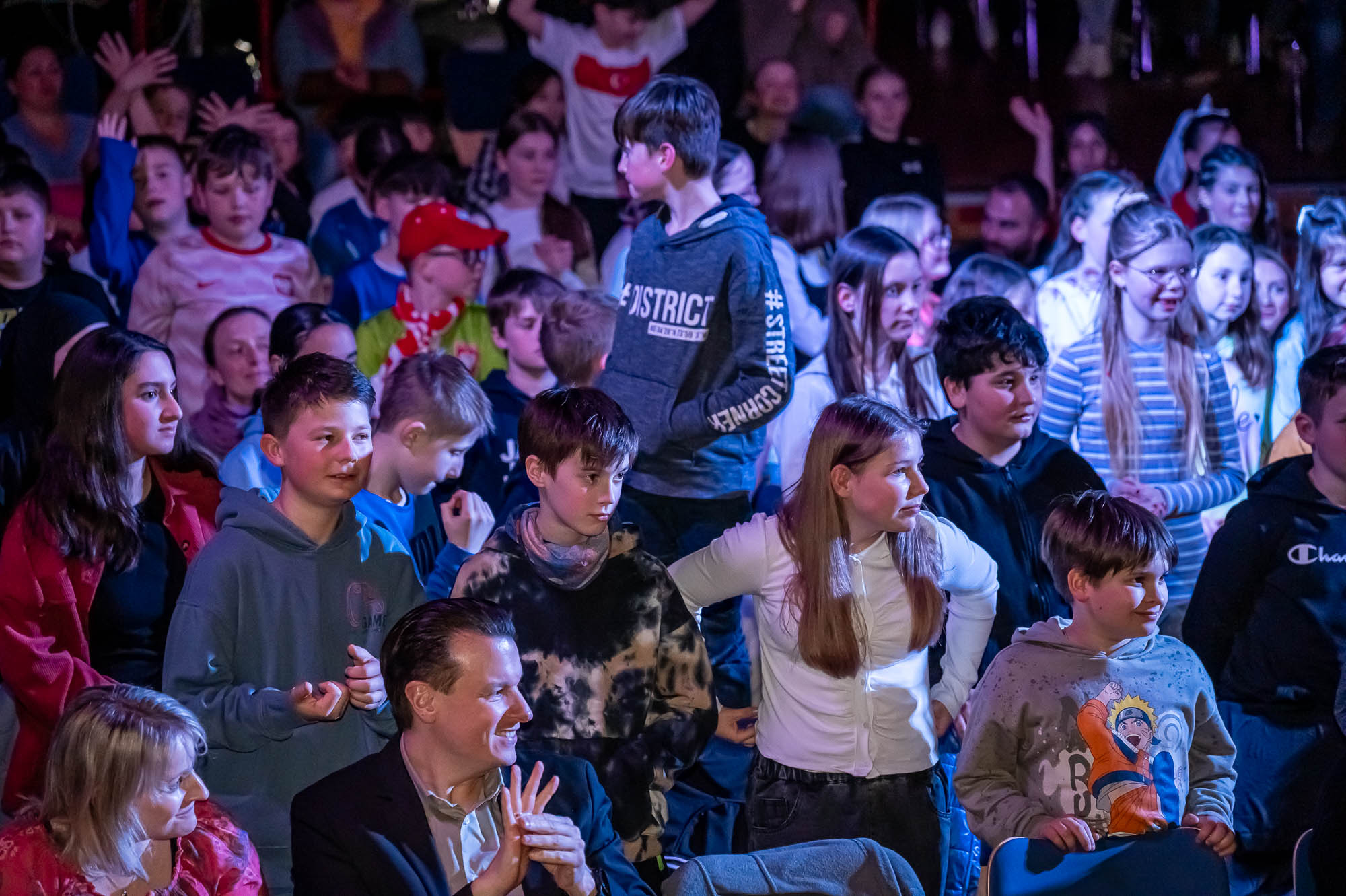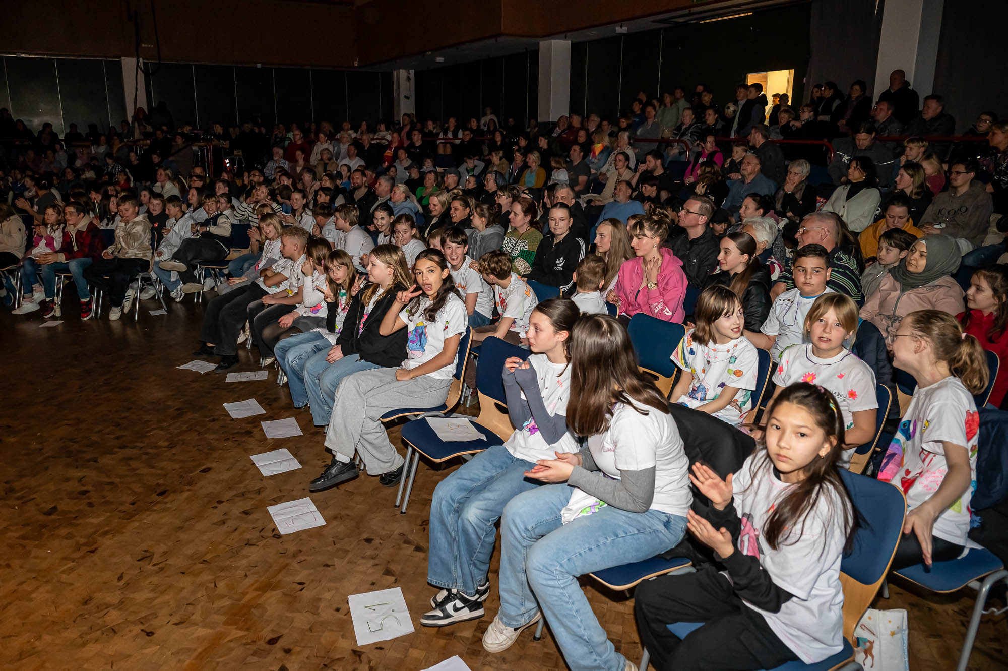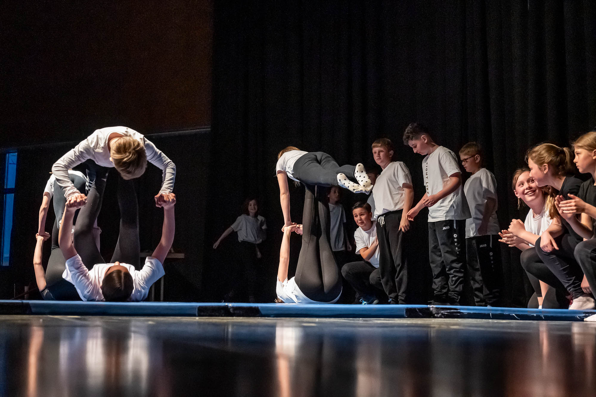 Sportlich bis regelrecht artistisch wurde es zum Abschluss mit den „Sportskanonen“ der Klasse 5.6: Mit bunten Lichteffekten und teils wagemutigen Vorführungen brachten diese Fünftklässer nochmal richtig Action in das Pädagogische Zentrum. Die Begeisterung im Publikum war natürlich groß. Hier saßen im vollbesetzten Zuschauerraum nicht nur die fünften Klassen, die sich die Vorführungen ihres Jahrganges ansehen, sondern auch Eltern, Großeltern und Geschwister. Ausserdem Lehrerinnen und Lehrer, die nicht nur erleichtert über den reibungslosen Ablauf waren, sondern sichtlich stolz auf ihre Schützlinge.