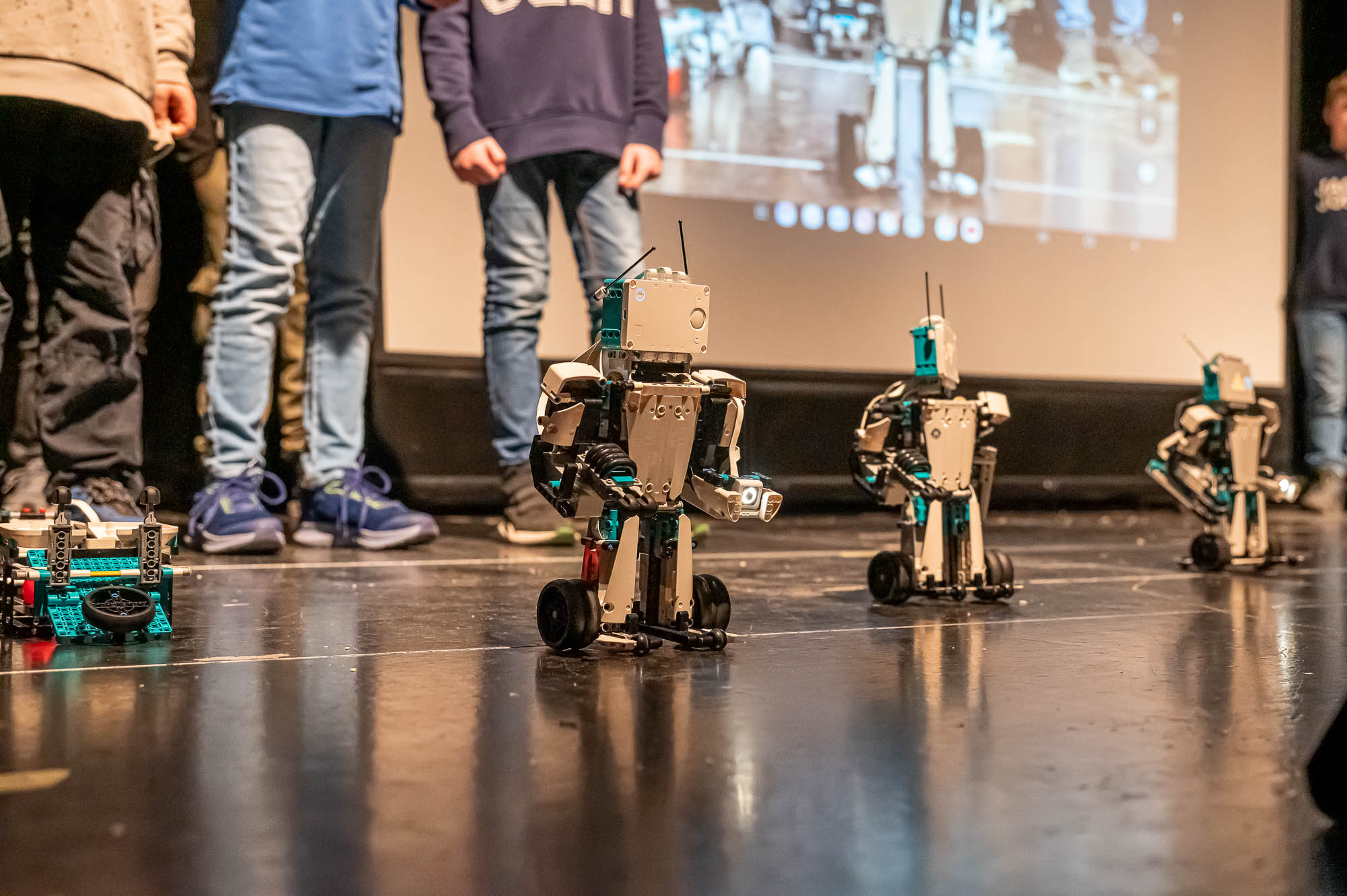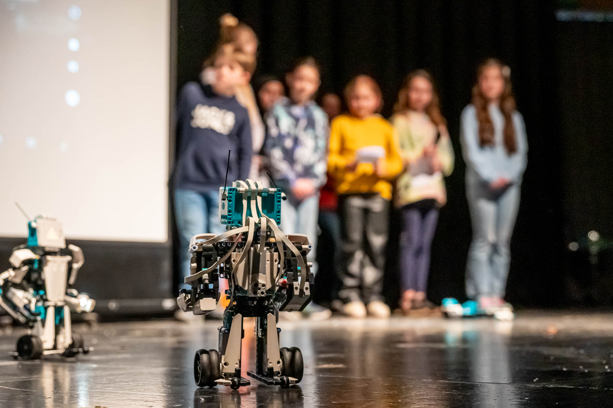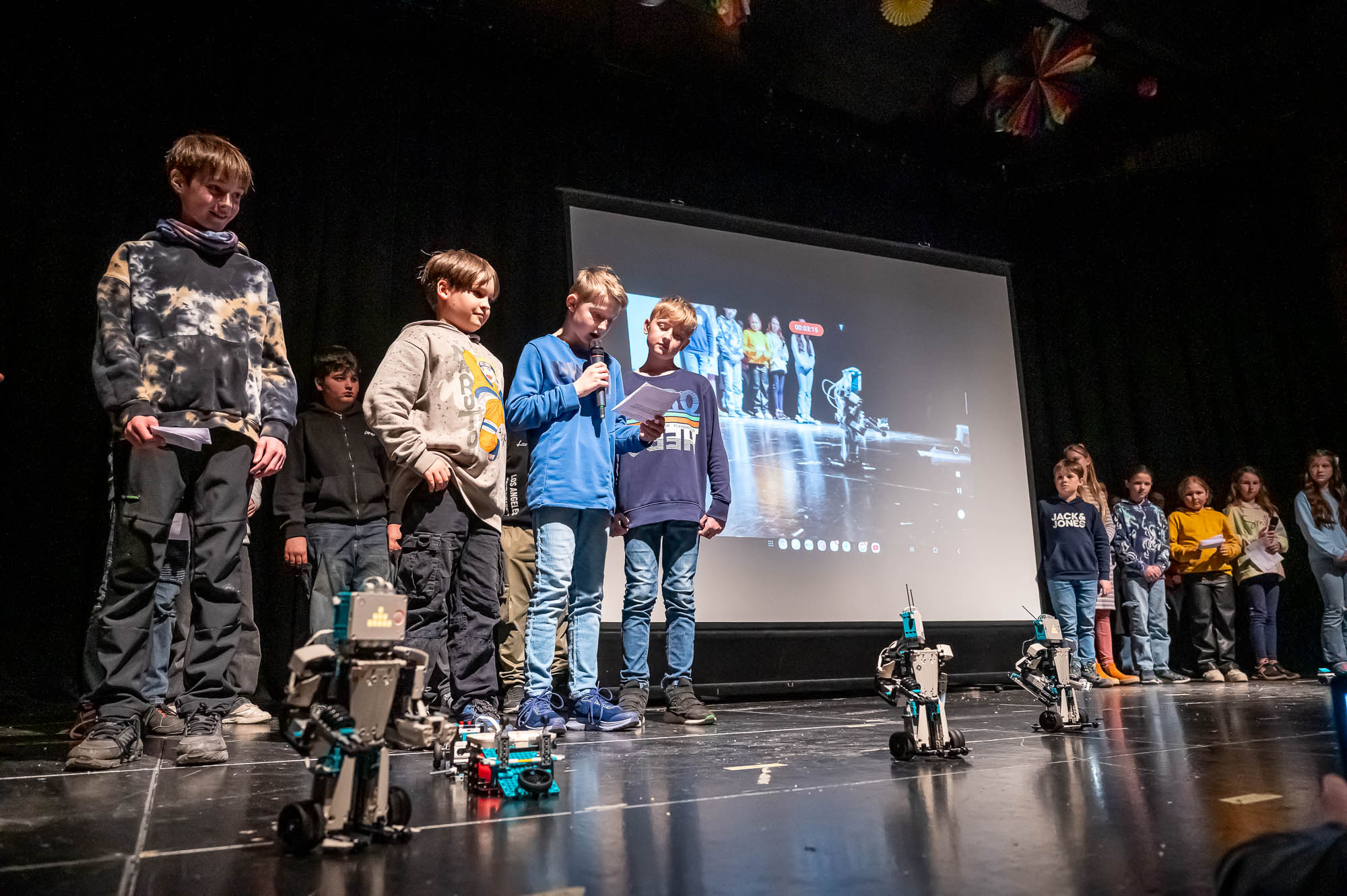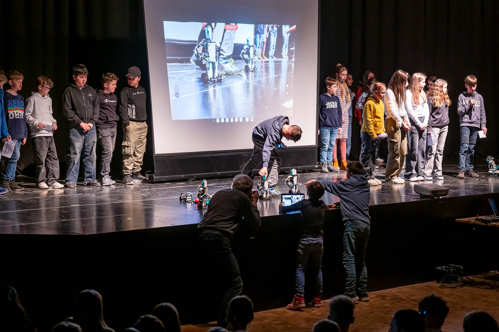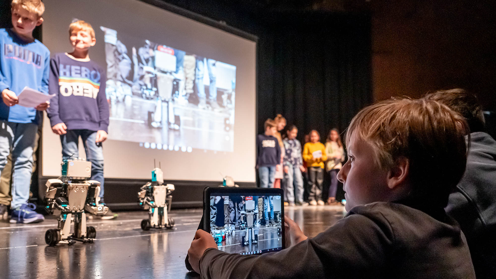 Die Darsteller der MINT-Klasse 5.5 waren ziemlich klein. Zumindest aus Sicht der Publikum: Damit die Roboter, die die Schülerinnen und Schüler gebaut und programmiert haben, flitzen auf dem Boden herum, und das ziemlich geschickt, teils auch ferngelenkt. Aber immer im Blickfeld eines Kamerakindes, dass die die Szenerie mit einem Tablet-PC filmte und auf die Videoleinwand streamte.