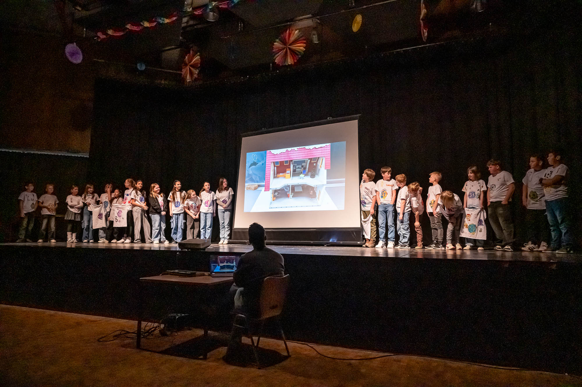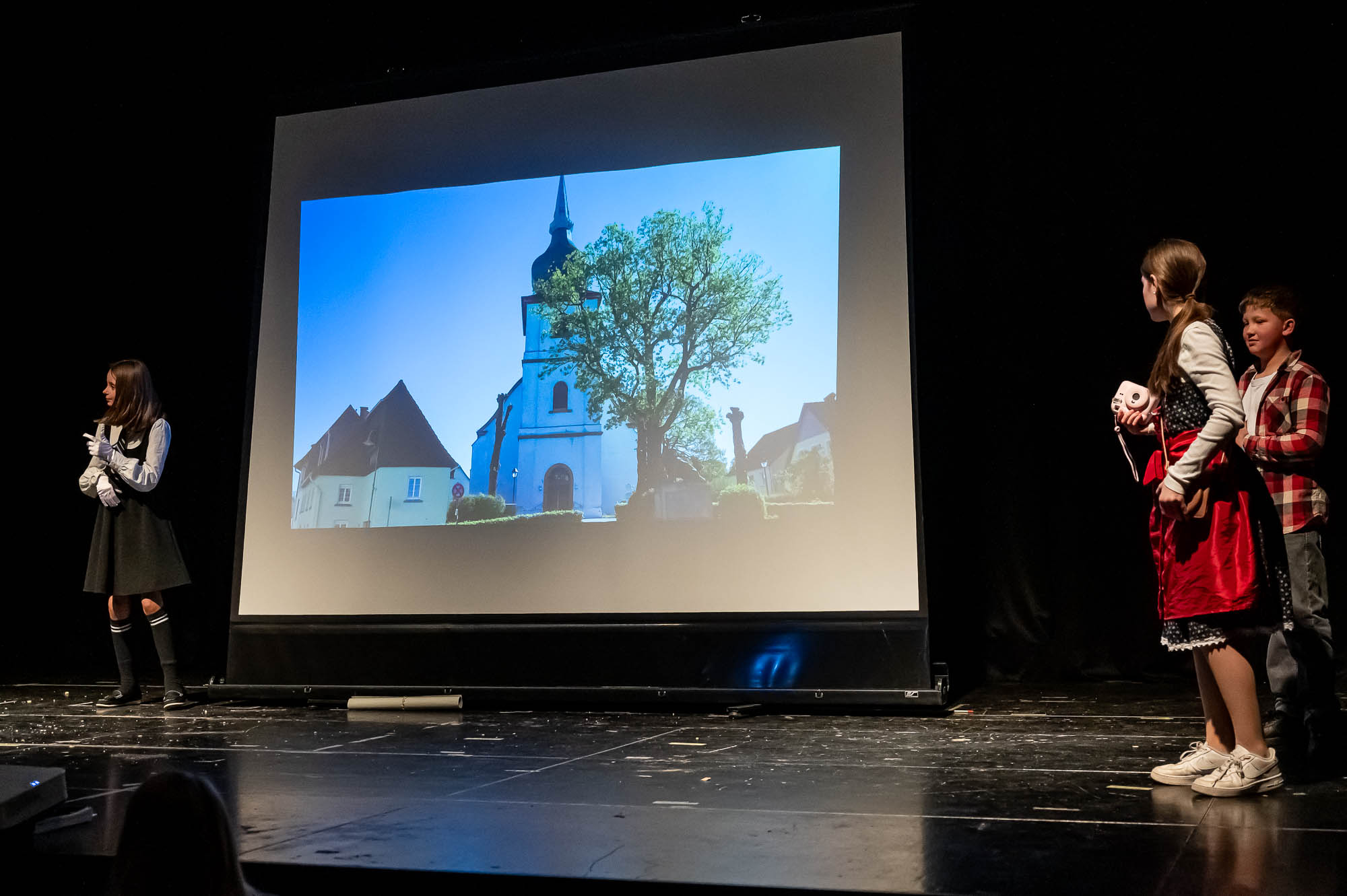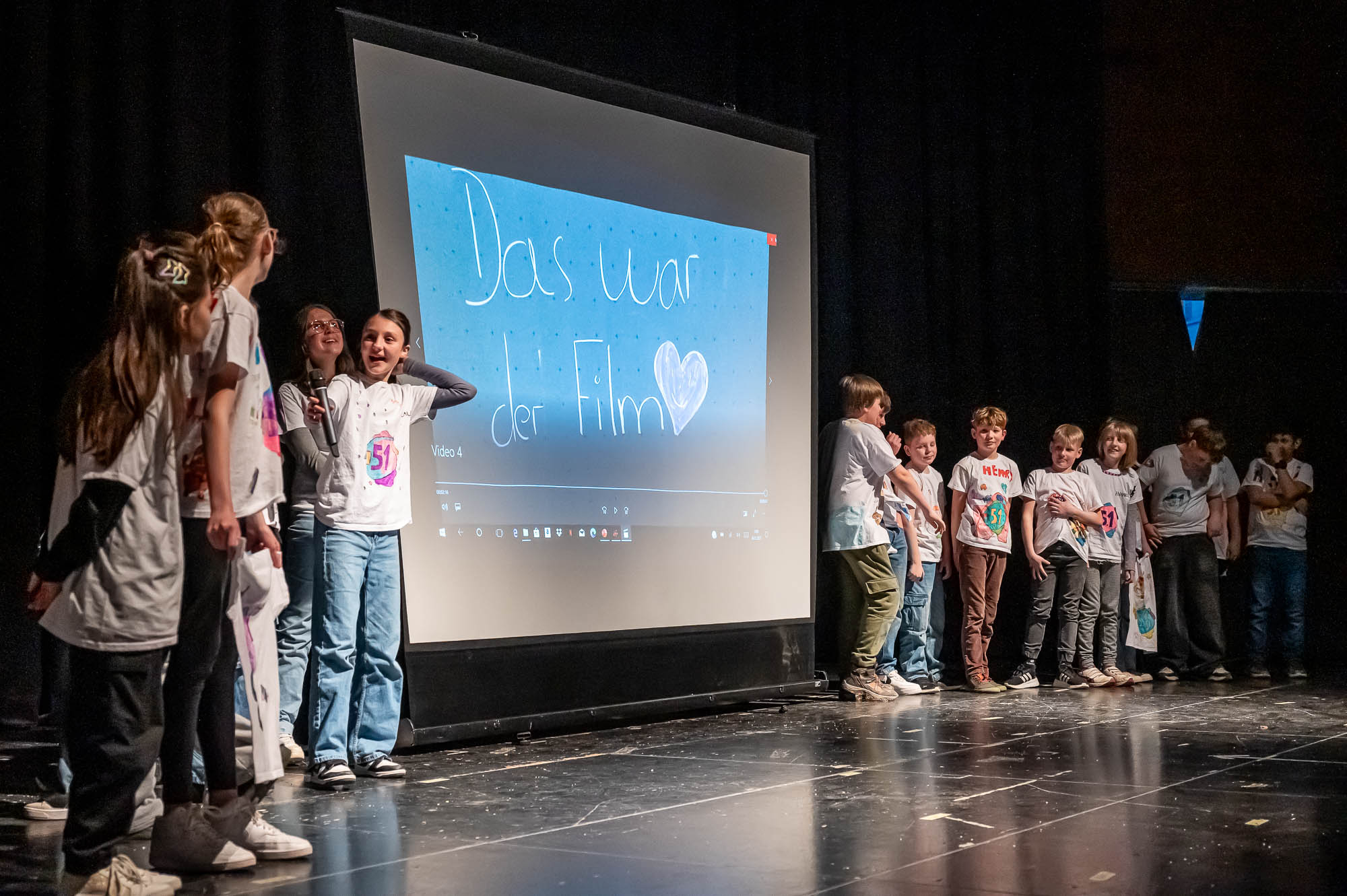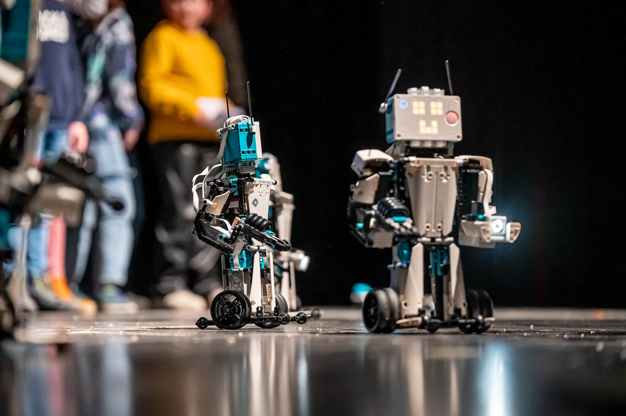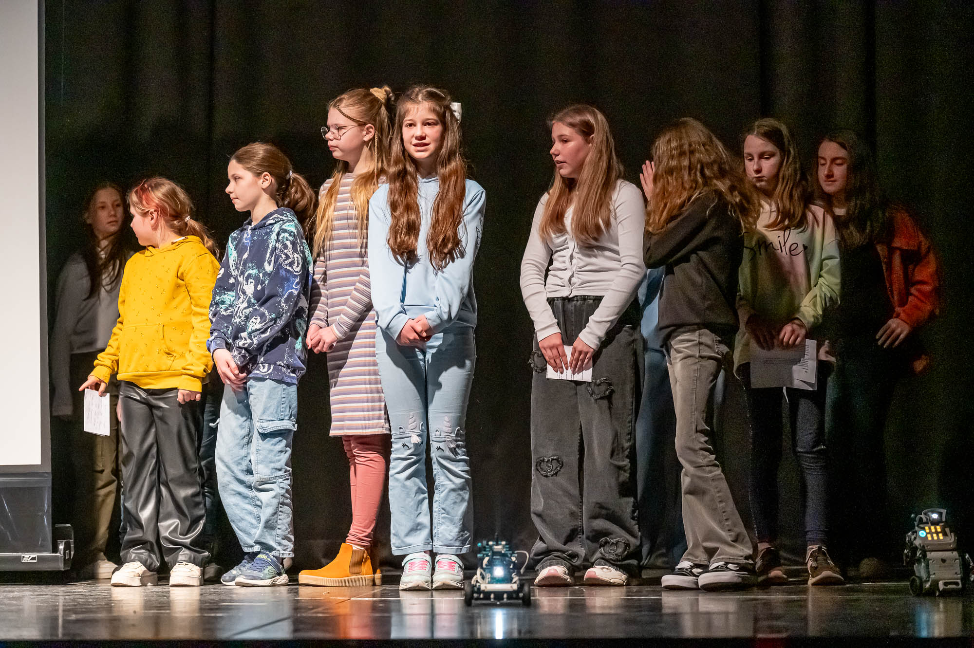 Die Darsteller der MINT-Klasse 5.5 waren ziemlich klein. Zumindest aus Sicht der Publikum: Damit die Roboter, die die Schülerinnen und Schüler gebaut und programmiert haben, flitzen auf dem Boden herum, und das ziemlich geschickt, teils auch ferngelenkt. Aber immer im Blickfeld eines Kamerakindes, dass die die Szenerie mit einem Tablet-PC filmte und auf die Videoleinwand streamte.