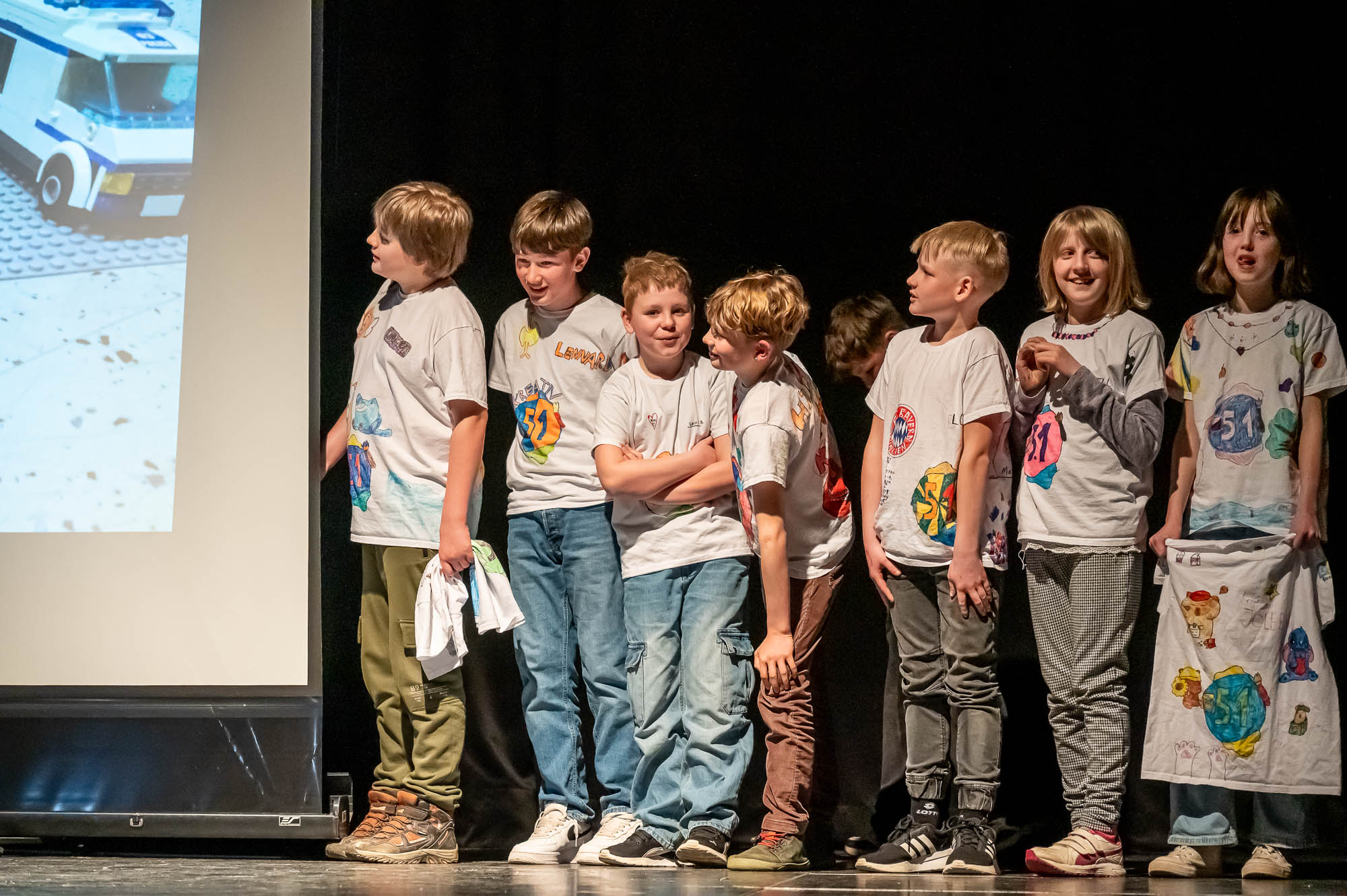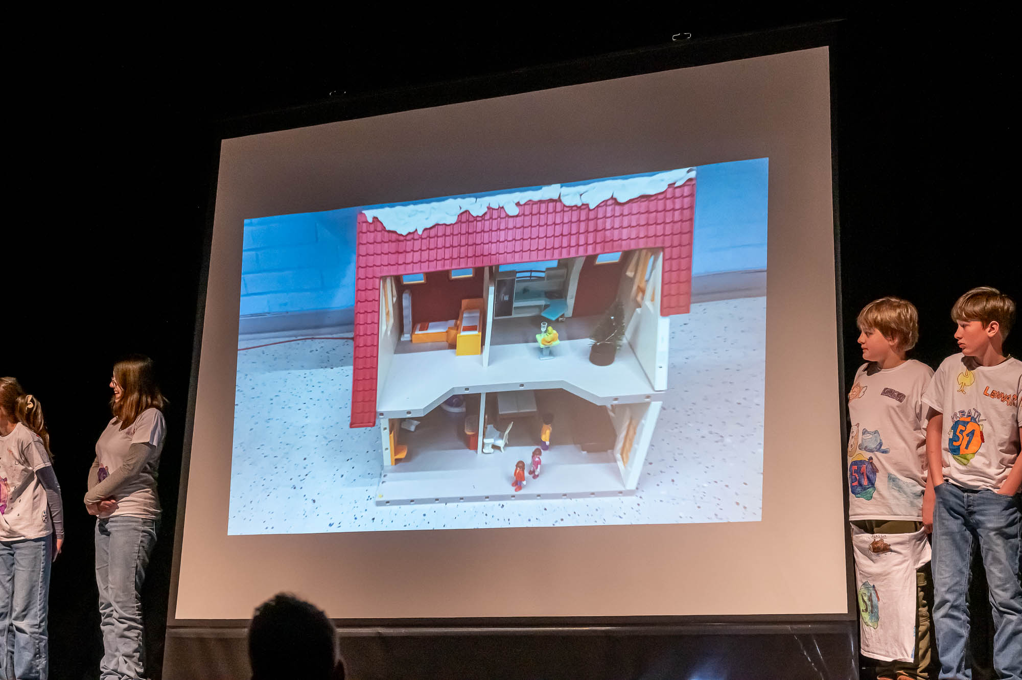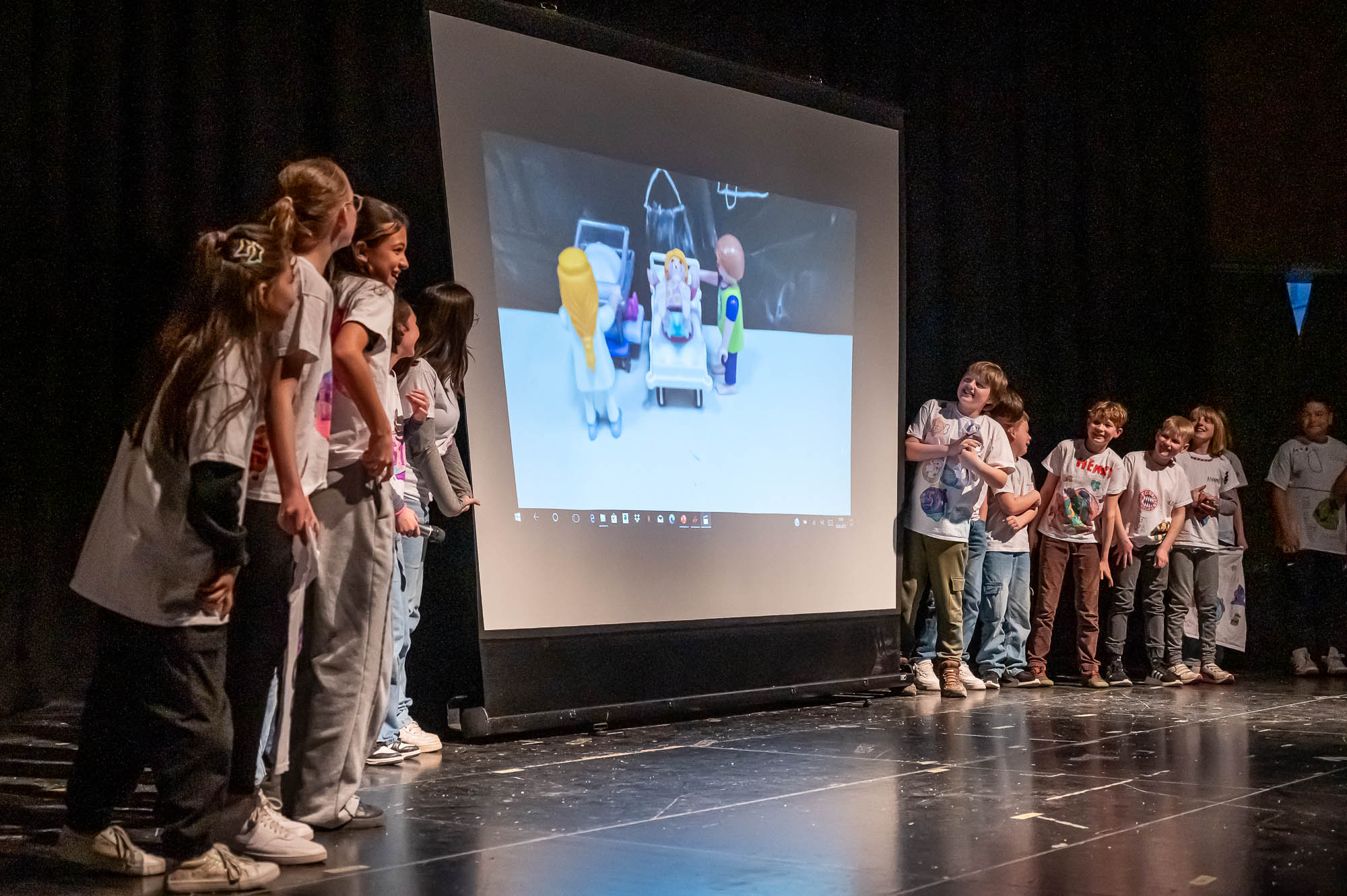 Noch kleiner wurden die Protagonisten des nächsten Auftritts: Hier traten Lego- und Playmobilfiguren in Stop-Motion-Filmen auf. Natürlich nicht ganz freiwillig, sondern mit sanftem Nachdruck durch die Kids der Kreativ-Klasse 5.1, die beim Dreh eine Menge über die Filmproduktion gelernt haben müssen. Ein paar Eigenwilligkeiten haben sich die Kinder durchaus erlaubt, so ist es wohl eine Frage der “künstlerischen Freiheit”, wenn die Polizei den Gangster im Krimi mit einem Sattelschlepper einholt, obwohl dieser einen schnellen Sportwagen fährt. Diese Kuriosität hat die Begeisterung der Zuschauer wohl nur angefacht.