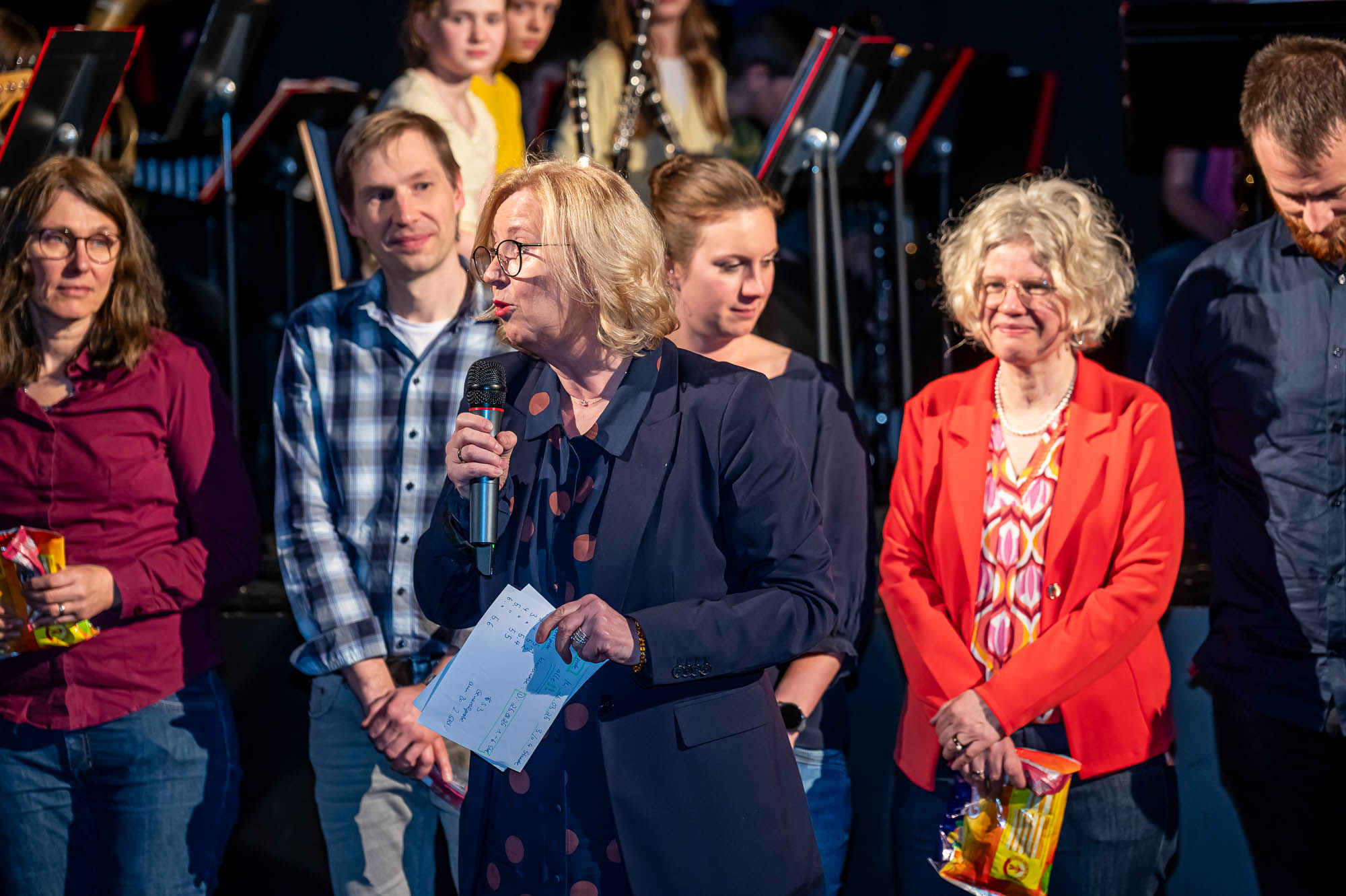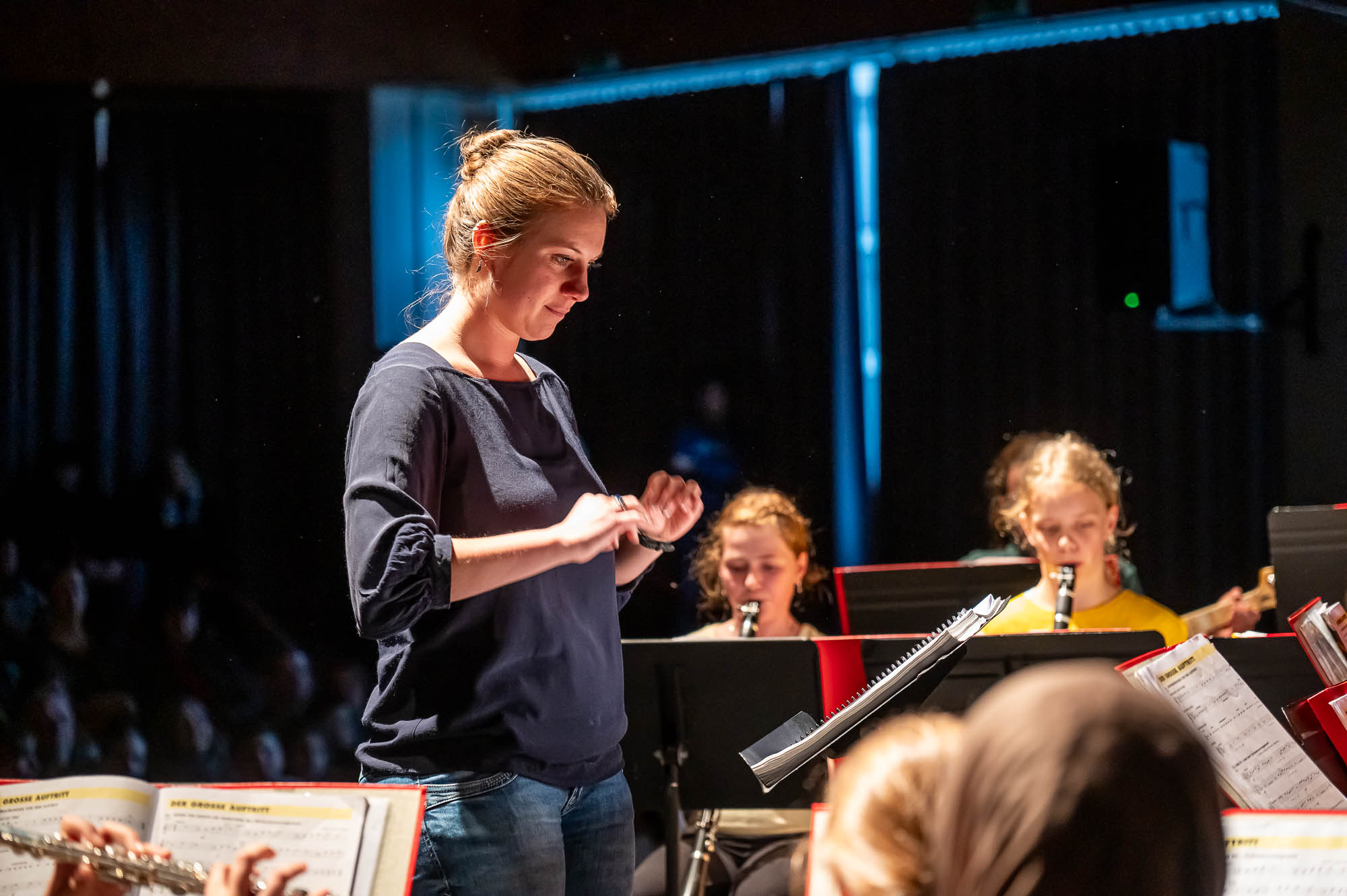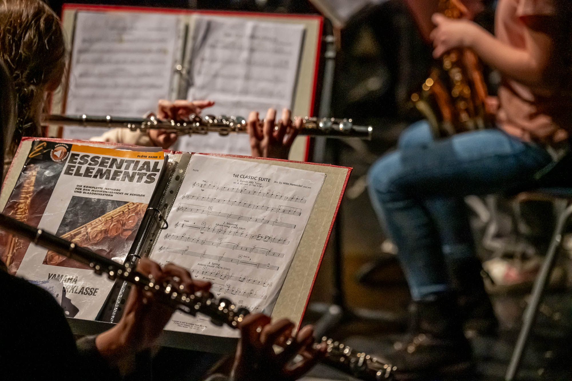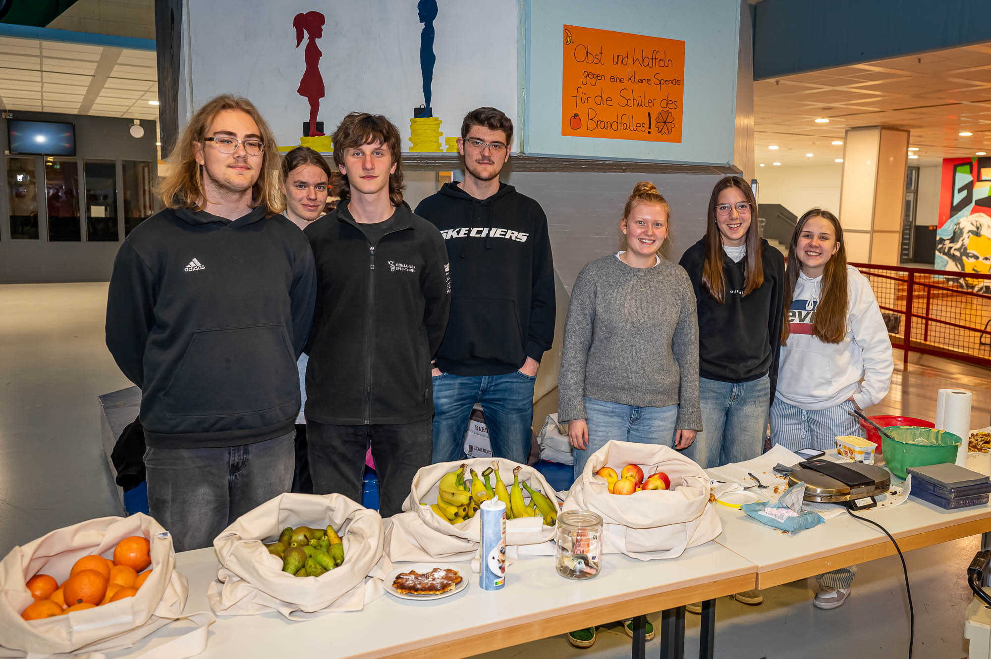Auch wenn das Repertoire natürlich variiert: Den Auftakt eines Schwerpunktabends macht stets eine Bläserklasse.. So war es mit der 5.3. auch diesmal, und manche Titel sind auch immer mal wieder mit dabei: “Diesmal wecken wir Bruder Jakob mit unseren Instrumenten”, kündigt eine Schülerin an. Später stand auch mal Vivaldi auf dem Plan, mit Musik, die eigentlich für die Violine gedacht ist, aber auch mit Bläsern harmoniert. Währenddessen war auch noch eine weitere Bläserklasse aktiv: Schülerinnen und Schüler der 9.3 haben in der Mensa Obst, Waffeln und Getränke verkauft. Nicht nur zur Freude der Gäste, die dadurch gut versorgt waren, sondern um den Erlös den Menschen, teils Mitschüler, die bei dem verheerenden Wohnhausbrand am Nocken Hab und Gut verloren haben. Auch nach der Veranstaltung wurden Spenden gesammelt, die Gesamtschule konnte bei den verschiedenen Spendenaktionen stattliche Beträge einnehmen.