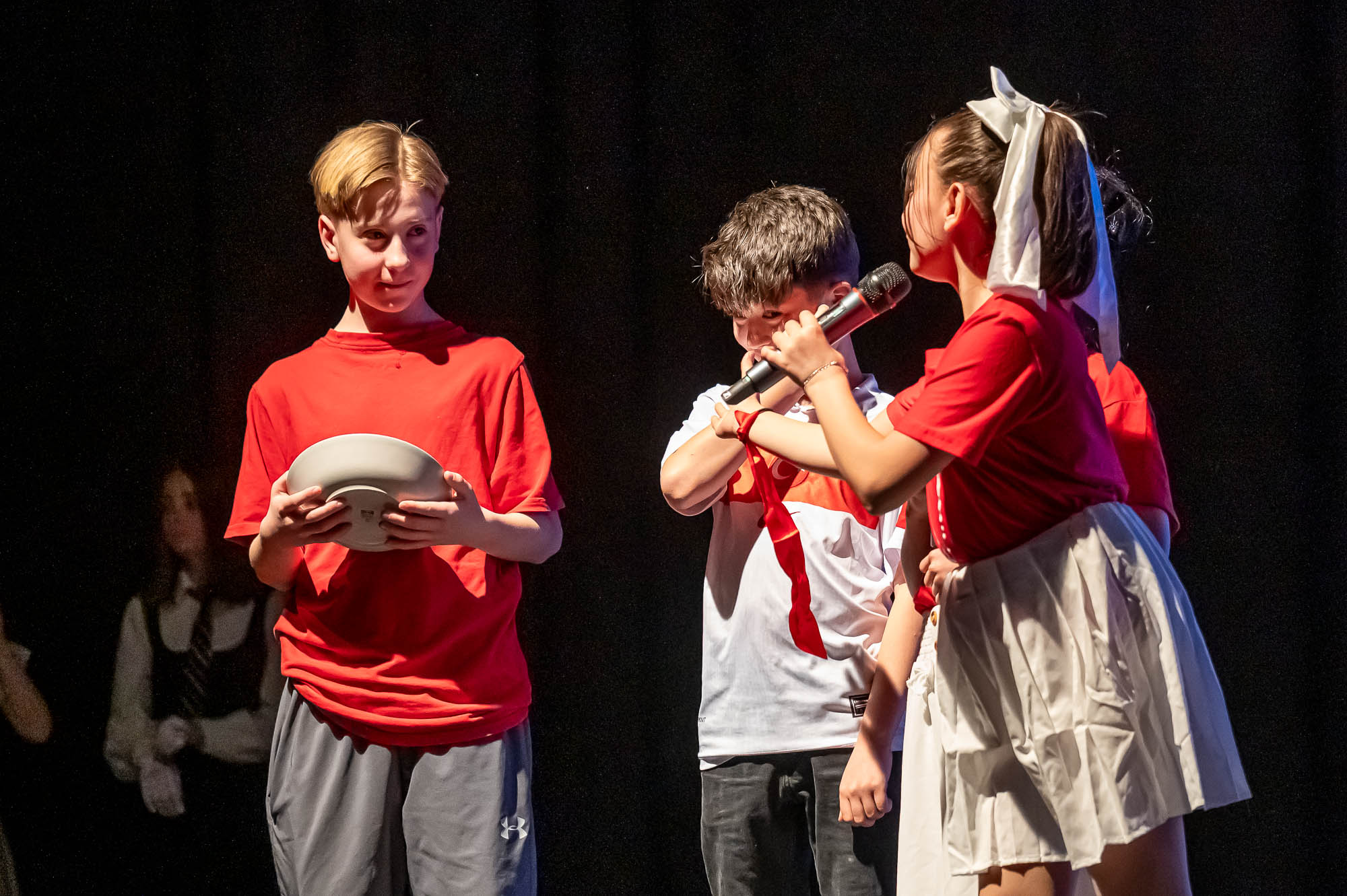 KIERSPE (mk) Als anderes Wort für diese Events wäre wohl “Leistungsnachweis” passend, denn streng genommen sollen die Kinder ja zeigen, was sie im laufenden Schuljahr gelernt haben. Das hat am vergangenen Mittwoch, 26. März, der Jahrgang 5 getan, eine Woche nach den Sechstklässlern. Und das ist ihnen ziemlich überzeugend gelungen! Doch bevor das Programm startete, widmete sich Astrid Hettesheimer, die Abteilungsleiterin beider Jahrgänge, den Beteiligten, die nicht im Rampenlicht stehen, und dennoch einen wichtigen Anteil am Erfolg einer solchen Veranstaltung haben. So gab es ein süßes Dankeschön für den jungen Mann in der Technik, der am Mischpult “alles regelt”, als auch für zwei Jugendliche, die glücklicherweise nicht aktiv tätig werden brauchten: Sie standen nämlich als Sanitäter für etwaige medizinische Notfälle bereit. Die gab es zum Glück aber nicht. Viel Arbeit haben aber die beteiligten Lehrerinnen und Lehrer in die jeweiligen Projekte investiert, und wurden dafür nicht nur mit Applaus, sondern auch mit Naschwerk belohnt.