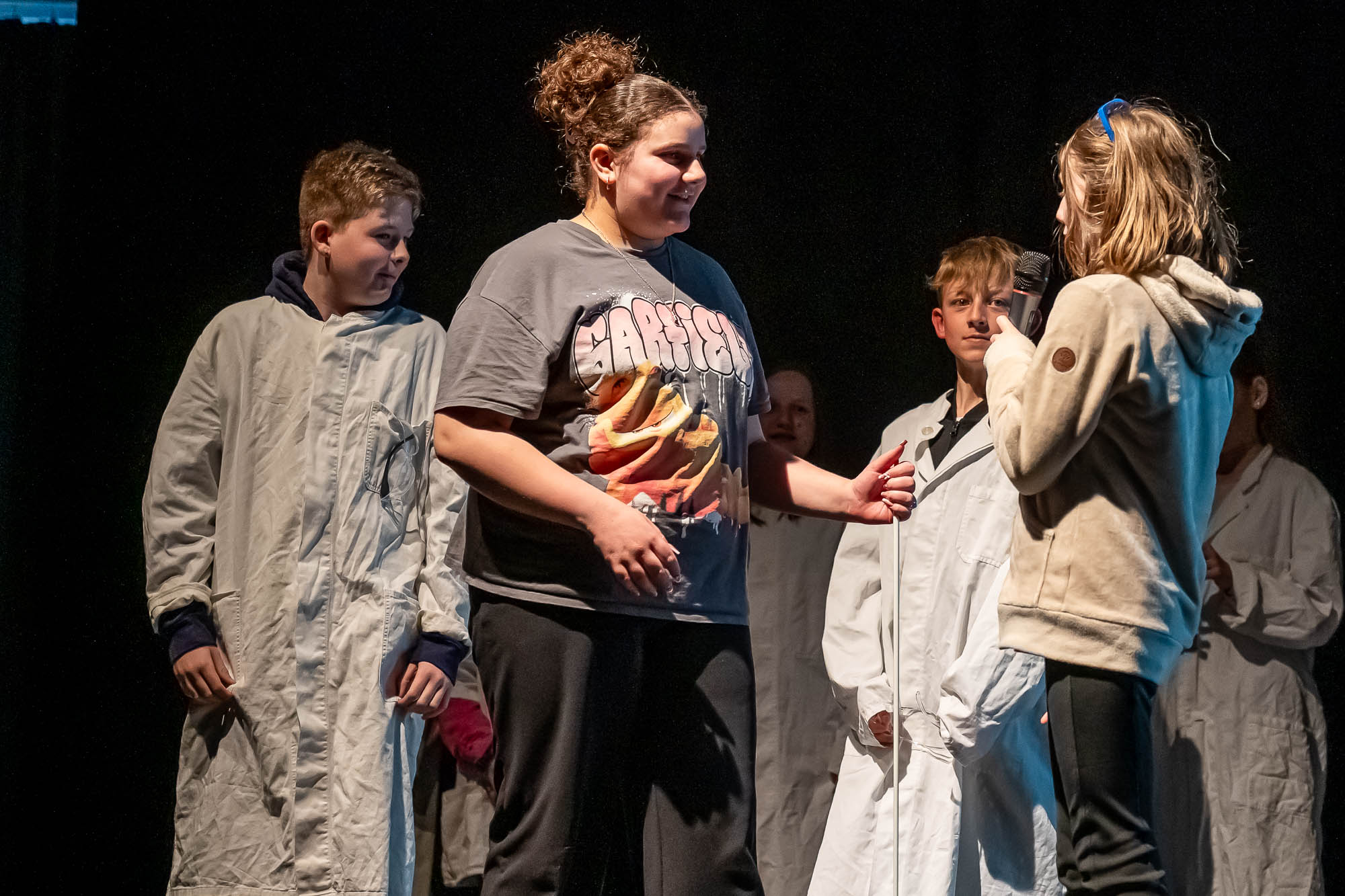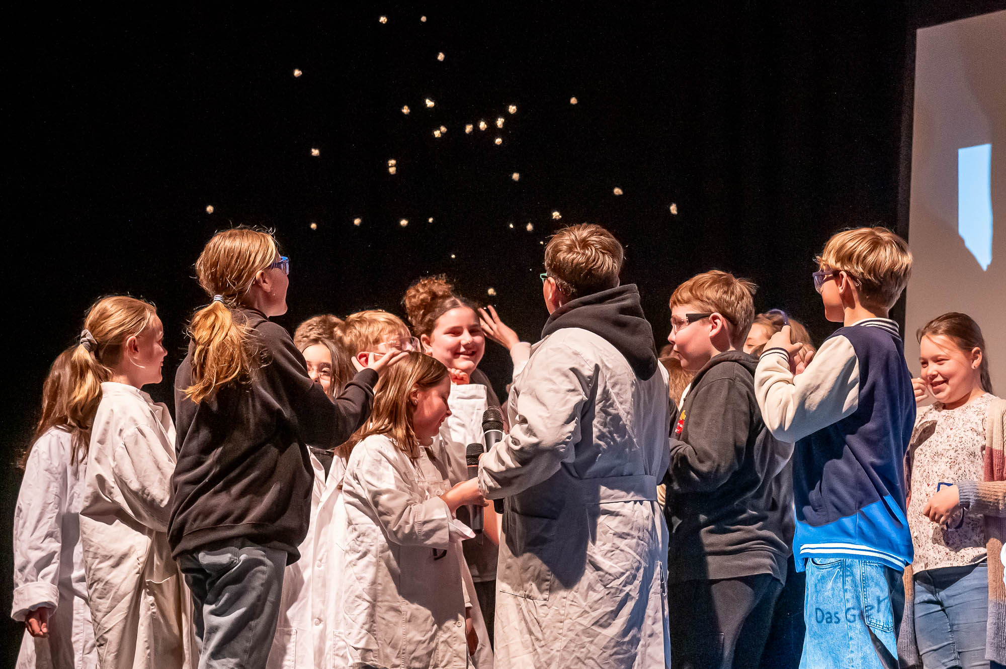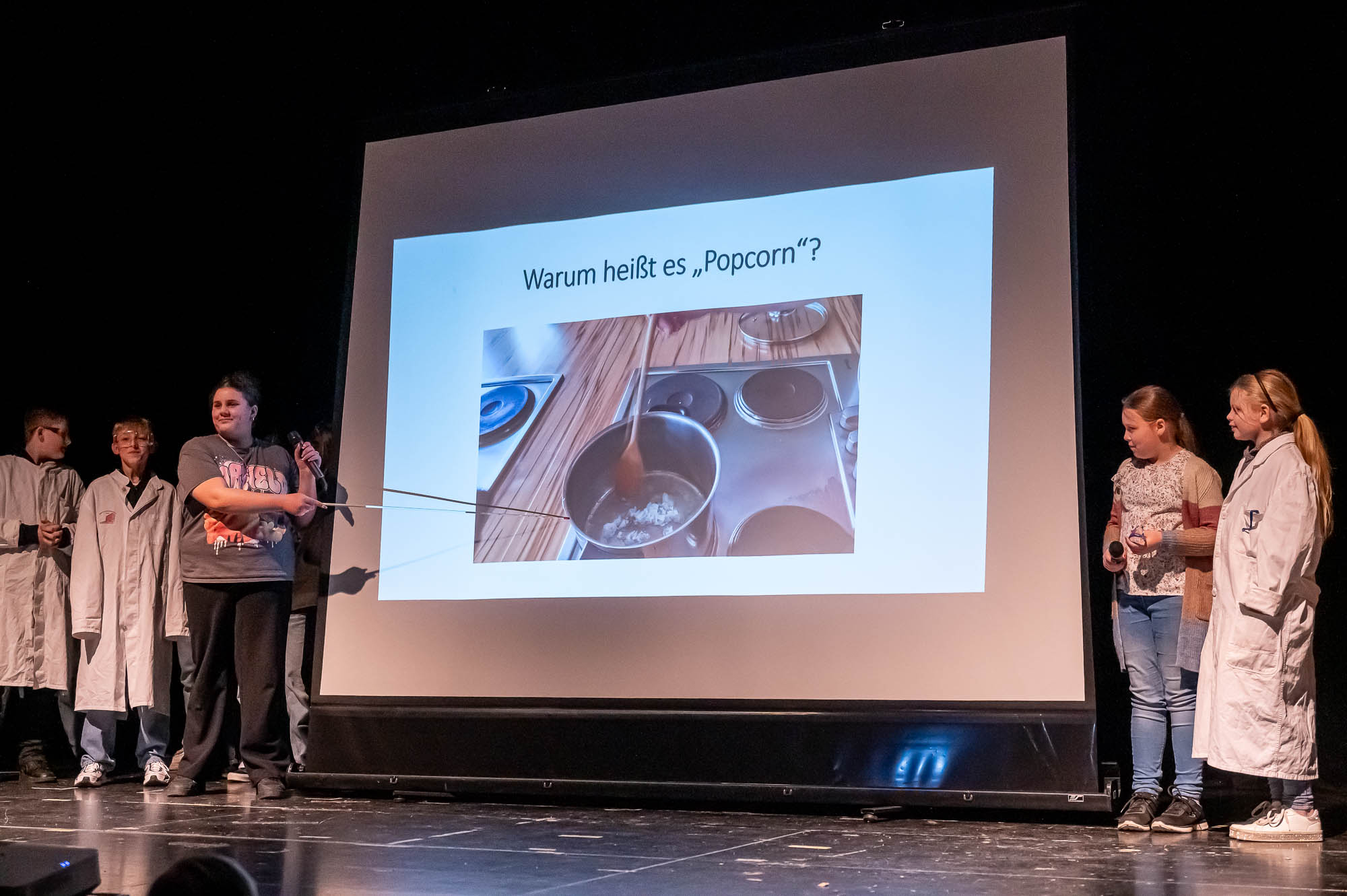 Während Musik hervorragend für einen Bühnenauftritt geeignet ist, geht das mit der Herstellung von Popcorn nicht so ohne Weiteres. Vor allem wenn man keine große Popcornmaschine dafür nutzt, sondern den Mais auf die althergebrachte Weise zum Explodieren bringt. Das hat sich “NW”-Klasse 5.4 getan, allerdings im Labor. Auch wenn der brisante Teil der Produktion per Videobeamer auf der Leinwand gezeigt wurde, gab es für die Naturwissenschafts-Schüler, die plakativ mit Schutzbekleidung auf die Bühne kamen, am Ende auch echtes Popcorn. Das Publikum hat dabei eine Menge gelernt, musste sich die Leckerei aber nun selbst auf dem Herd zuhause zaubern.