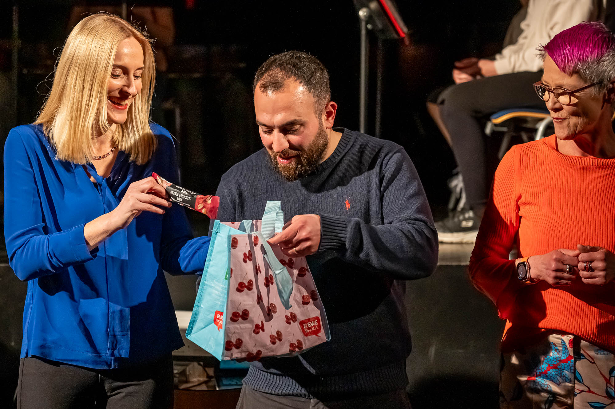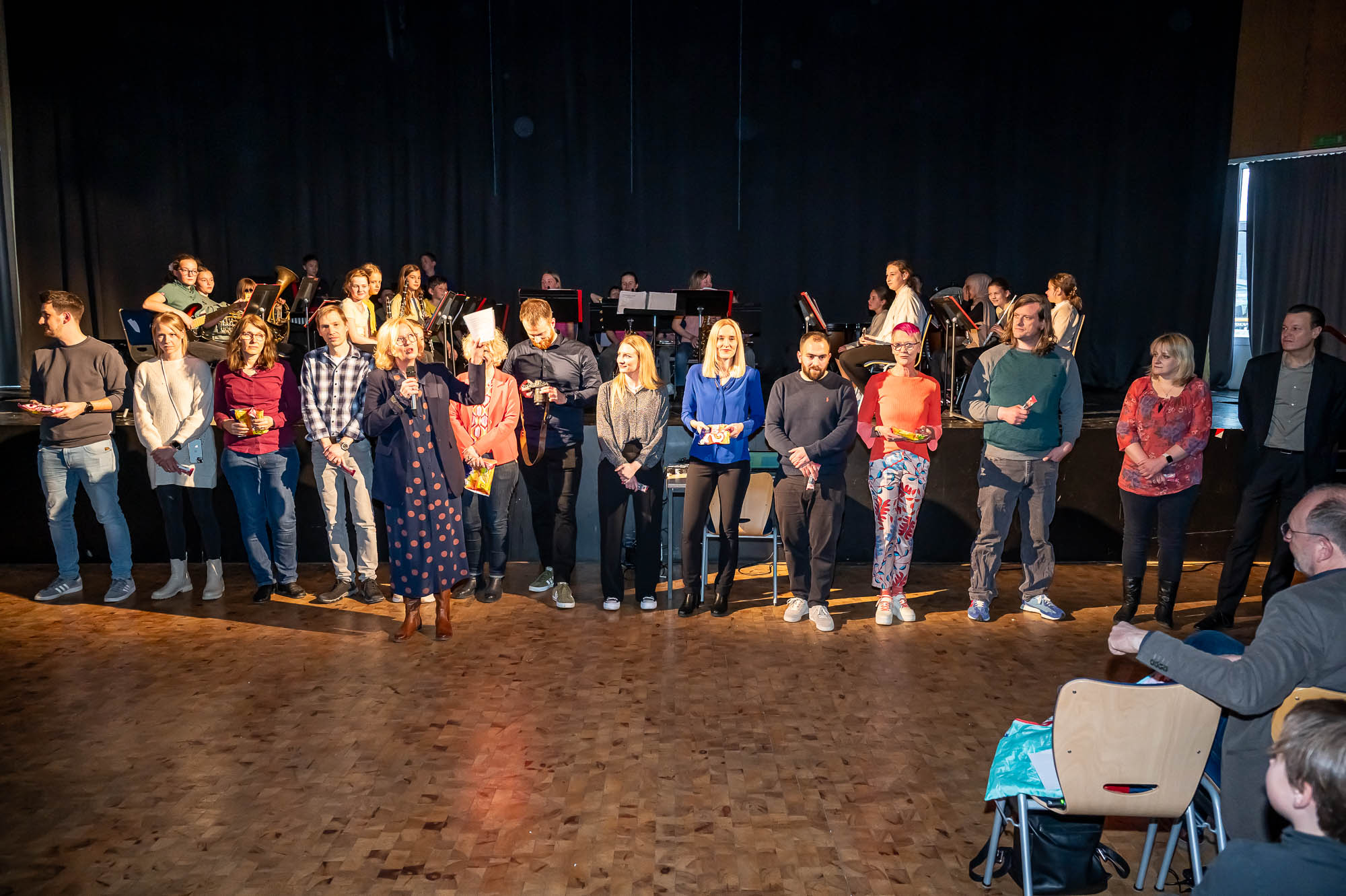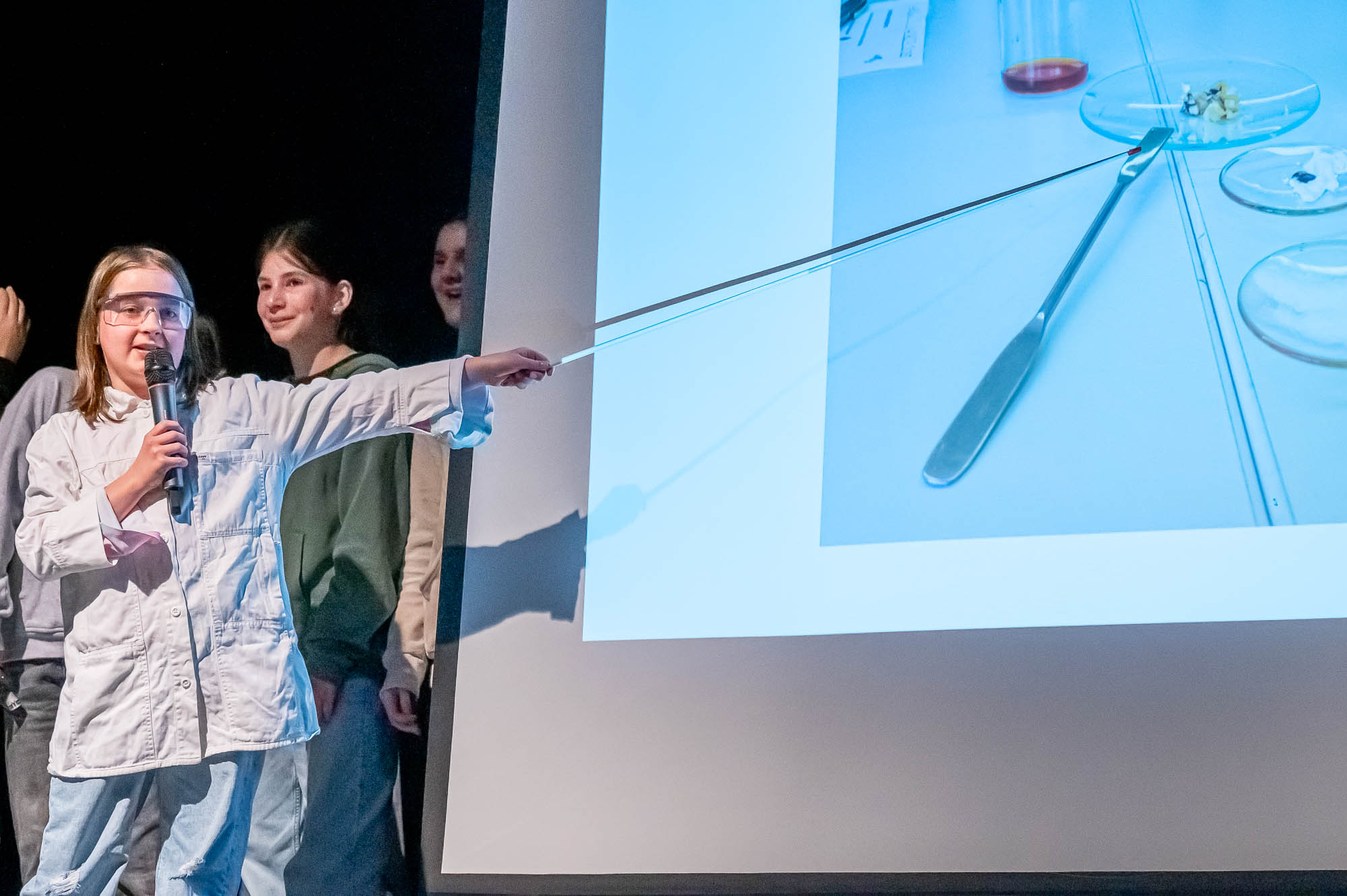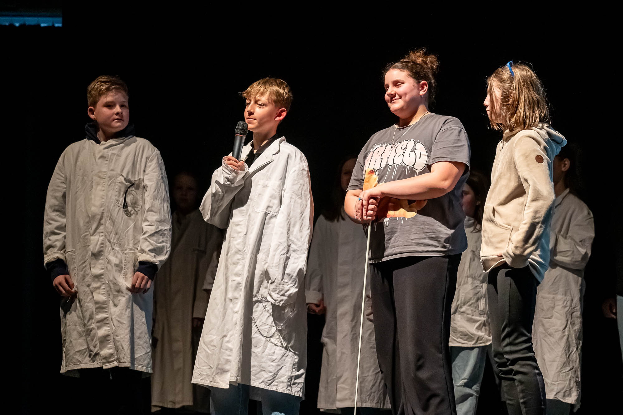 Während Musik hervorragend für einen Bühnenauftritt geeignet ist, geht das mit der Herstellung von Popcorn nicht so ohne Weiteres. Vor allem wenn man keine große Popcornmaschine dafür nutzt, sondern den Mais auf die althergebrachte Weise zum Explodieren bringt. Das hat sich “NW”-Klasse 5.4 getan, allerdings im Labor. Auch wenn der brisante Teil der Produktion per Videobeamer auf der Leinwand gezeigt wurde, gab es für die Naturwissenschafts-Schüler, die plakativ mit Schutzbekleidung auf die Bühne kamen, am Ende auch echtes Popcorn. Das Publikum hat dabei eine Menge gelernt, musste sich die Leckerei aber nun selbst auf dem Herd zuhause zaubern.