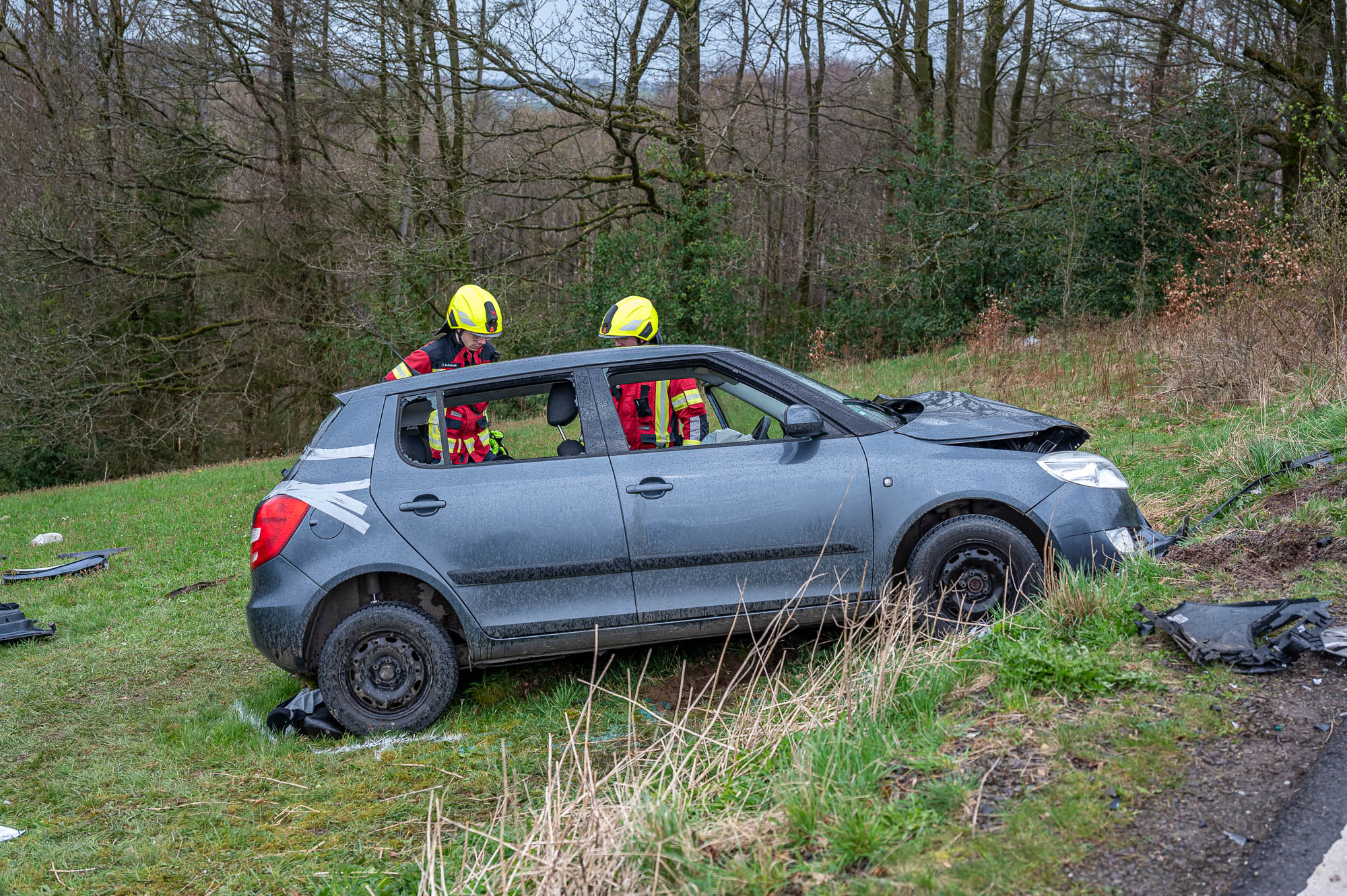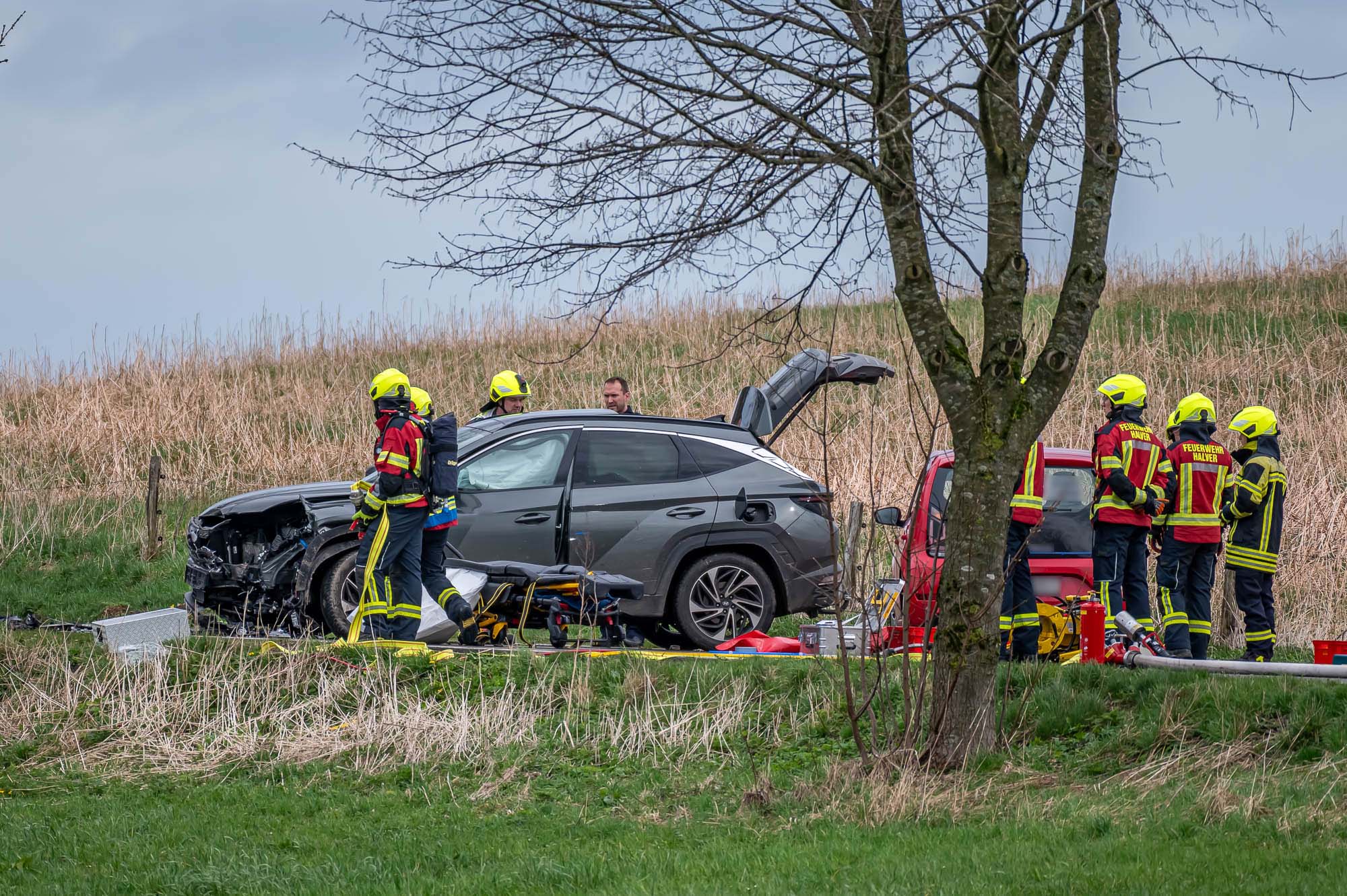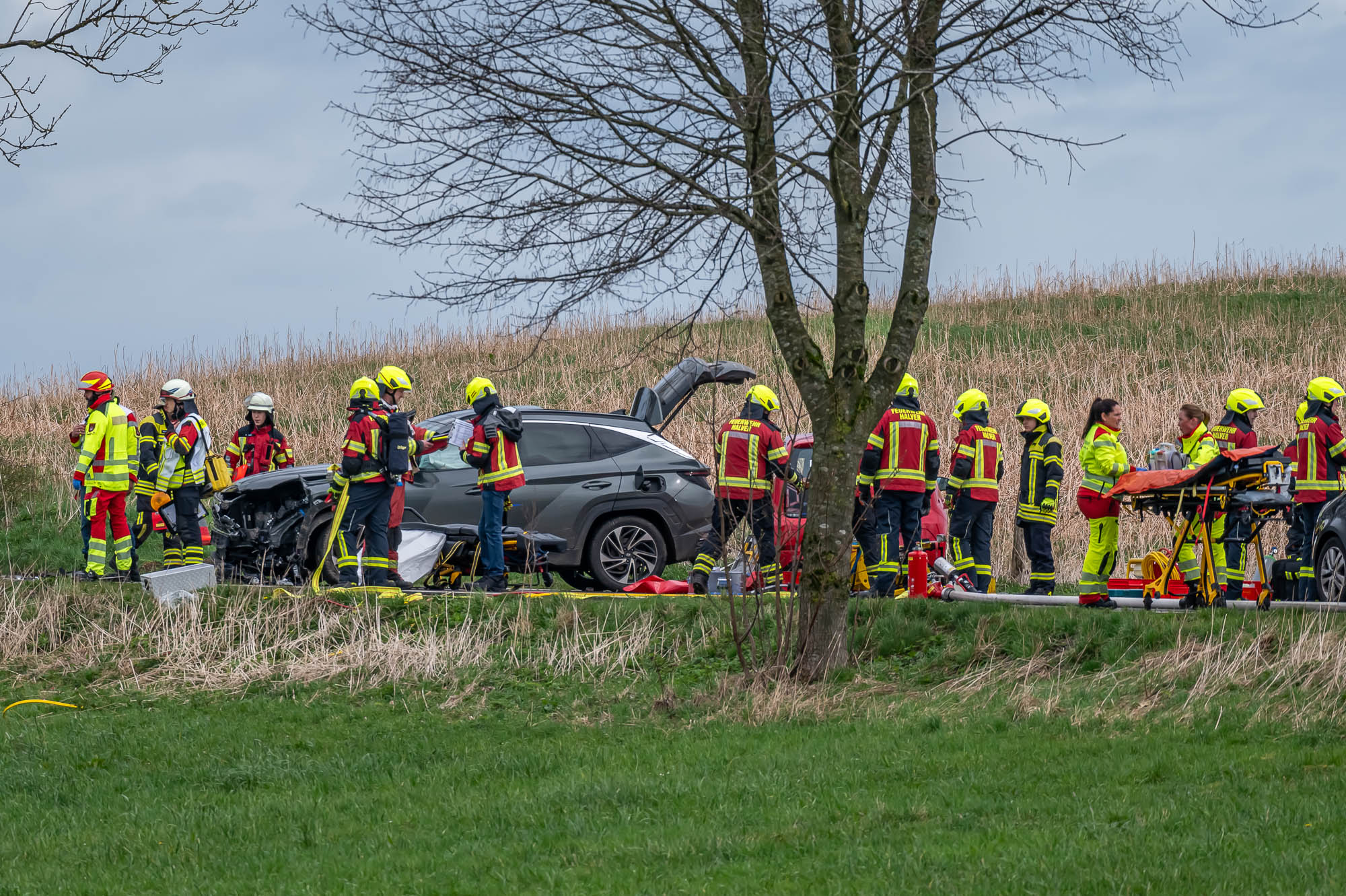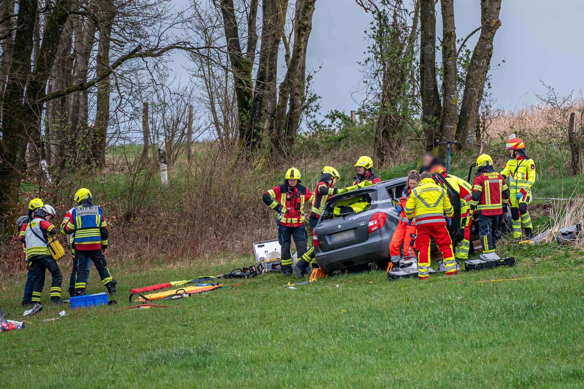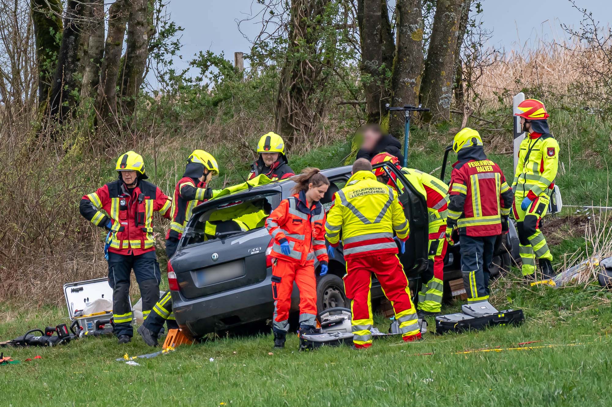 Feuerwehr und Rettungskräfte waren im Großeinsatz. Die Feuerwehr Halver war mit insgesamt 41 Kräften der Löschzüge Stadtmitte und Oberbrügge-Ehringhausen sowie der Löschgruppe Buschhausen ausgerückt. Zur Einsatzstelle wurden etliche Rettungswagen zusammengezogen, zahlreiche Helferinnen und Helfer kümmerten sich um die Verletzten. An einem der Unfallfahrzeuge, einem Skoda Fabia, mussten Feuerwehrleute mit schwerem Gerät einen Zugang zum Patienten schaffen, damit dieser möglichst schonend aus dem Wrack befreit werden konnte. Eingeklemmt war allerdings niemand.