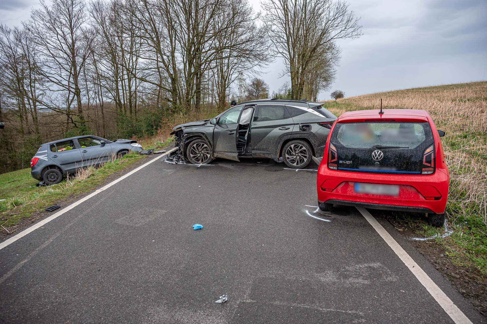 Update 15.15 Uhr Inzwischen konnte die Polizei erste Angaben zum Unfallhergang machen. Gegen 11.00 Uhr war eine 38 Jahre alte Hyundai-Fahrerin in Richtung Schalksmühle unterwegs, als sie nach ersten Erkenntnissen zu weit links auf der Gegenfahrbahn fuhr. Es kam zur Kollision mit dem entgegenkommenden Skoda einer 42-Jährigen Schalksmühlerin, der durch die Wucht rückwärts auf eine Wiese geschleudert wurde . Die Skoda-Fahrerin wurde bei dem Unfall schwer, möglicherweise sogar lebensgefährlich verletzt. In dem Fabia saß auch ein 14 Jahre altes Mädchen, dass von den Luftrettern nach Dortmund geflogen worden ist. Die Unfallverursacherin im Hyundai Tuscon wurde ebenfalls verletzt, ihr 4 Jahre jüngerer Beifahrer sogar schwer. Unverletzt blieb der Fahrer VU Up, der noch im letzten Moment ausweichen konnte. Unbeschädigt blieb der Kleinwagen dabei auch nicht, was aber im Vergleich zu den anderen Beteiligten kaum ins Gewicht fällt: Der Hyundai wurde massiv beschädigt, der Skoda völlig zerstört. Die Polizei geht von einem Sachschaden “jenseits der 40.000 Euro” aus. Die Straße ist weiterhin gesperrt.