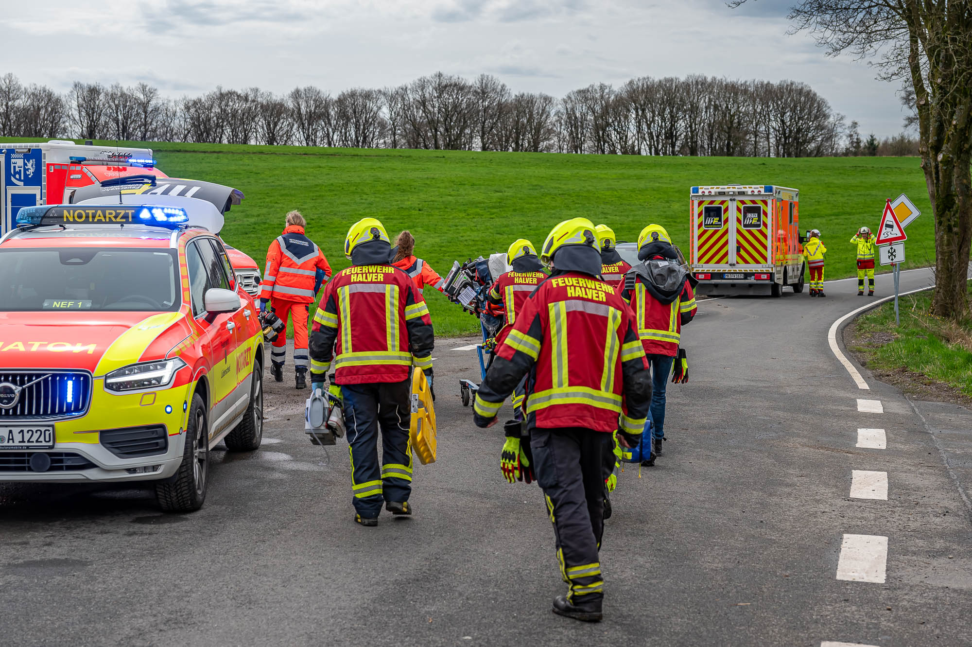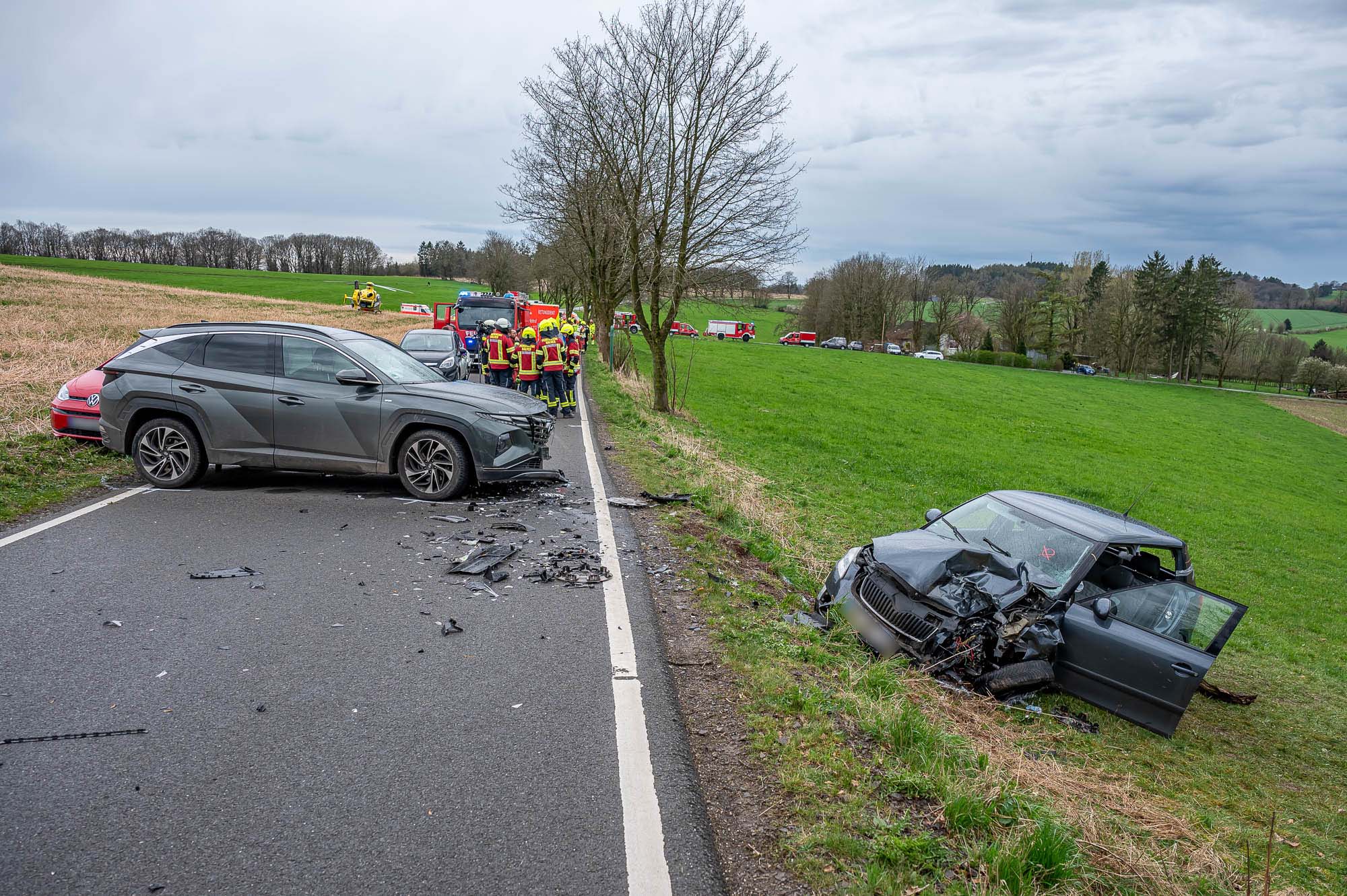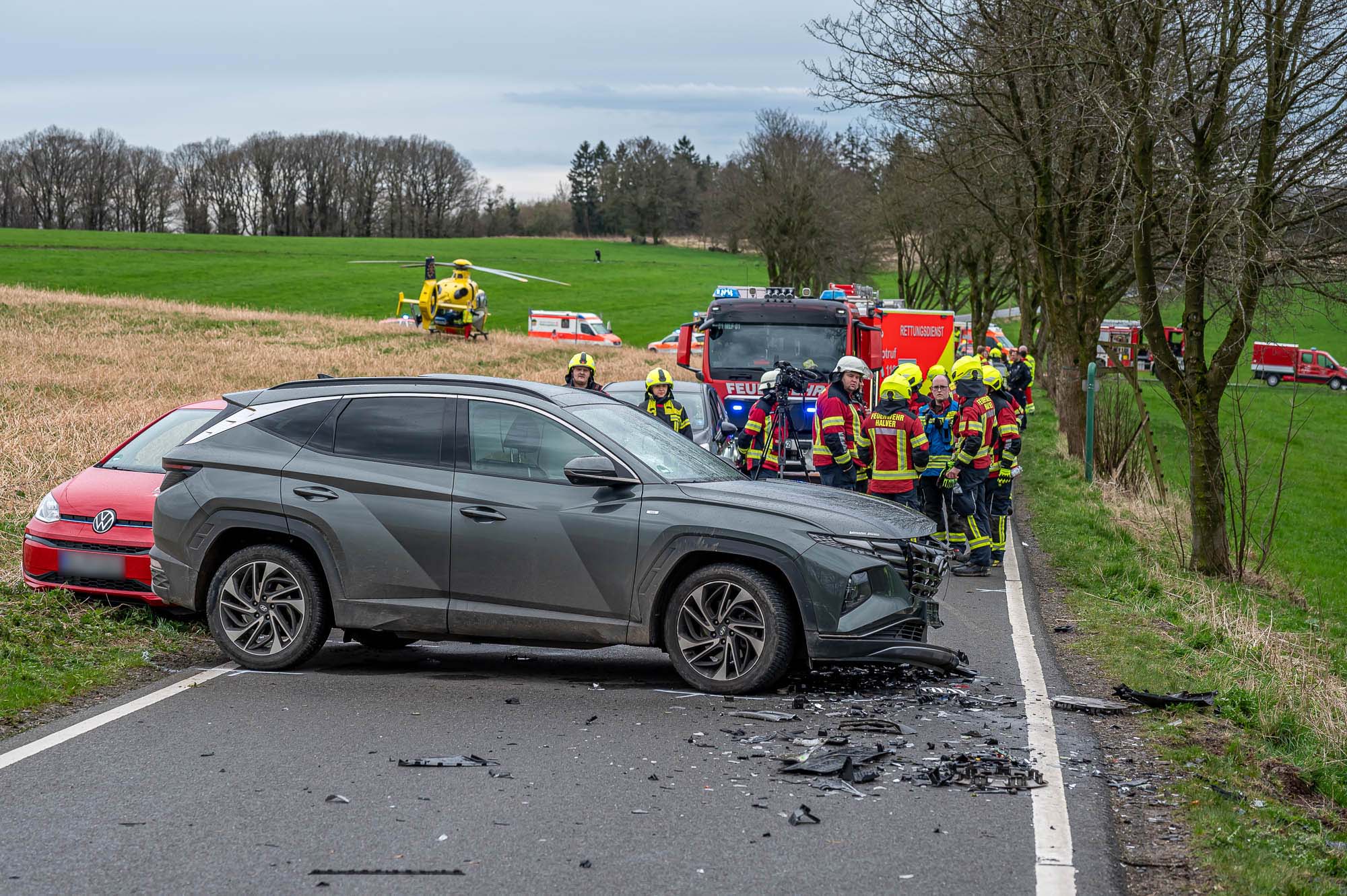 HALVER (mk) Wieder kam es auf dieser Straße, die von Halver nach Schalksmühle führt, zu einem schweren Unfall. Zwischen Halver-Streitstück und Schalksmühle-Herberge sind am Freitagvormittag, 5. April, zwei Autos frontal miteinander kollidiert. Der Wagen eines Pflegedienstes ist dem Unfallgeschehen haarscharf entkommen und konnte gerade noch rechtzeitig bremsen. Nach aktuellem Stand sind drei Personen schwerverletzt, teilweise befürchten die Einsatzkräfte Lebensgefahr. Der in Lünen stationierte ADAC-Rettungshubschrauber “Christoph 8” flog einen Unfallbeteiligten im Teenager-Alter in eine Fachklinik.