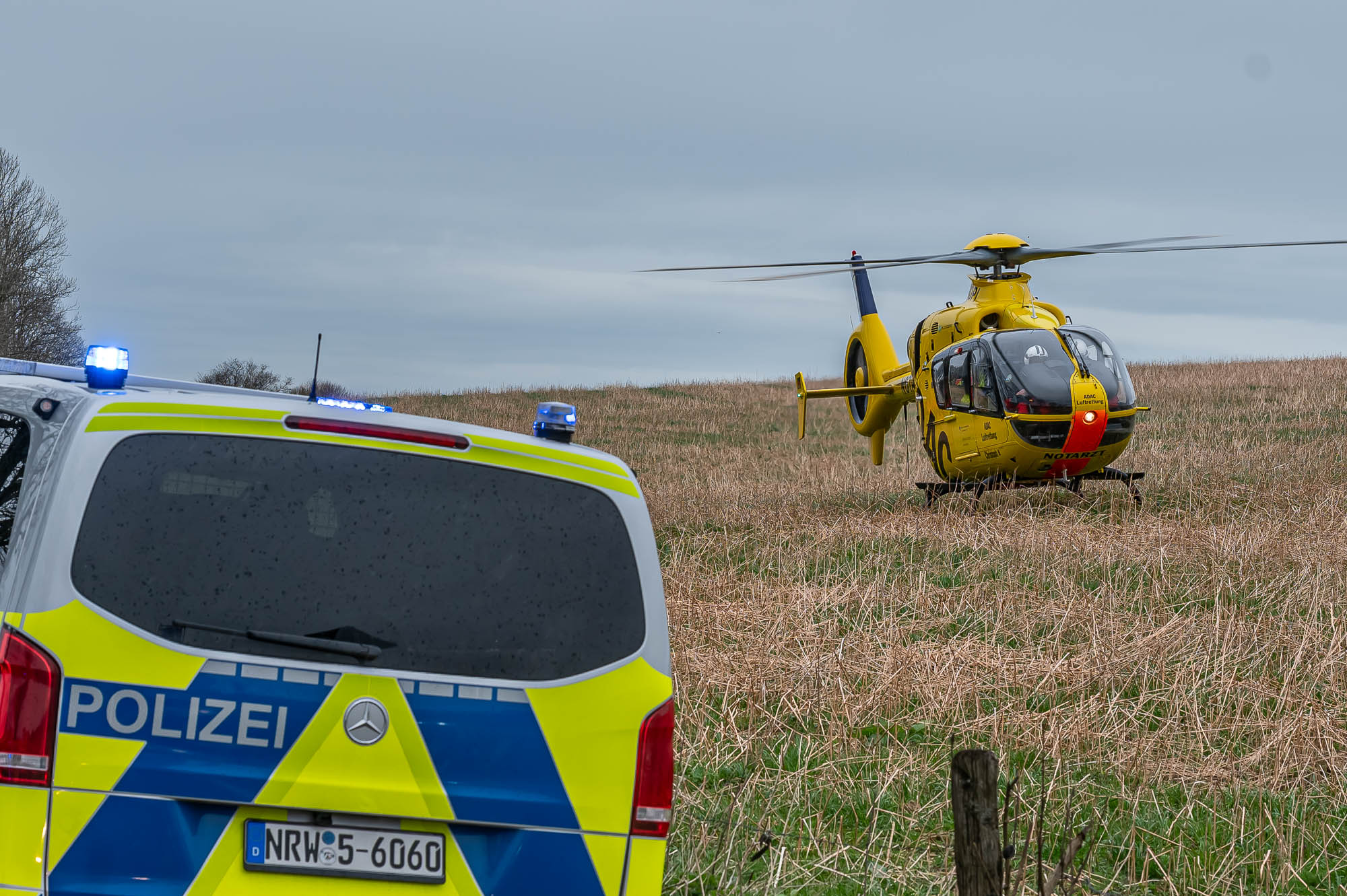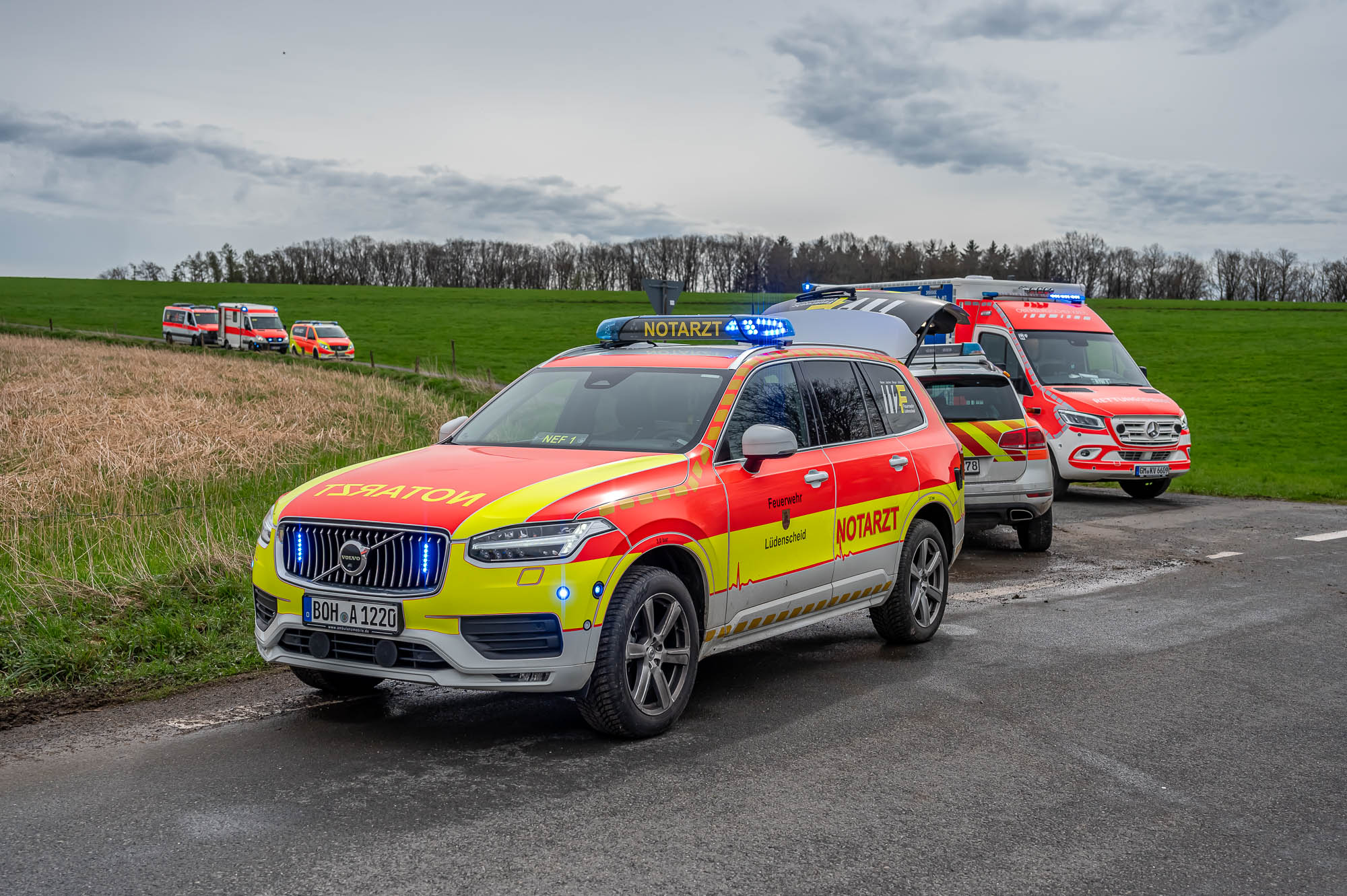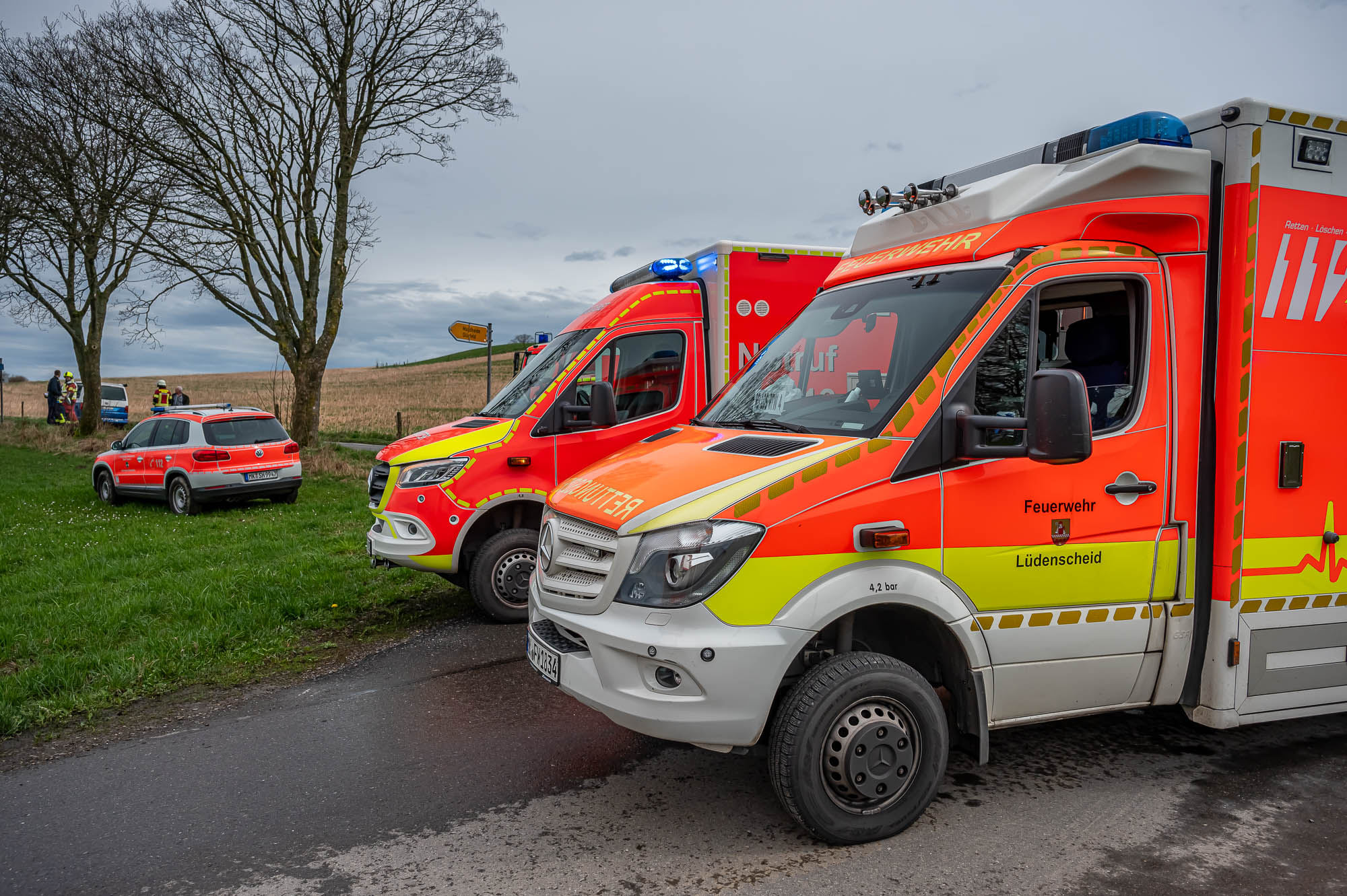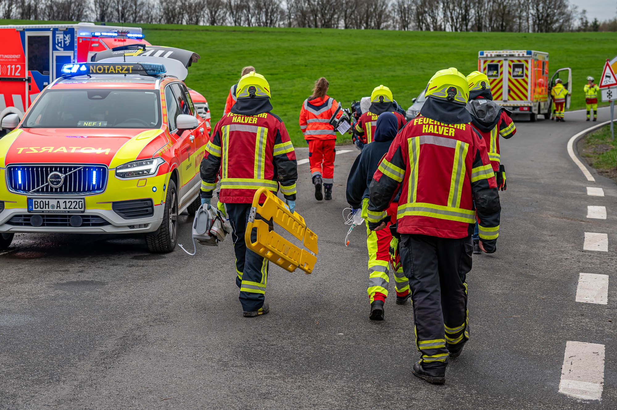 HALVER (mk) Wieder kam es auf dieser Straße, die von Halver nach Schalksmühle führt, zu einem schweren Unfall. Zwischen Halver-Streitstück und Schalksmühle-Herberge sind am Freitagvormittag, 5. April, zwei Autos frontal miteinander kollidiert. Der Wagen eines Pflegedienstes ist dem Unfallgeschehen haarscharf entkommen und konnte gerade noch rechtzeitig bremsen. Nach aktuellem Stand sind drei Personen schwerverletzt, teilweise befürchten die Einsatzkräfte Lebensgefahr. Der in Lünen stationierte ADAC-Rettungshubschrauber “Christoph 8” flog einen Unfallbeteiligten im Teenager-Alter in eine Fachklinik.