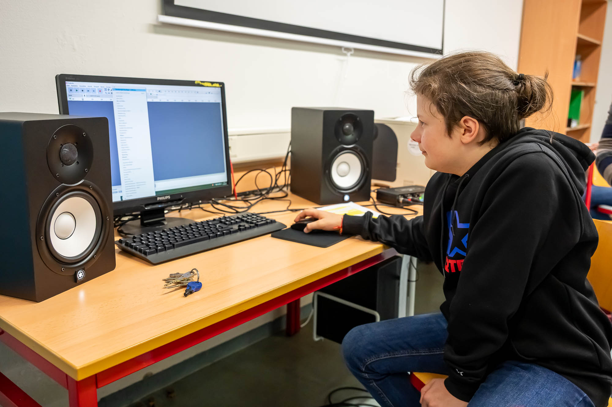 Der Profi sieht sofort: Hier kommt leistungsfähiges Equipment zum Einsatz. Der Computer ist dabei noch das kleinste Problem. Aber es braucht anständige Mikrofone, ein Audio-Interface und hochwertige Lautsprecher, sogenannte “Nahfeld-Monitore”. Eine gute und geeignete Software gibt’s glücklicherweise “Freeware”. Für die Hardware hat sich der Förderverein ins Zeug gelegt. Über Zahlen wurde bei der Projektvorstellung nicht gesprochen, aber “vierstellig” könnte die Investition schon gewesen sein. Selbstverständlich wird darauf geachtet, dass alle Teile pfleglich behandelt werden. Die Lehrerinnen Sara Miebach und Irene Schneider-Glebocki sowie ihr Kollege Christian Greb können sich auf ihre Kids der Schulradio AG verlassen: Wenn die AG-Stunde am Dienstag um ist, verschwinden die empfindlichen Sachen wieder im Schrank. Zu dieser Zeit sind die anderen Schüler aber bereits längst zuhause, denn die AG ist freiwillig. Keine Note, aber ein positiver Vermerk auf dem Zeugnis winkt für die Teilnahme.