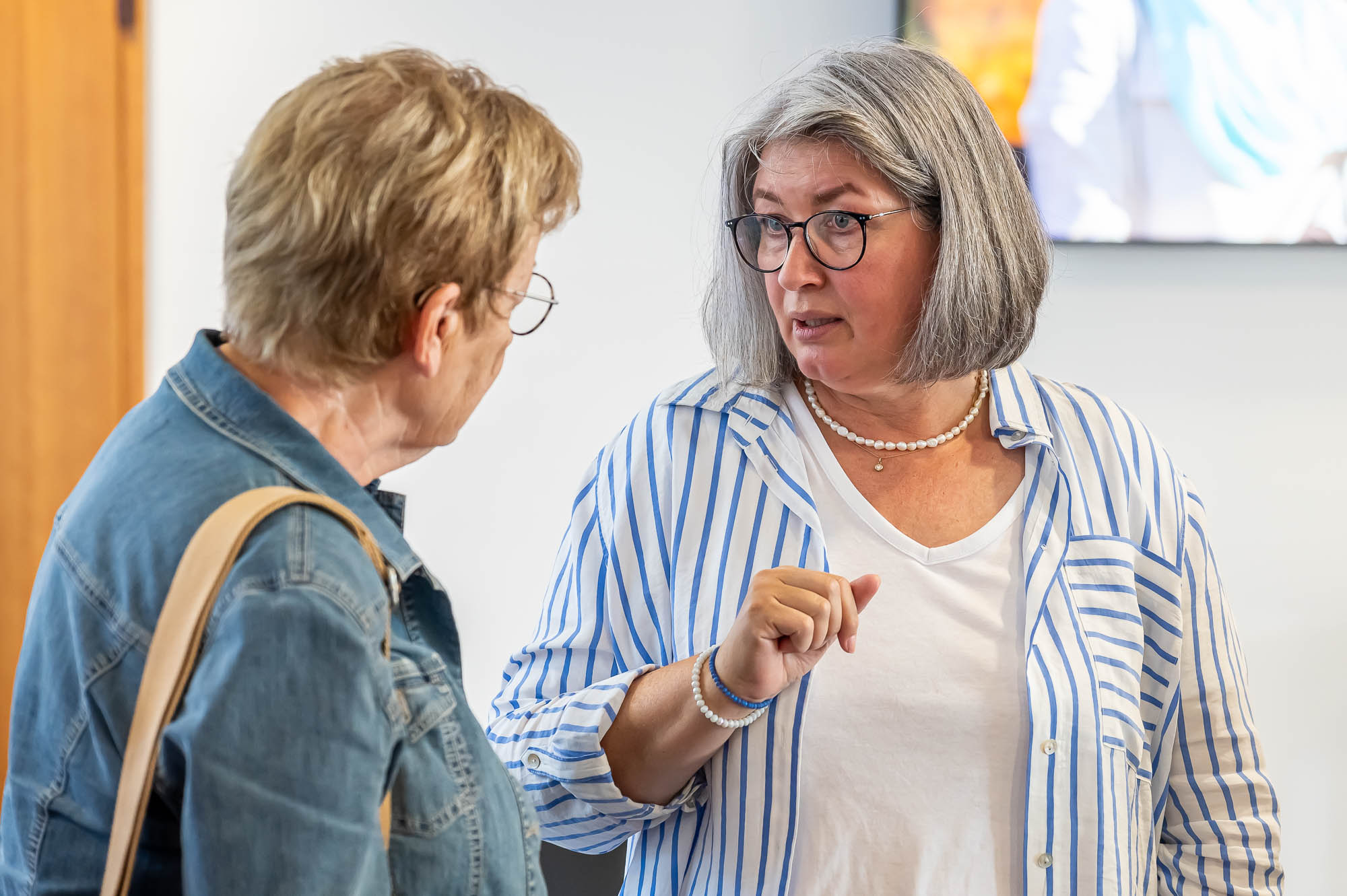 In einer kurzen Ansprache berichtete Claudia Ackermann von den Anfängen ihrer Malschule, die schon bewegte Zeiten erlebt hat, und für die die Frage nach geeigneten Räumlichkeiten auch nicht einfach zu beantworten war. Mittlerweile ist sie in den Räumen der ehemaligen Arztpraxis von Johann Günter an der Ecke Haunerbusch / Im Hofe ansässig, und dort auch zufrieden. Angefangen mit einem Kelleratelier, freut sie sich nun über lichtdurchflutete Räume.