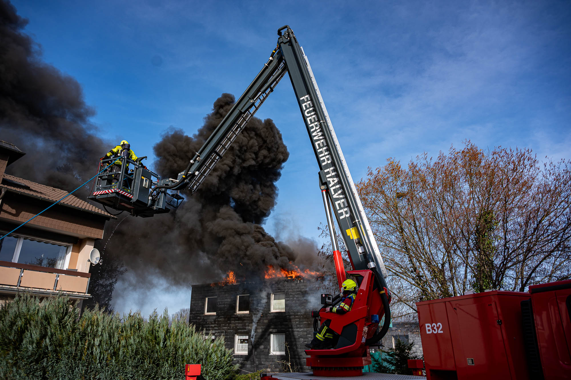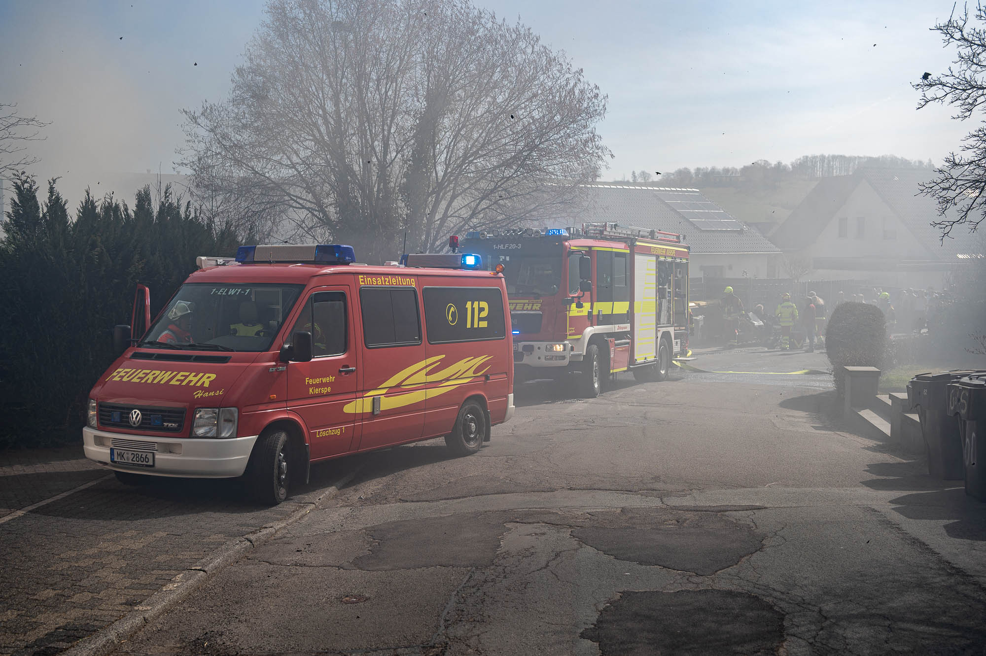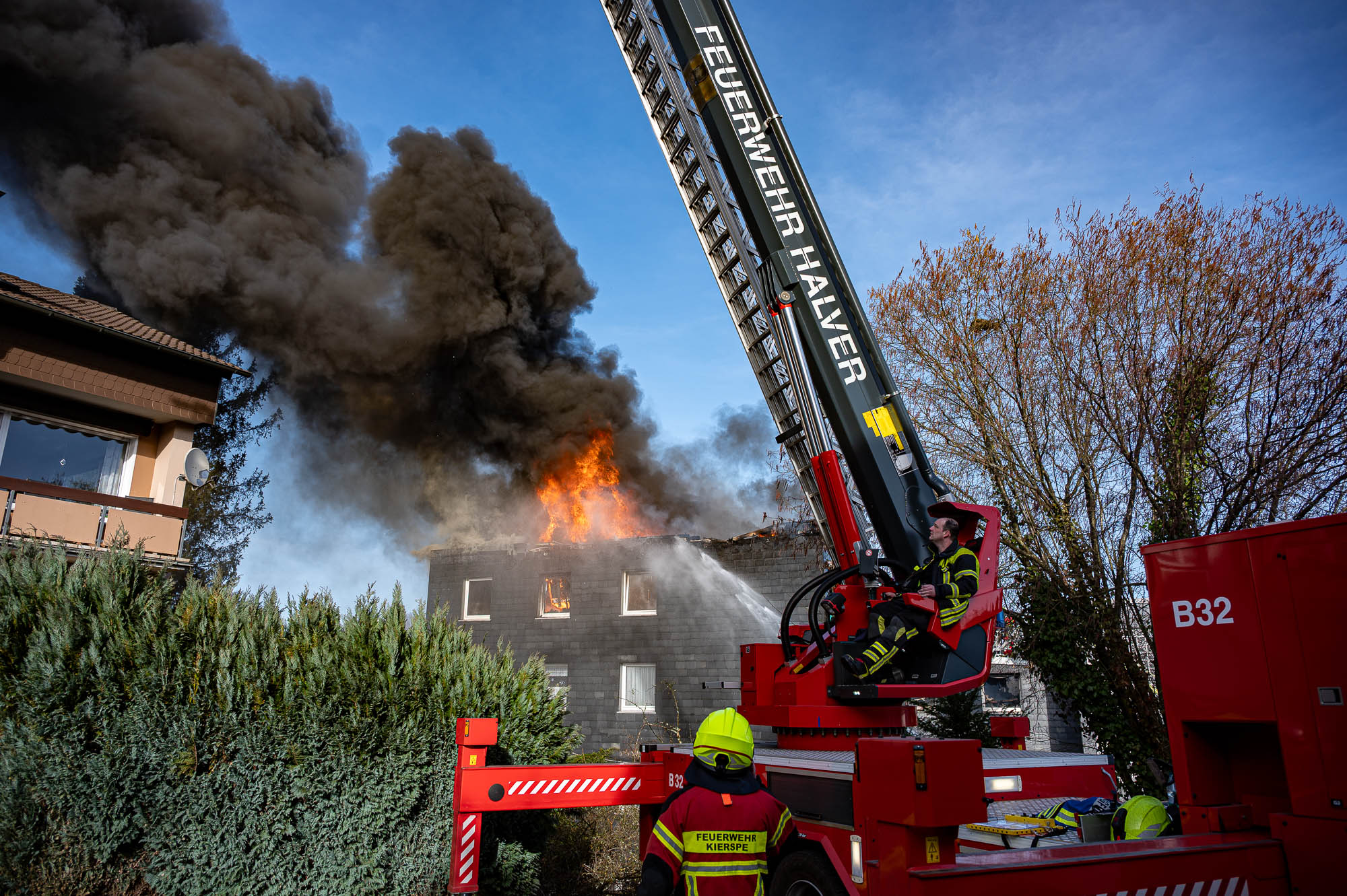 KIERSPE (mk) Wie lange die Löscharbeiten dauern werden, ist noch offen. Auch gegen 17 Uhr, rund fünf Stunden nach Ausbruch des Feuers, war der Brand noch nicht unter Kontrolle. Die Kiersper Wehr ist komplett im Einsatz, Unterstützung kam nicht nur aus Meinerzhagen: Halver entsandte ihren Teleskopmast, aus Wuppertal wurden Kräfte mit einem speziellen Hochleistungslöschsystem nach Kierspe geschickt.