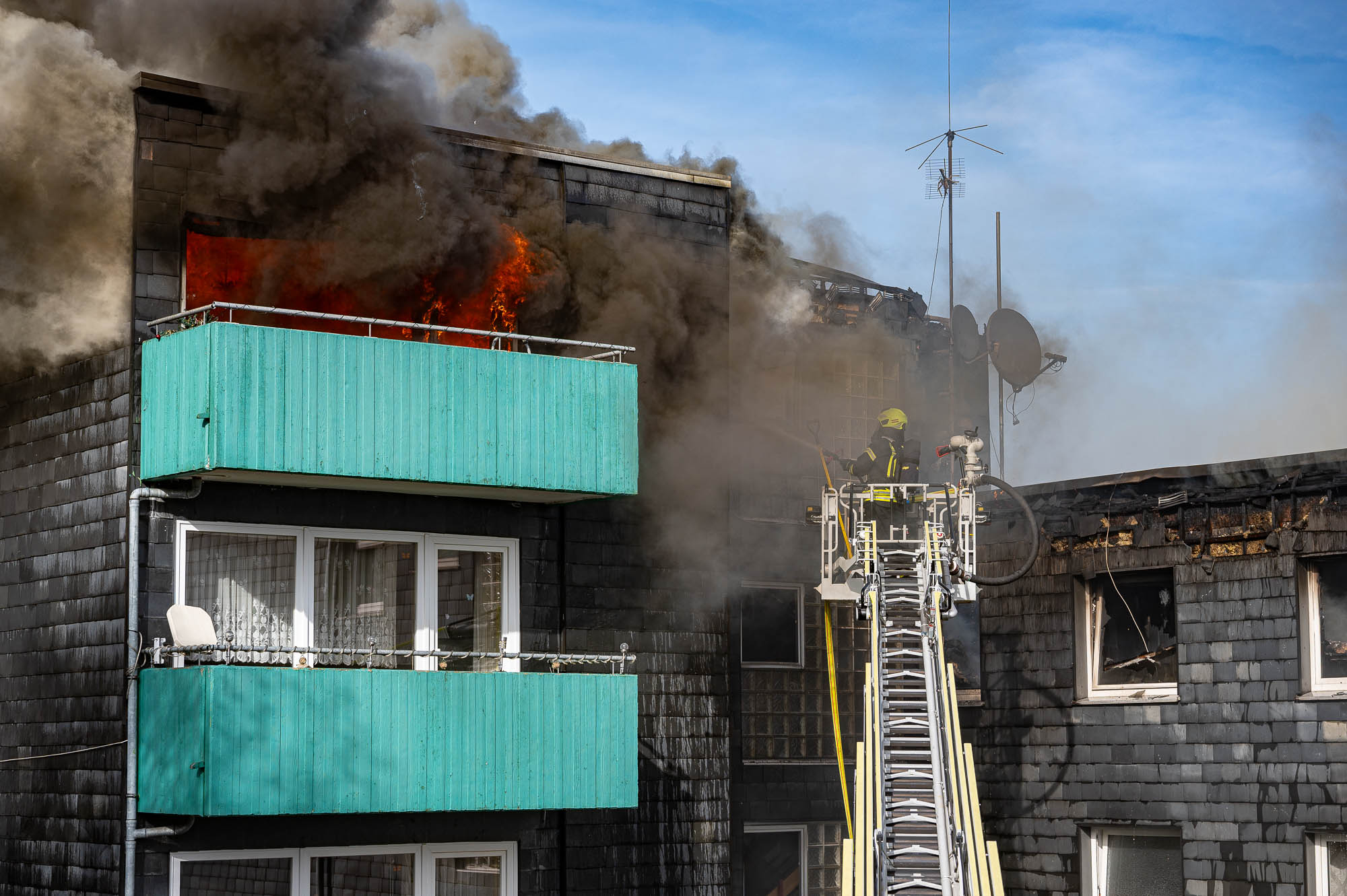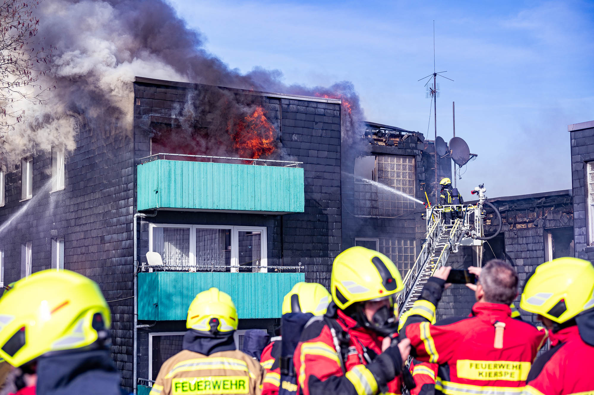 Aus einem Balkonbrand wurde ein Inferno. 70 Menschen aus mehr als 20 Wohnungen sind obdachlos. Falls sie in ihre Wohnungen zurückkehren, dann wohl nur in der Hoffnung, Erinnerungsstücke, Wertsachen oder wichtige Dokumente zu retten. Wohnungen im Obergeschoss sind komplett ausgebrannt, darunterliegende von Löschwasser geflutet. Das Schadensausmaß ist noch garnicht abschätzbar. Kierspe-Bahnhof lag stundenlang unter einer Rauchwolke, auch die Warn-App Nina schlug an.