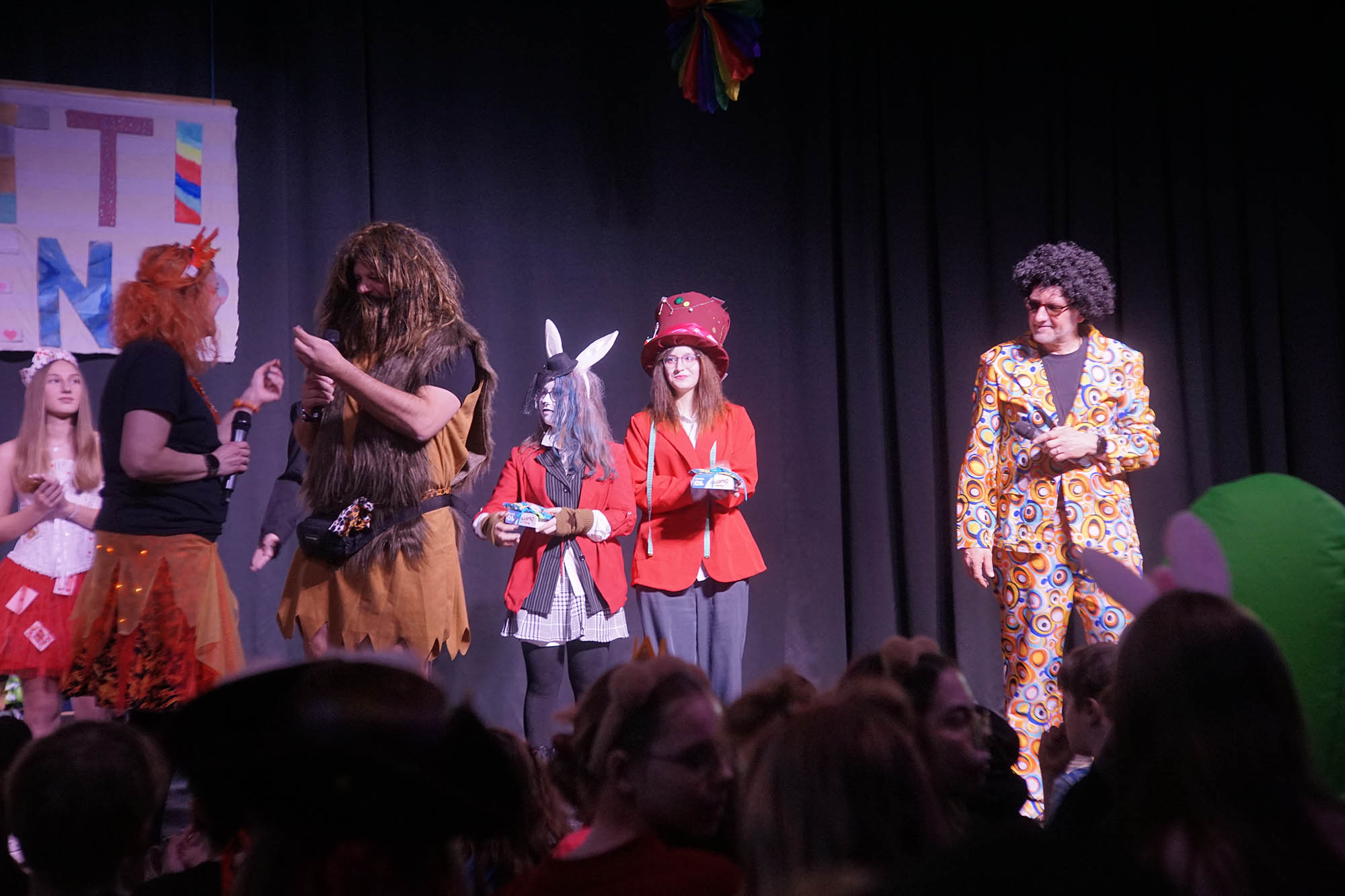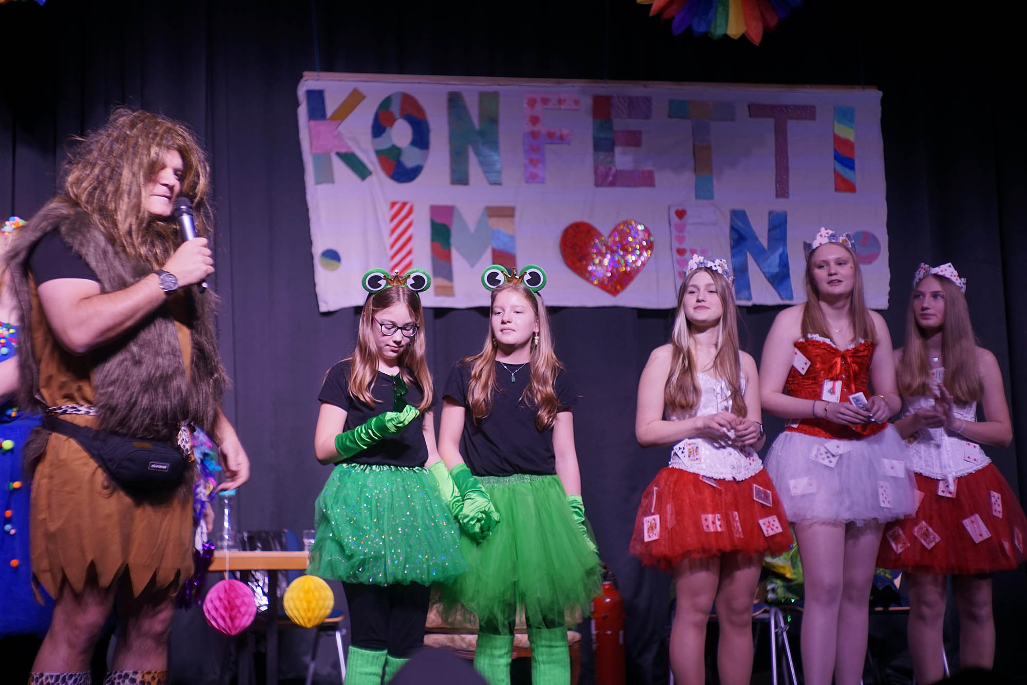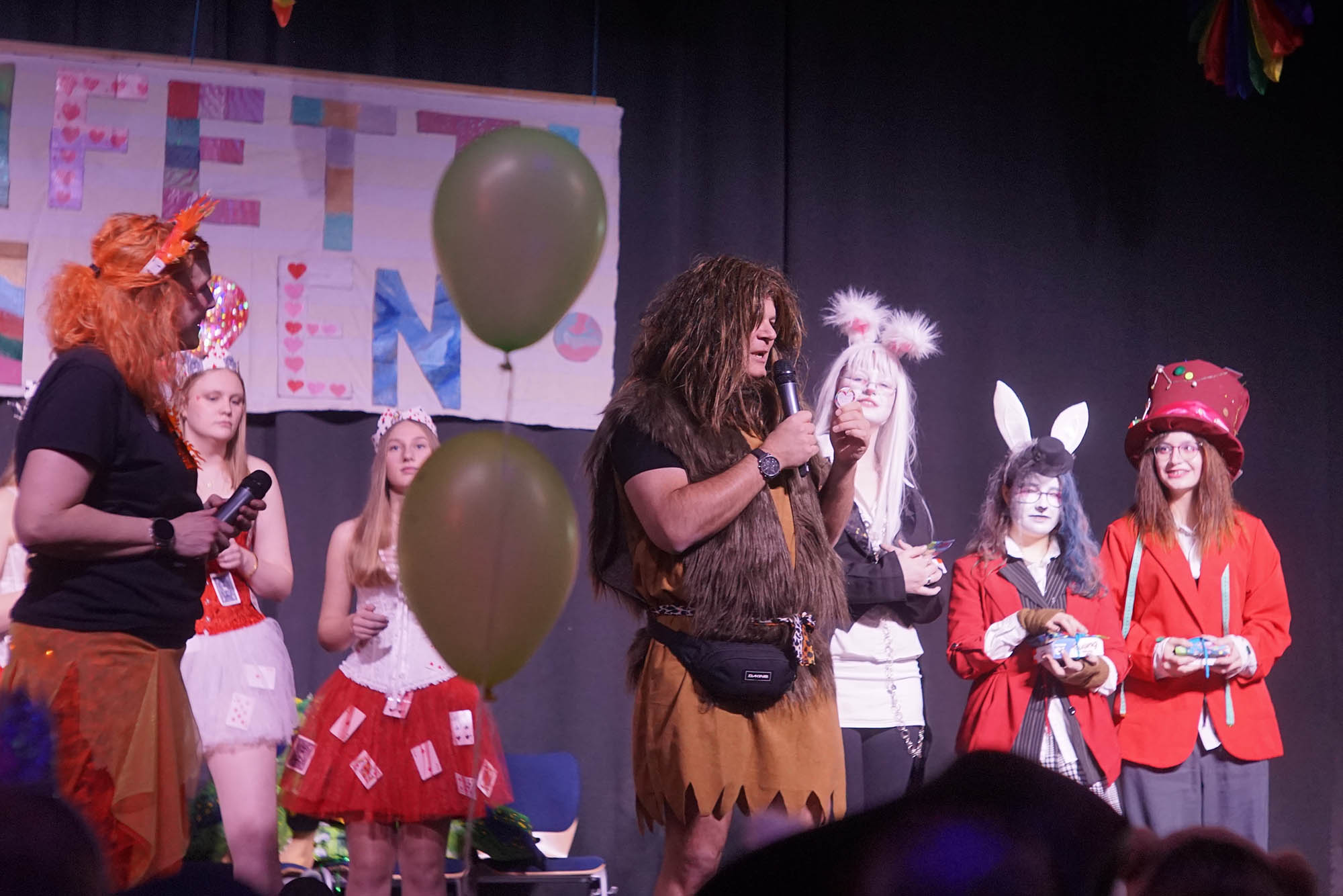 Klassische Kostüme wie Clowns waren diesmal weniger verbreitet, aber gerade unter den jungen Damen hat sich manche als Prinzessin herausgeputzt. Dinos, Comic-Helden oder Agenten waren unter den männlichen Schülern anzutreffen. Zu den ganz wild verkleideten zählte ausgerechnet Kierspes Bürgermeister Olaf Stelse, der die Prämierung der schönsten Kostüme moderierte. Stelse kennt man üblicherweise im Anzug, gelegentlich sieht man auch im Sport-Dress. Auf der PZ-Bühne stand er nun im Neandertaler-Look, der genauso erfrischend ungewöhnlich war, was bunte Outfit von Schulleiter Johannes Heintges.
