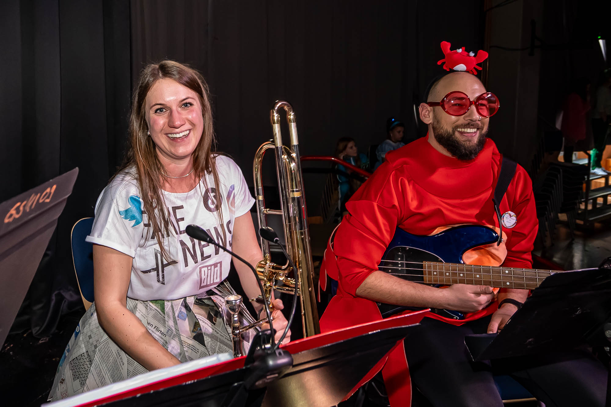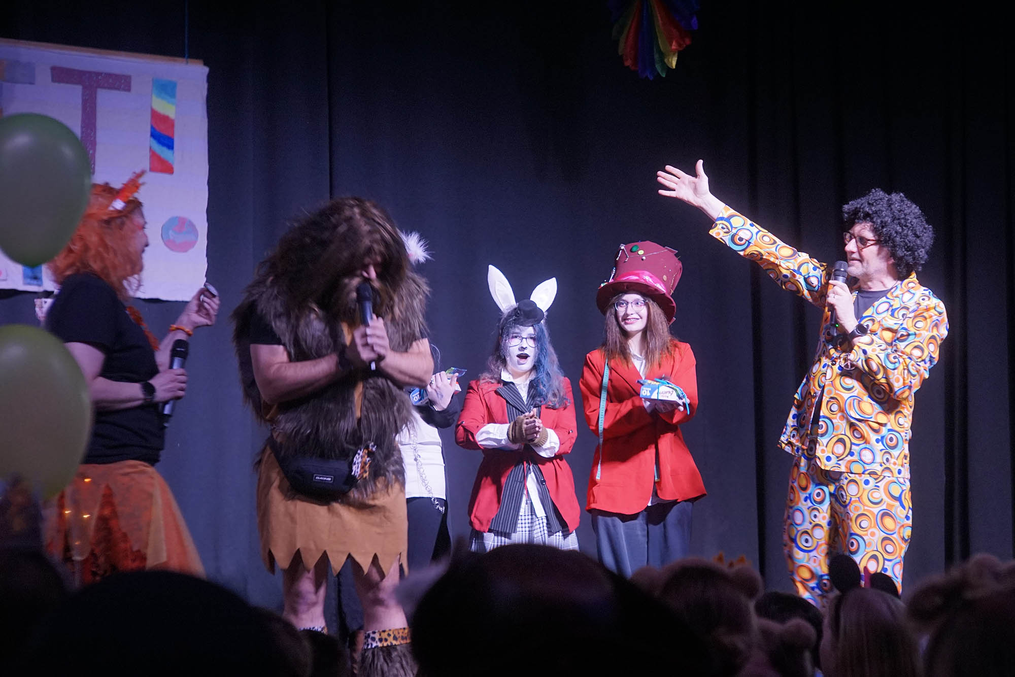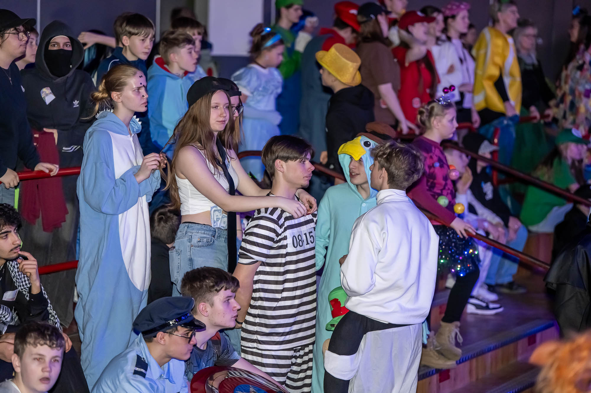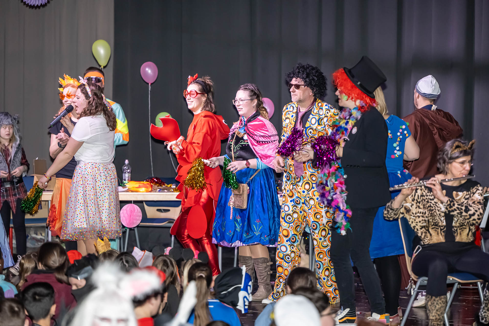 Klassische Kostüme wie Clowns waren diesmal weniger verbreitet, aber gerade unter den jungen Damen hat sich manche als Prinzessin herausgeputzt. Dinos, Comic-Helden oder Agenten waren unter den männlichen Schülern anzutreffen. Zu den ganz wild verkleideten zählte ausgerechnet Kierspes Bürgermeister Olaf Stelse, der die Prämierung der schönsten Kostüme moderierte. Stelse kennt man üblicherweise im Anzug, gelegentlich sieht man auch im Sport-Dress. Auf der PZ-Bühne stand er nun im Neandertaler-Look, der genauso erfrischend ungewöhnlich war, was bunte Outfit von Schulleiter Johannes Heintges.