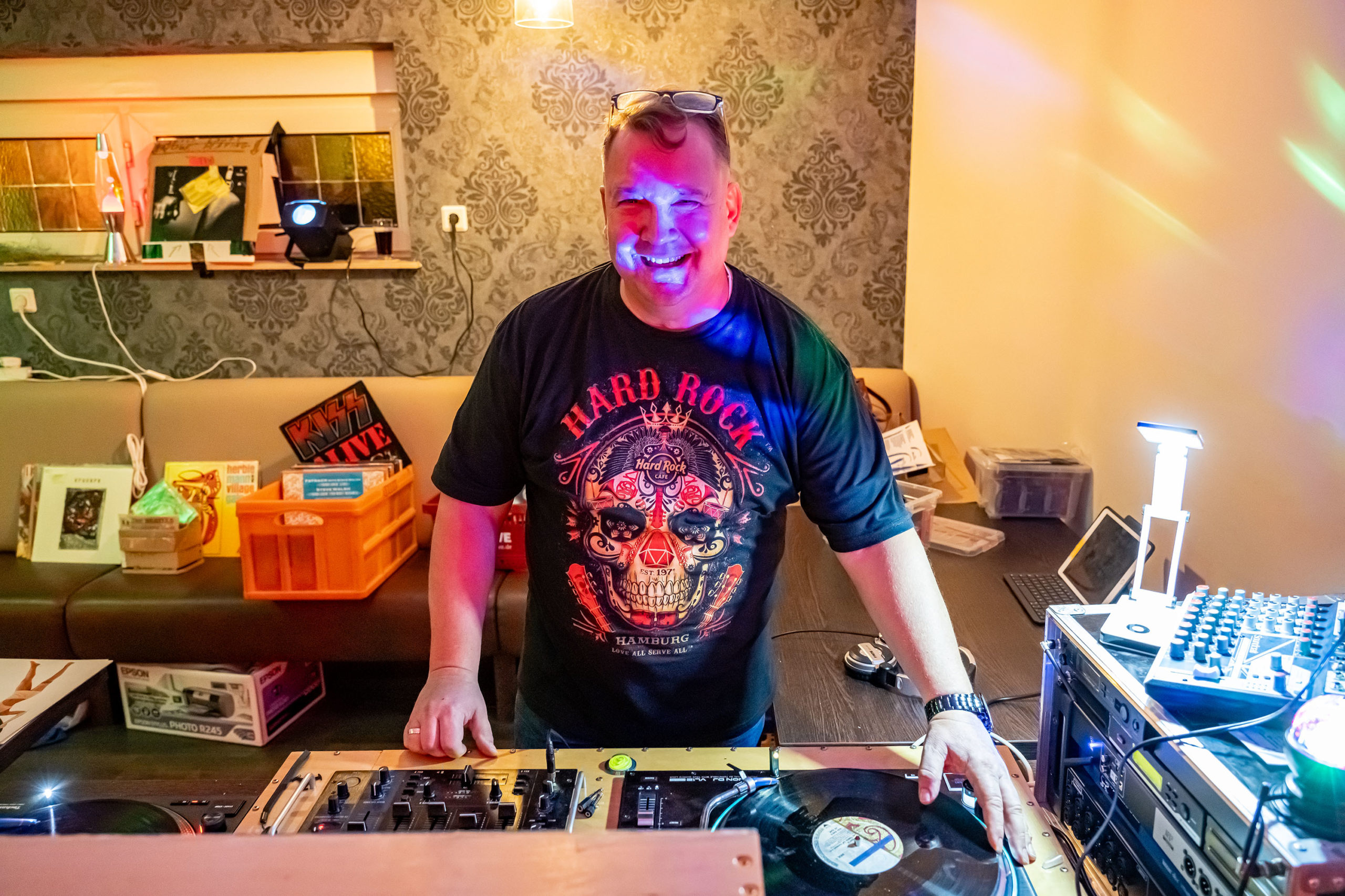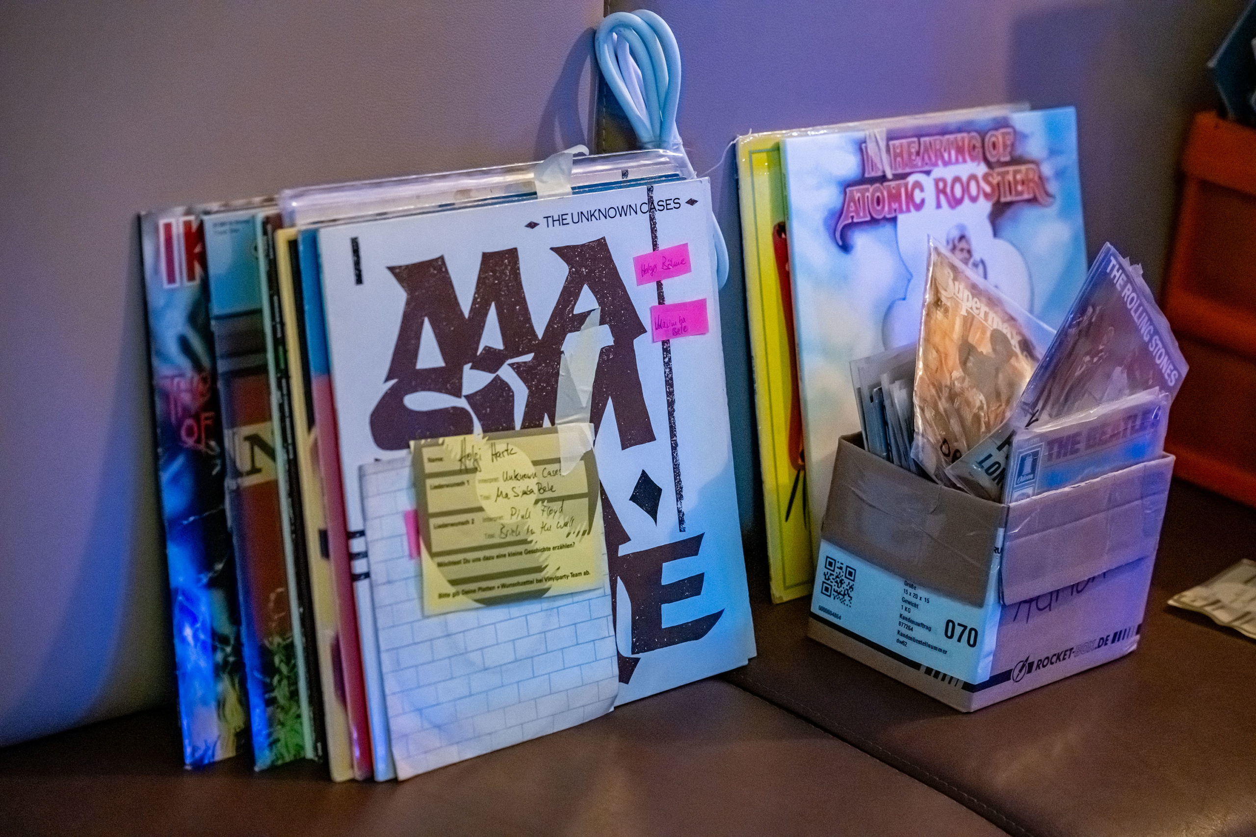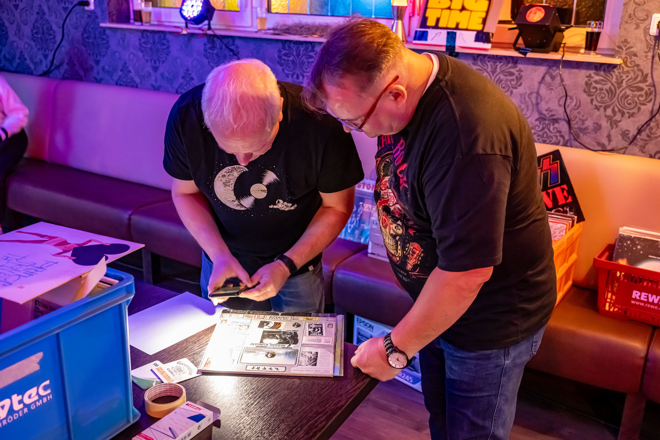 Was sich allerdings als logistische Herausforderung entpuppte, war der Umgang mit den Schätzen der Gäste. Schließlich sollte ja jeder seine eigenen Platten wiederbekommen. Andererseits: Der Musikgeschmack unter den Anwesenden schien harmonisch zu sein. Es bestand also keine Gefahr, z.b. mit einer LP von Alice Cooper in der Umbaubar aufzuschlagen, und einer Platte von Freddy Quinn wieder heimzukehren.